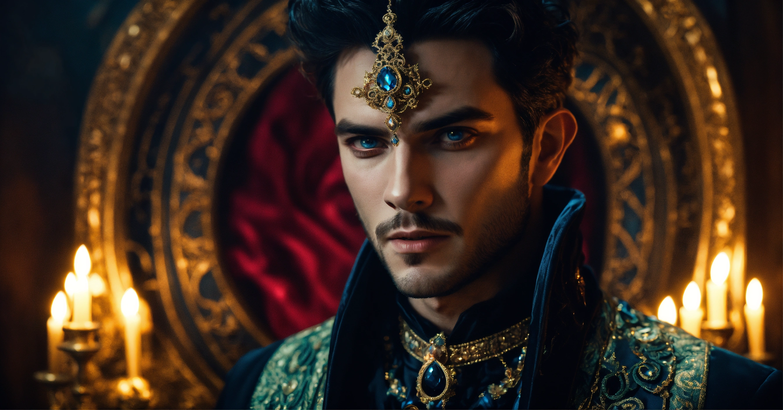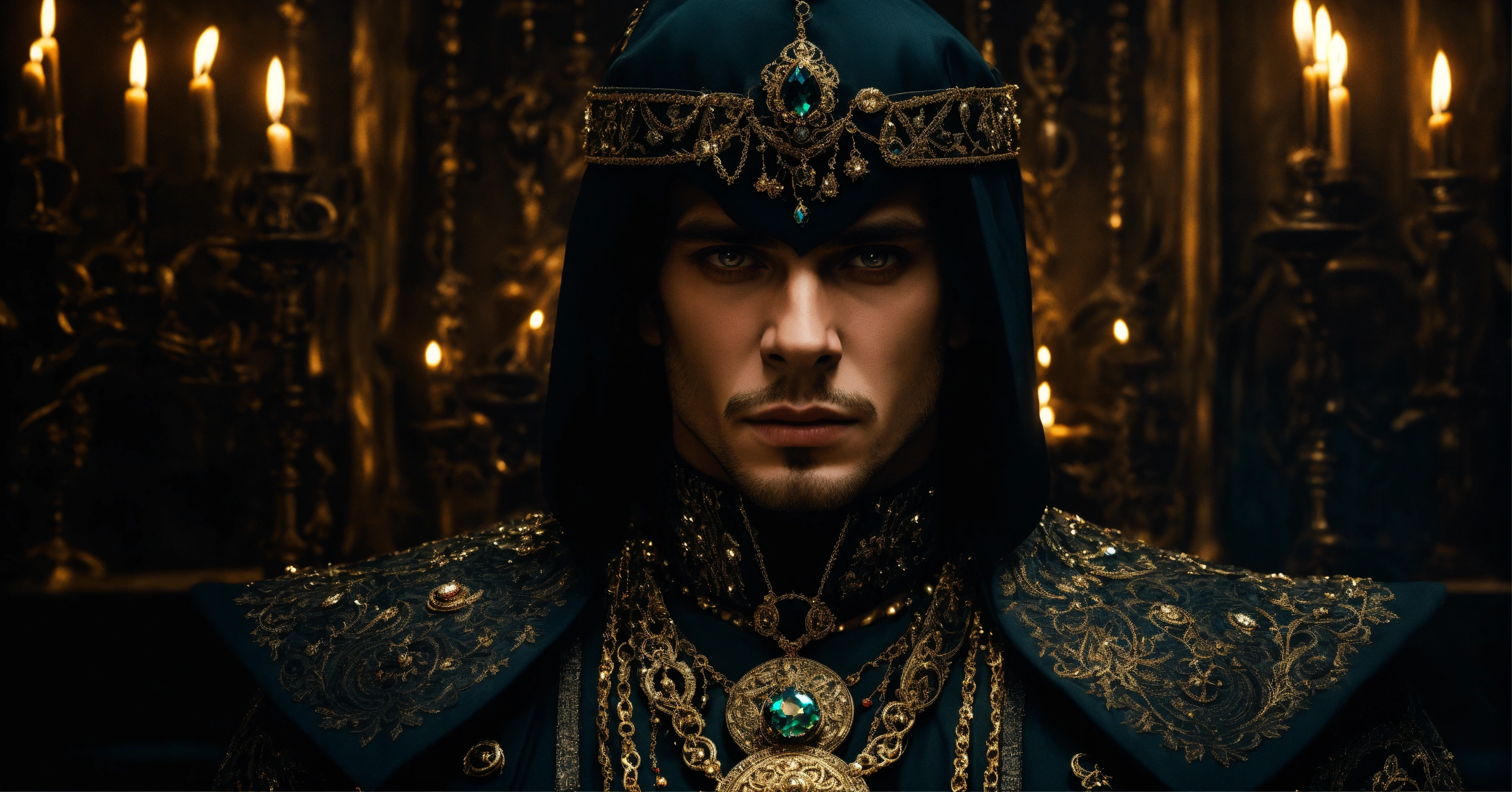 Dark and dramatic fantasy portrait of a young and handsome sinister sorcerer hypnotising the viewer with sparkling mesmerising eyes, dressed in elaborate dark clothes and ornate jewellery in a secret occult chamber.