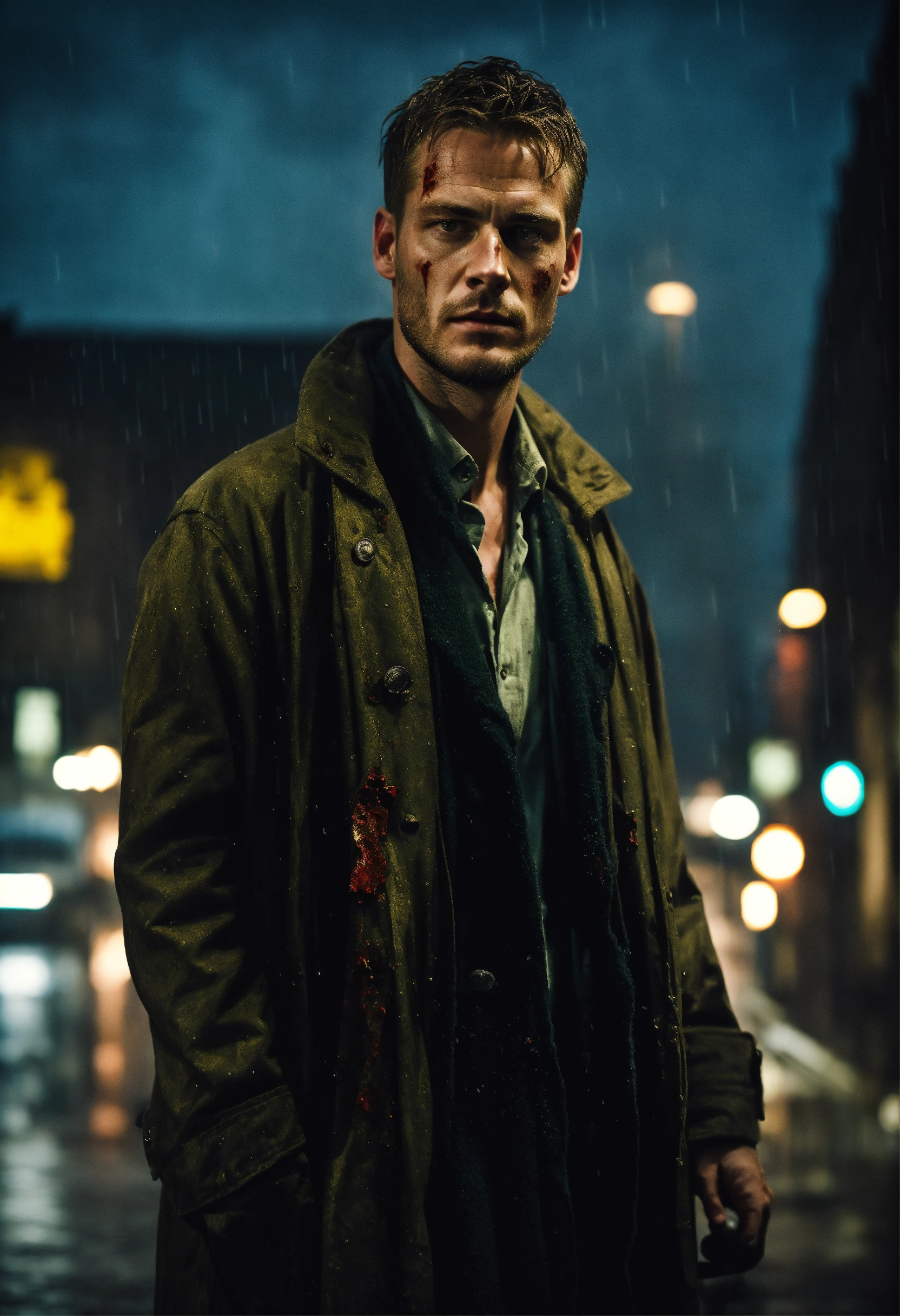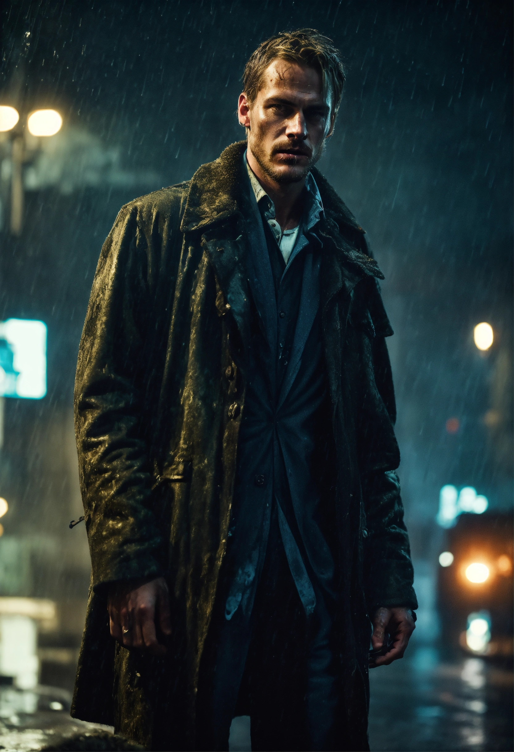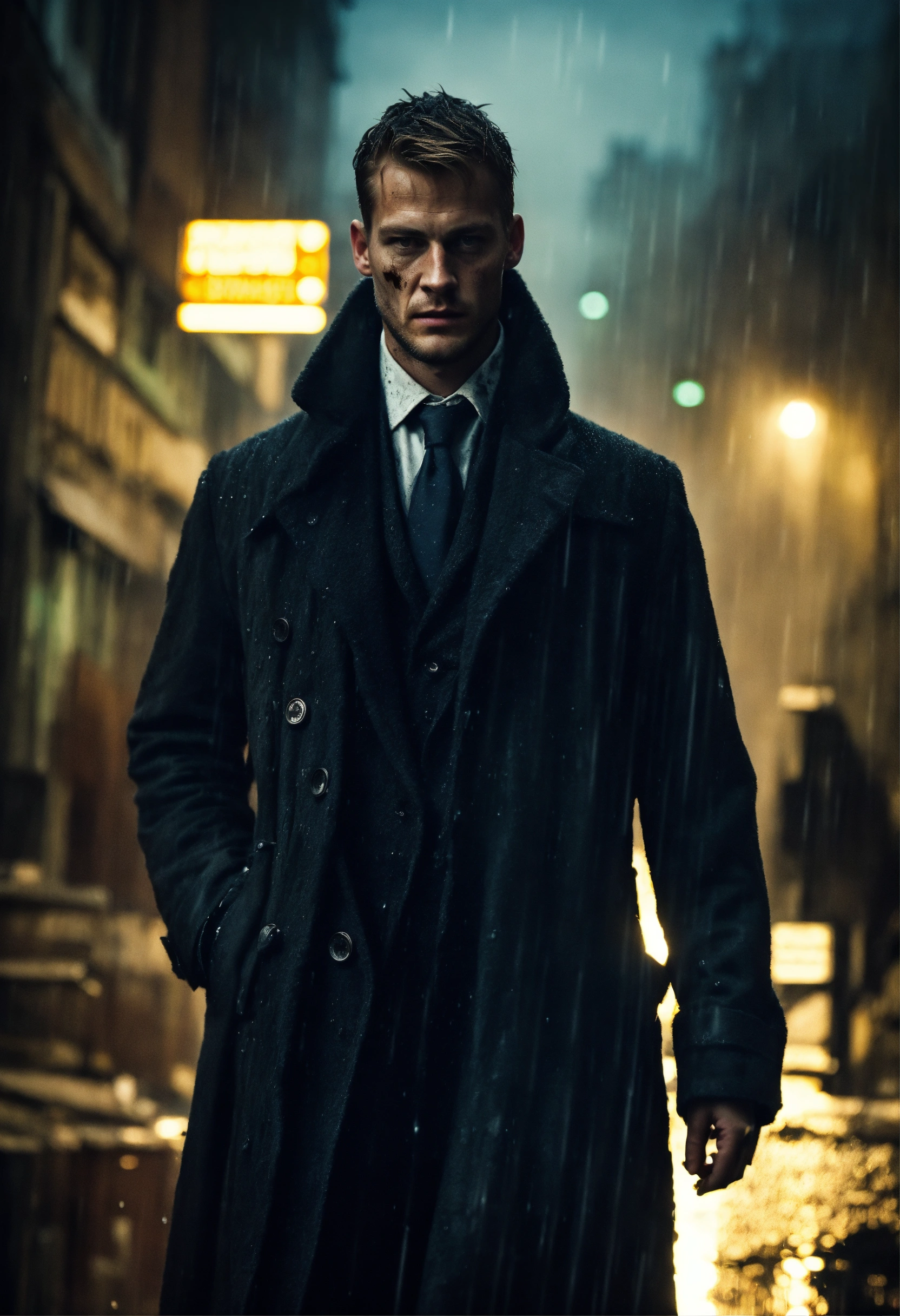 Beautiful tall man, 33 years old kinnaman, zombie-infested city, dark, cinematic, epic, rainy, detailed, realistic photo face, long coat