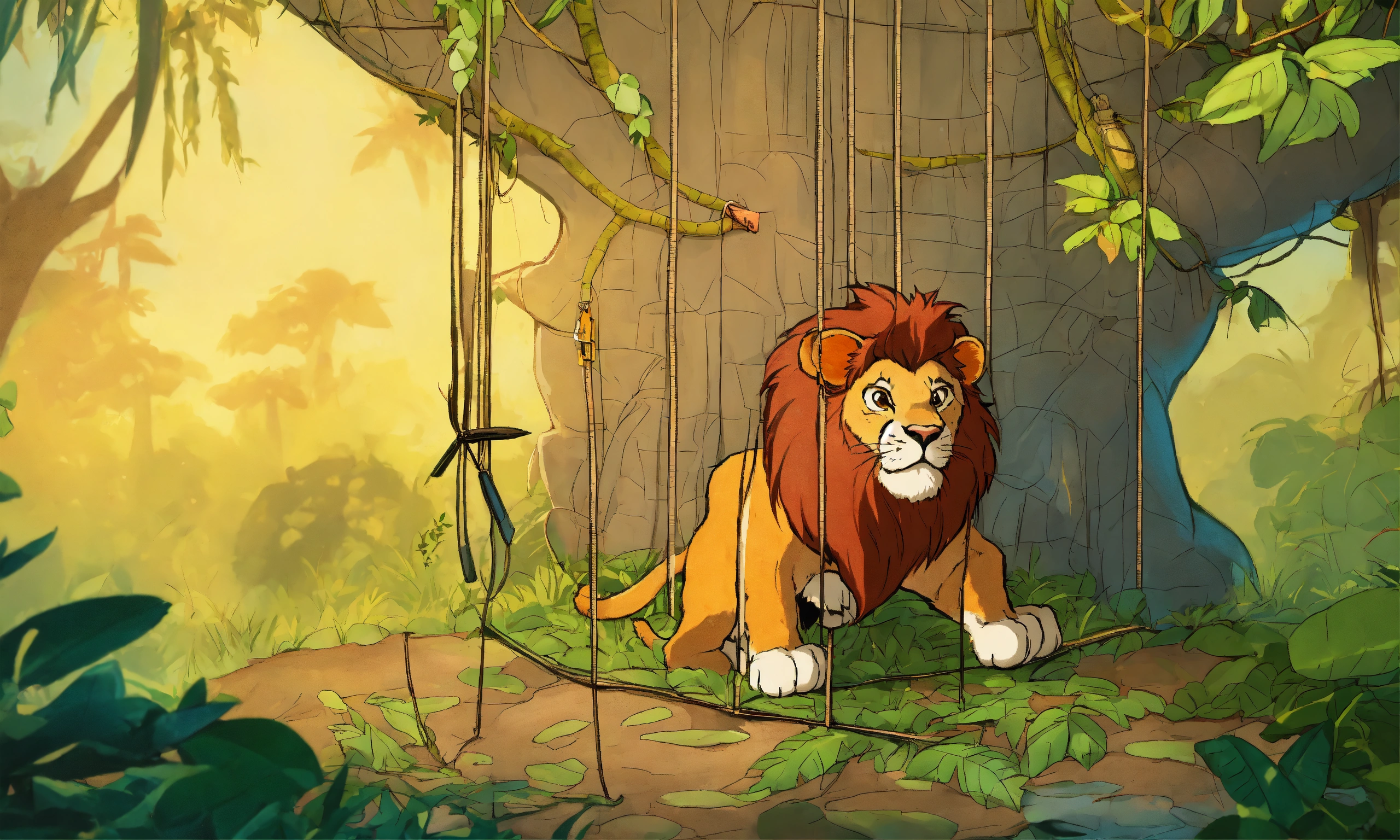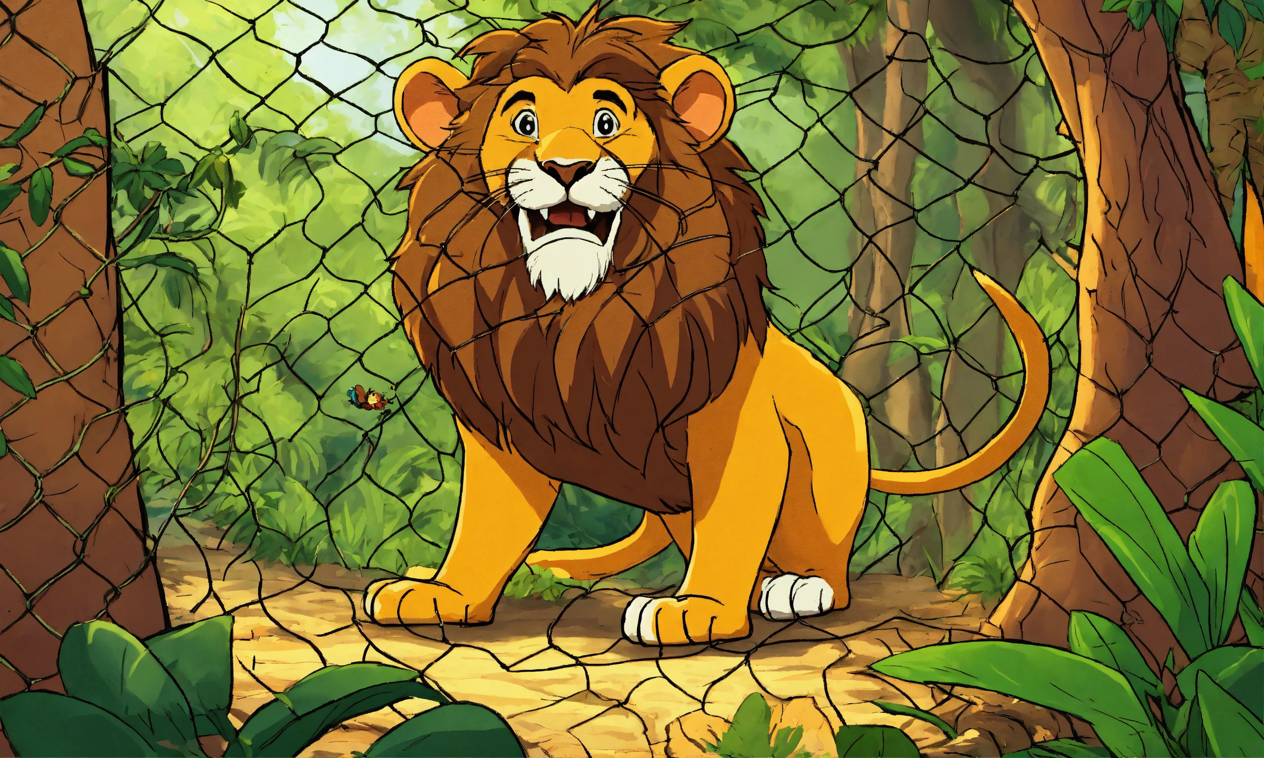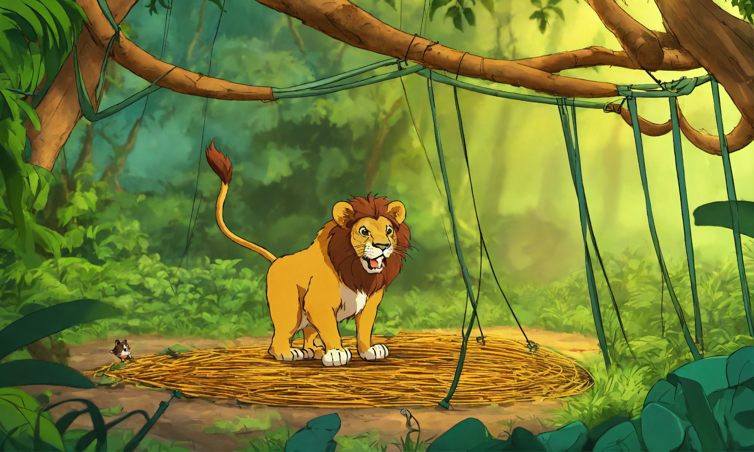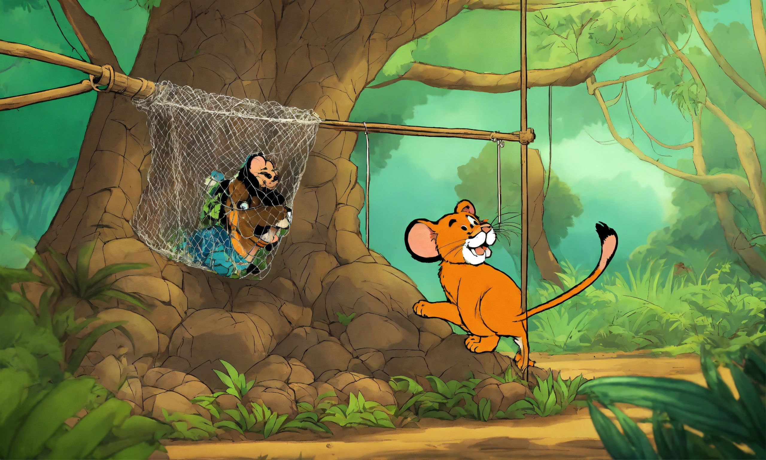 Cartoon in a jungle mouse cut net in which big lion was captured and trapped then hang to the tree
