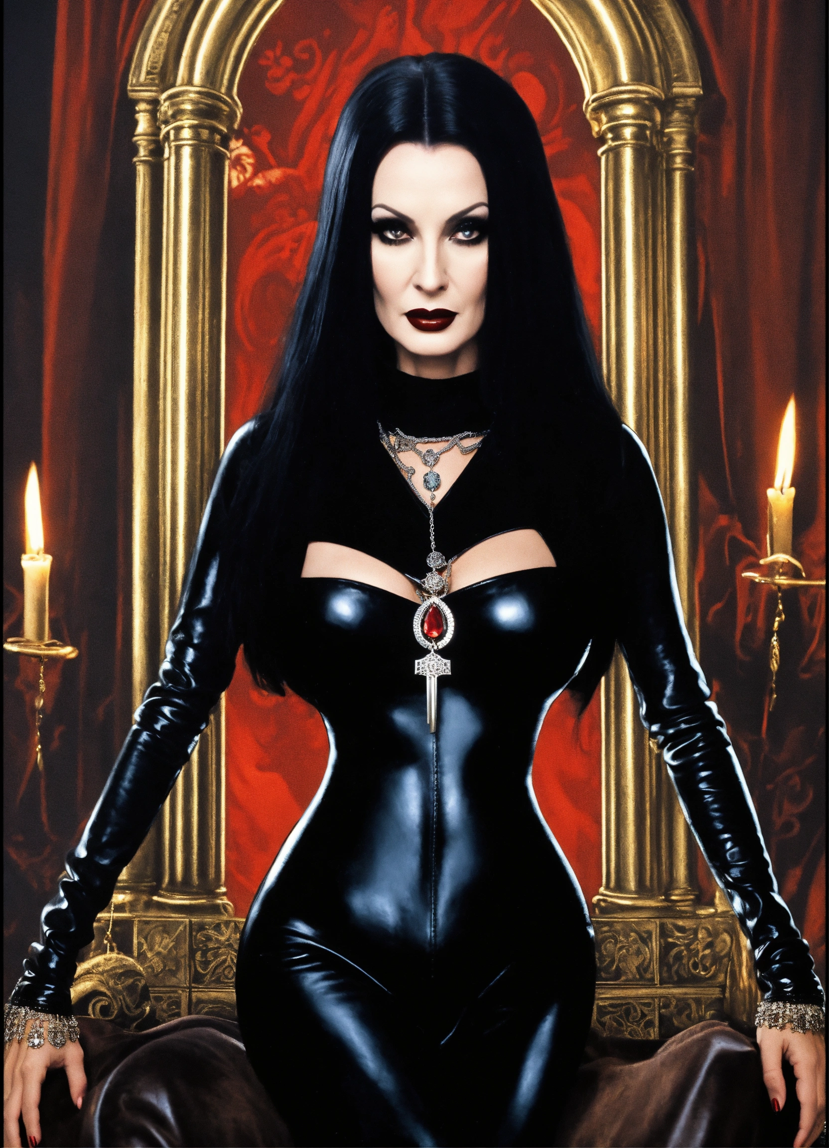 Extremely powerful very evil satanic goth hypnotist "morticia addams julie strain evilynn vamperilla ", wearing black leather outfit with boots & "entrancing jewelry" using a small pendant necklace to put you in a trance at your front door, her powerful eyes bring you to kneel, mindless & helpless, most powerful sorceress in existence, obey without question, she is extremely entrancing
