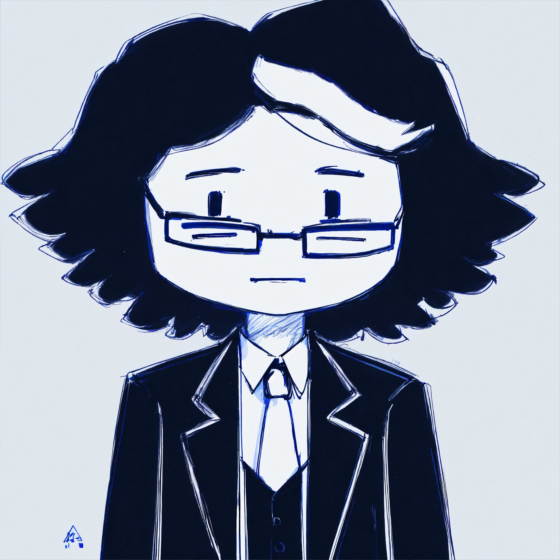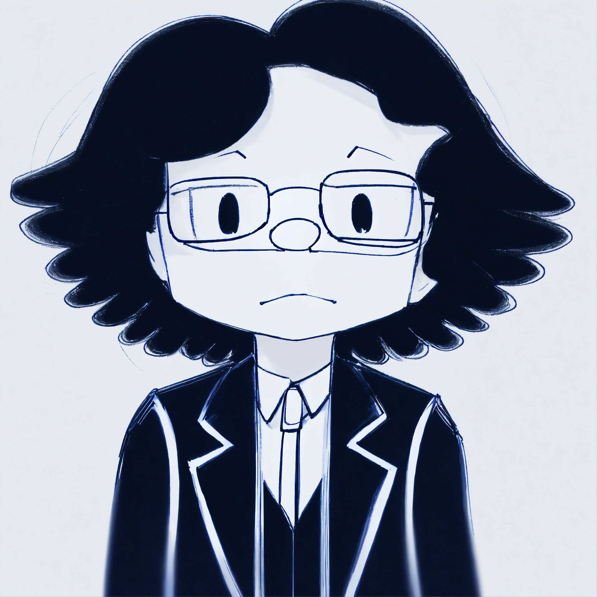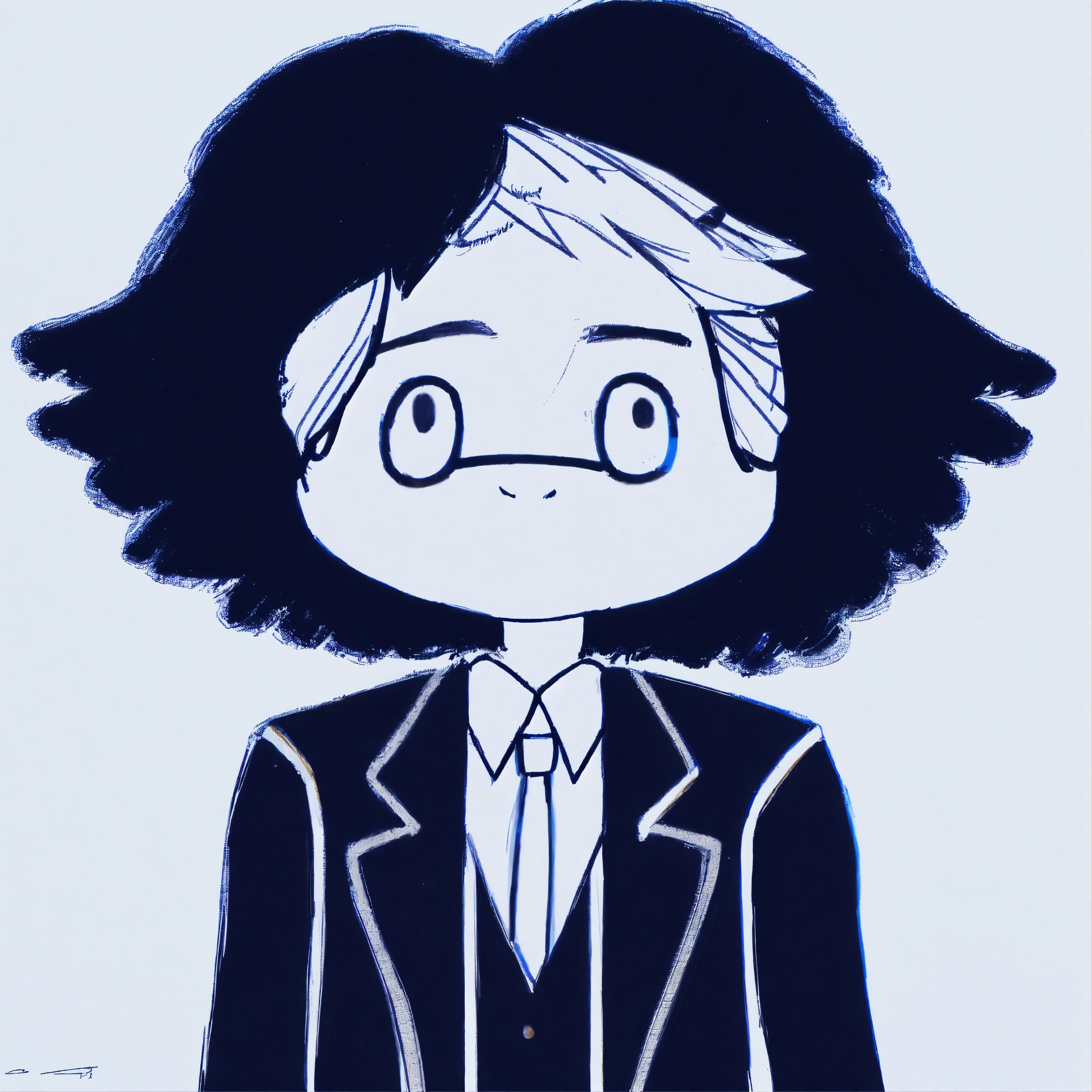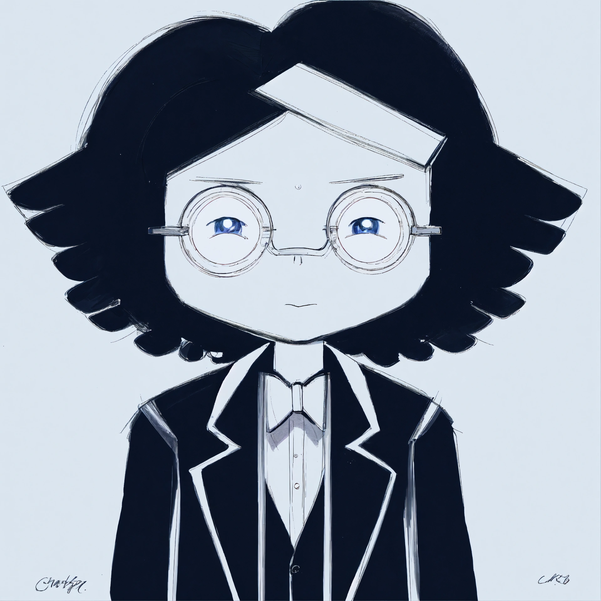 A man in a black suit and with a white tie and wearing small round glasses and with black short hair and a single lock of white hair, masterpiece, best quality, drawn by ink, drawn by pencil, digital art, 8 k, beautiful drawing, highly detailed, concept art, sharp focus, ultra realistic illustration, anime++