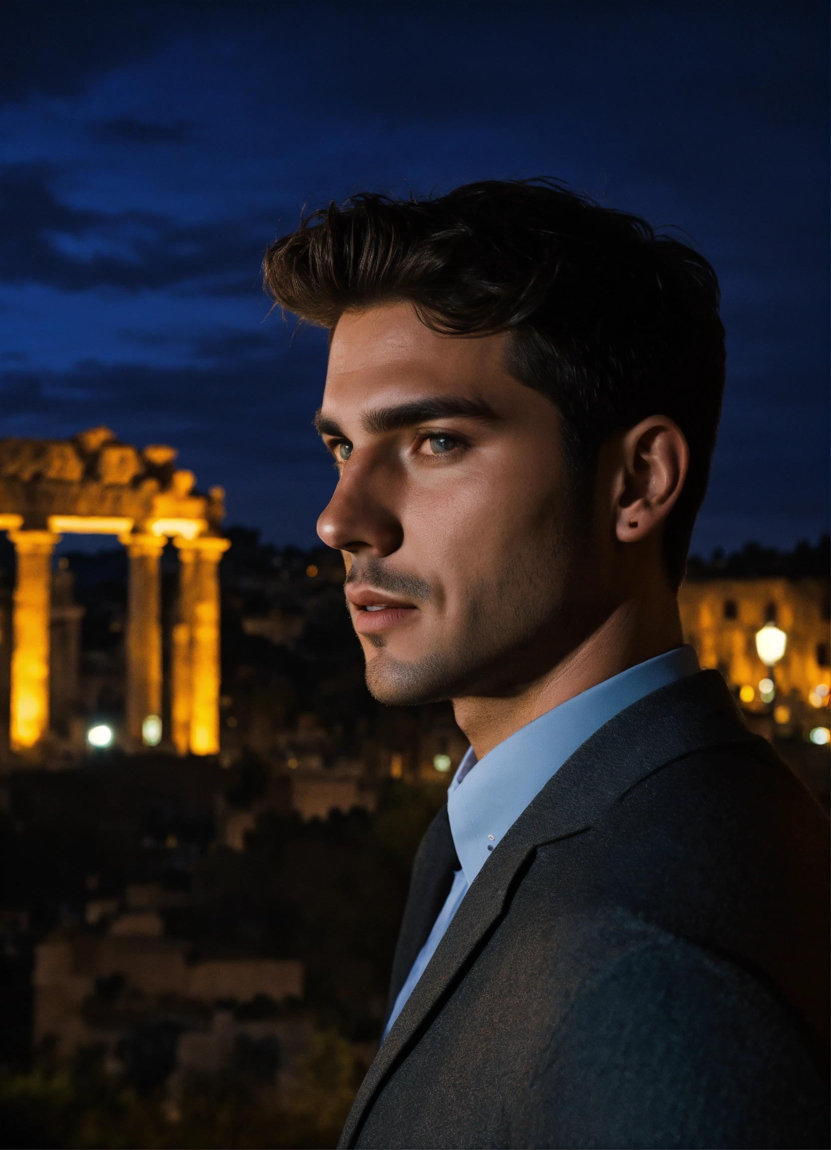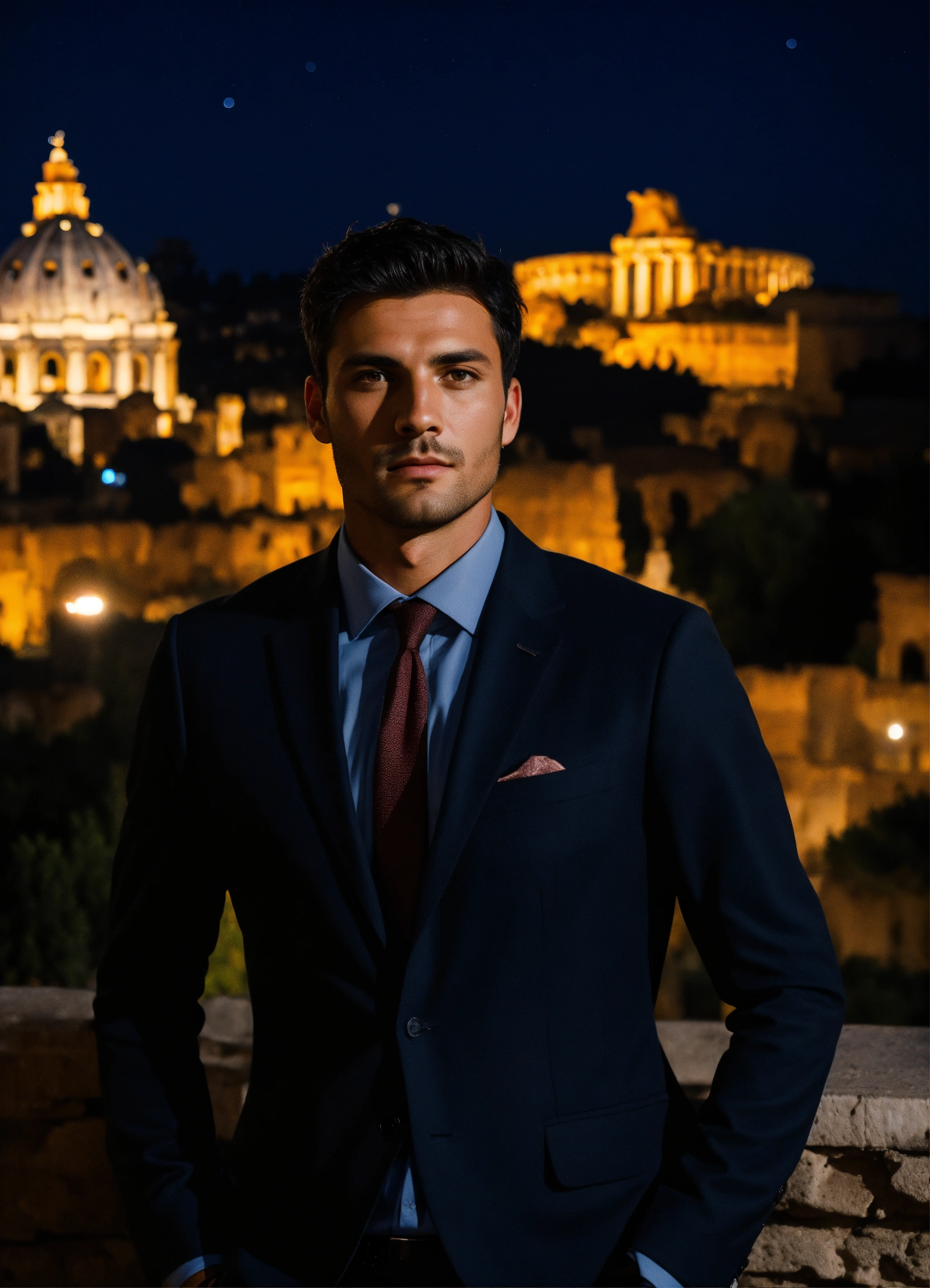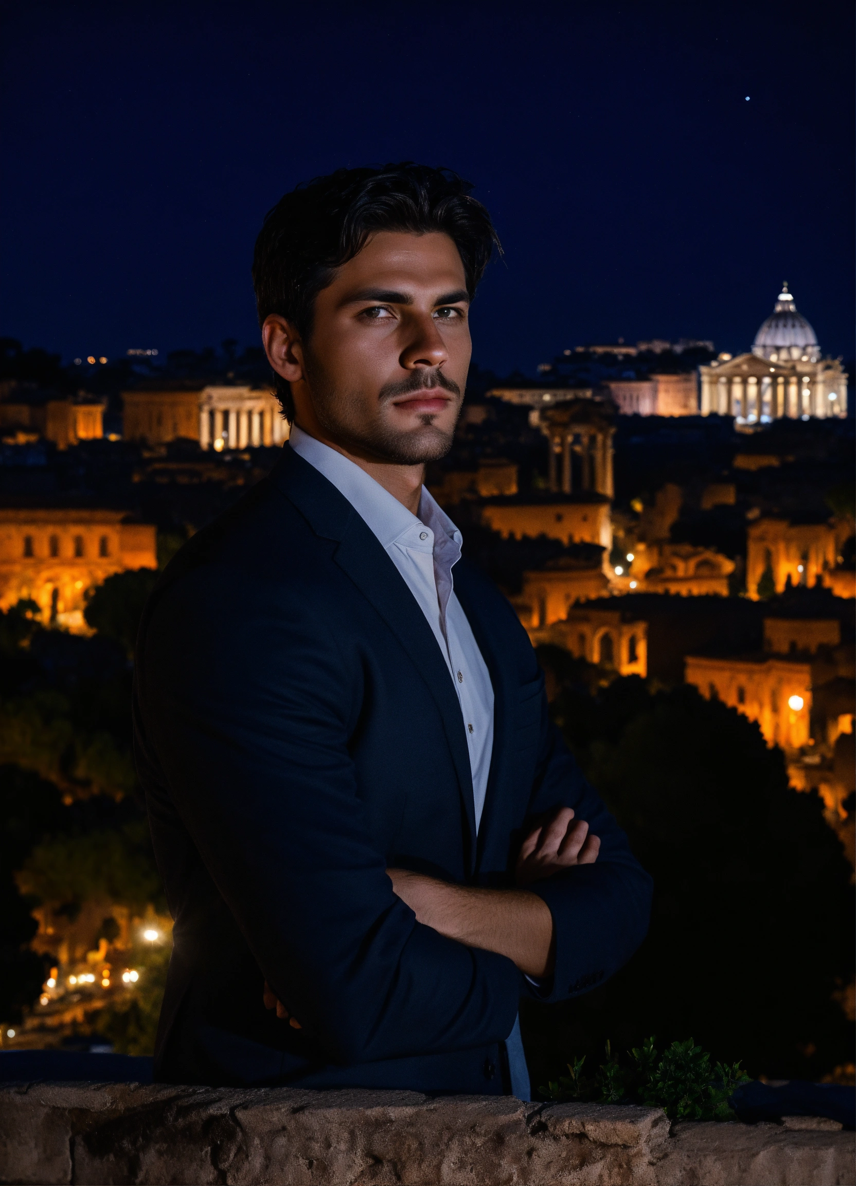 Photo of a model one man with short dark hair with desire in his eyes, looking into the camera, in front of the forum romanum of rome head left looking in the camera in full view at night as background, realistic, portrait, not painted, very detailed faces, skin with pores, 4k, dark suit, skin not smoothed, looking into the camera, dark shirt. rome skyline in full view at night as background