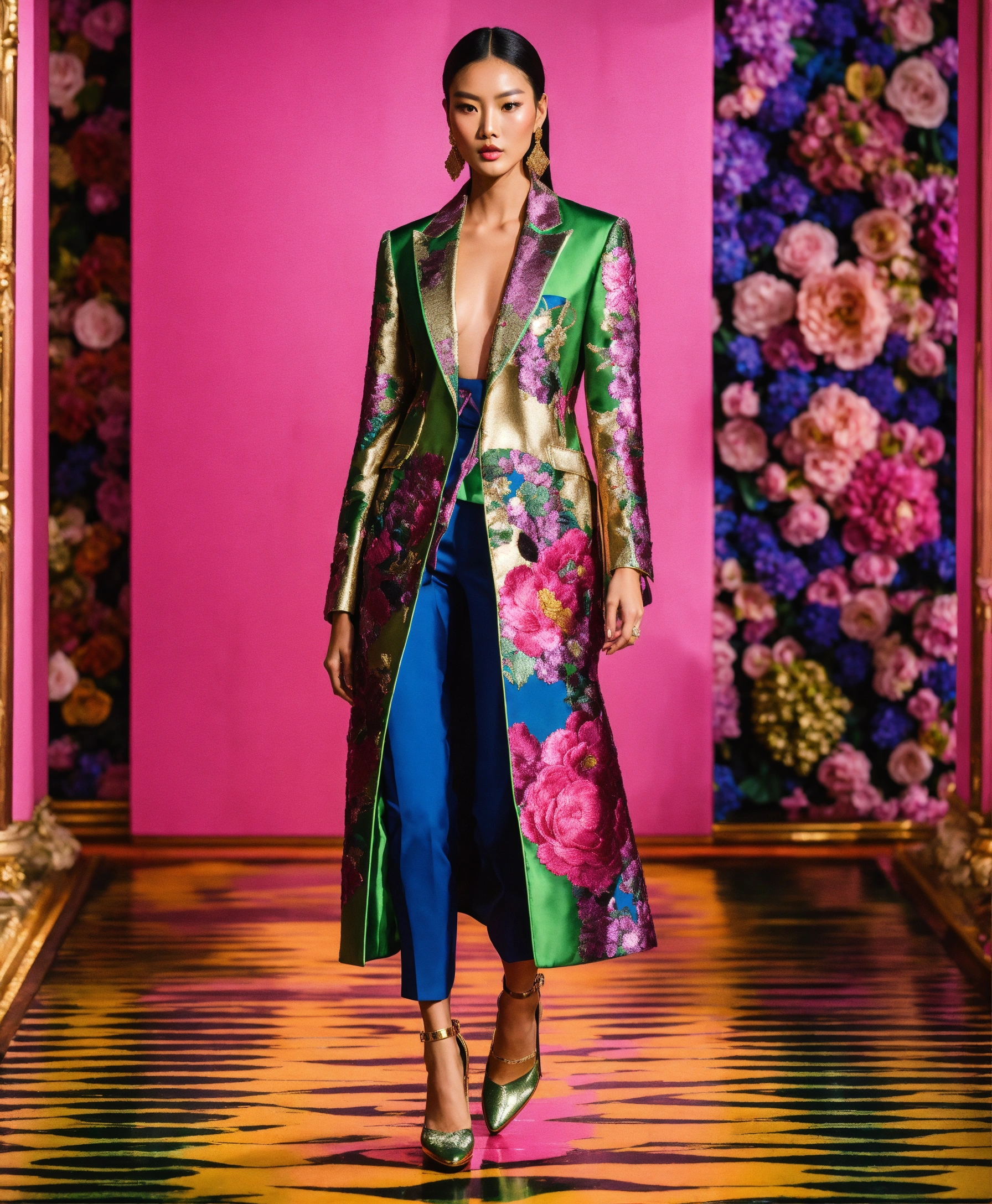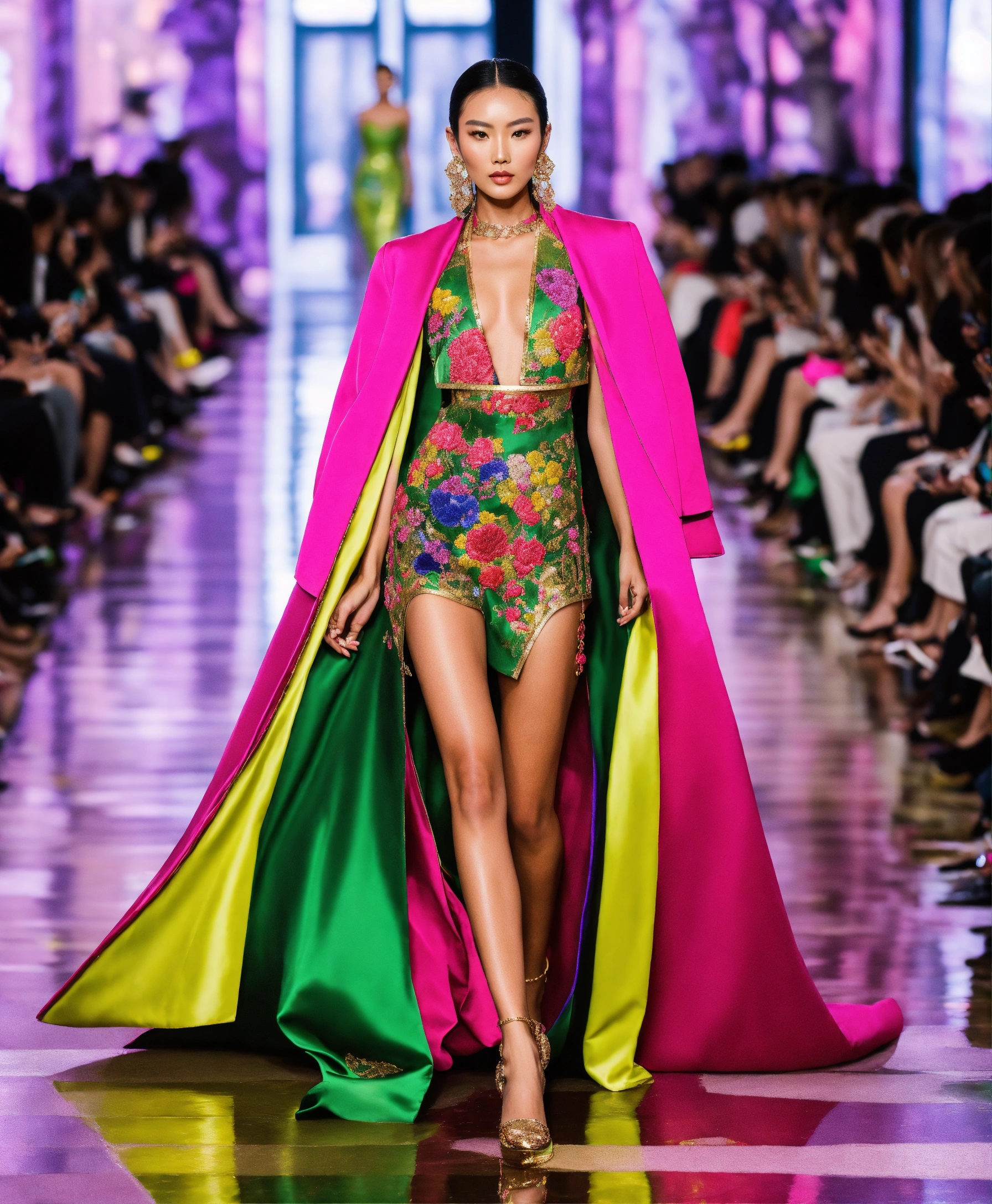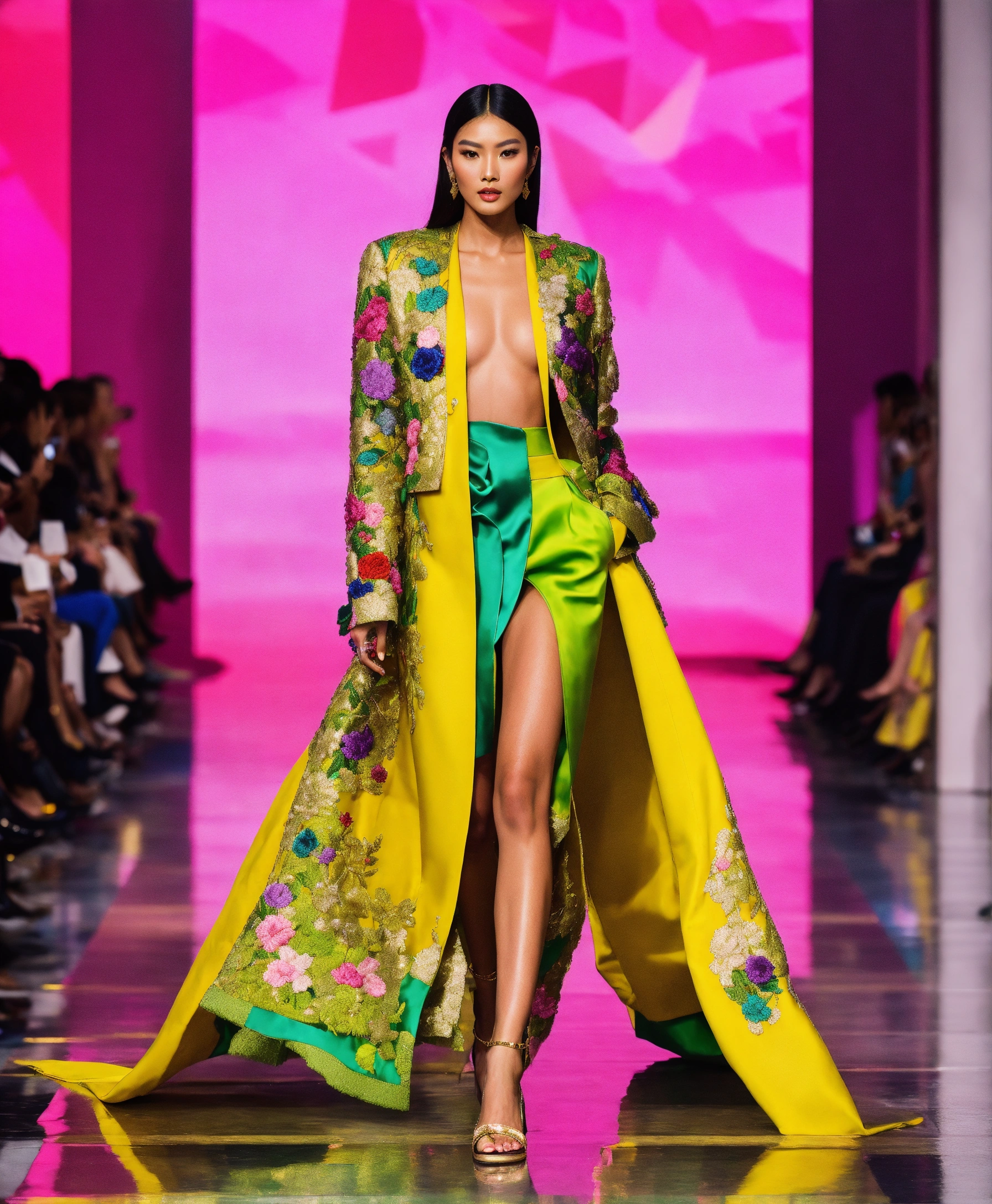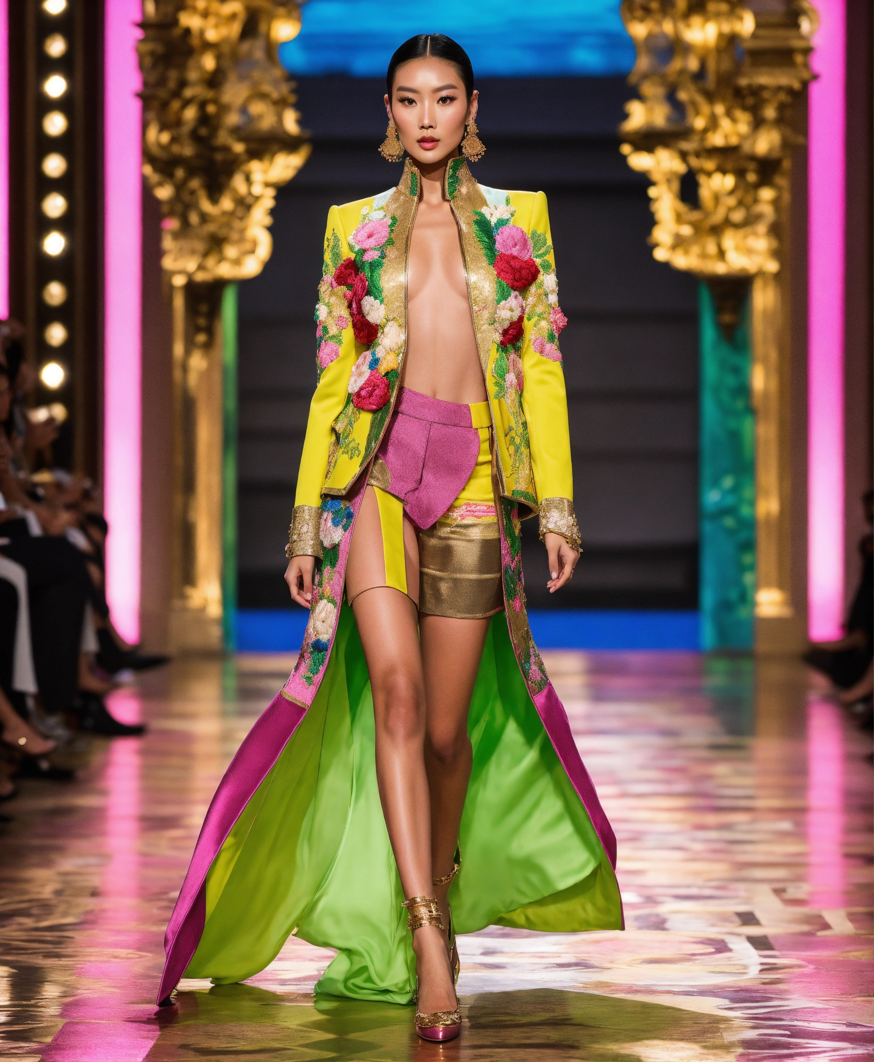 Ultra realistic full body photo of a stylish beautiful asian runway model walking the runway modeling summer cruise designer wear brave, paris versailles details cutouts and gold geometric pattern floral structured tailored jacket pink gold green lilac peridot silver magenta lime fuchsia yellow blue black gray copper mauve bronze haute couture embroidered contrasting colors vivid intricate bold vibrant glamorous ultimate elegance beautiful luxurious awesome wealthy opulent exquisite resplendent magnificent sublime 12k