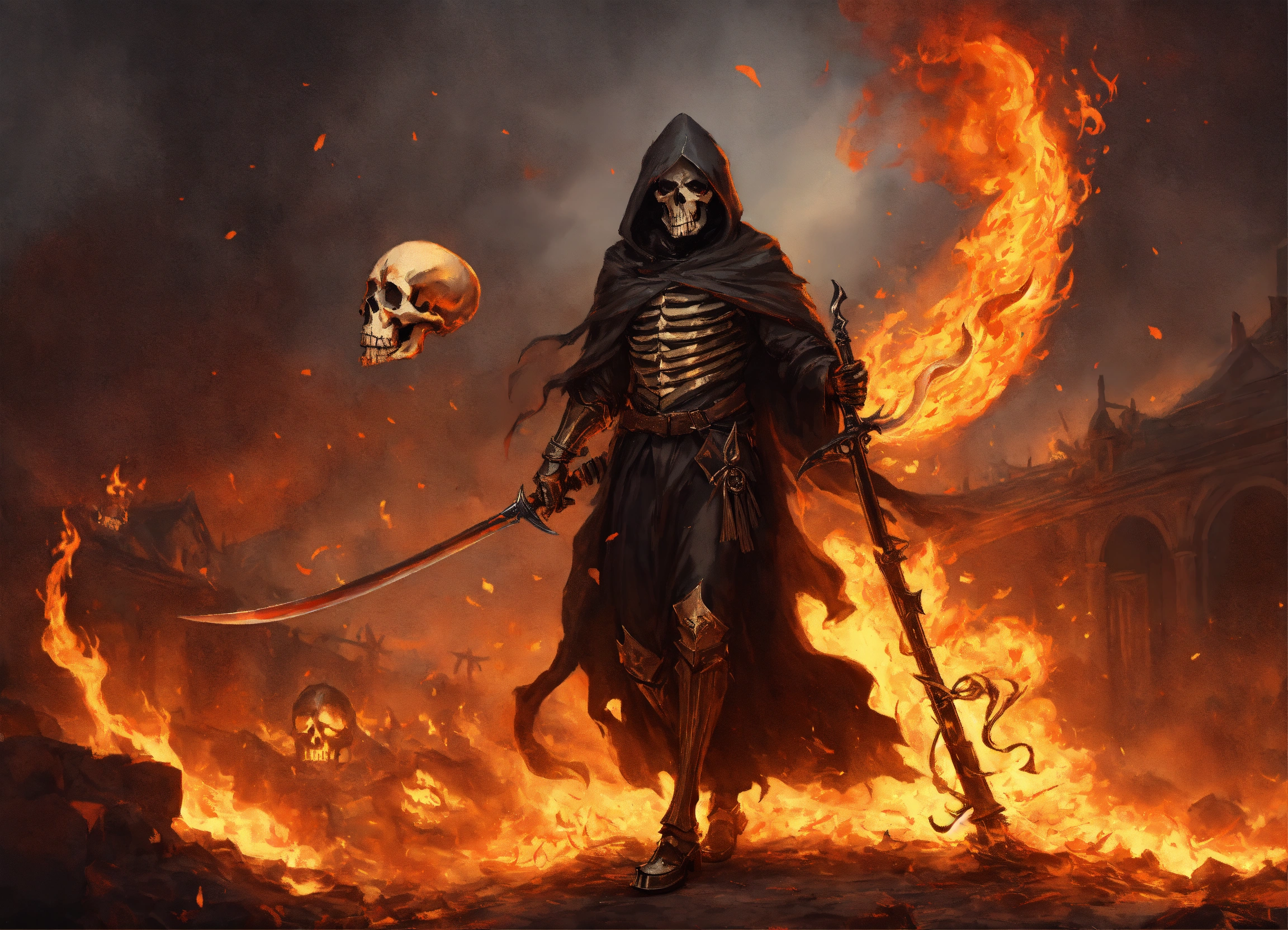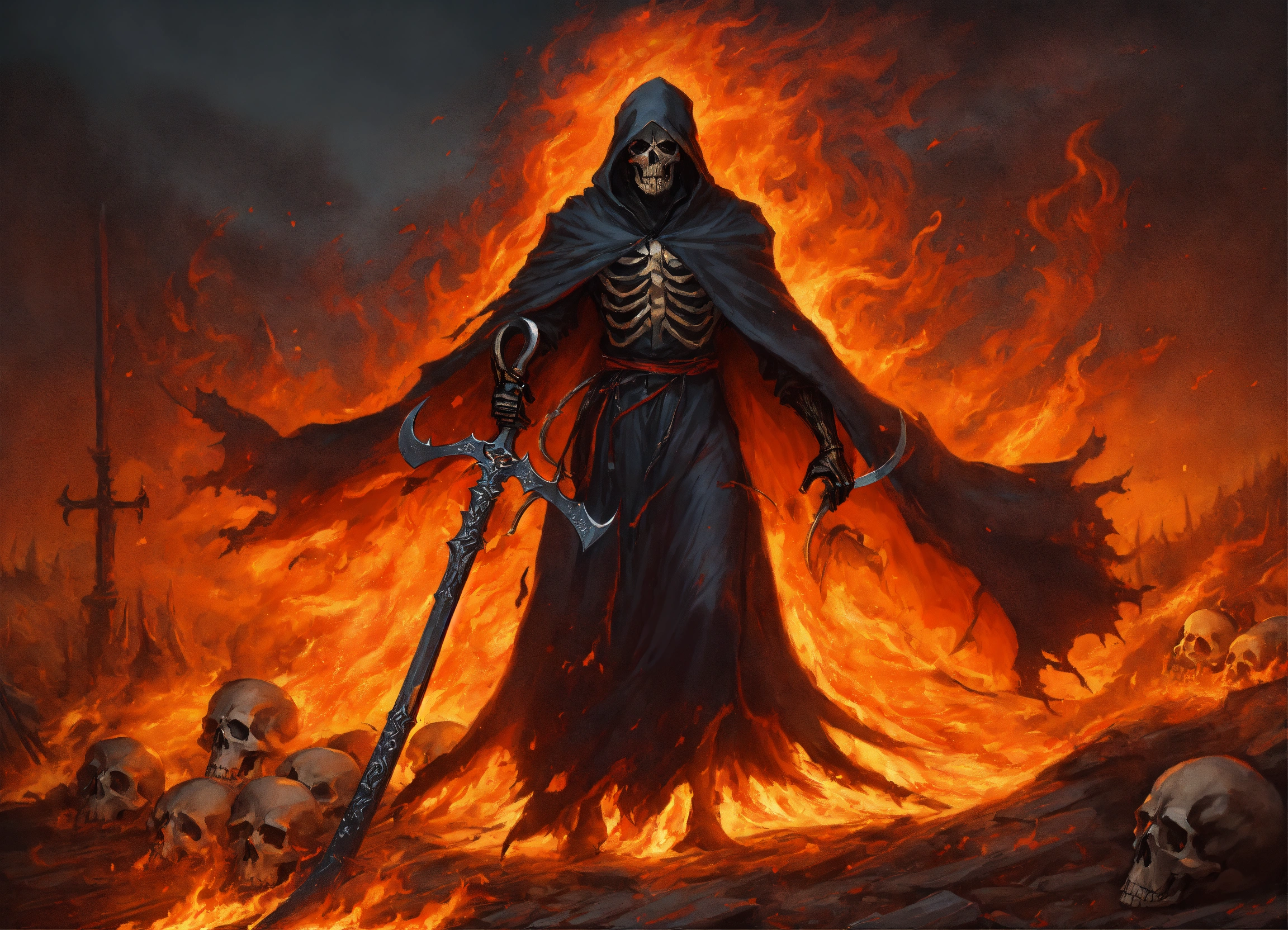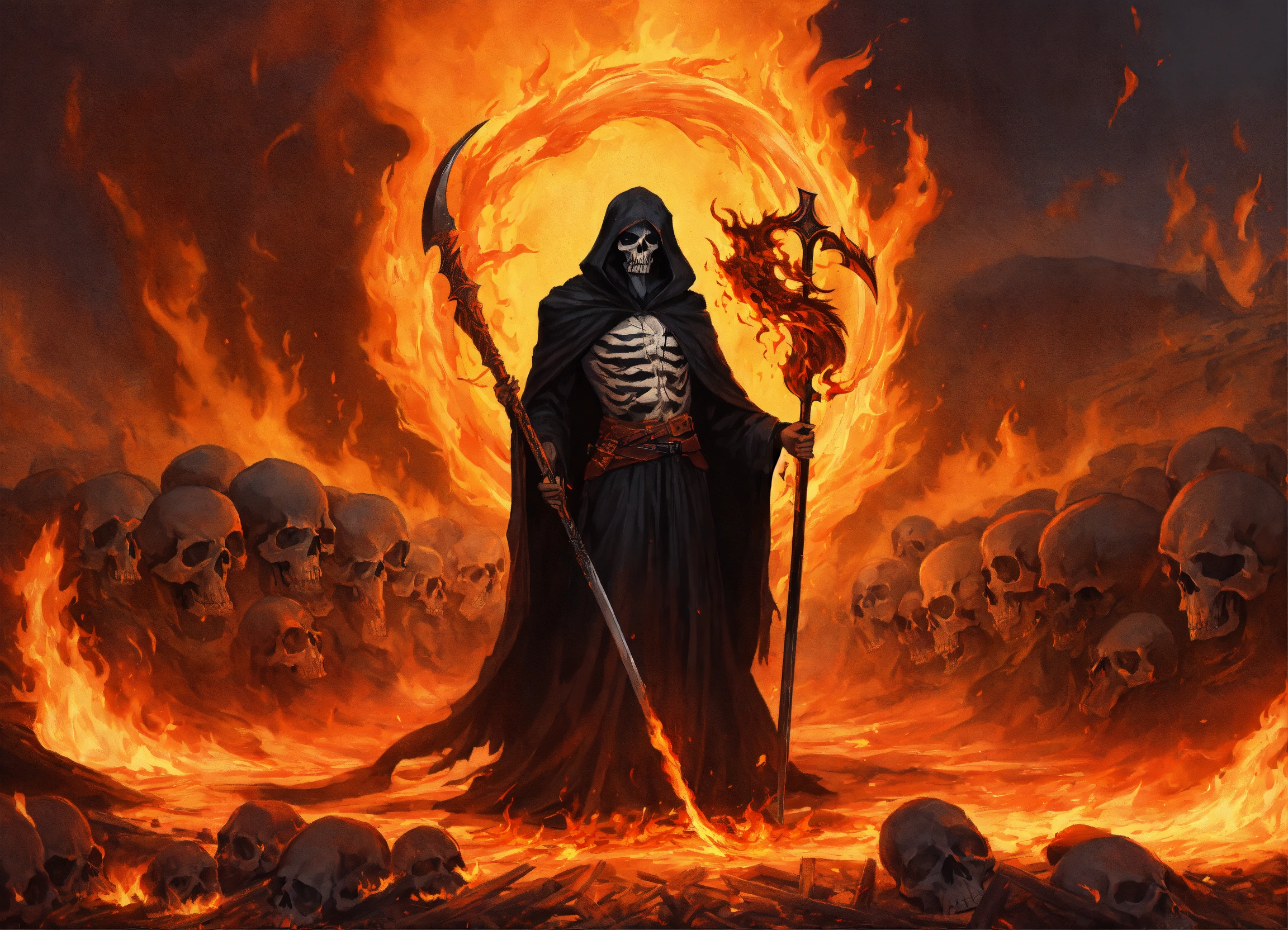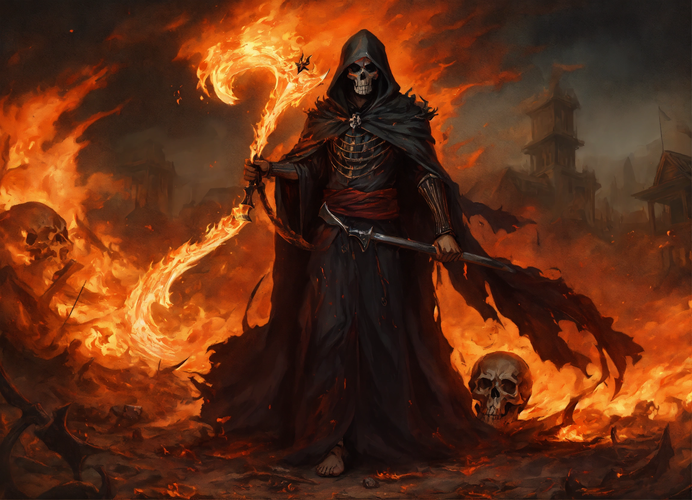 The grim reaper with flaming scythe raised for the kill, tattered flowing robes of fire, surrounded by fire, piles of skulls at his feet, in the style of ashcan school