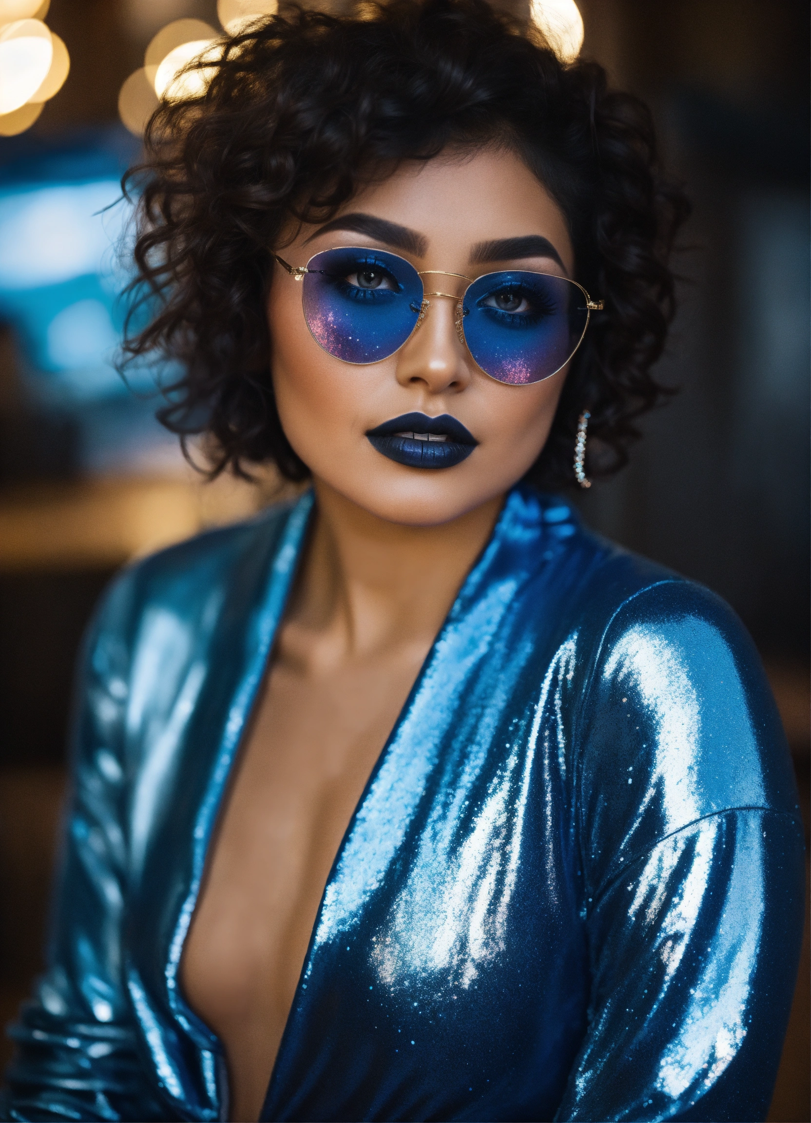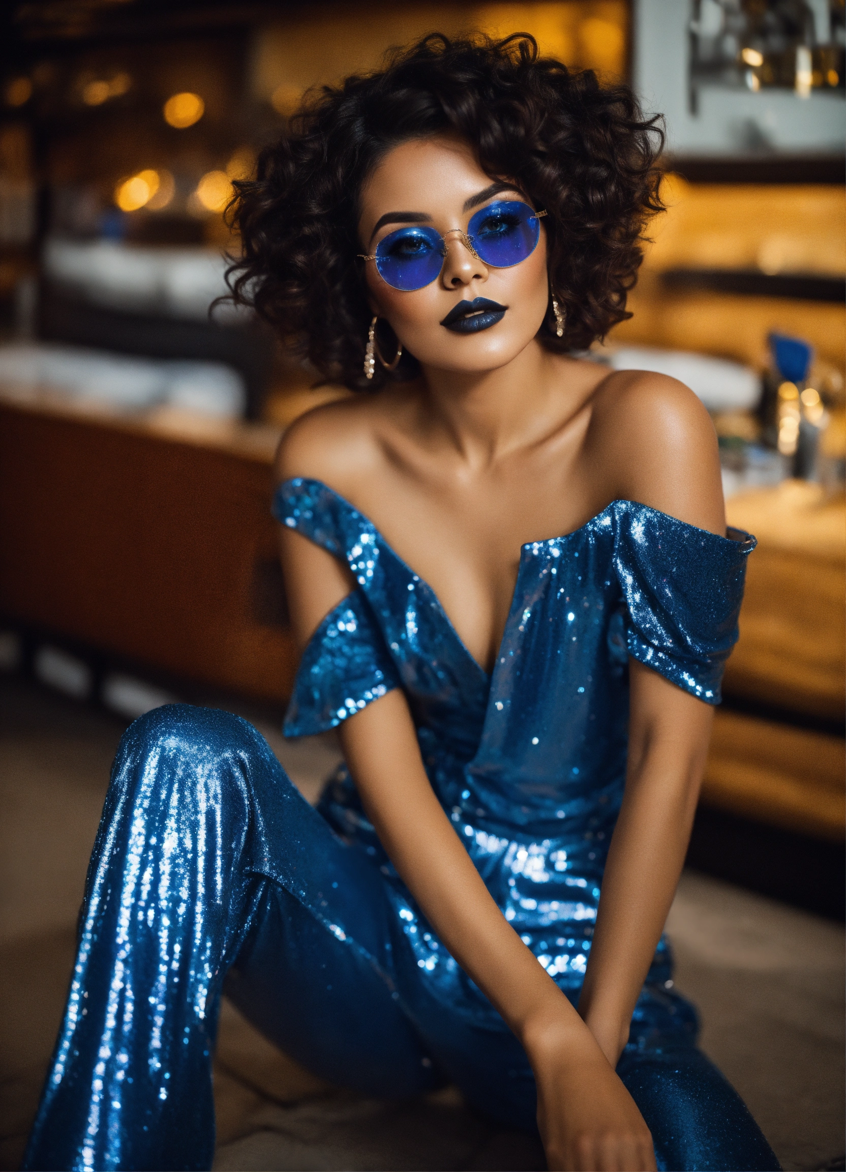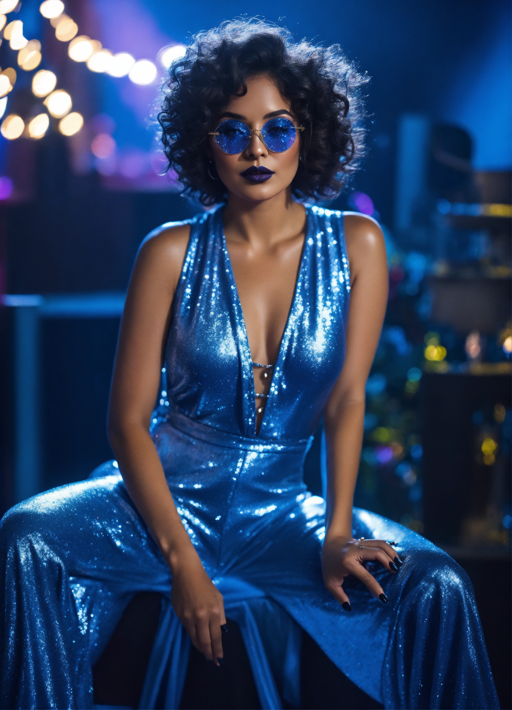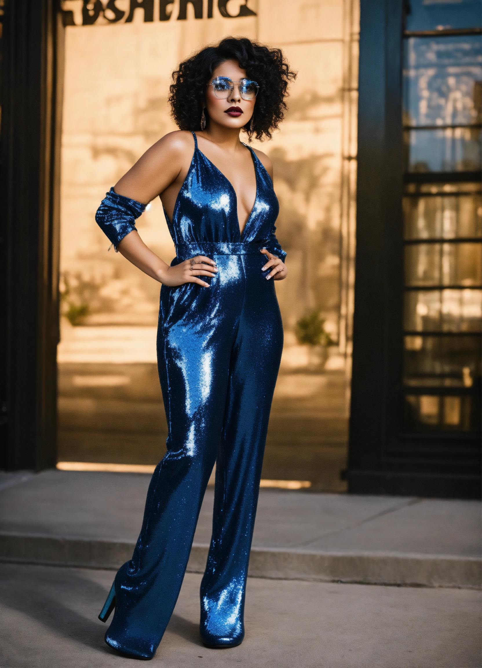 Petite latina woman with short curly hair wearing rimless glasses and sparkly blue metallic jumpsuit with booted heels and dark makeup and dark lipstick and a lot of accessories