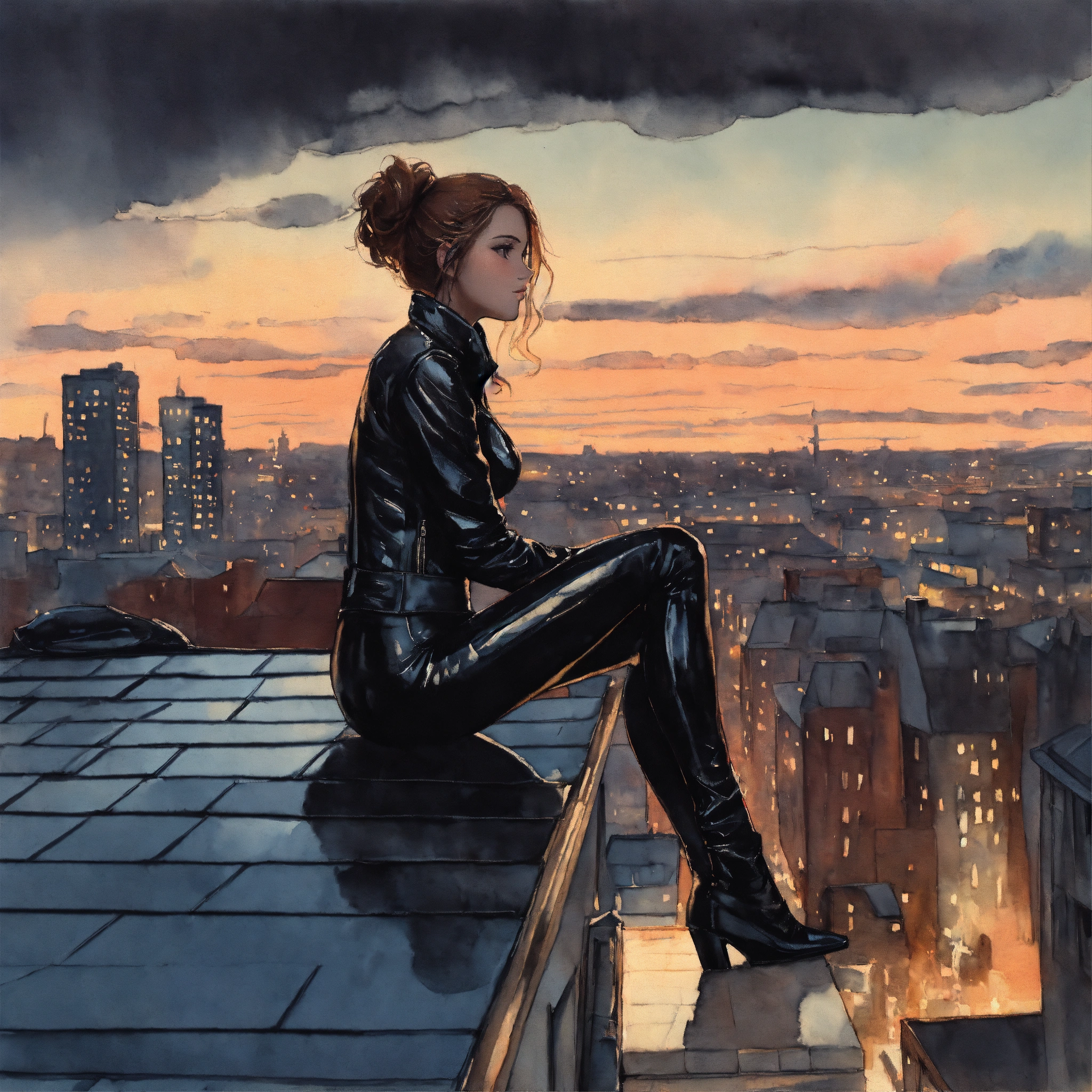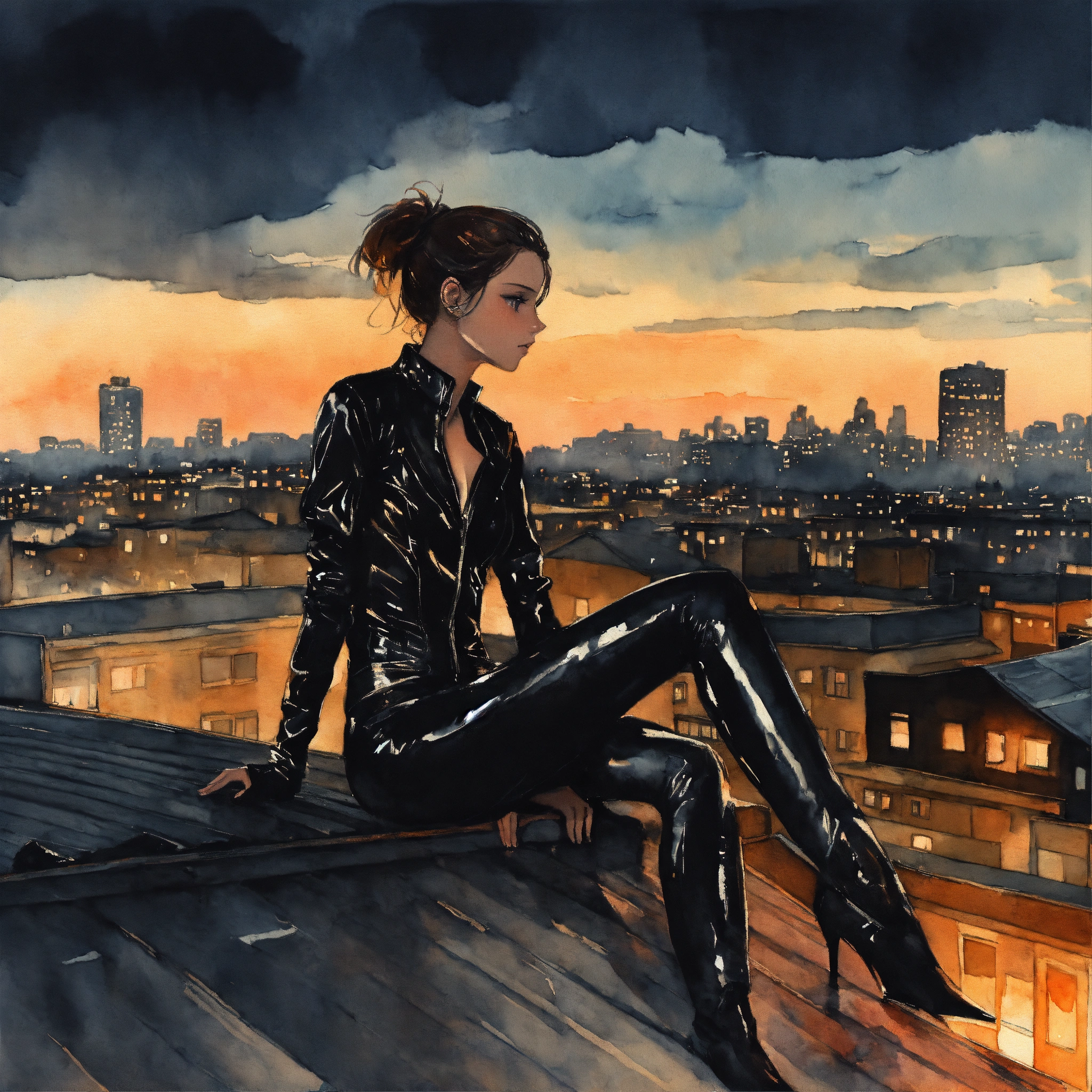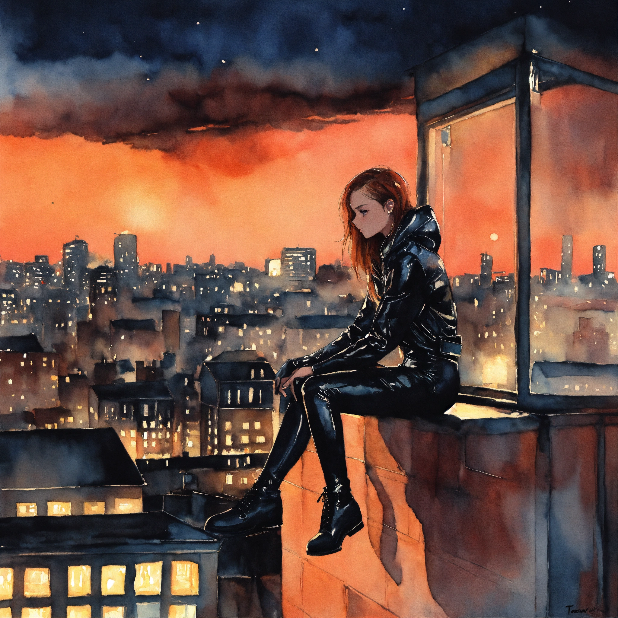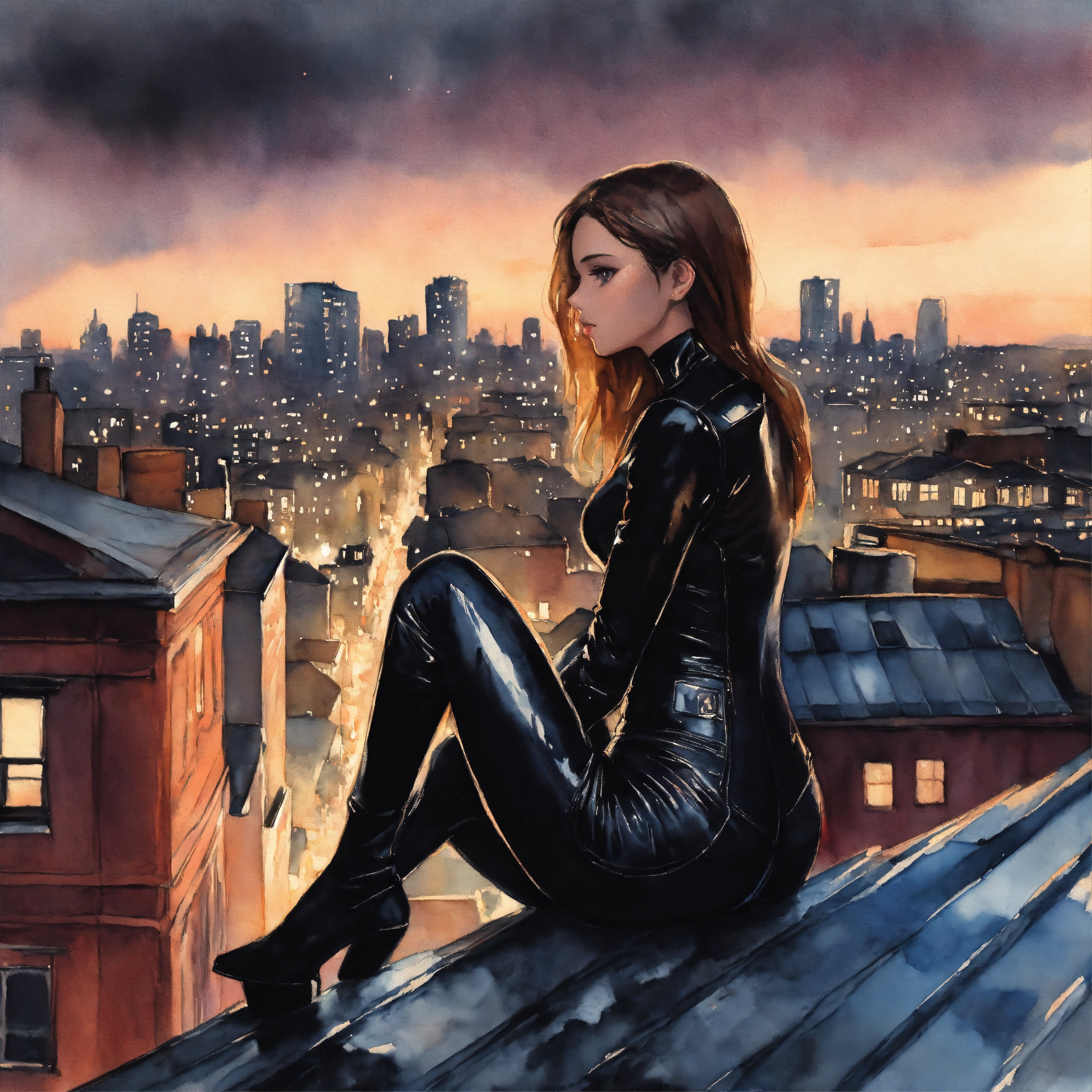 Full body illustration of a woman, young, 18 years old, beautiful, wearing a black shiny leather skinsuit, sitting on a roof overlooking the evening city, watercolors, gloomy and depressing ambient, artwork by tom björklund
