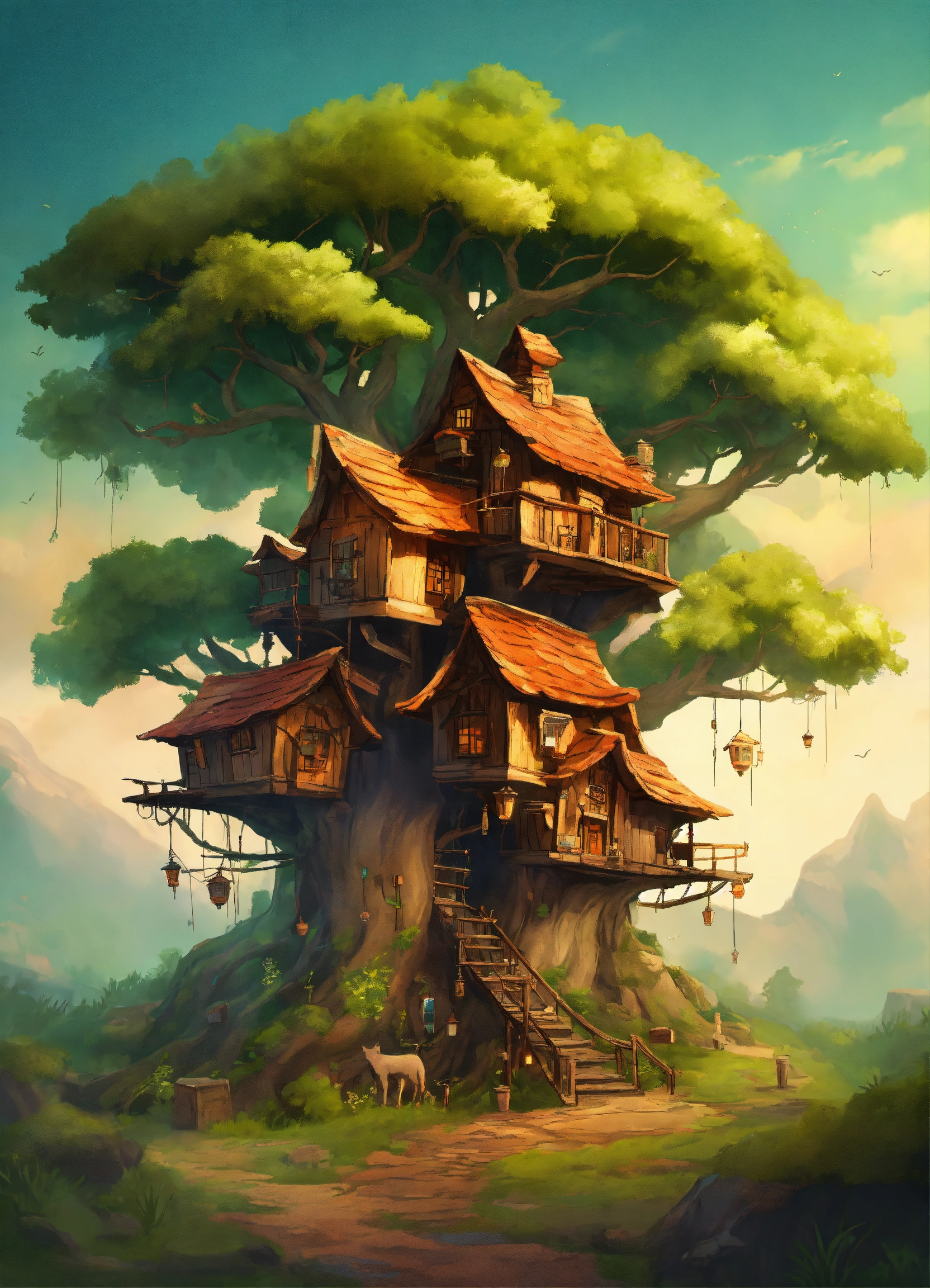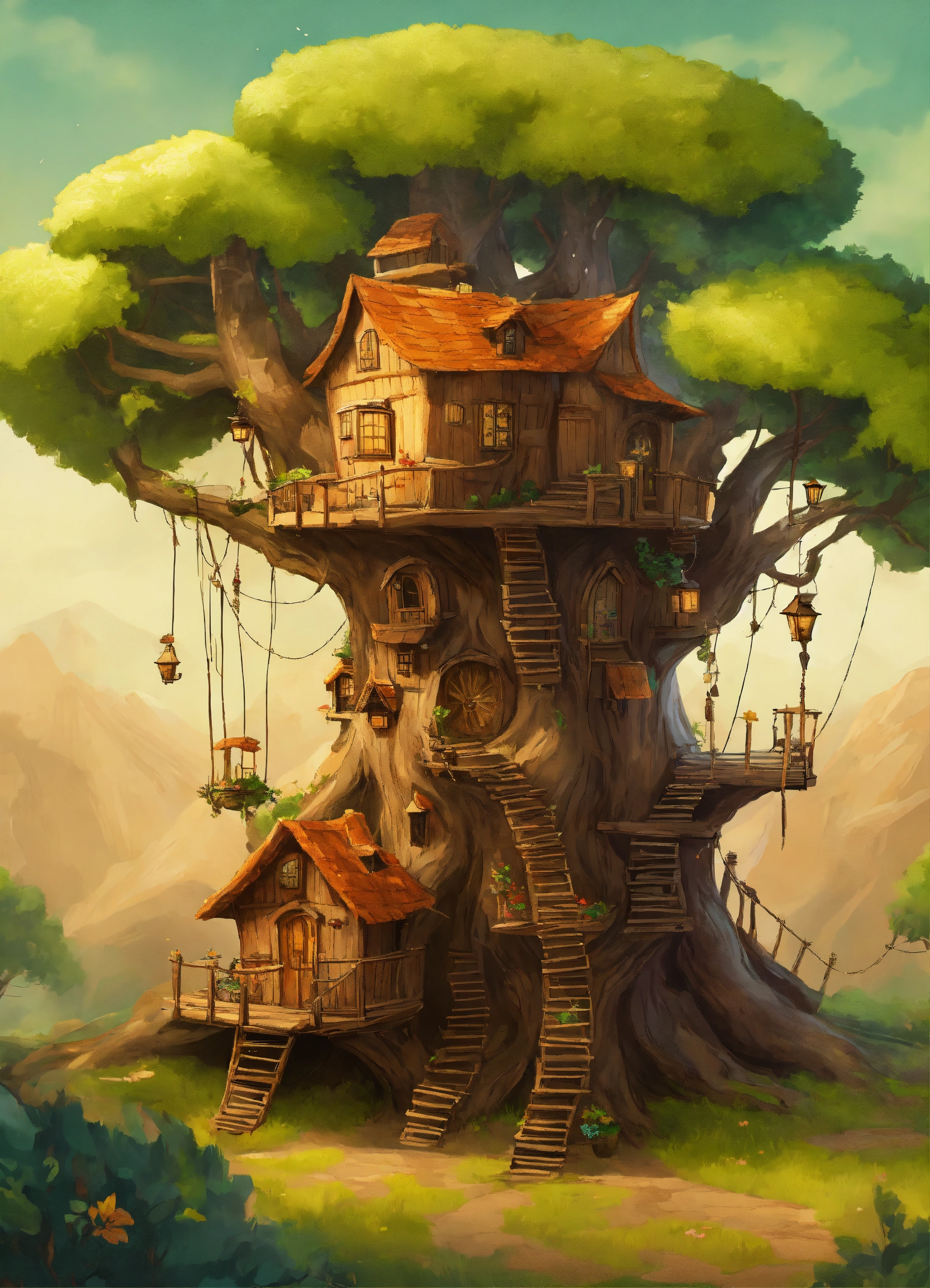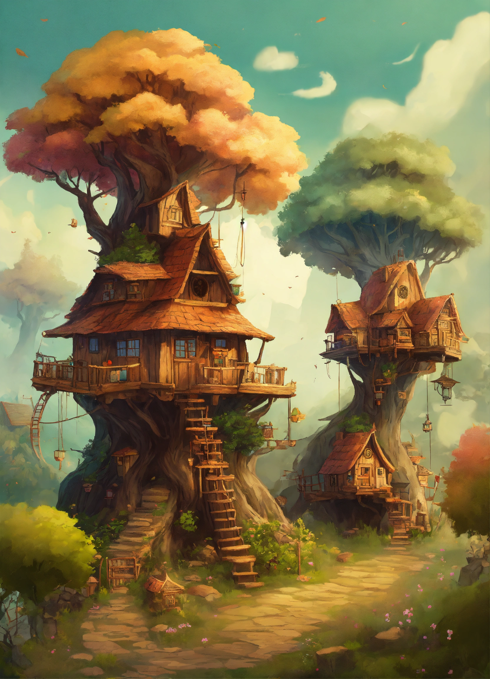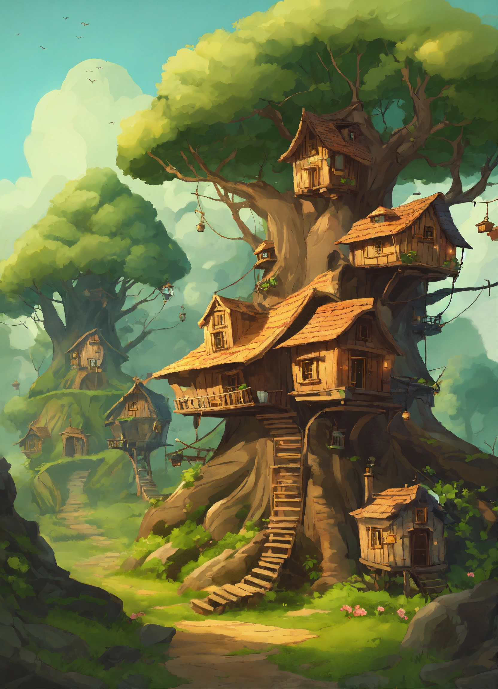 Village fantasy tree houses on gigantic old trees, texture painting, texture vector illustration, nature dusty colors, lots of brush texture