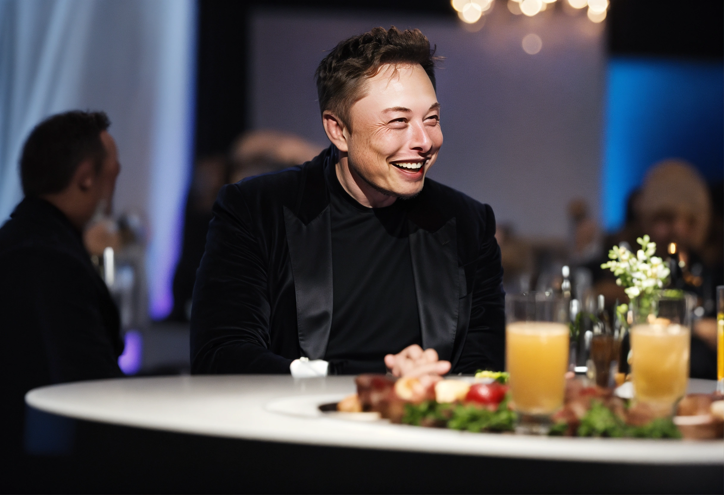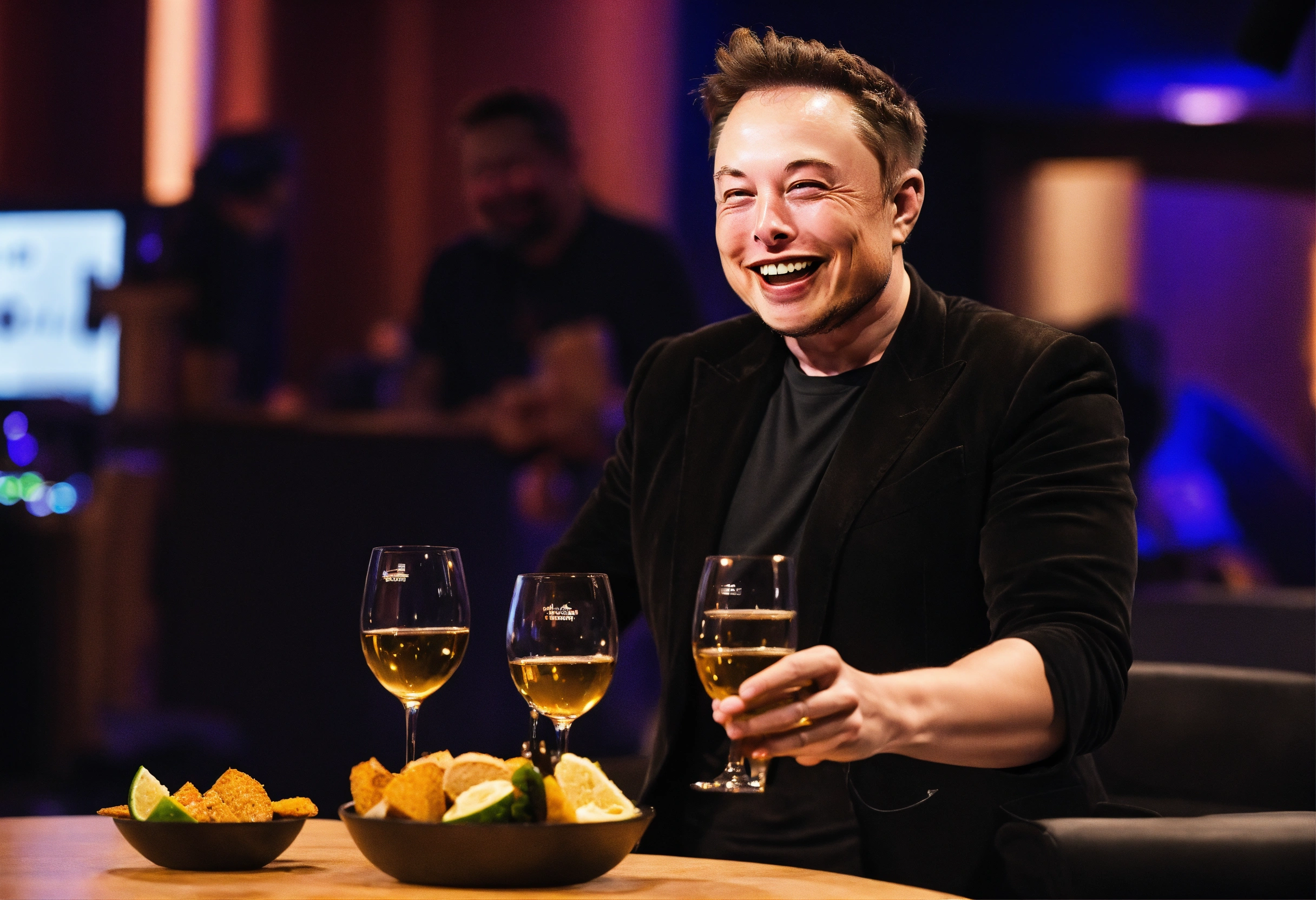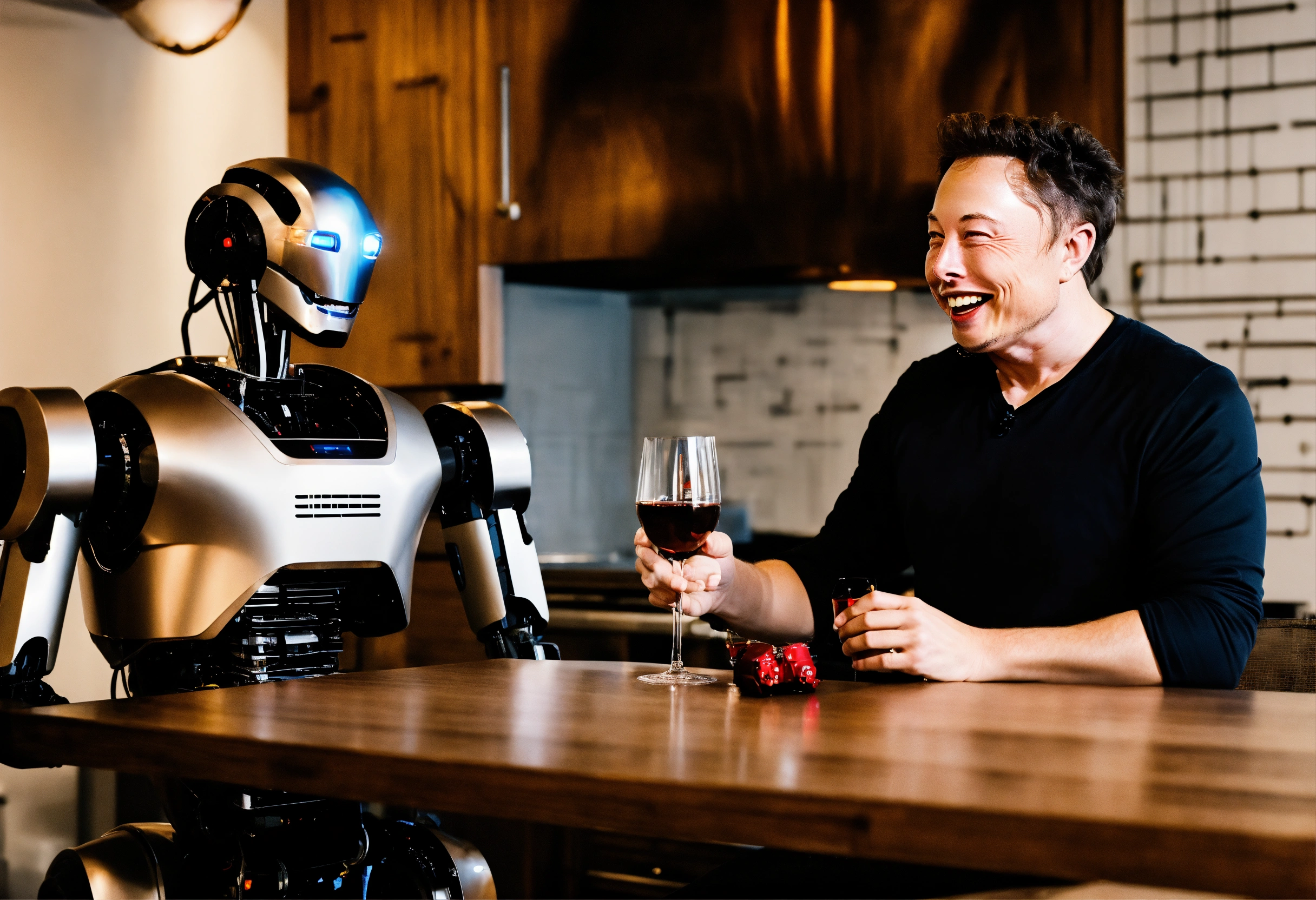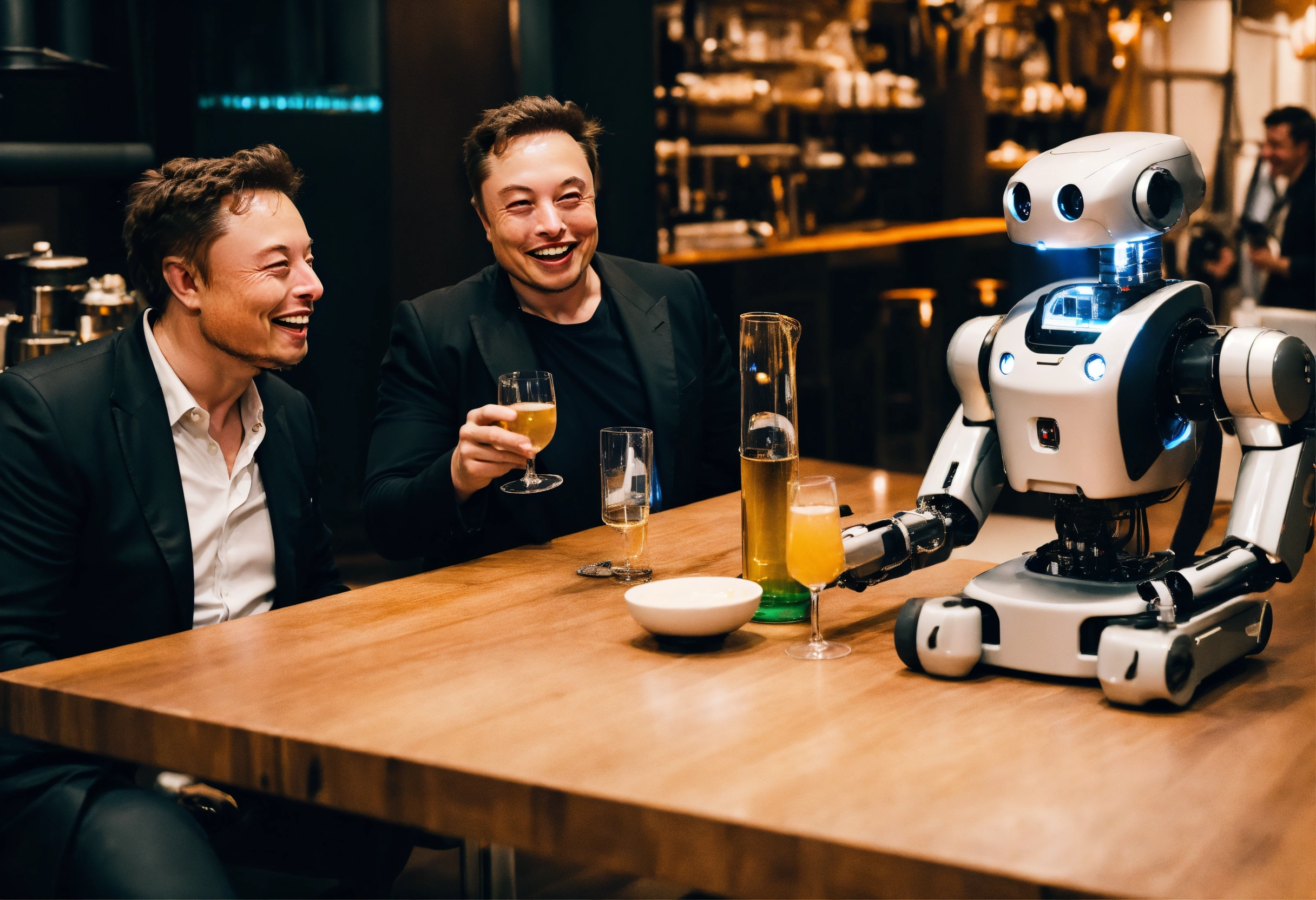 Elon musk laughing while making a toast with a robot
