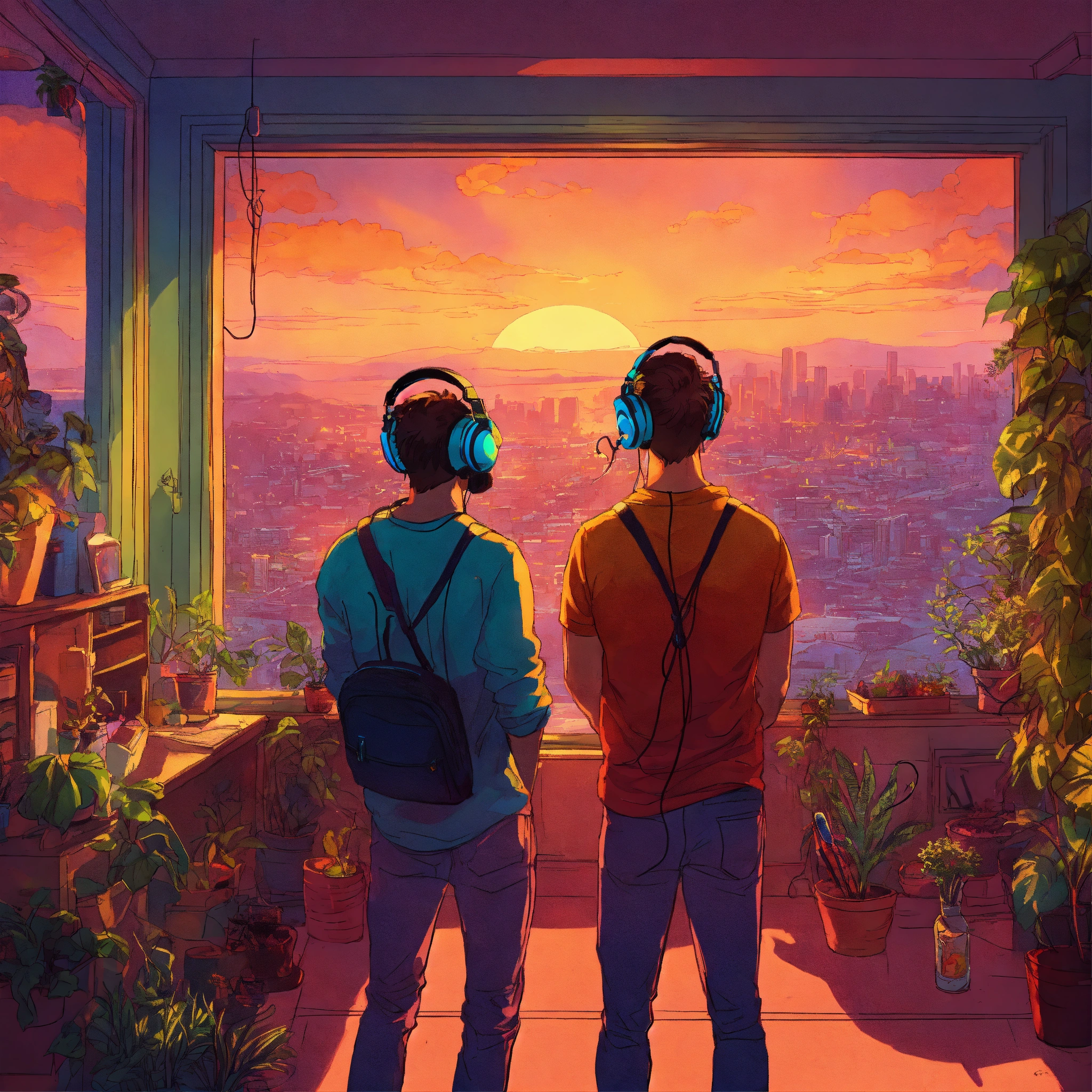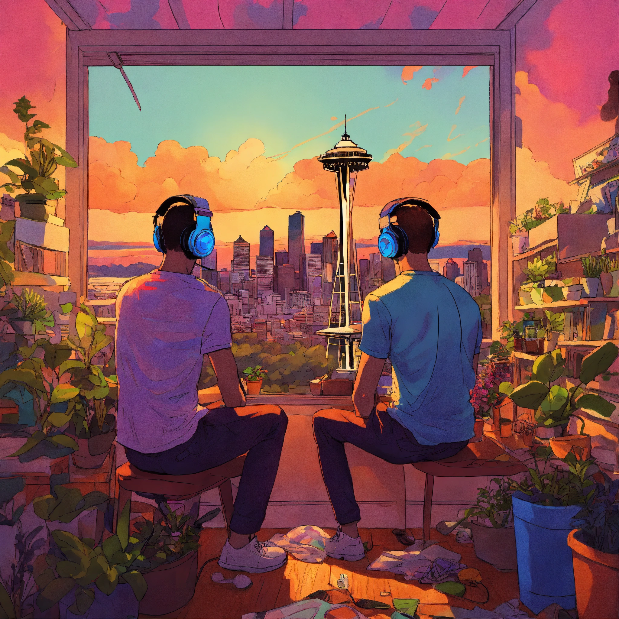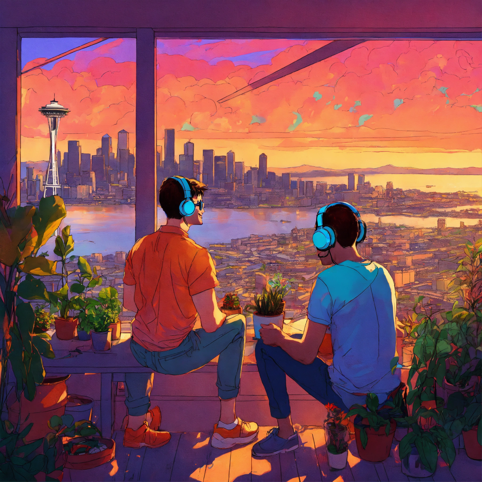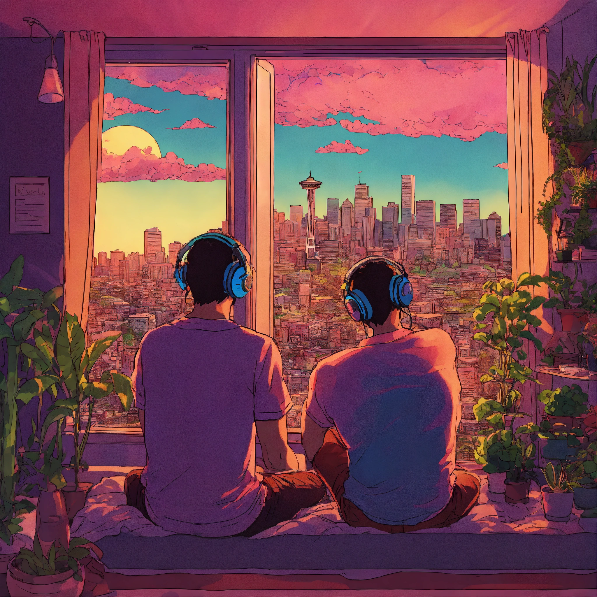 A happy gay male couple wearing headphones looking out over seattle, smiling, wide shot, messy room with plants, psychedelic henry schein illustration, dramatic lighting, vibey colors.