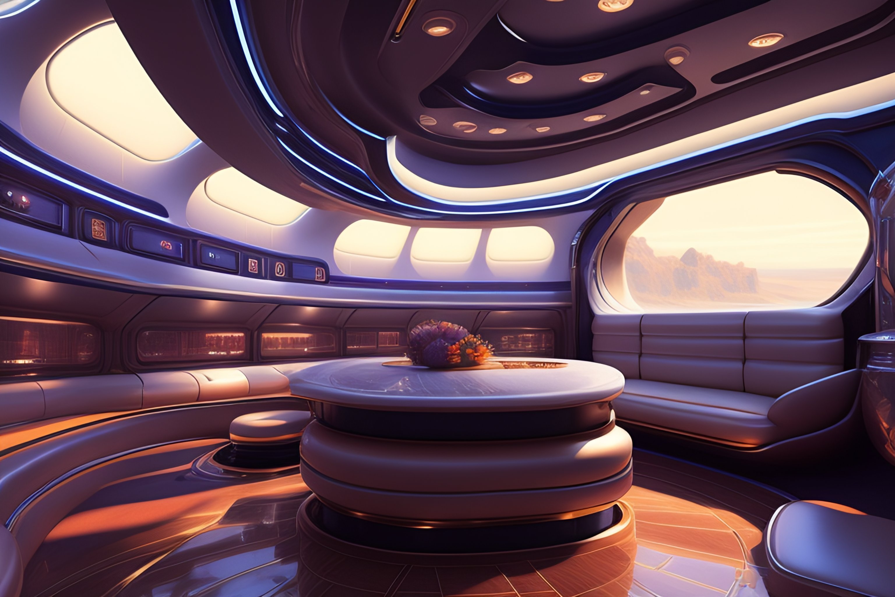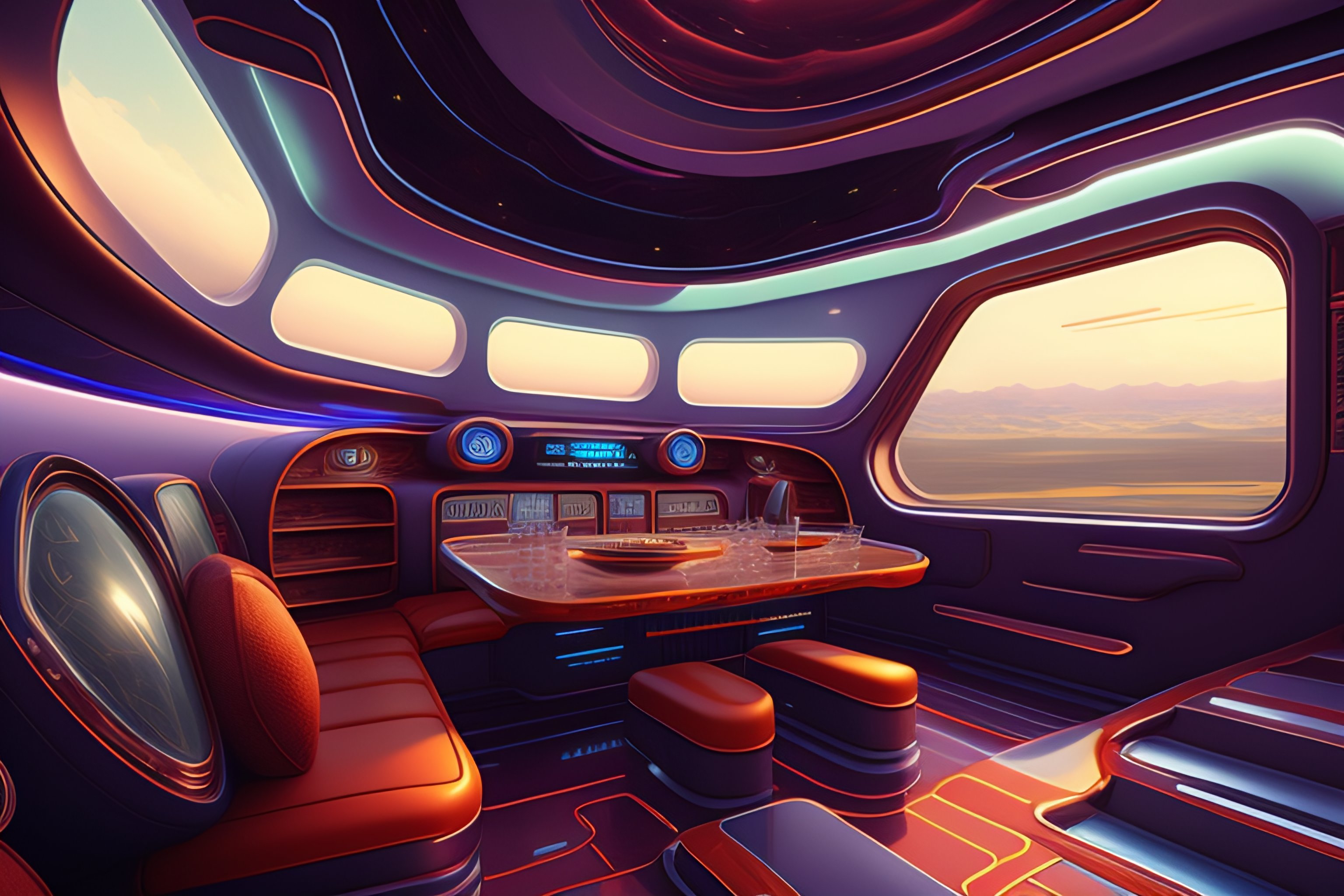 Highly detailed interior of a retro spaceship with large windows, stephen bliss, unreal engine, greg rutkowski, ilya kuvshinov, ross draws, hyung tae and frank frazetta, tom bagshaw, tom whalen, nicoletta ceccoli, mark ryden, earl norem, global illumination, god rays, detailed and intricate environment