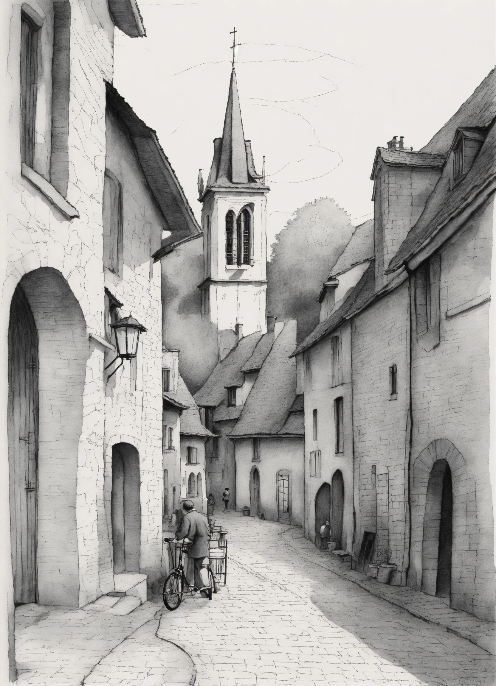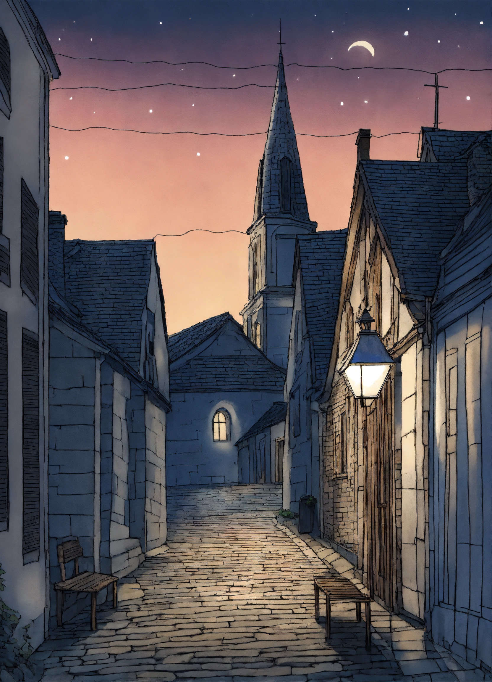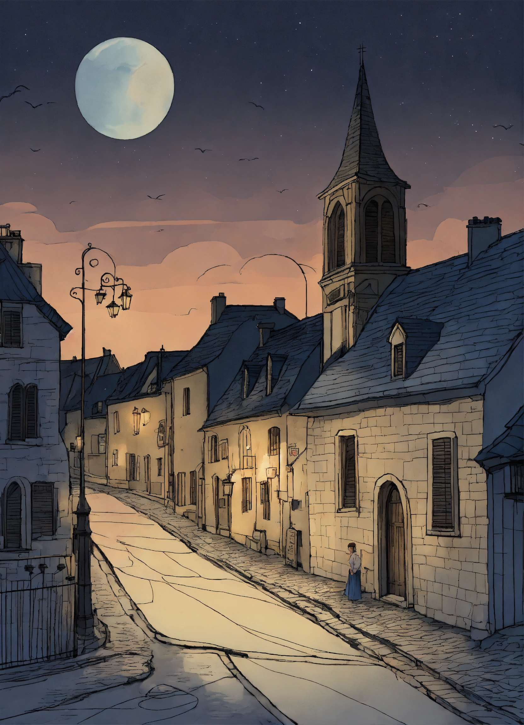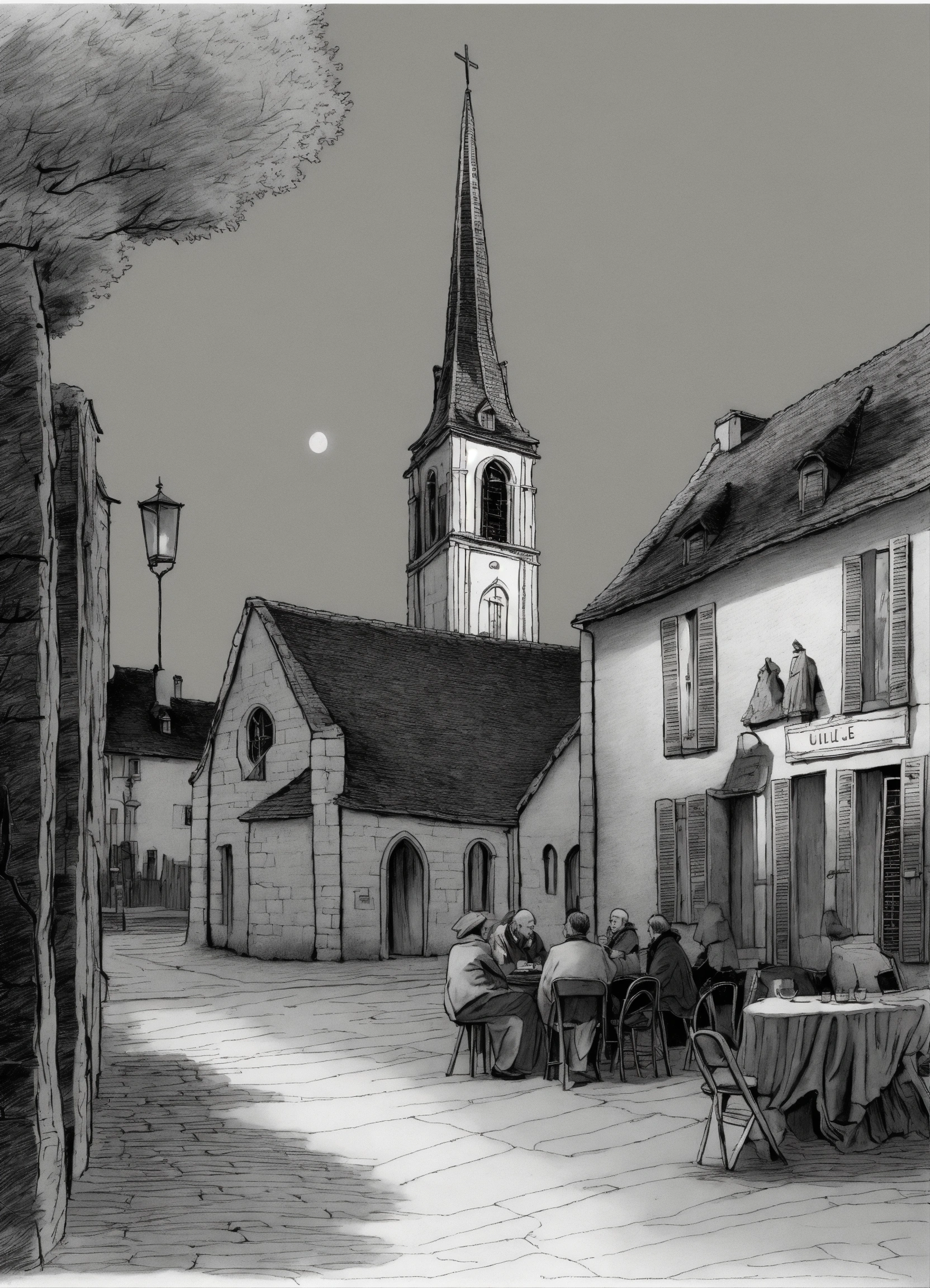 Dessin minuit village français place de l'église solitude glauque peur bizarre malaise