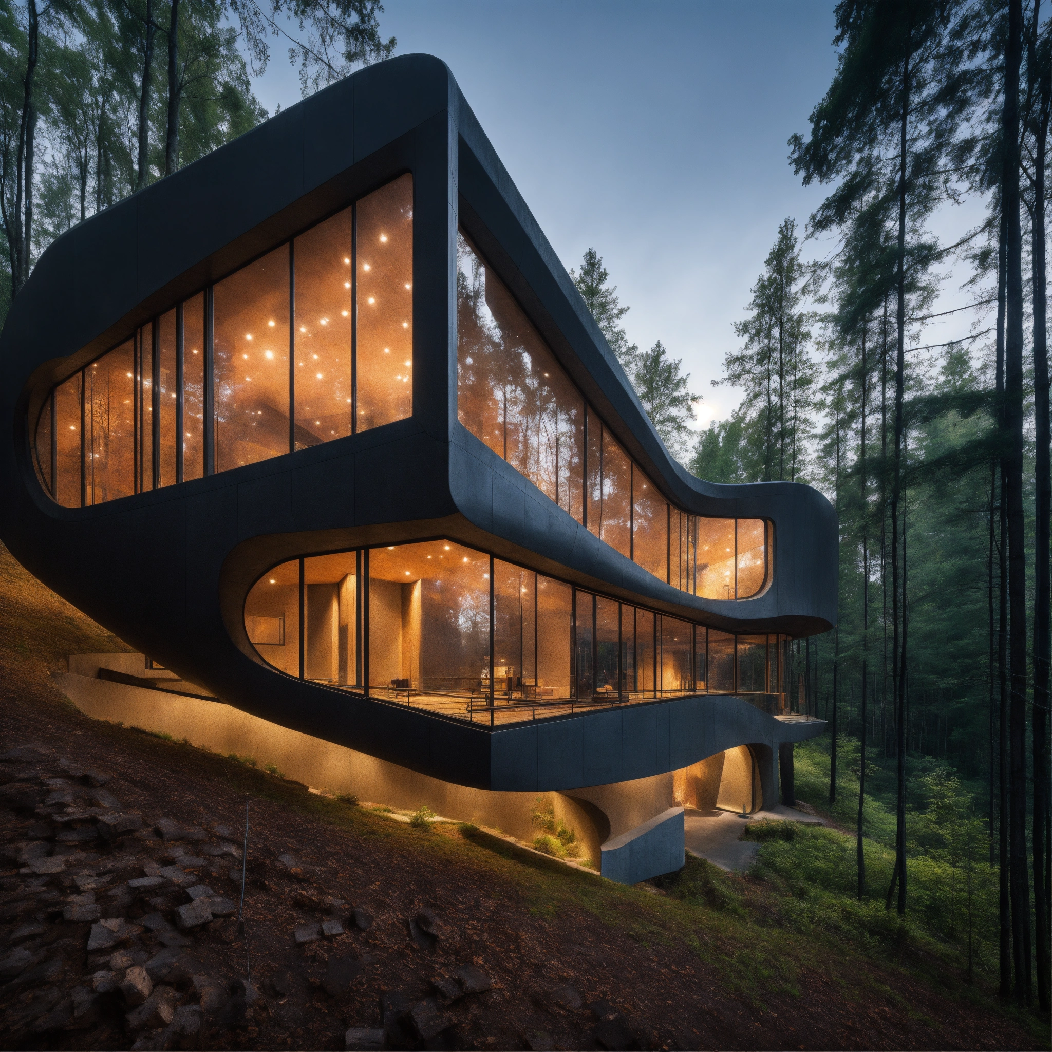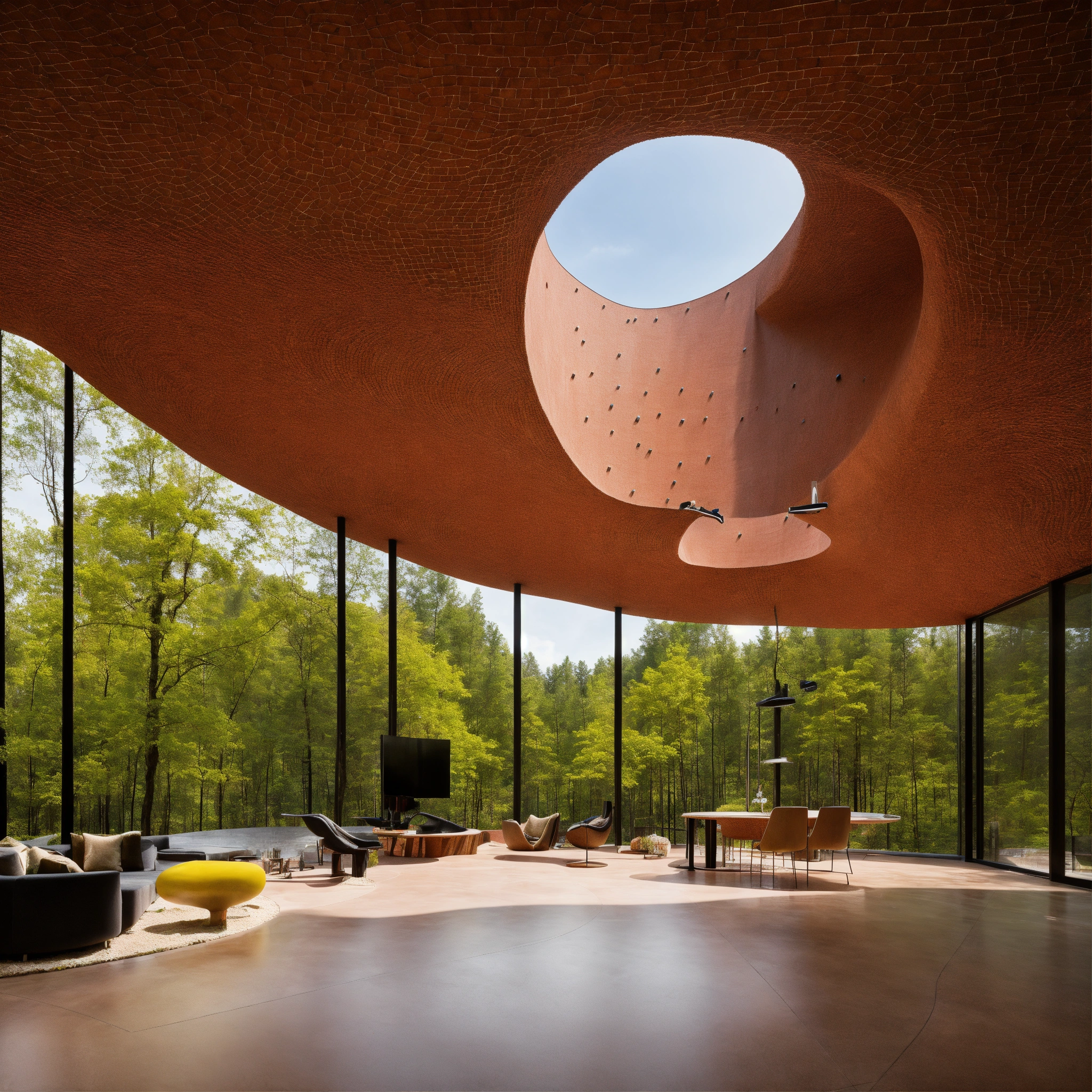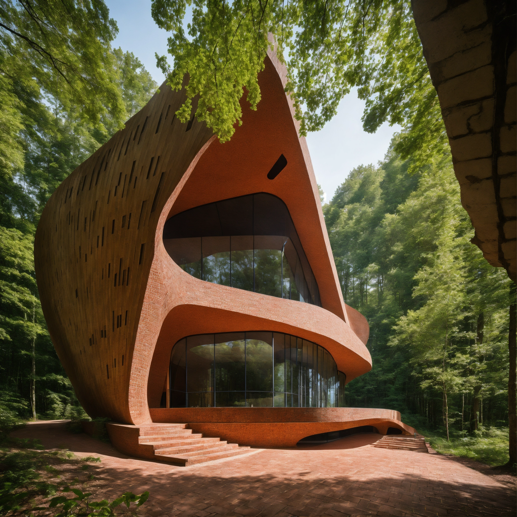 Zaha hadid building in the forest made of brick and concrate