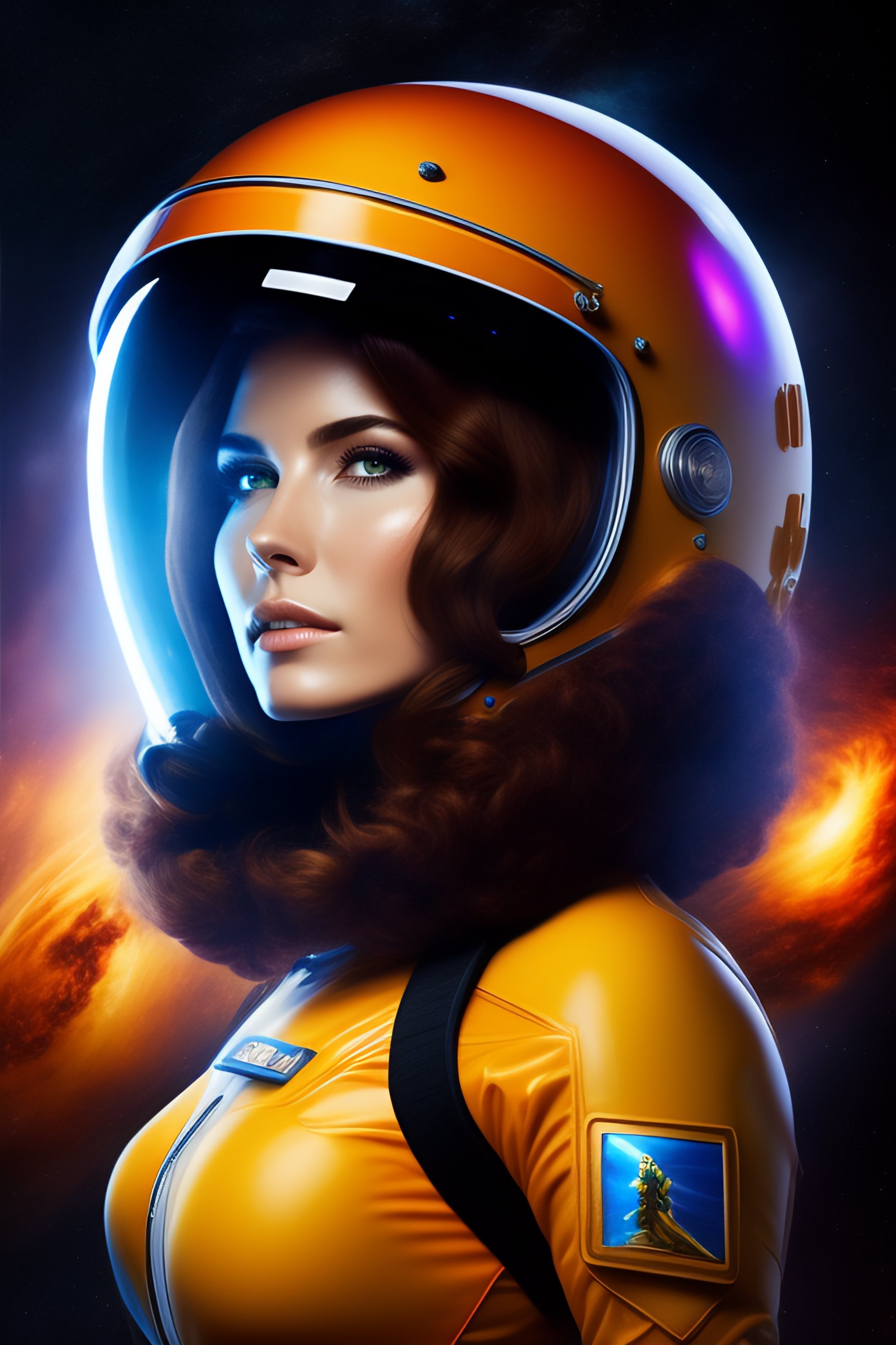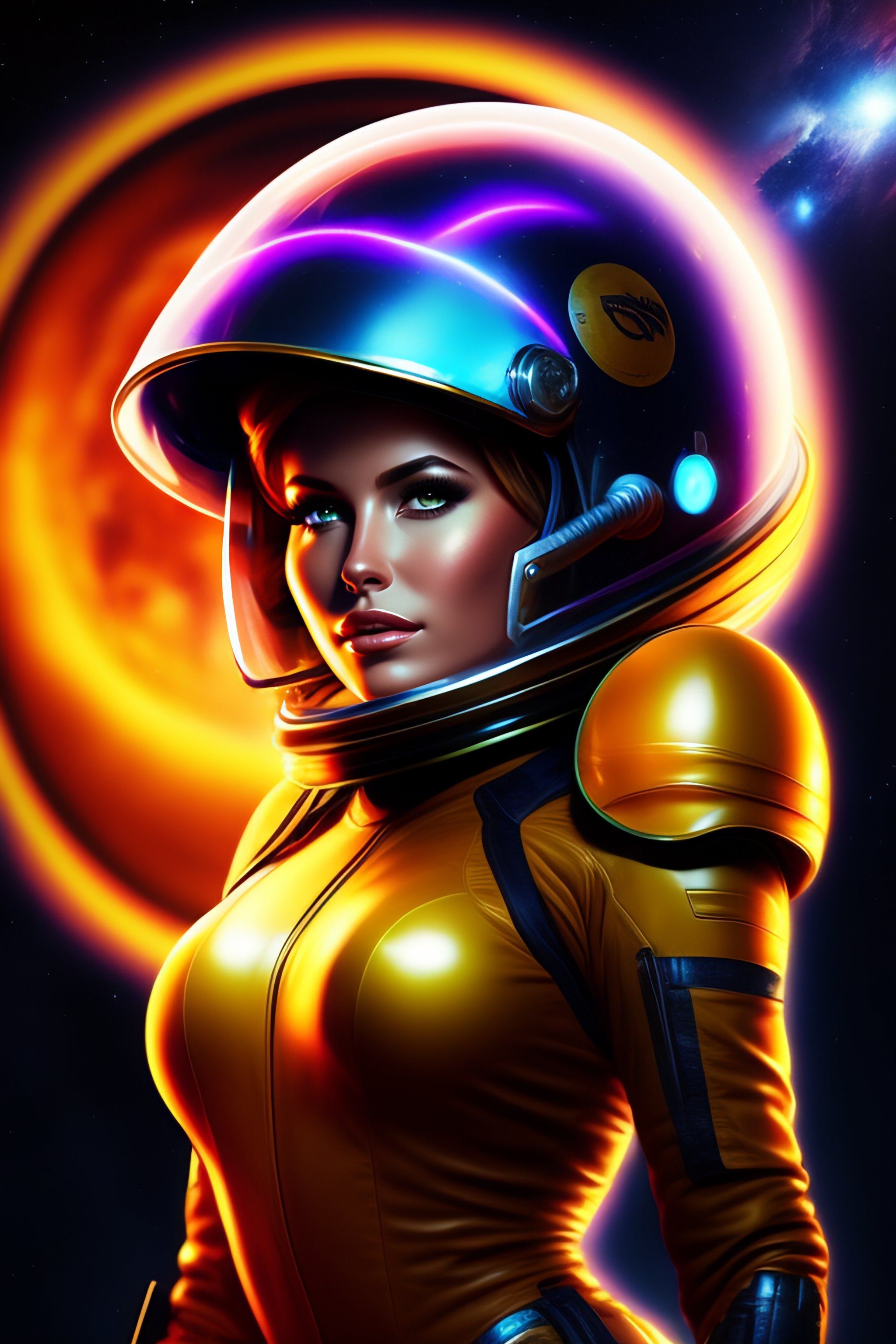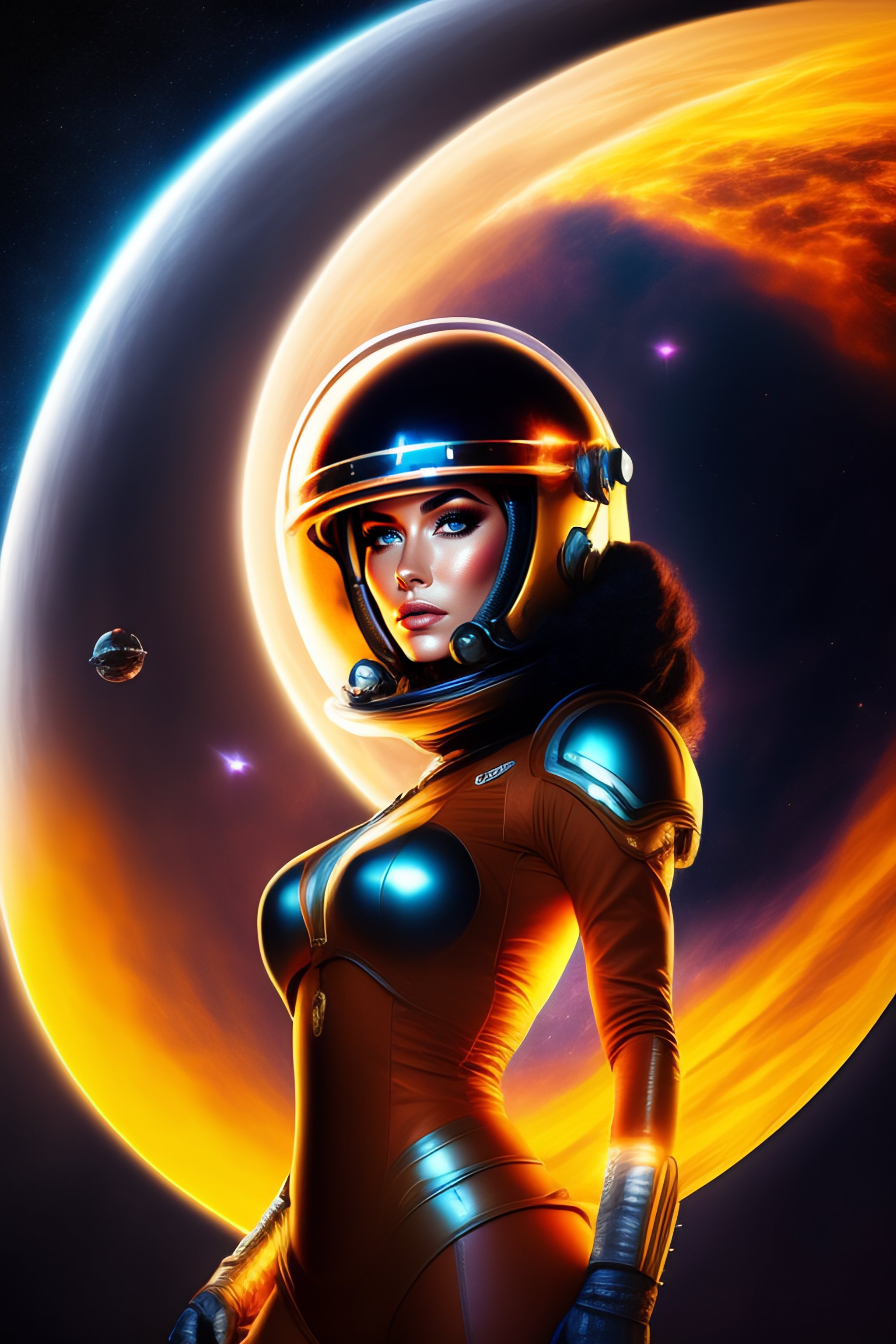 Hot spacegirl in costume with helmet in front of a blackhole