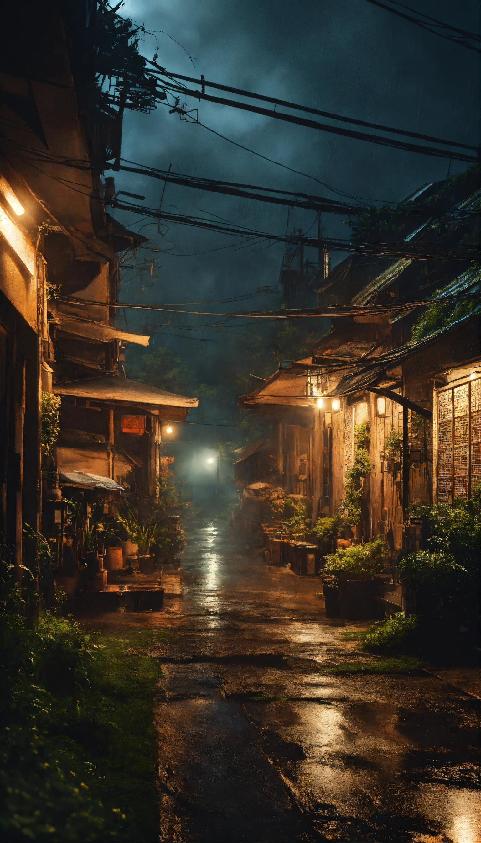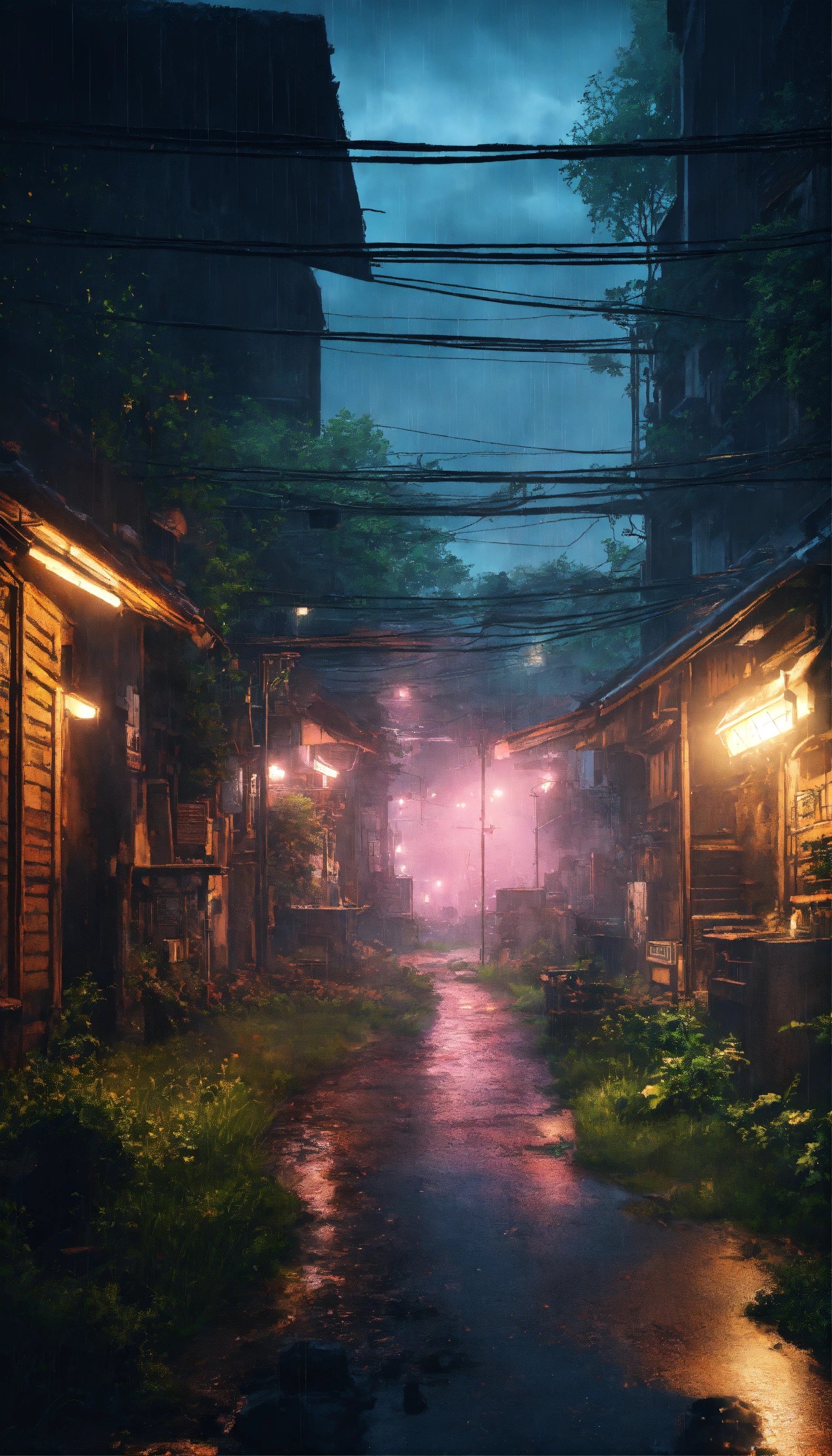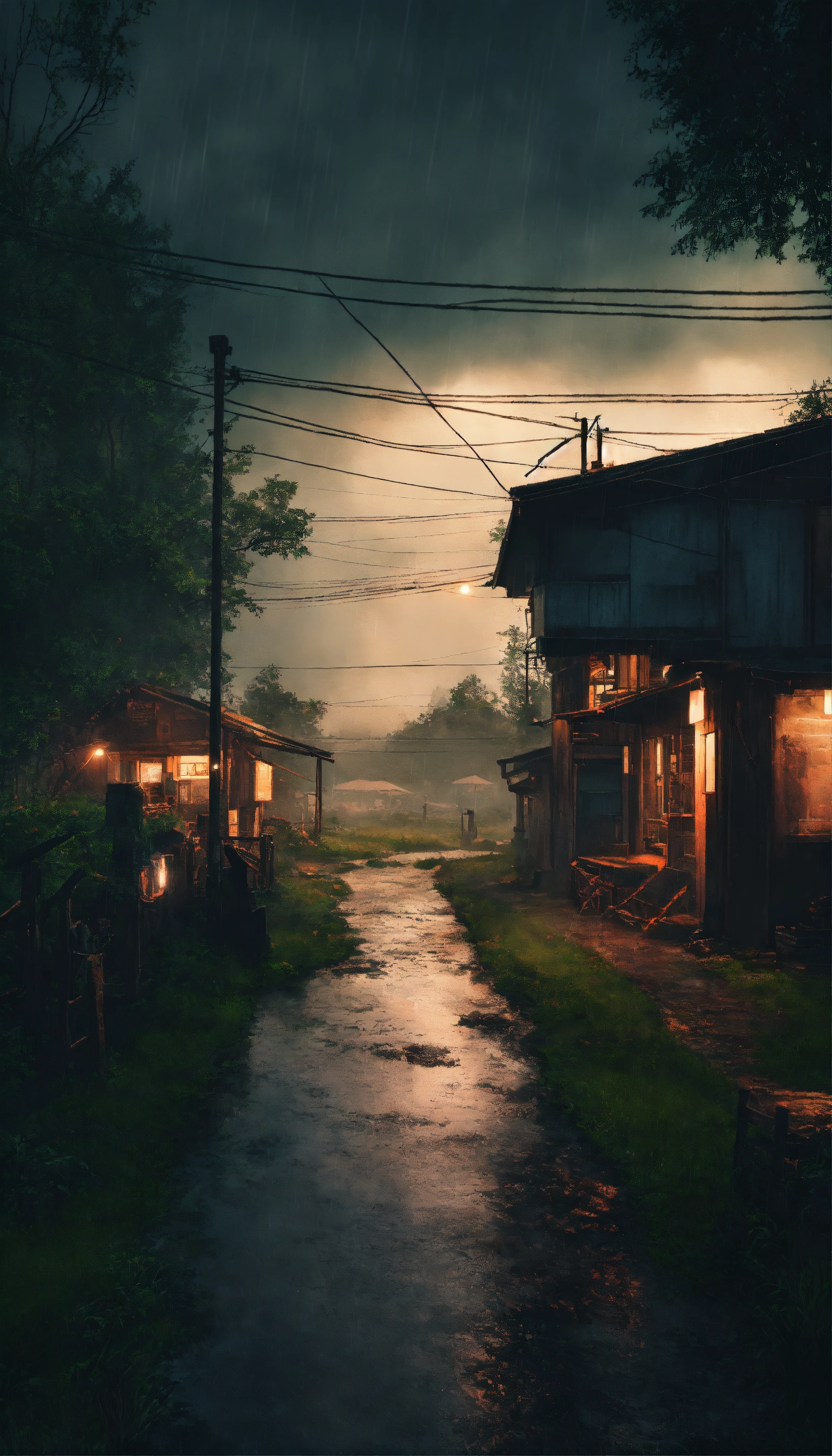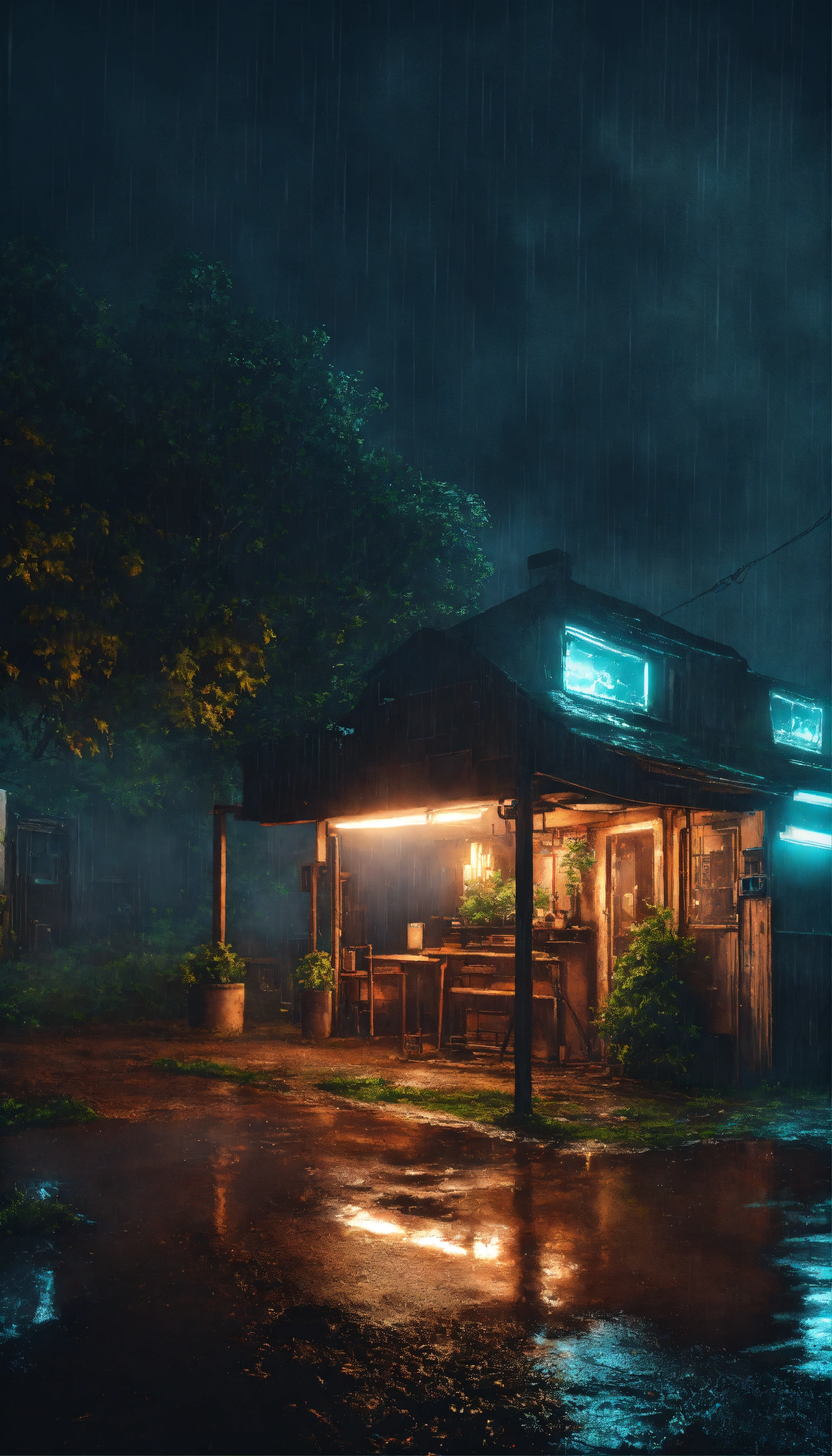 Beautiful cozy countryside view of a cyberpunk countryside at night, outside torrential rain, detailed aesthetic, nature, dark, gloomy and moody