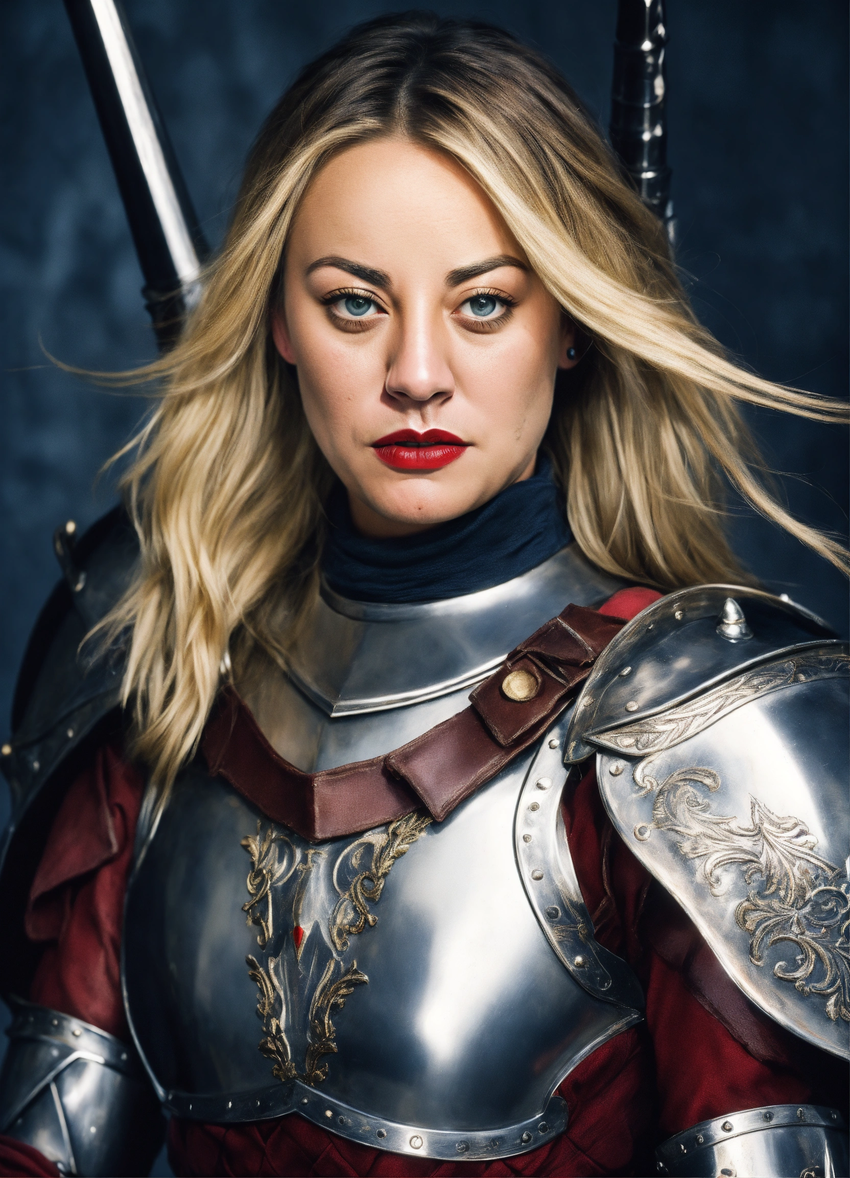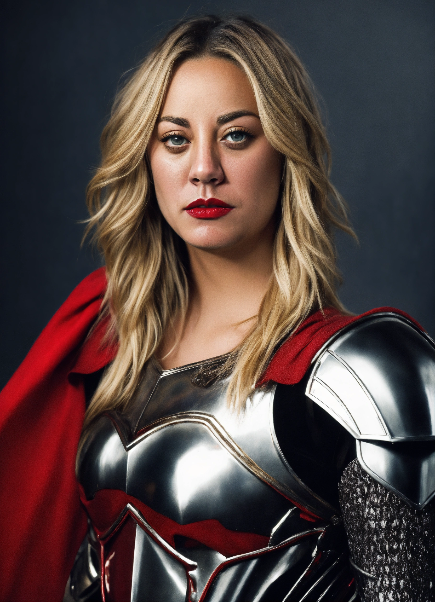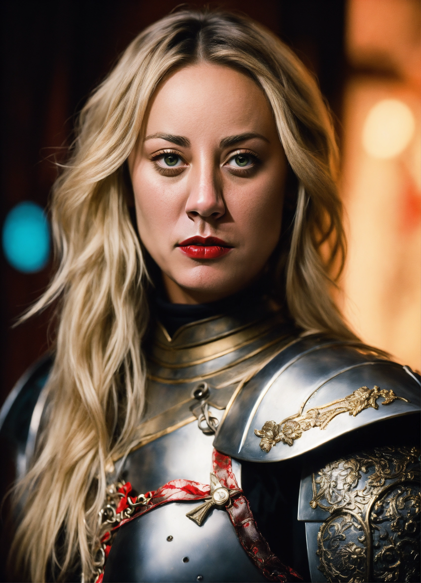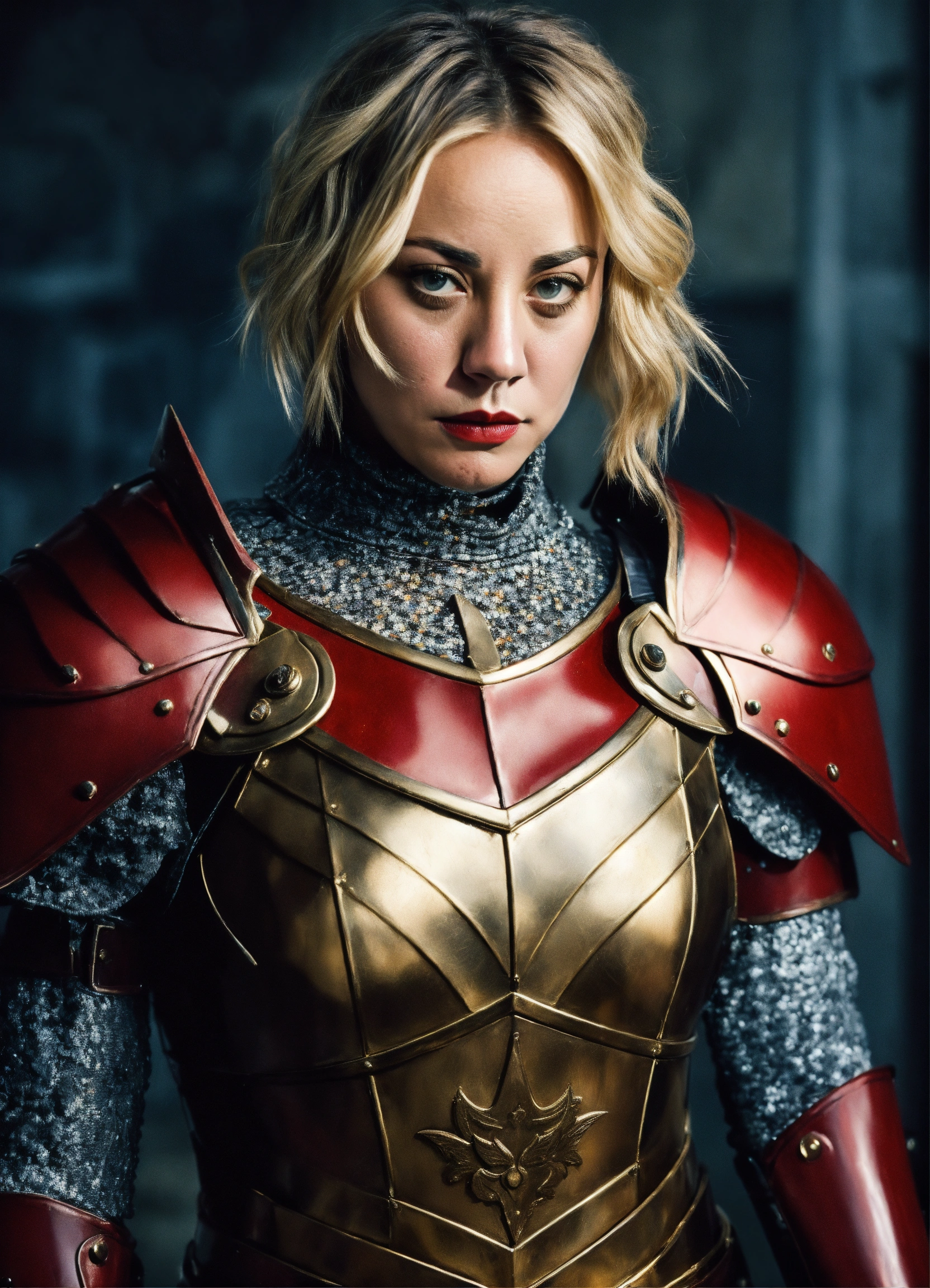 Photo quality color portrait of young beautiful kaley cuoco as a assassin knight in armor with flowing hair and red lips and stern expression