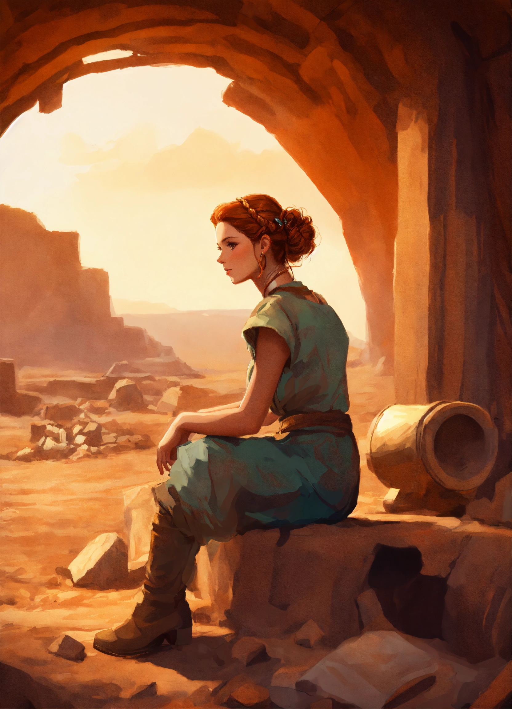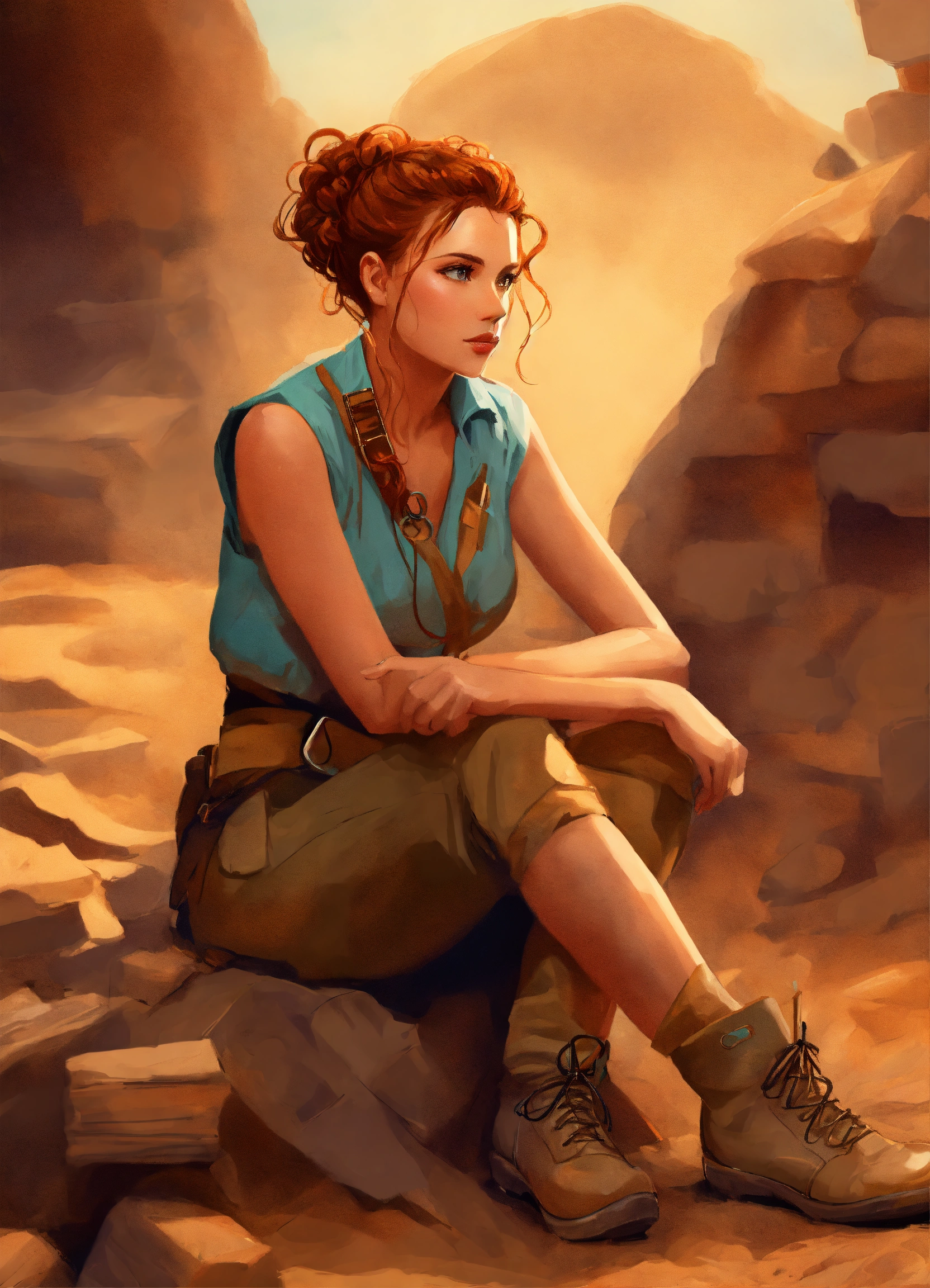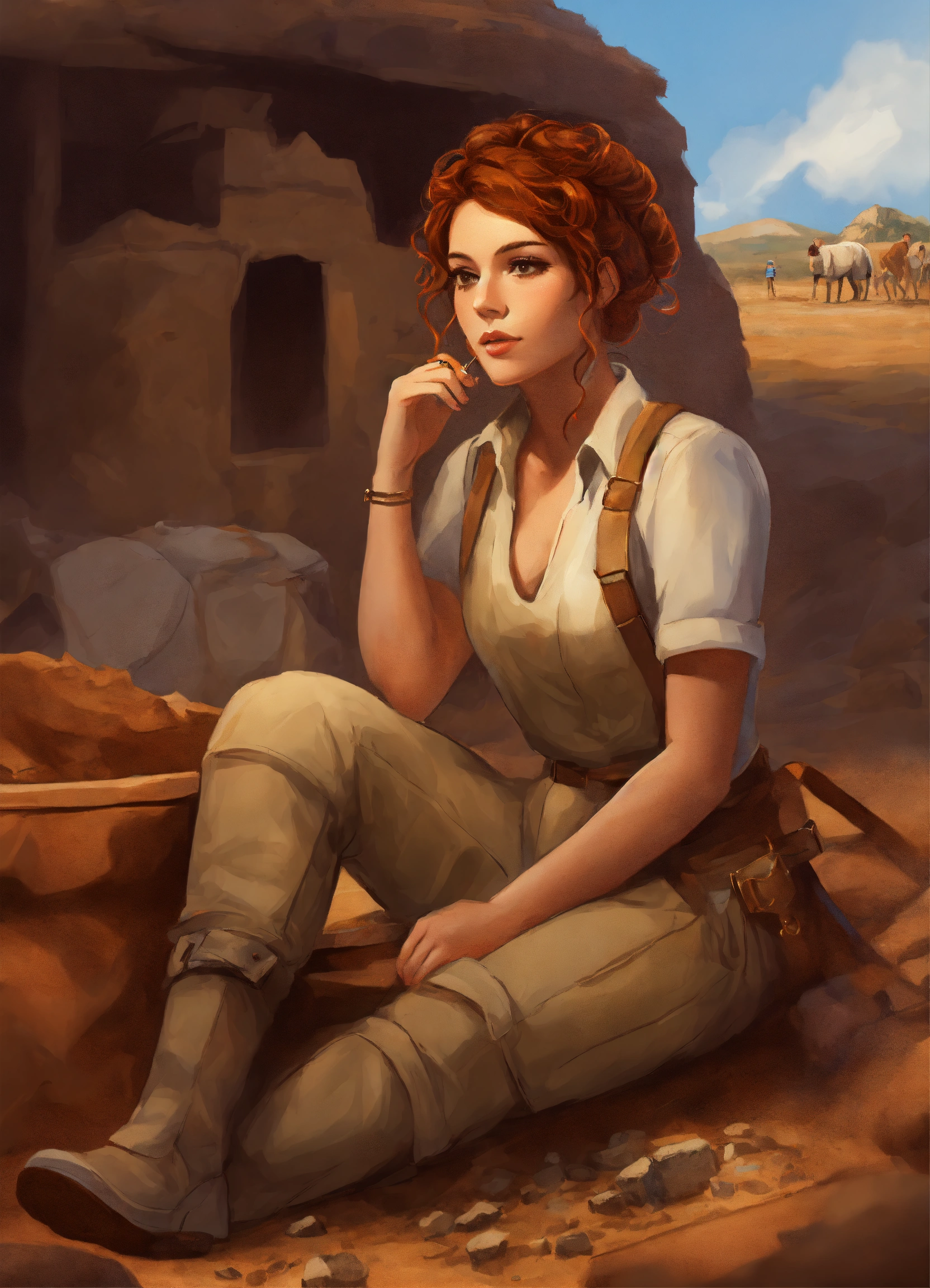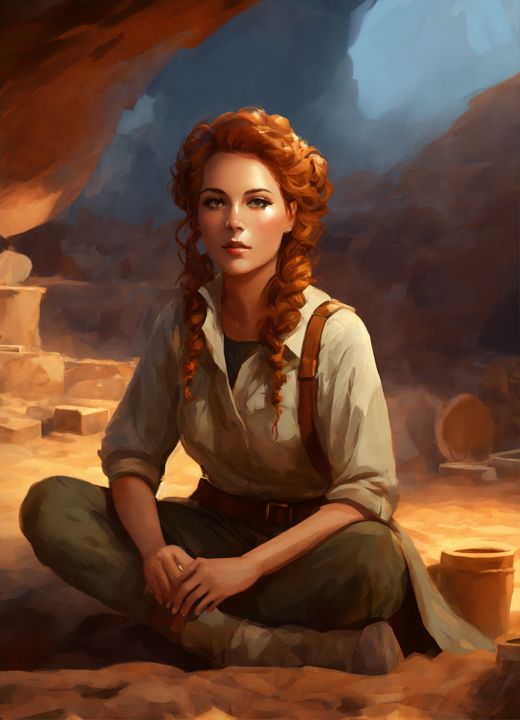 Digital art painting of a beautiful archaeologist woman with ringlet copper hair in an updo, she is sitting at an archaeological dig site