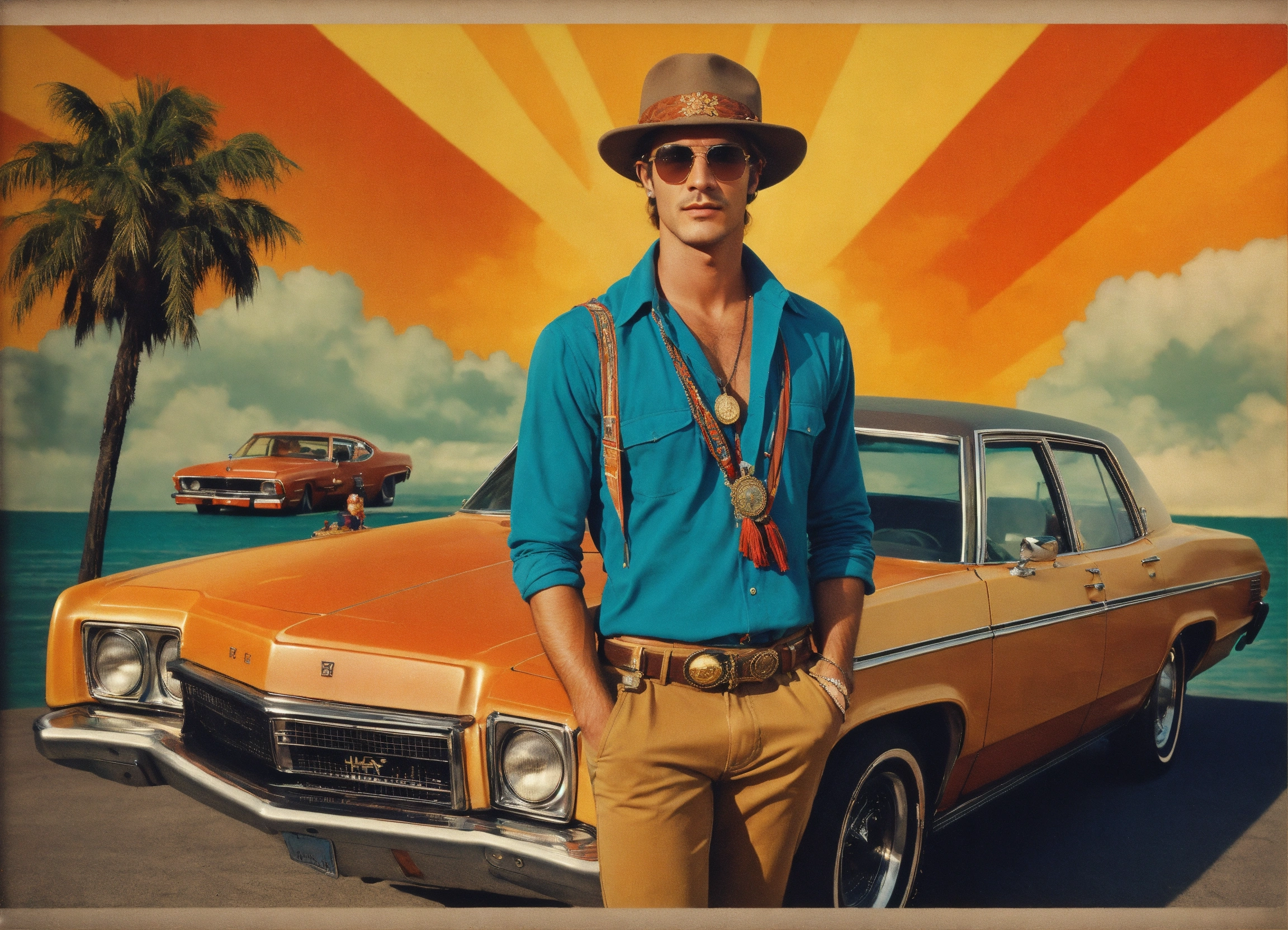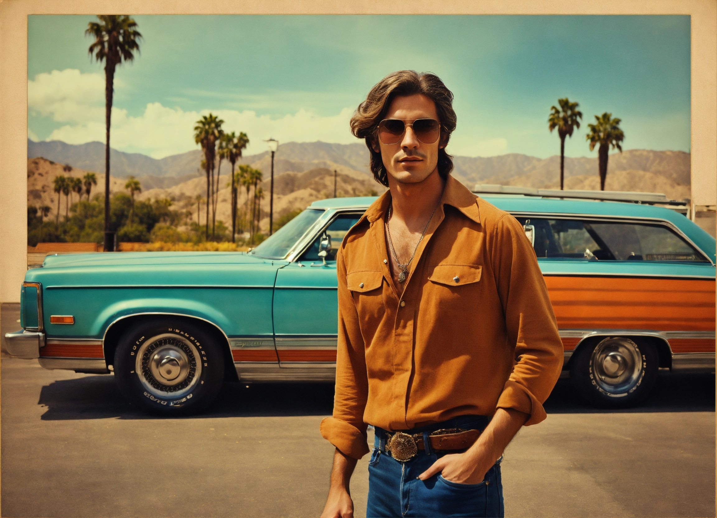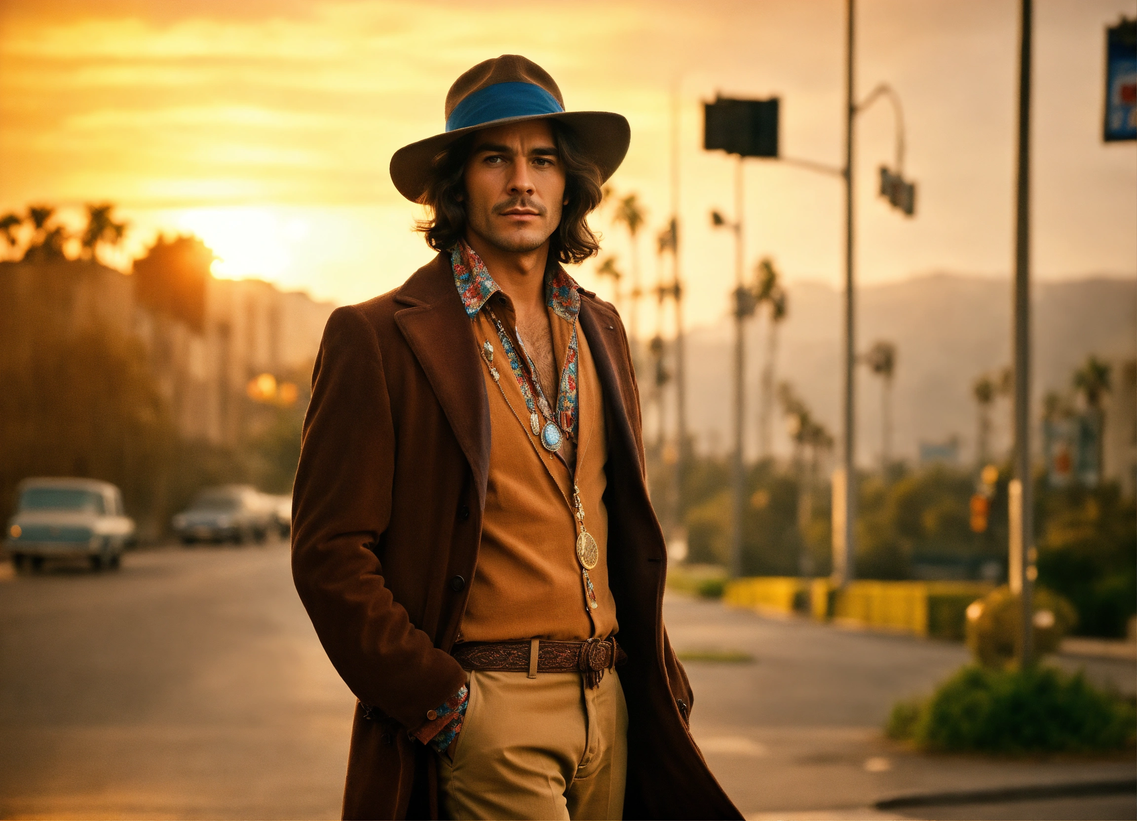 Charming man retro america style 1970-1990, hollywood background, hollywood, a square face with large cheekbones, full length, hippie