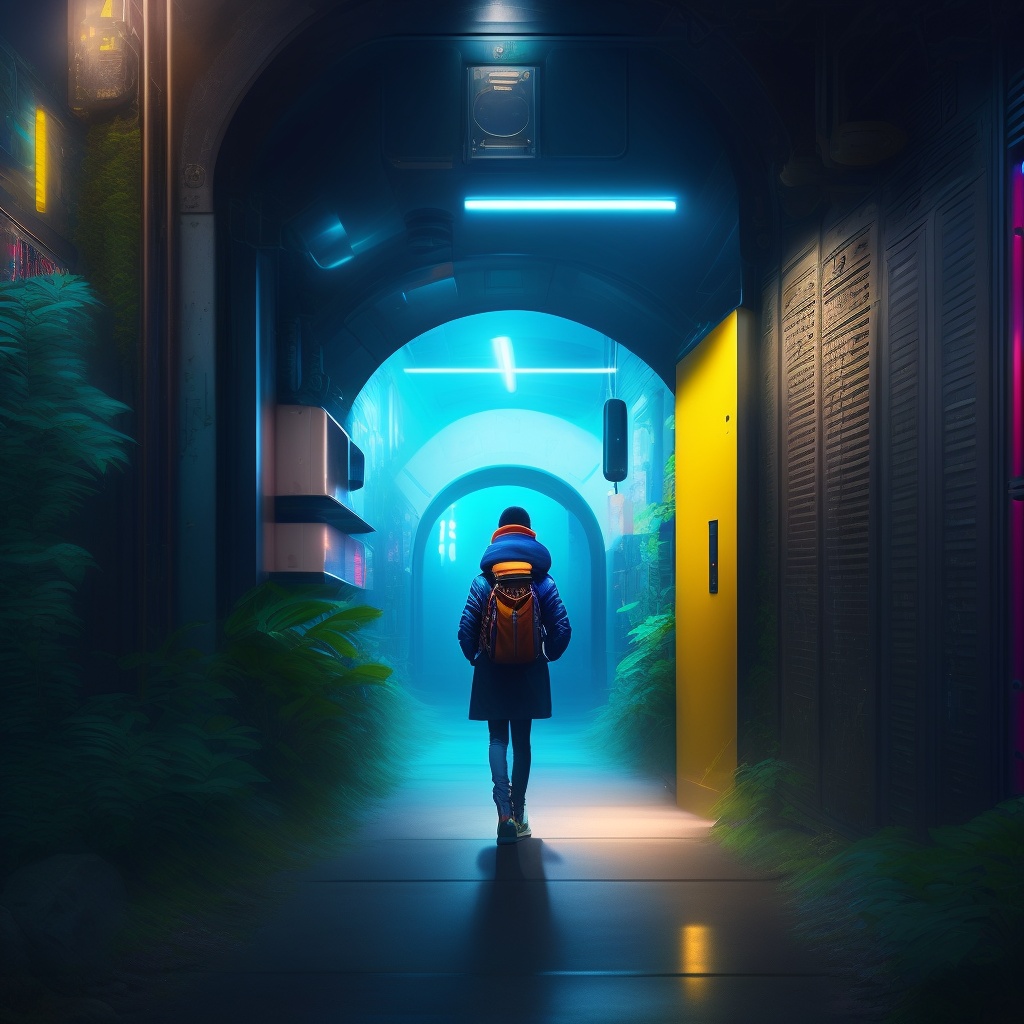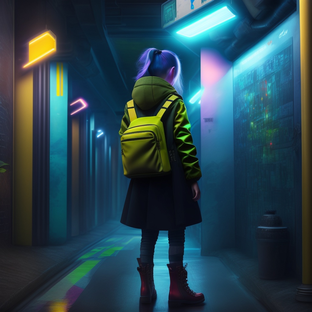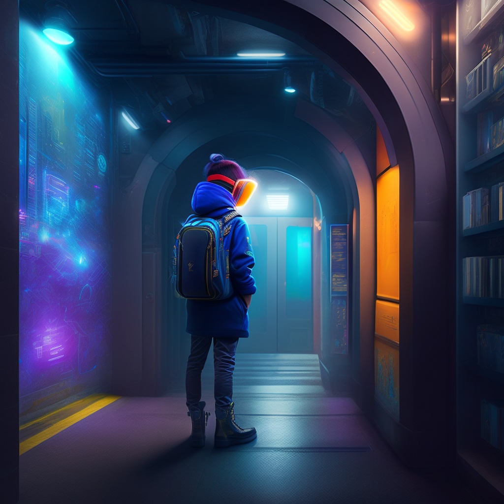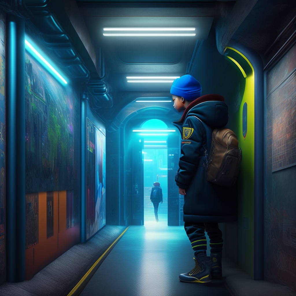 An underground cyberpunk study and school hidden beneath the city, accessed through a secret entrance, dimly lit corridors adorned with graffiti, high-tech classrooms equipped with virtual reality simulations, students wearing futuristic outfits, artwork, mixed media collage combining digital illustration and photography