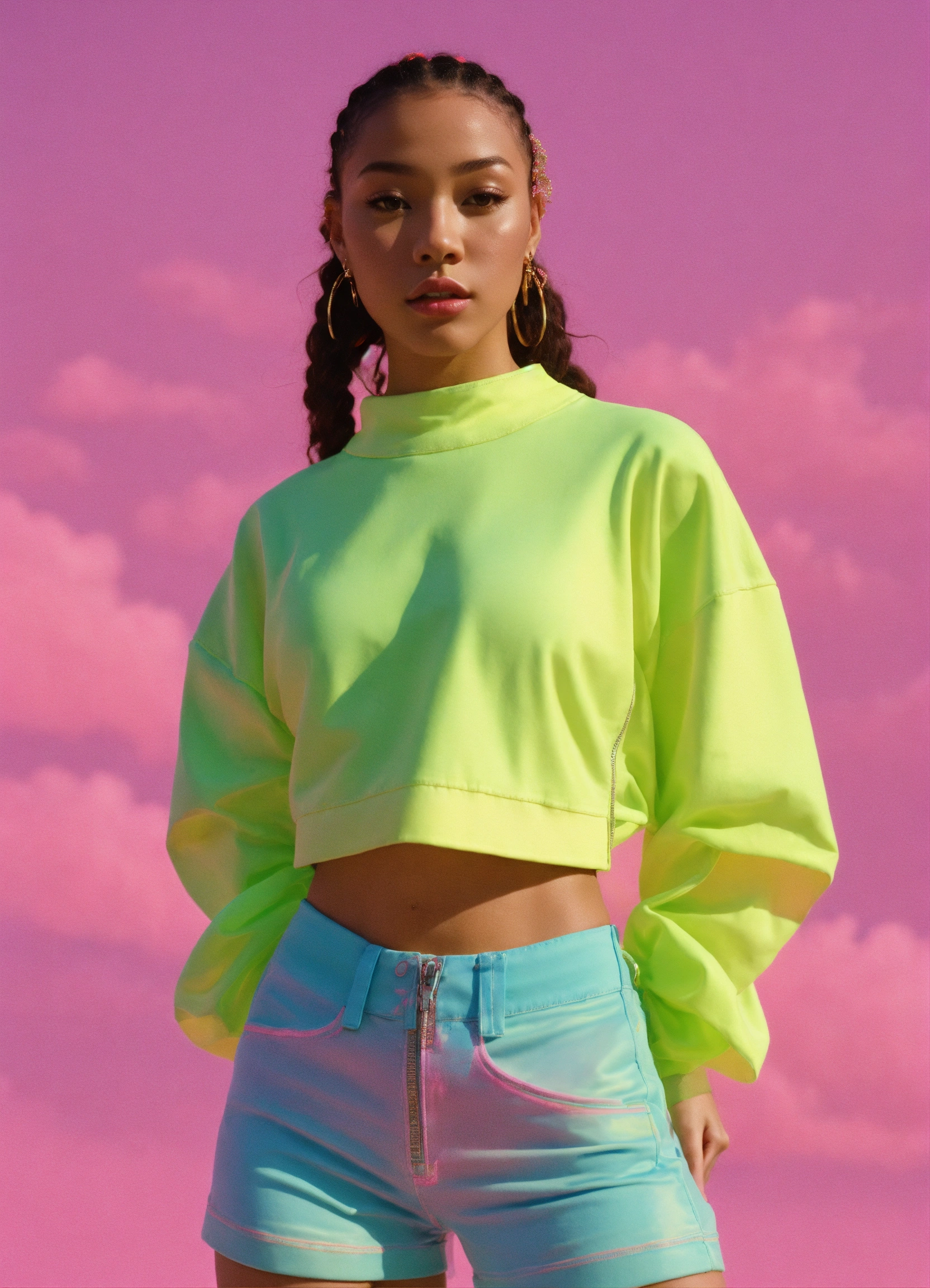Lightskin woman, 4k, y2k clothing, 2000s, dvd screengrab, full body, designer clothing, vaporwave, pastel hues, minimalist