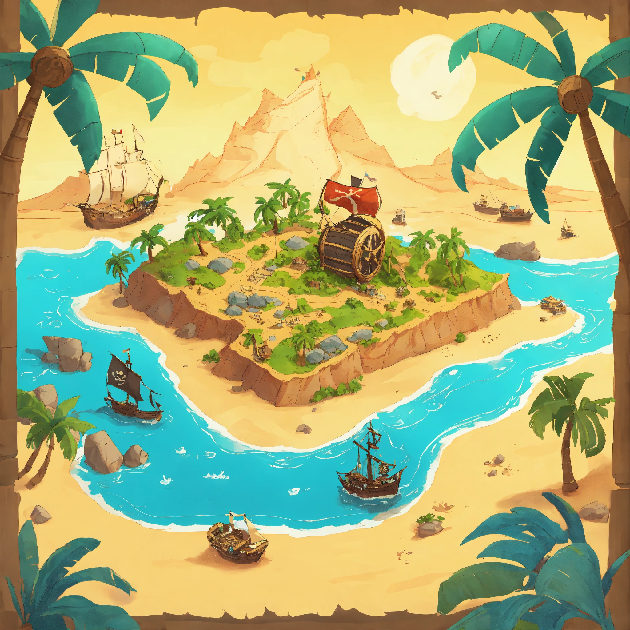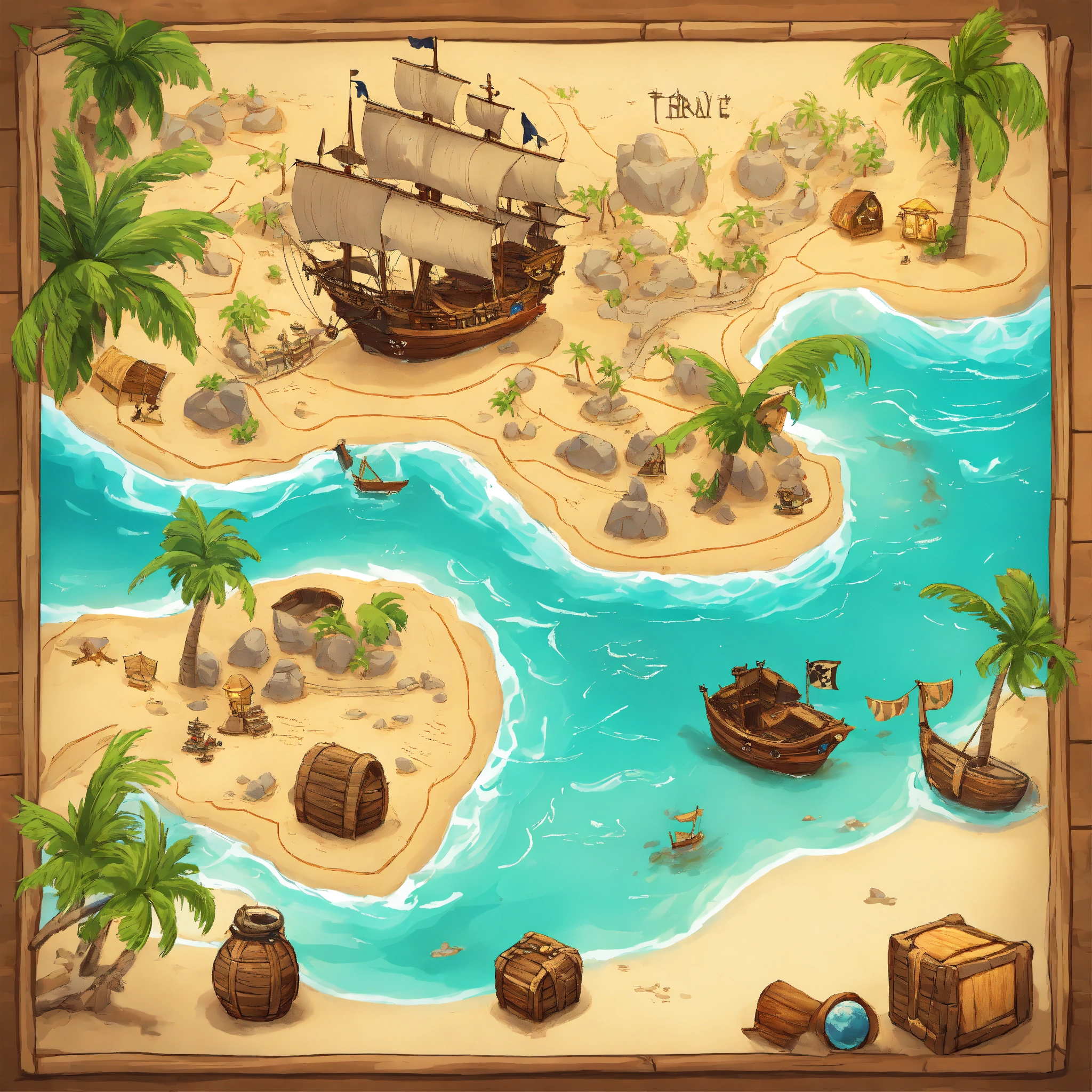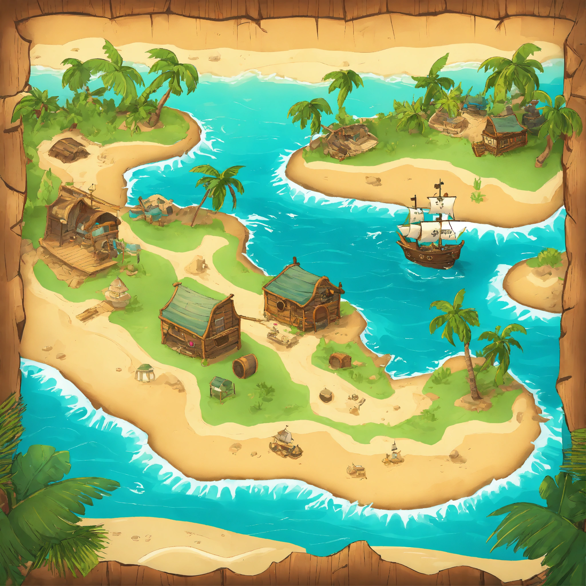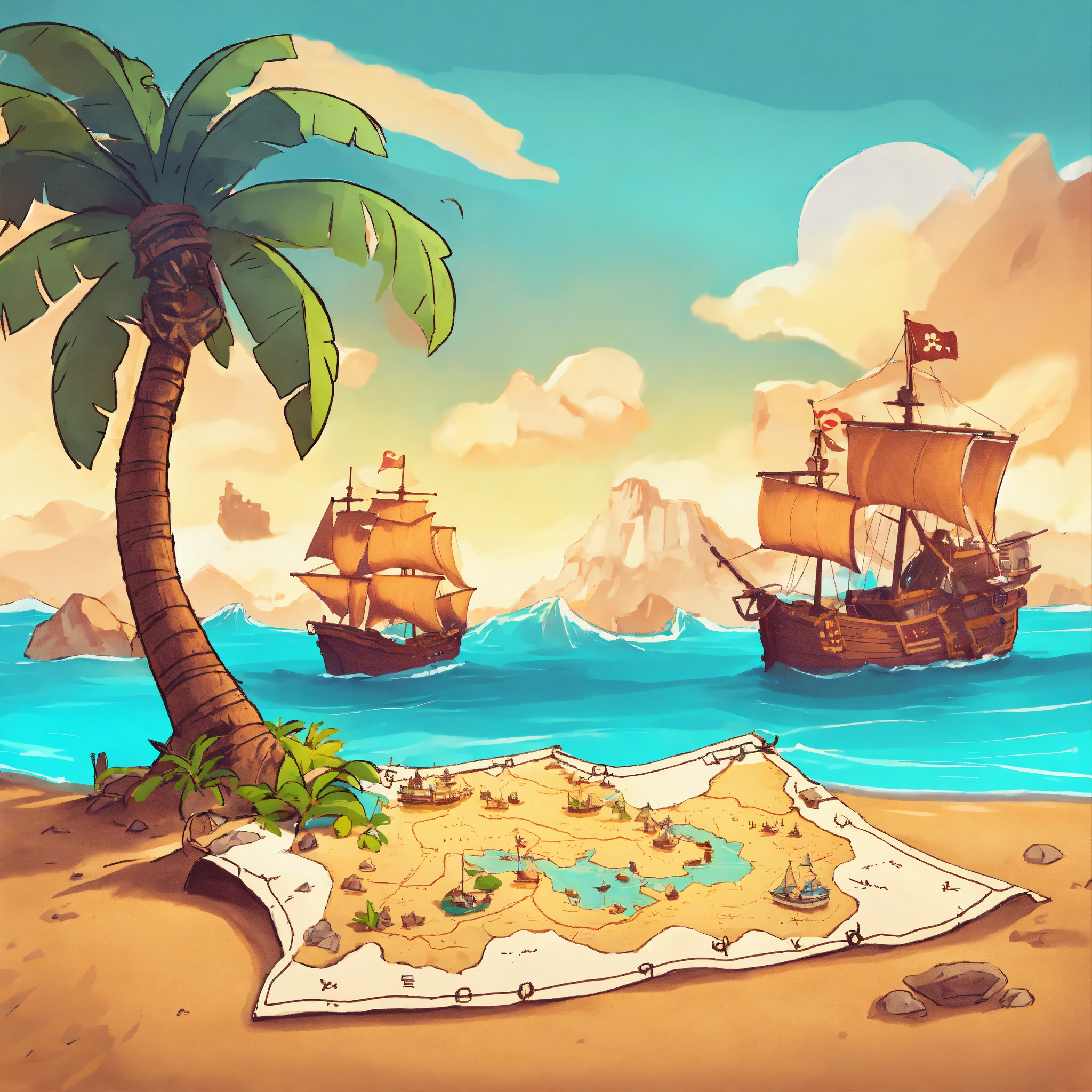 Pirate map, on the background beach and palm, detailed hand illustration rendered in sea of thieves game style, cute cartoon style