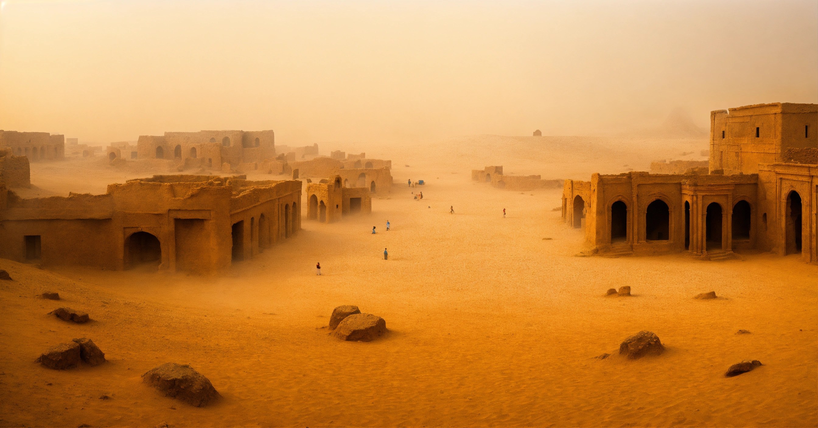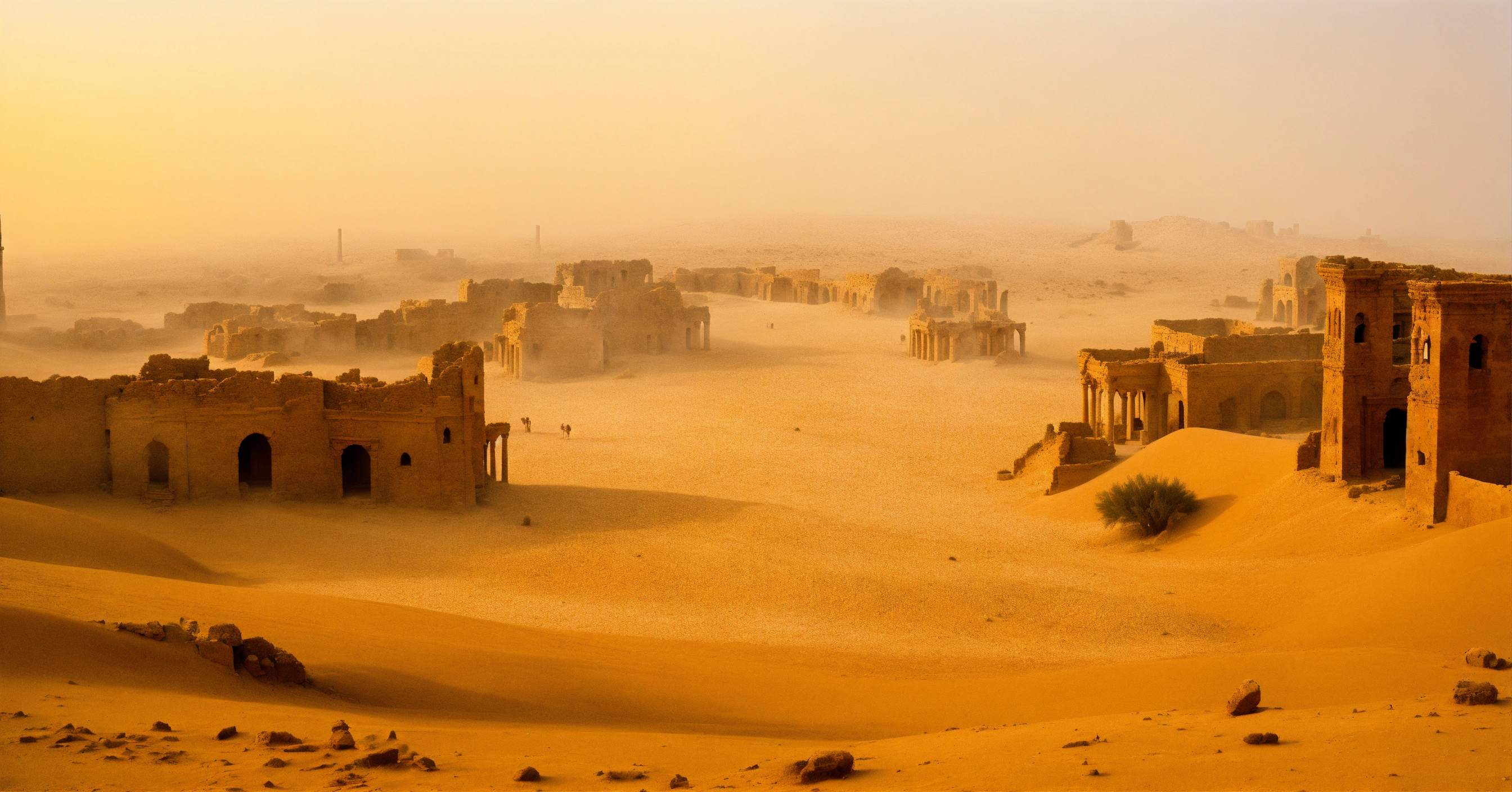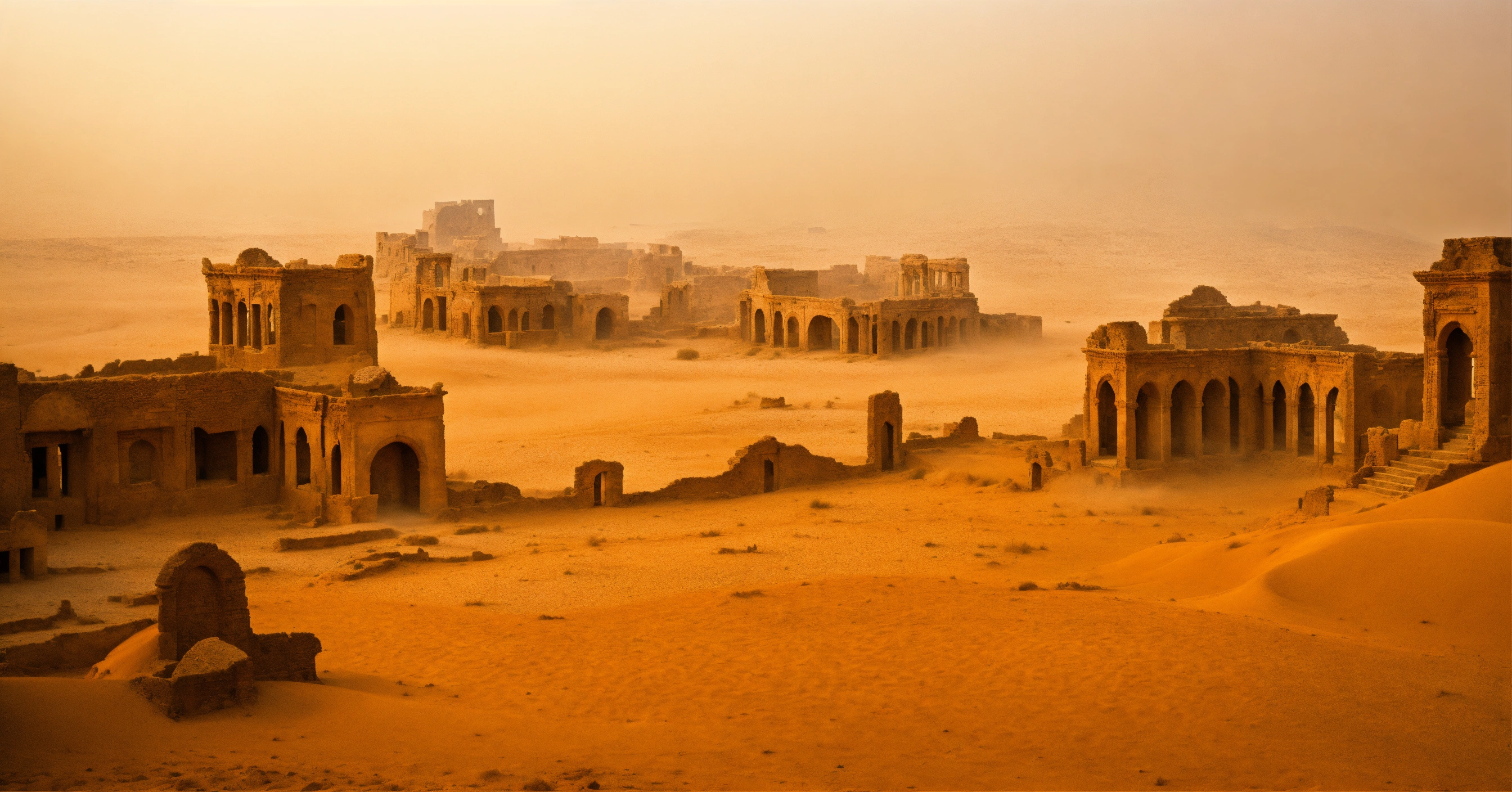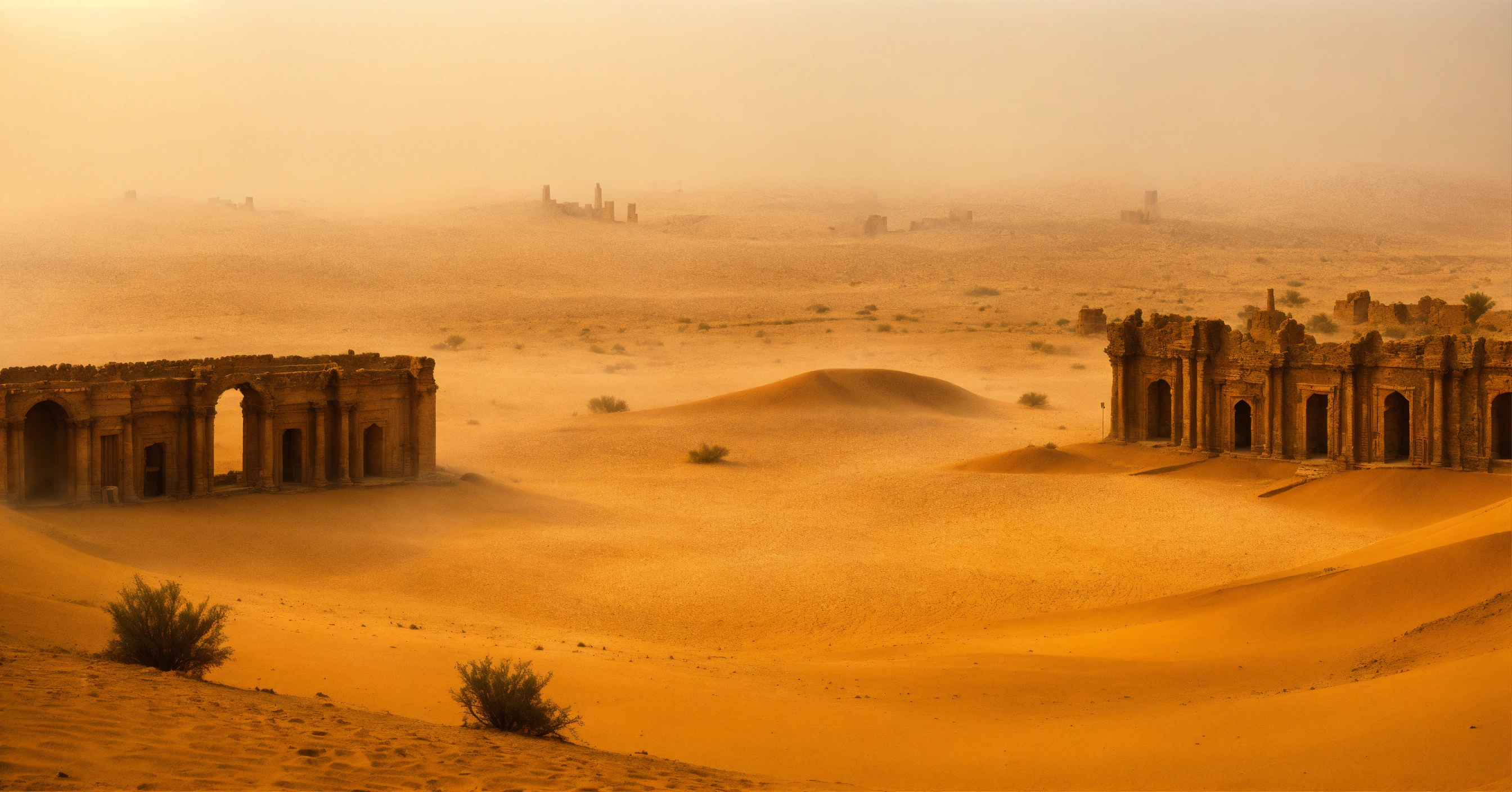 Desert landscape, sand storm, stone antique city, ruins, wide-angle, panoramic, foggy, smooth, dream-like