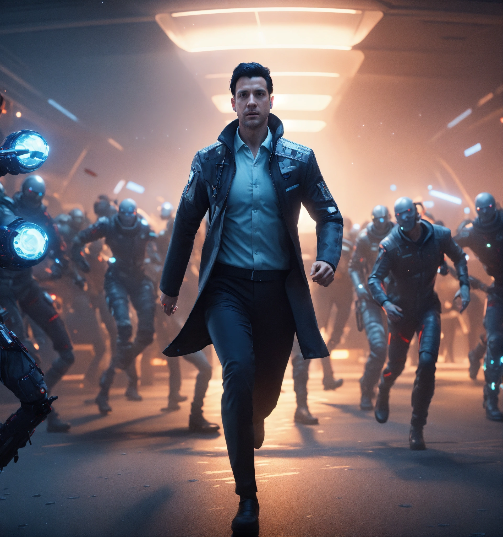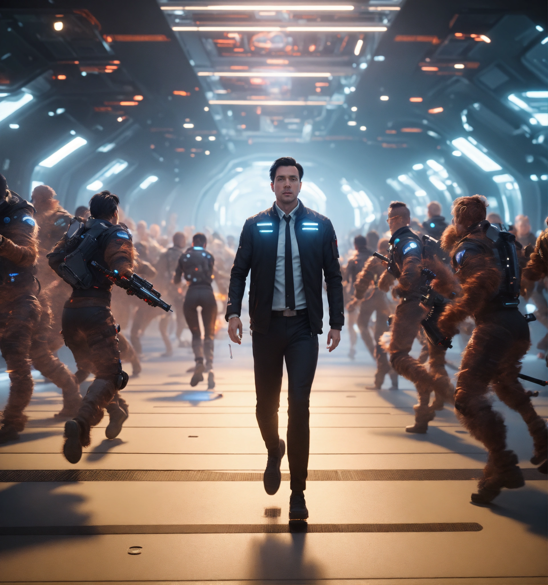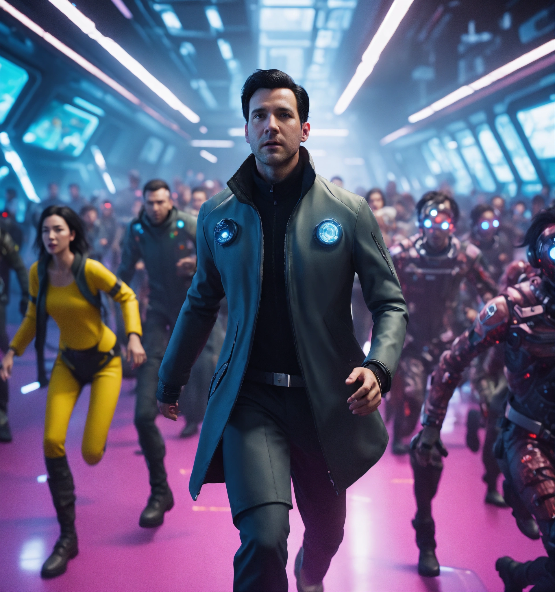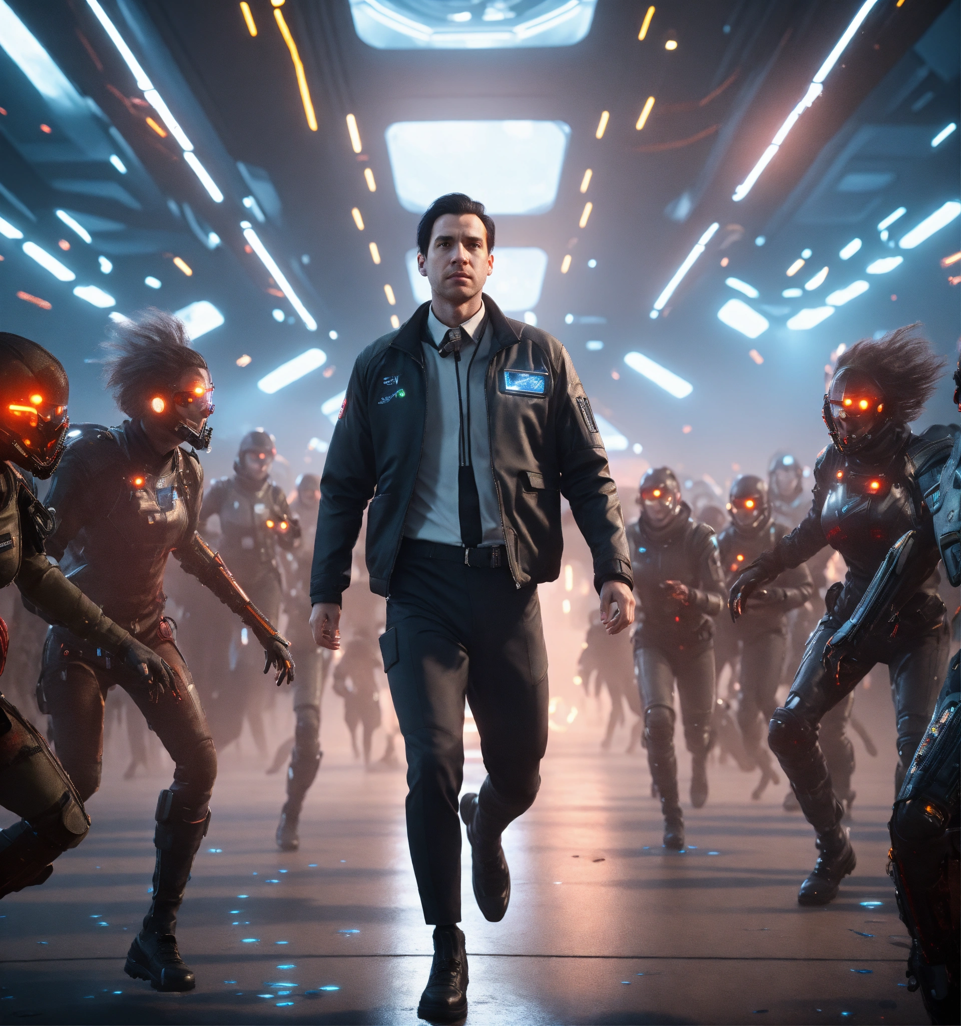 35 year old white male doctor with black hair wearing futuristic spy jacket running through a crowd of space zombies in a futuristic spaceport, realistic, futuristic, sci-fi, 8k, unreal engine, pixar, zaha hadid