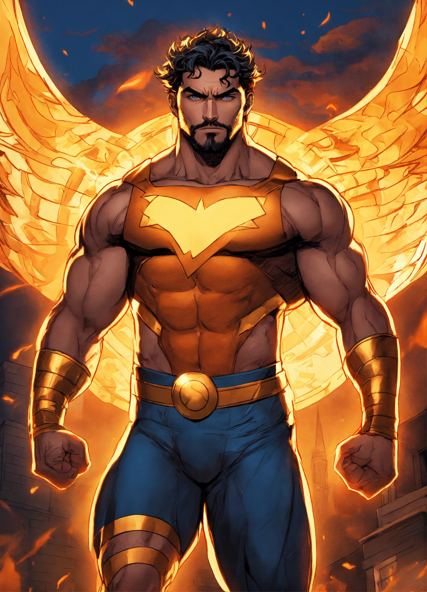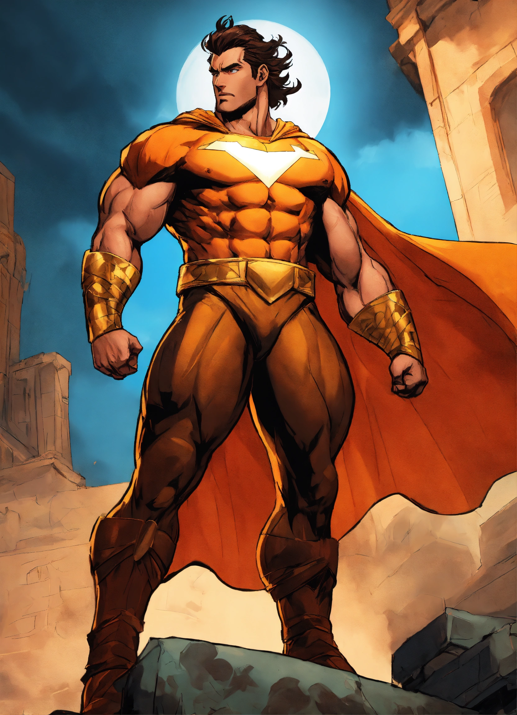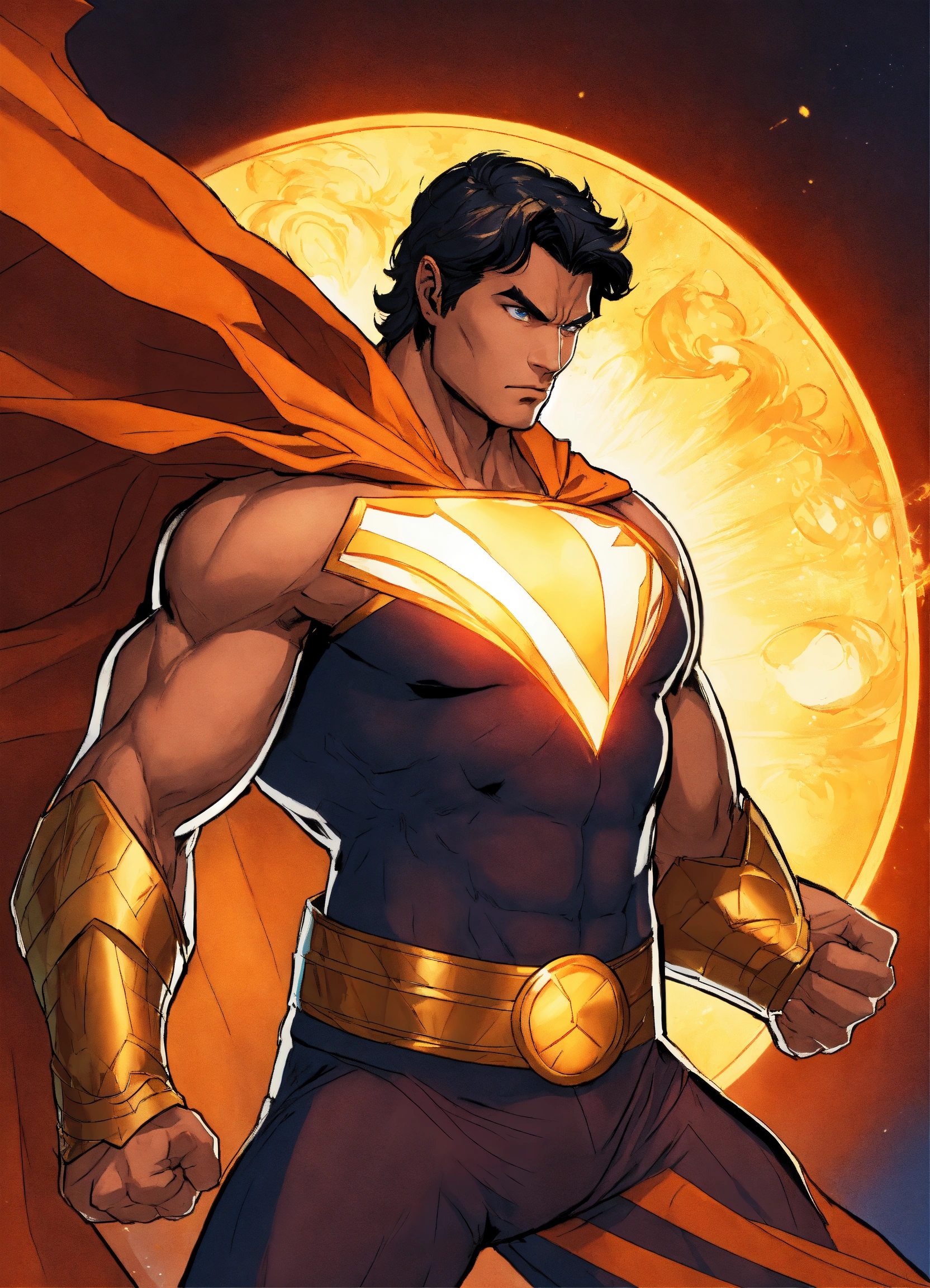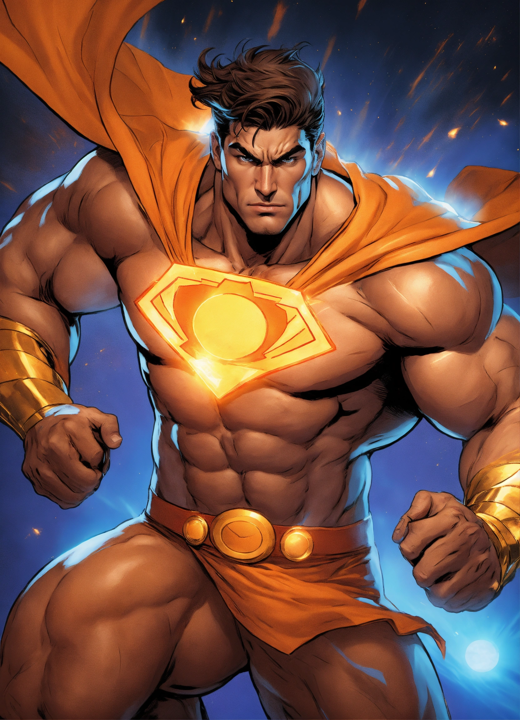 Generate an electrifying and detailed character description in the style of a comic book for a powerful male superhero of hispanic descent. this character embodies an extraordinary physical presence with huge muscles that convey unparalleled strength. he dons a mythic outfit reminiscent of hercules, complete with a long flowing blue cape that billows dramatically in the wind. his costume features a striking logo of the sun emblazoned on his chest, symbolizing his radiant power. his medium-length brown hair frames his chiseled features, and his eyes burn with a brilliant shade of orange, radiating intensity. the character exudes an air of invincibility and heroism, a beacon of hope for all. capture the essence of his immense power and courage while staying true to the vibrant and dynamic style of a comic book