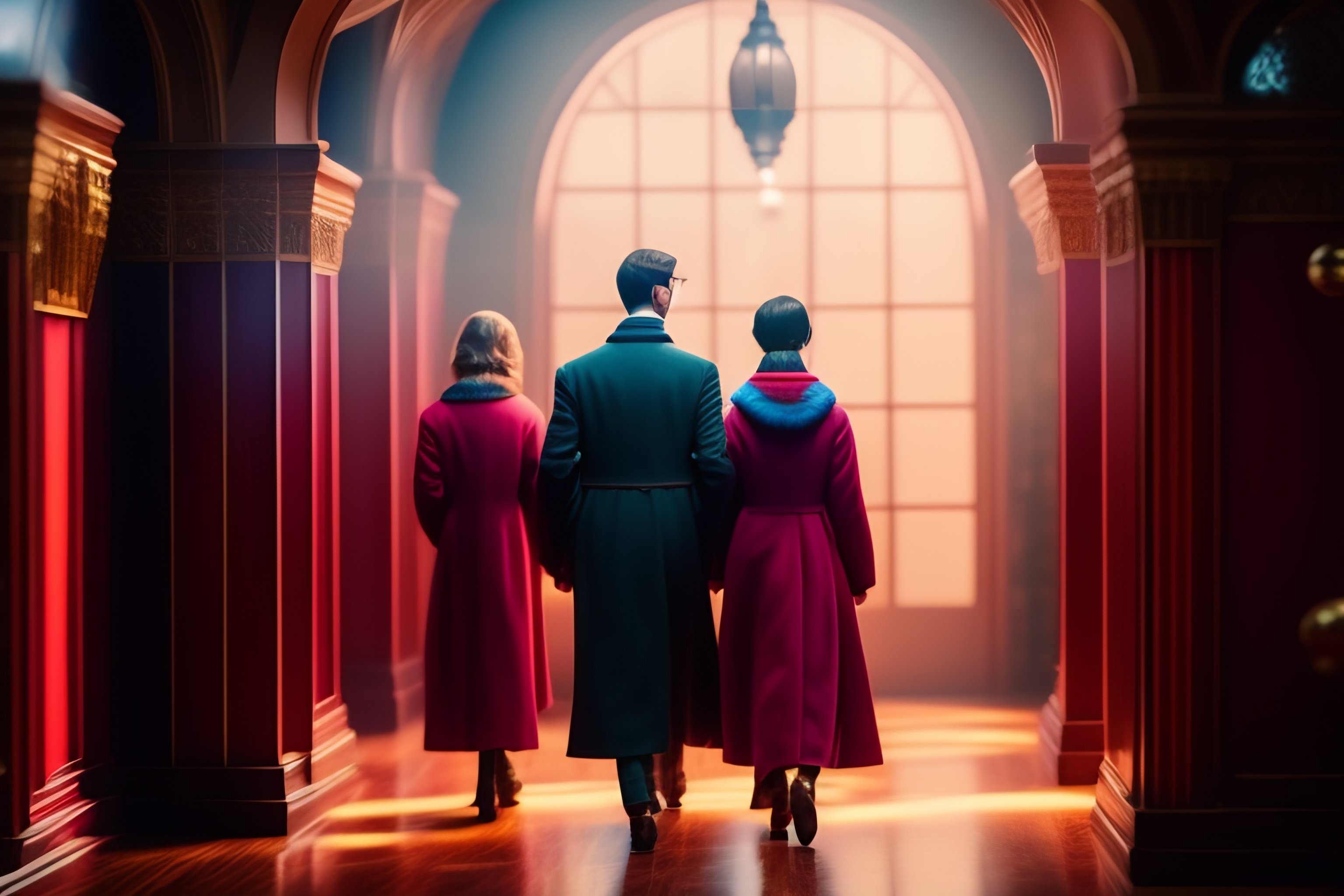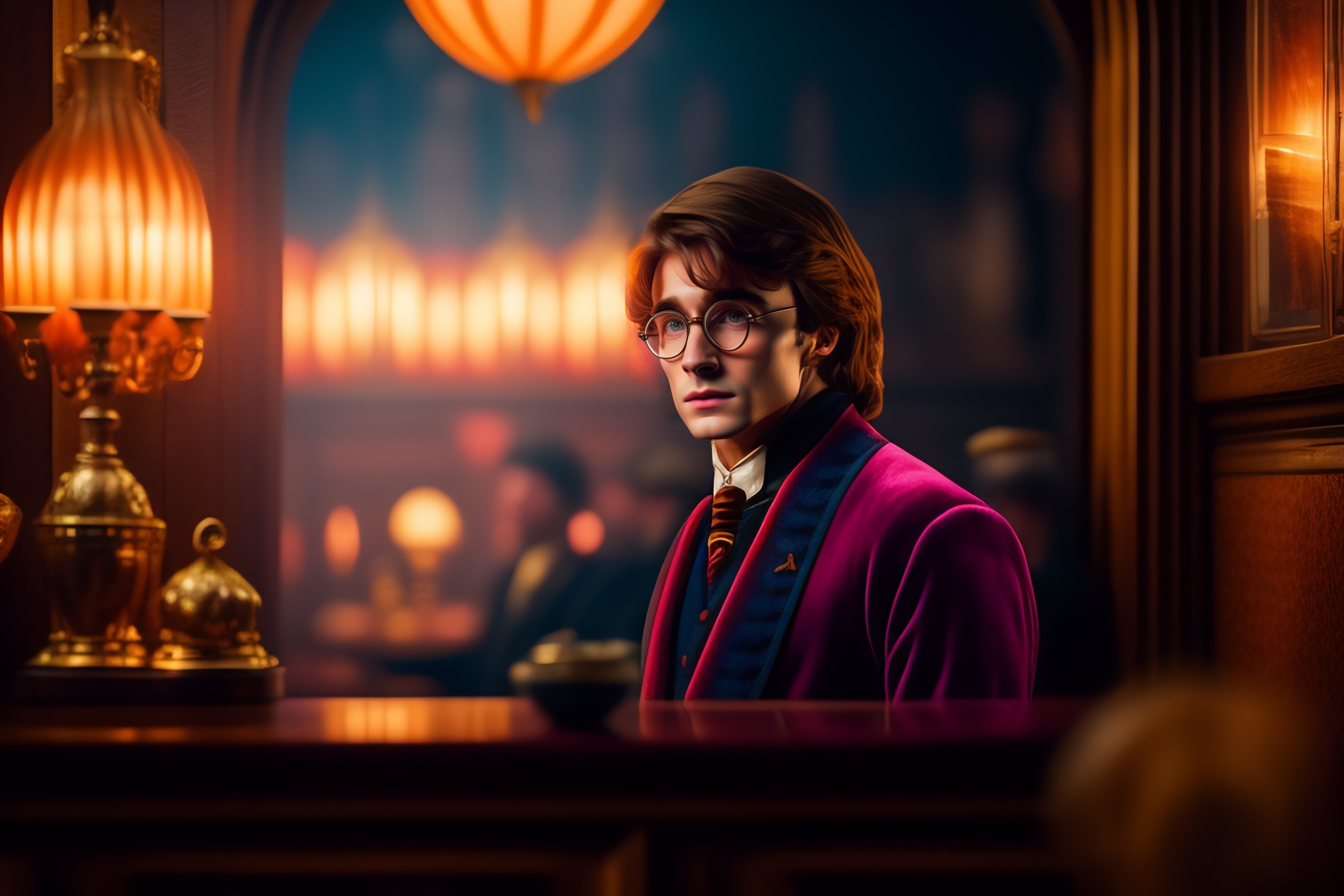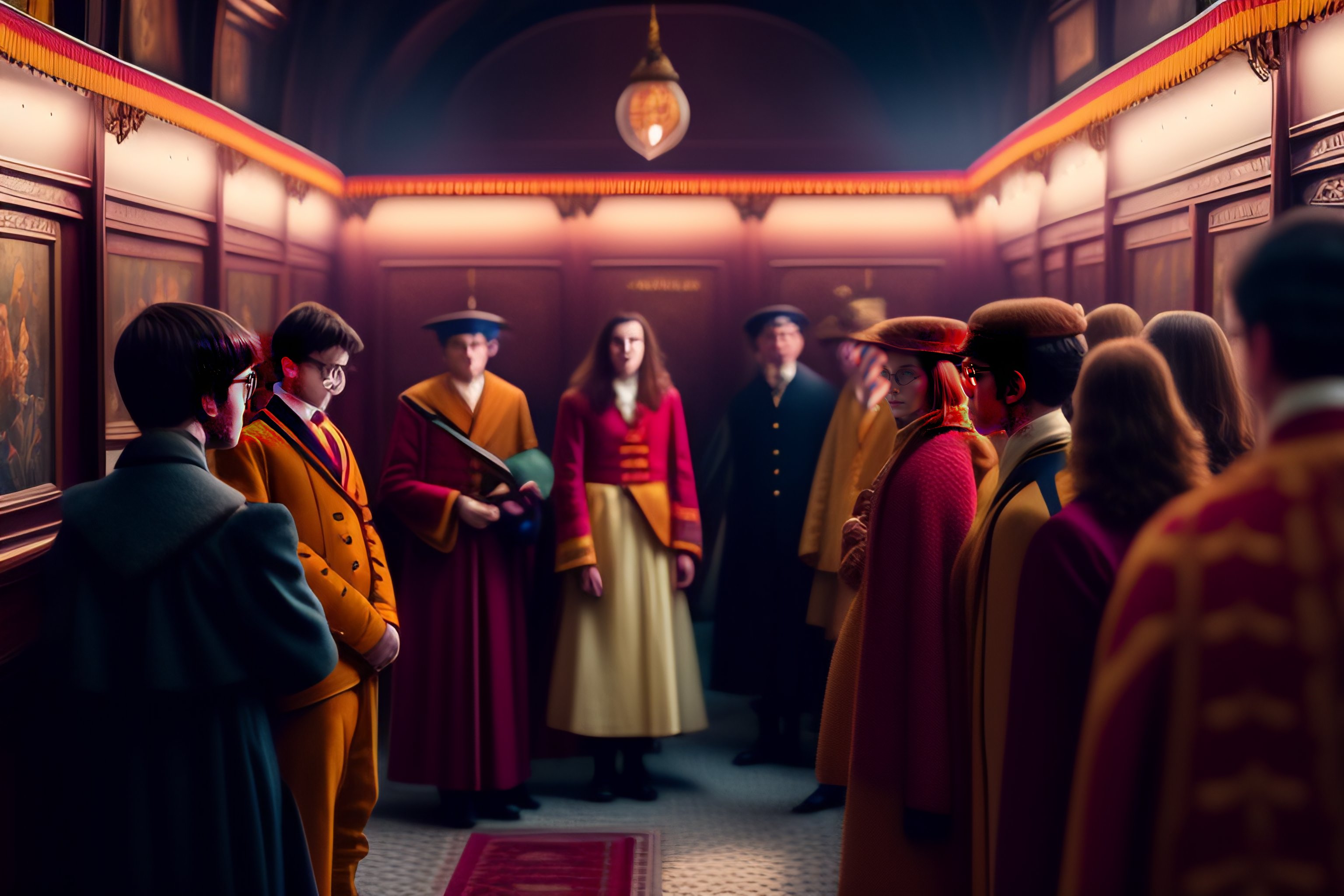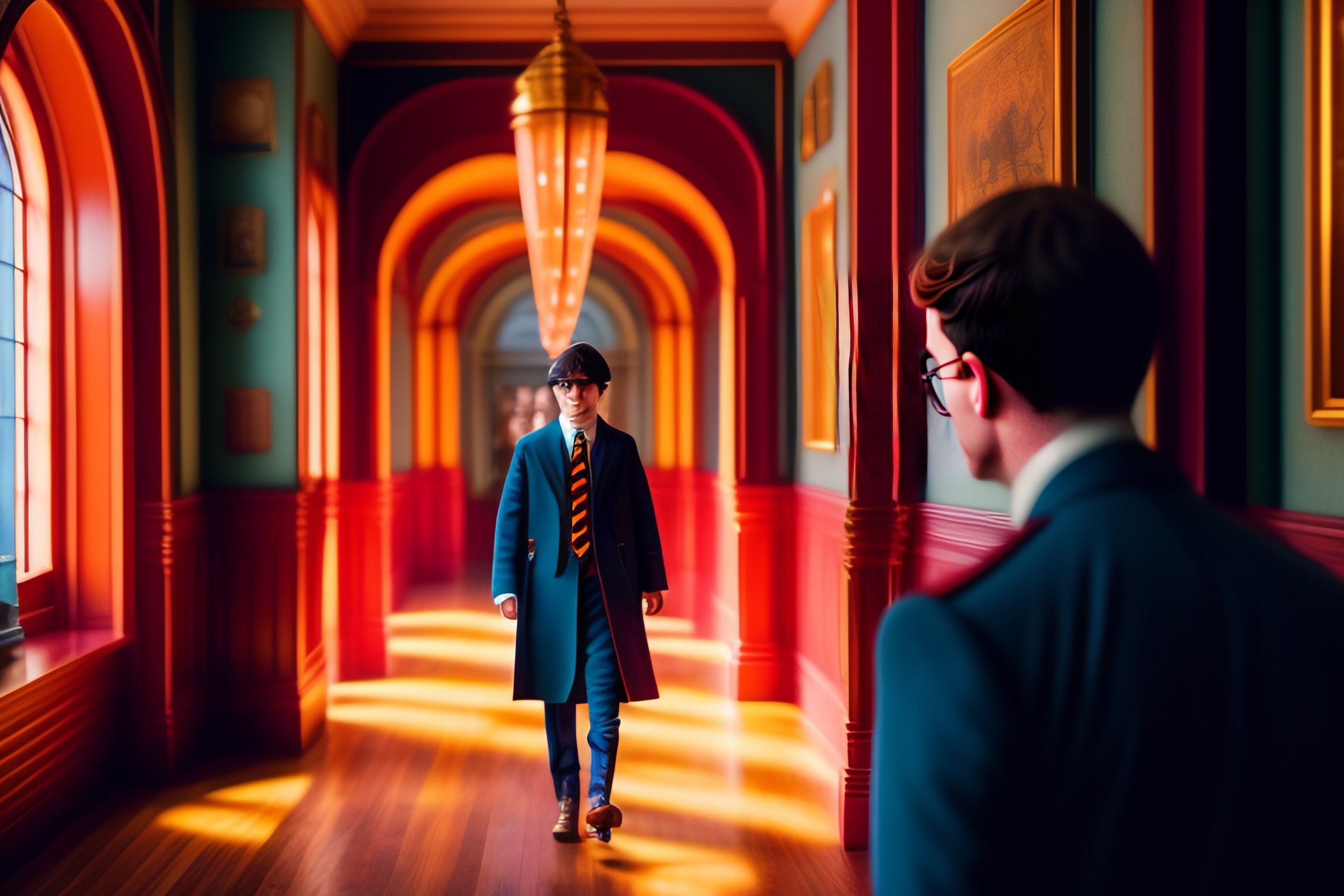Harry potter in wes anderson style, live action movie, movie still, realistic photography, wes anderson movie, cinematic, soft lighting, colorful scene with soft candy colors, symmetrical framing, light shadows, low contrast between brights and darks