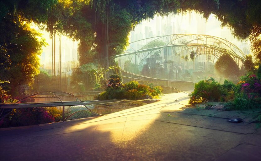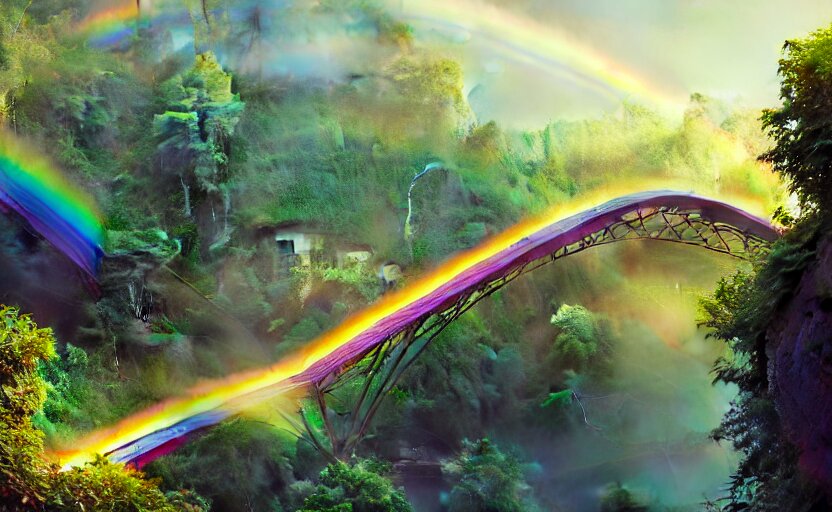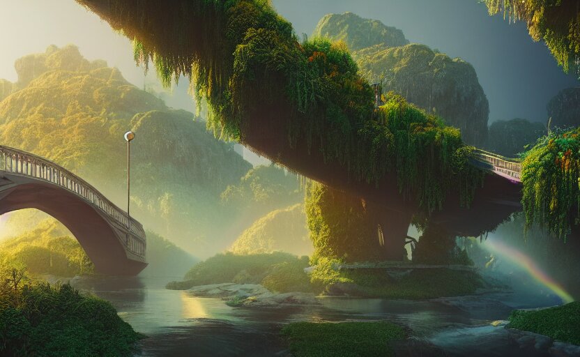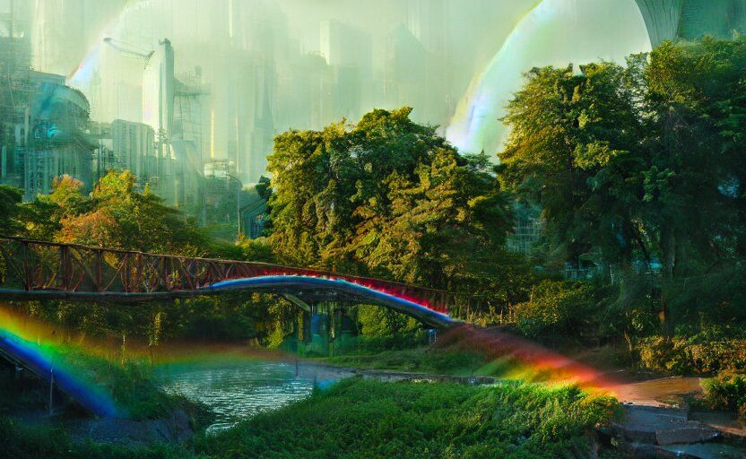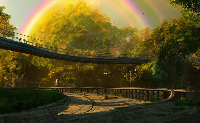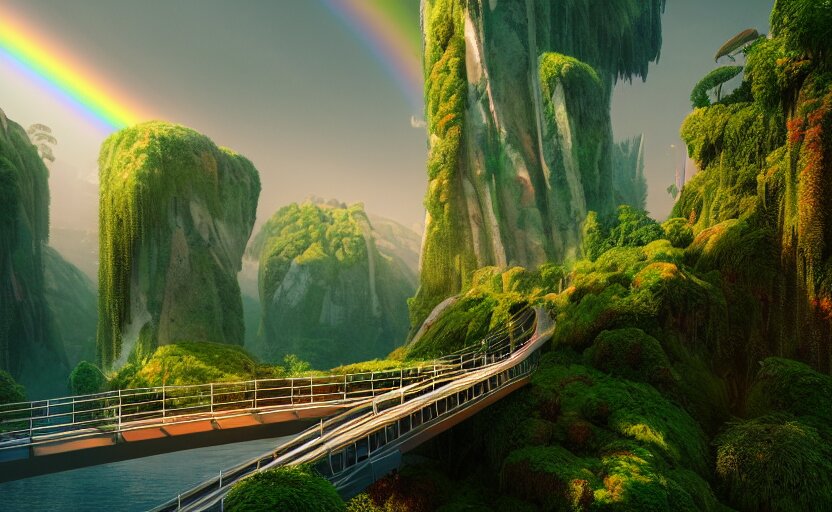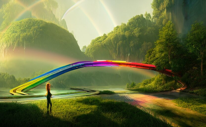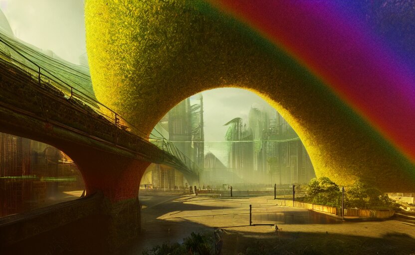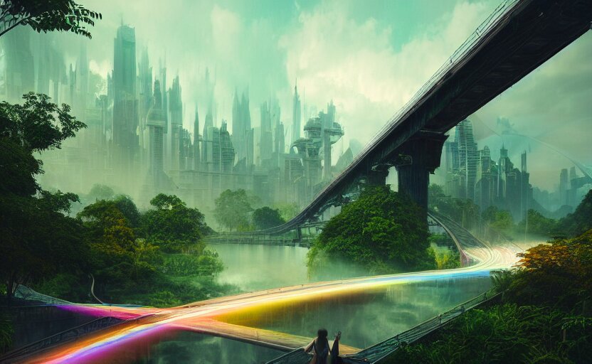 Incredible, mindblowing beautiful expansive rainbow hardlight bridge, matte painting, artstation, solarpunk metropolis, cgsociety, dramatic lighting, vibrant greenery, concept art, octane render, arnold 3 d render