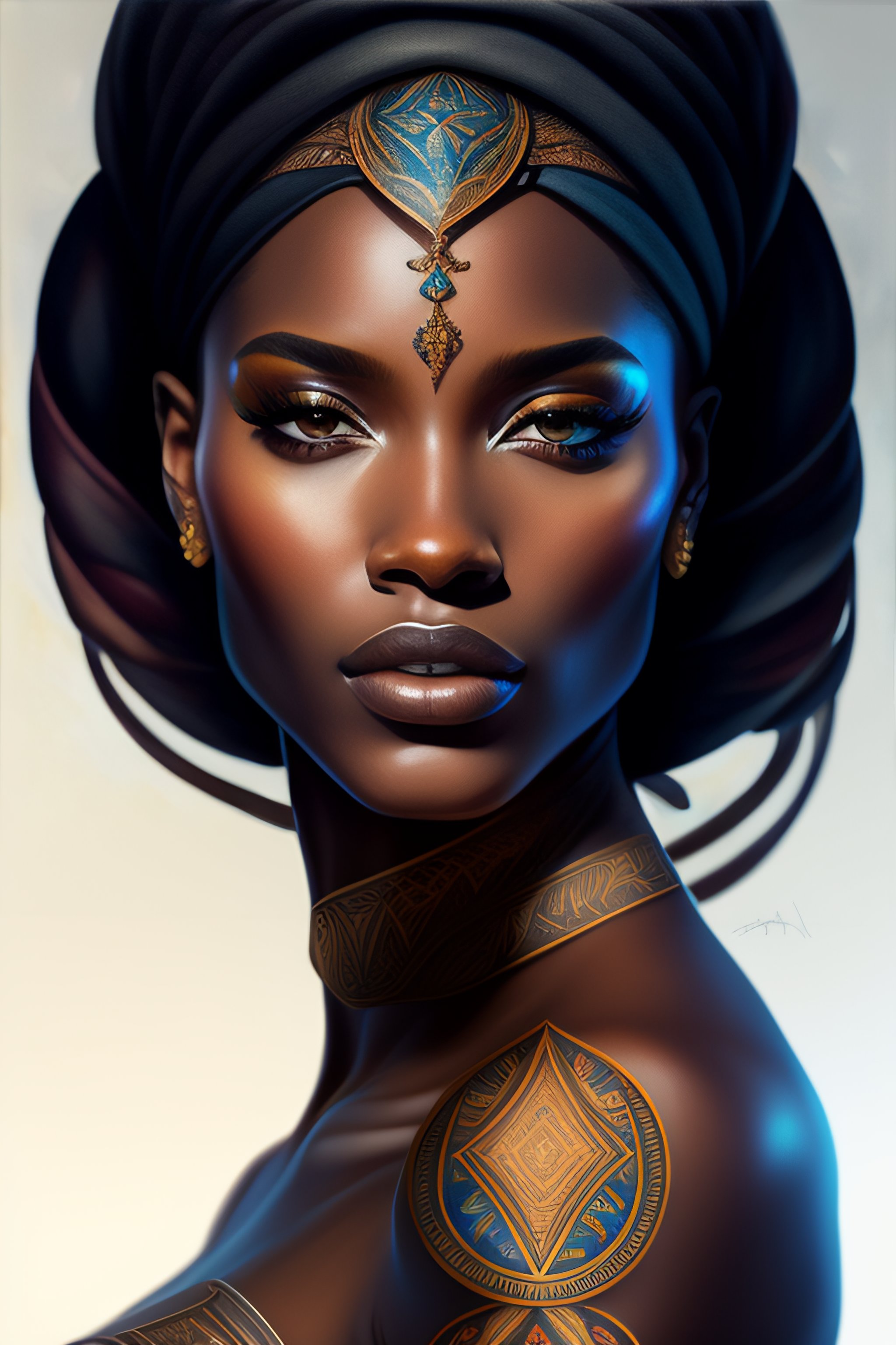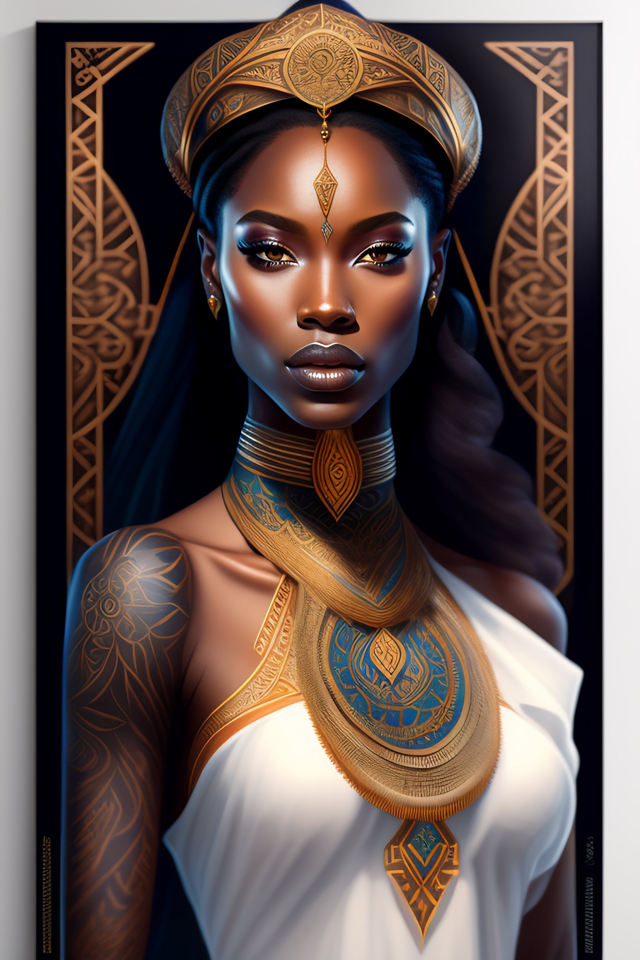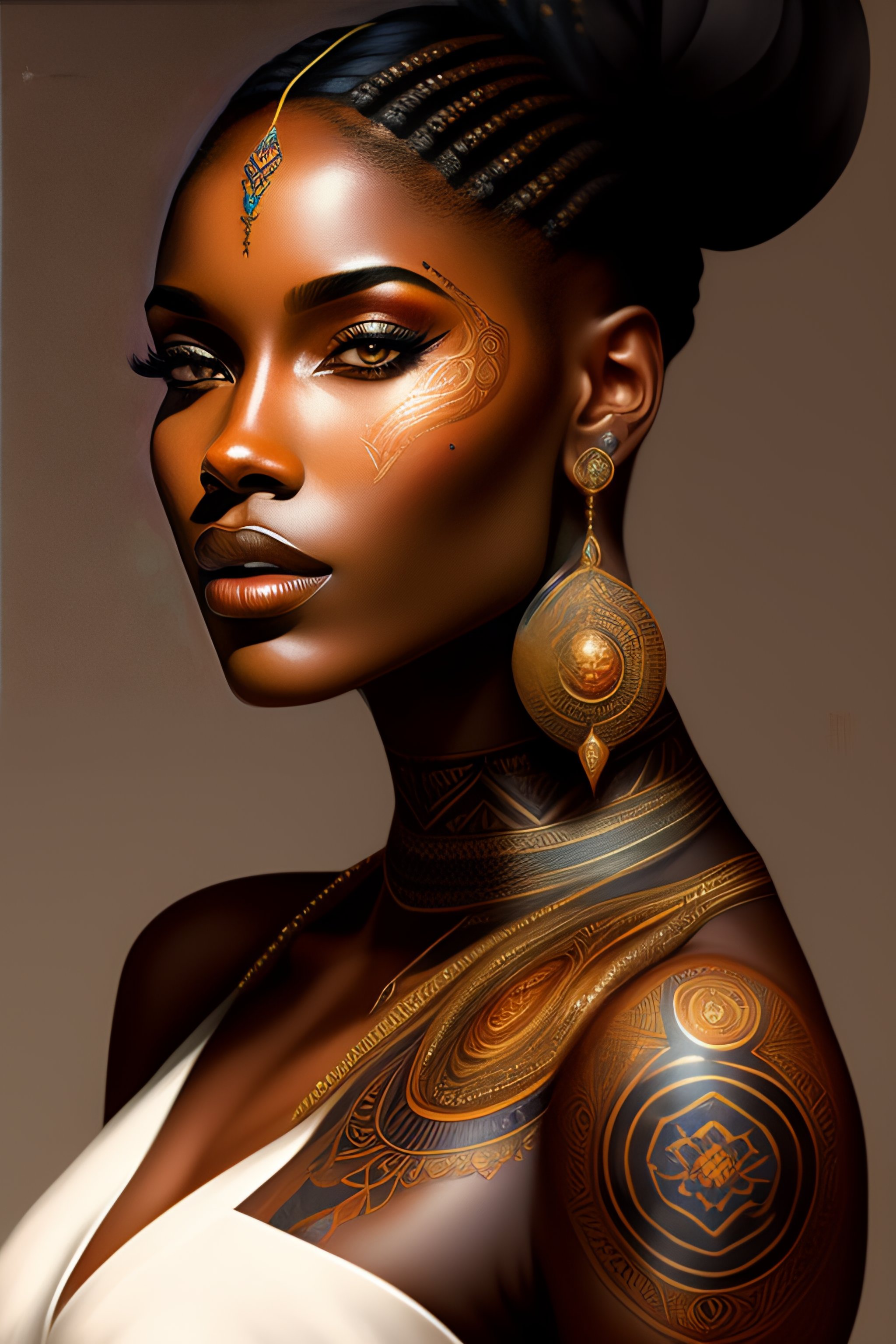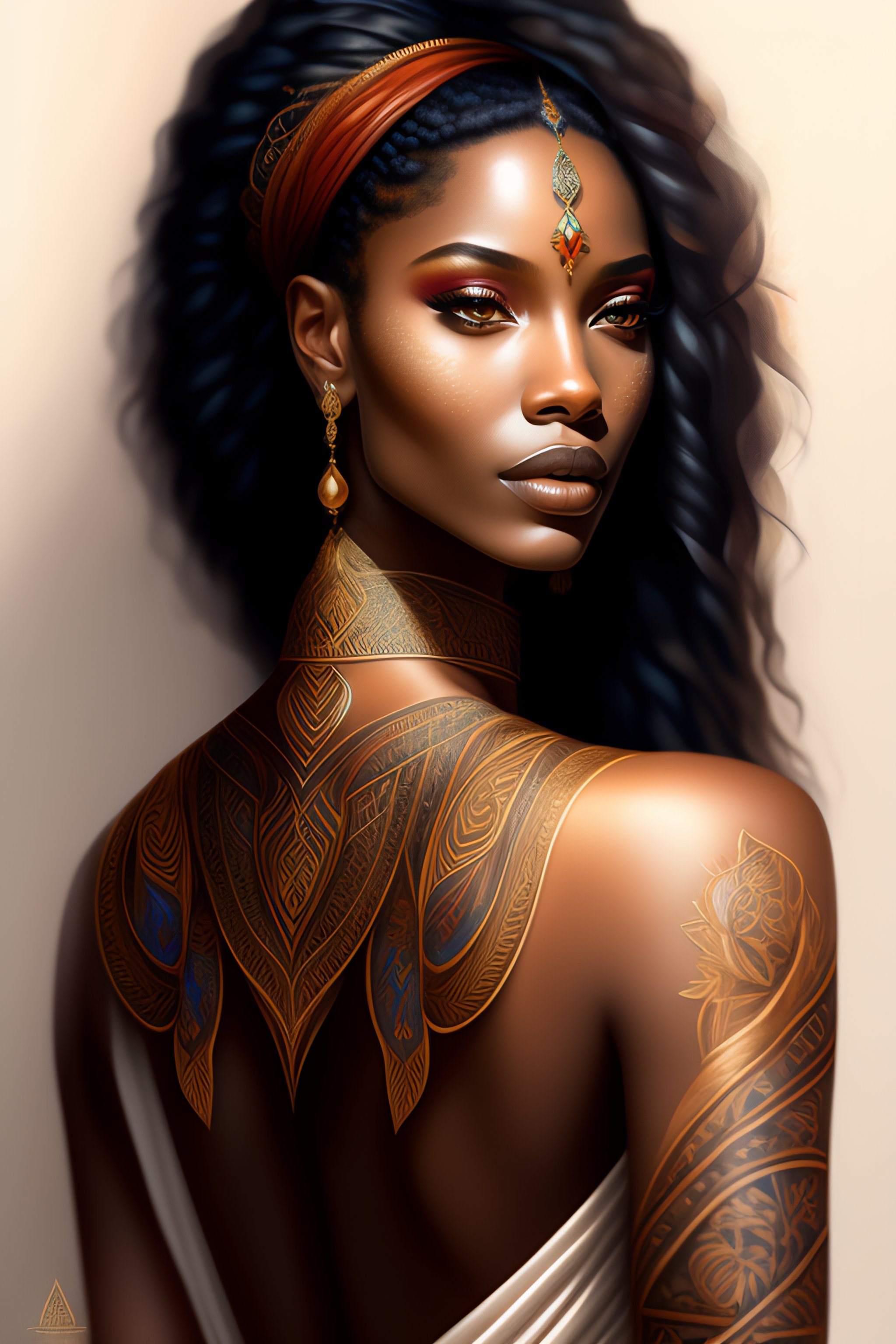 Tattoo design, symmetrical body portrait of beautiful nubian tribal tattooed young woman, intricate, elegant, highly detailed, digital painting, artstation, concept art, smooth, sharp focus, illustration, art by artgerm and greg rutkowski and alphonse mucha, 8 k