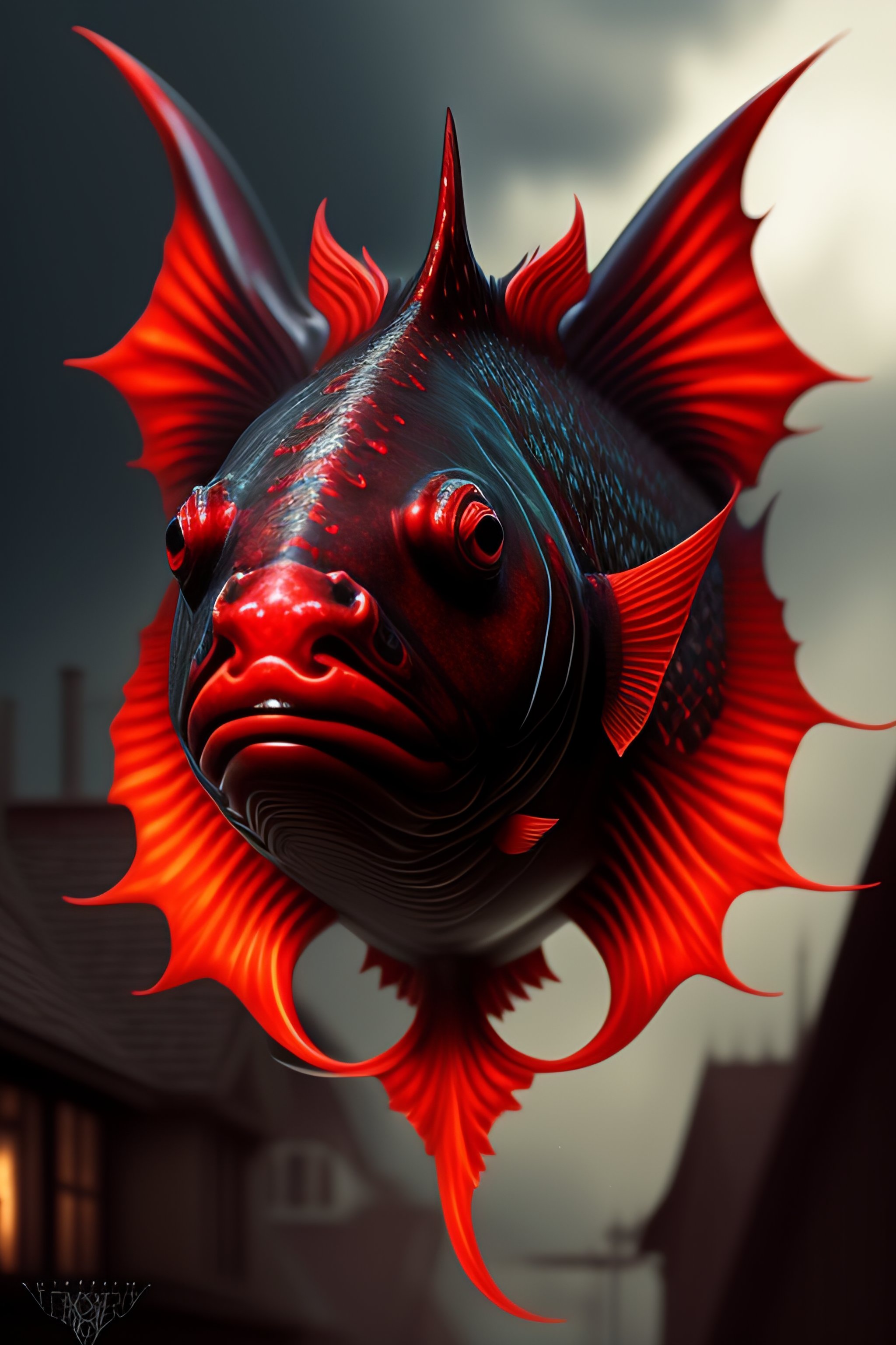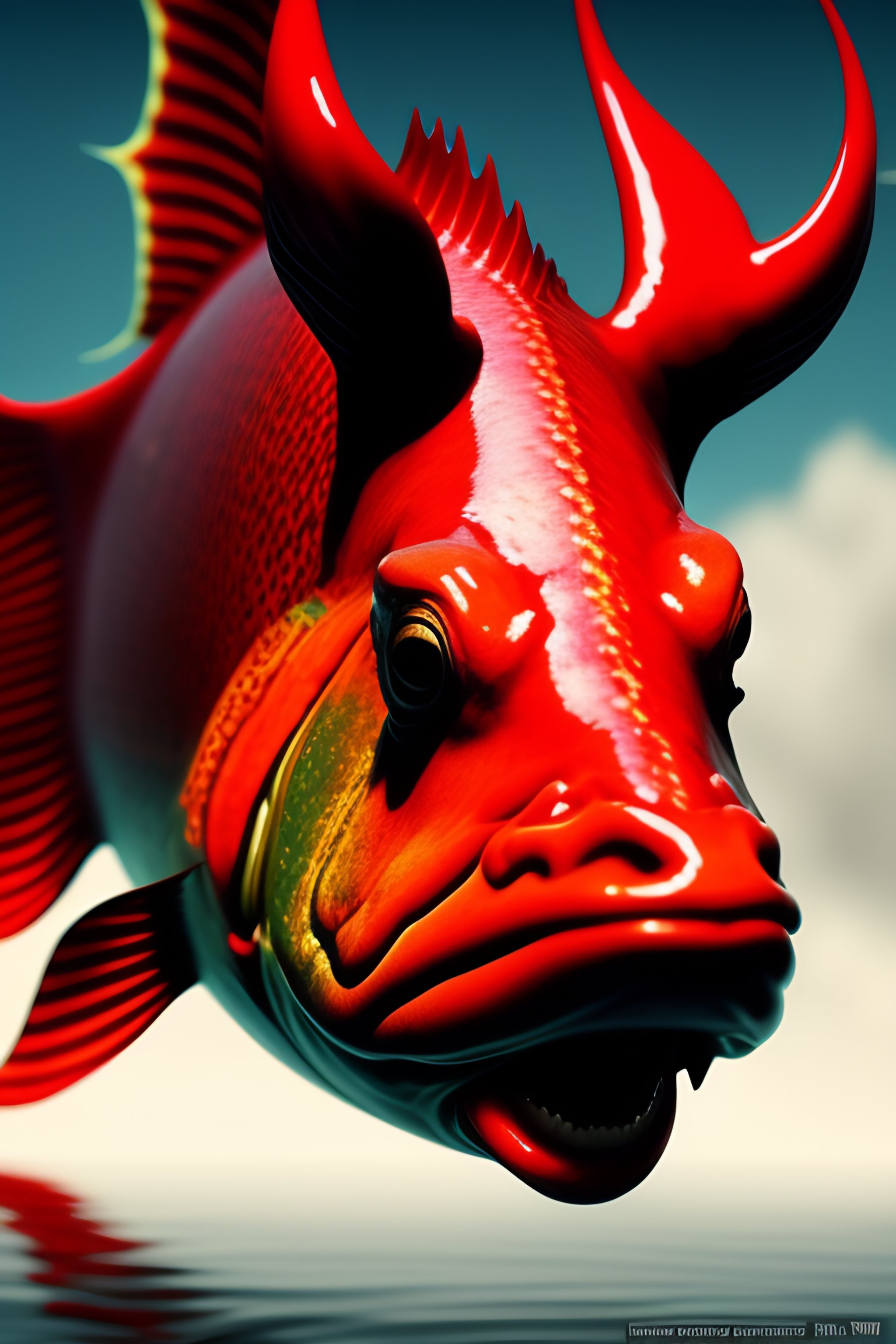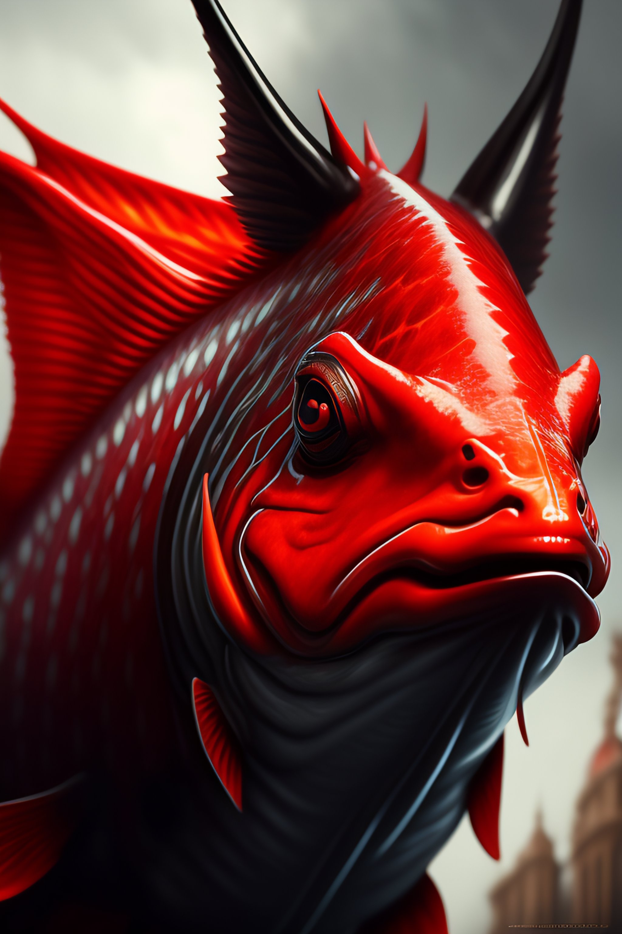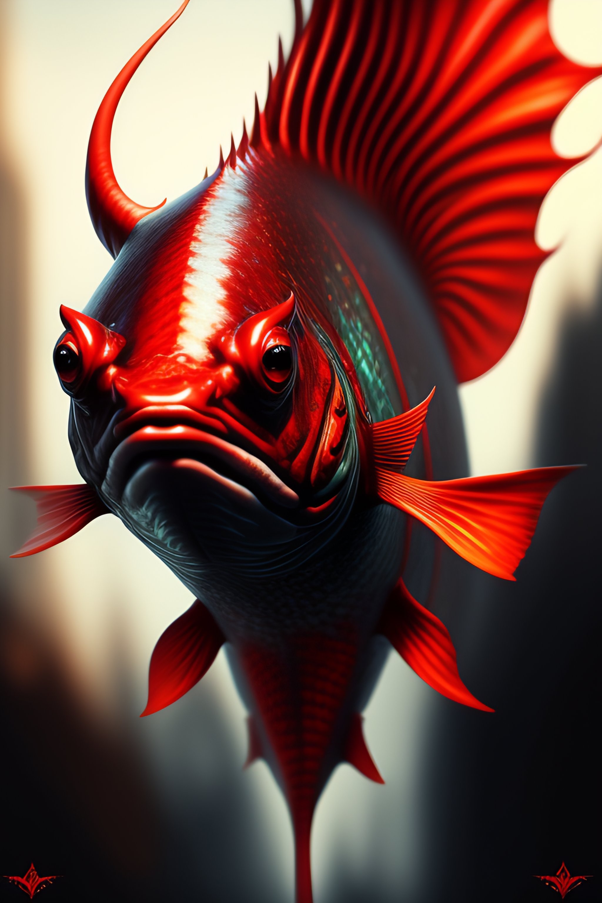 Demonic fish with red horns, painting in the style of norman rockwell, 1 9 5 0 s, evil, satan, devil, demonic, demon, hyperrealistic, photorealistic, award - winning, 4 k, ultra hd, artstation, intricate, highly detailed, american, usa, dark, gritty