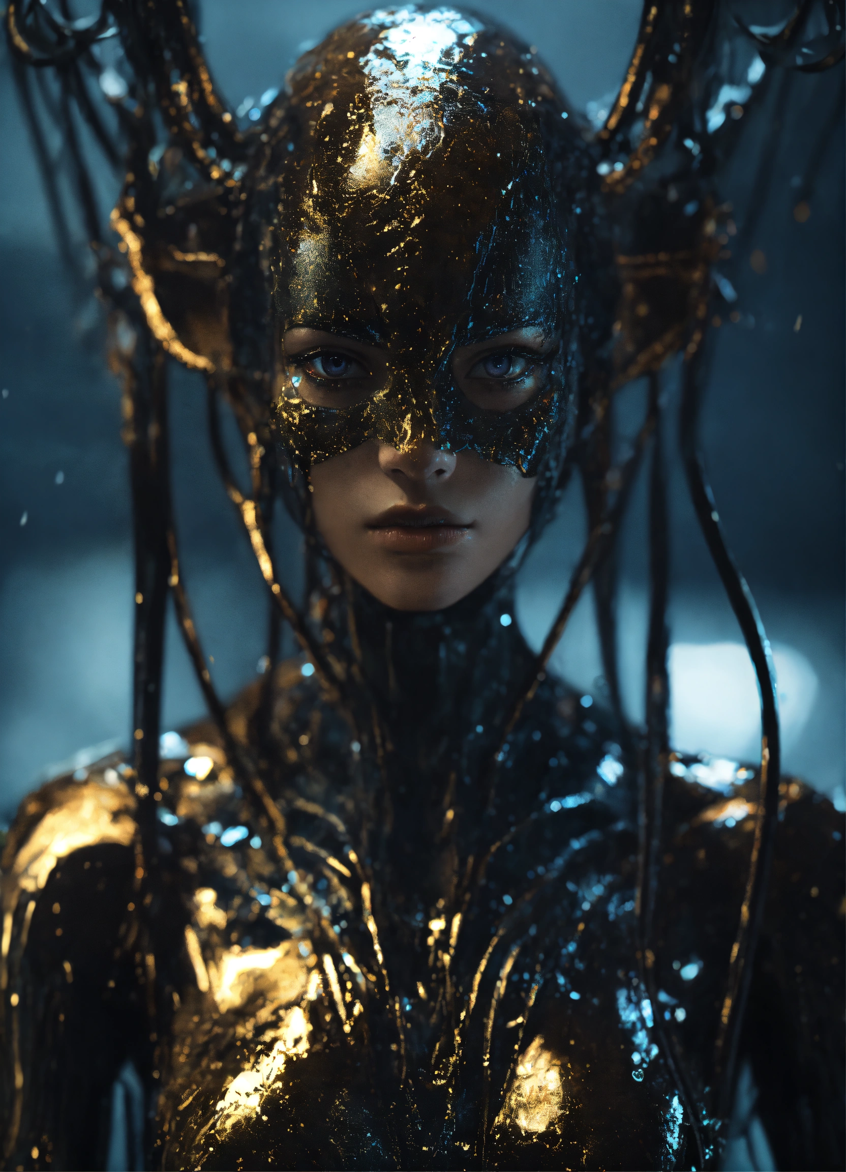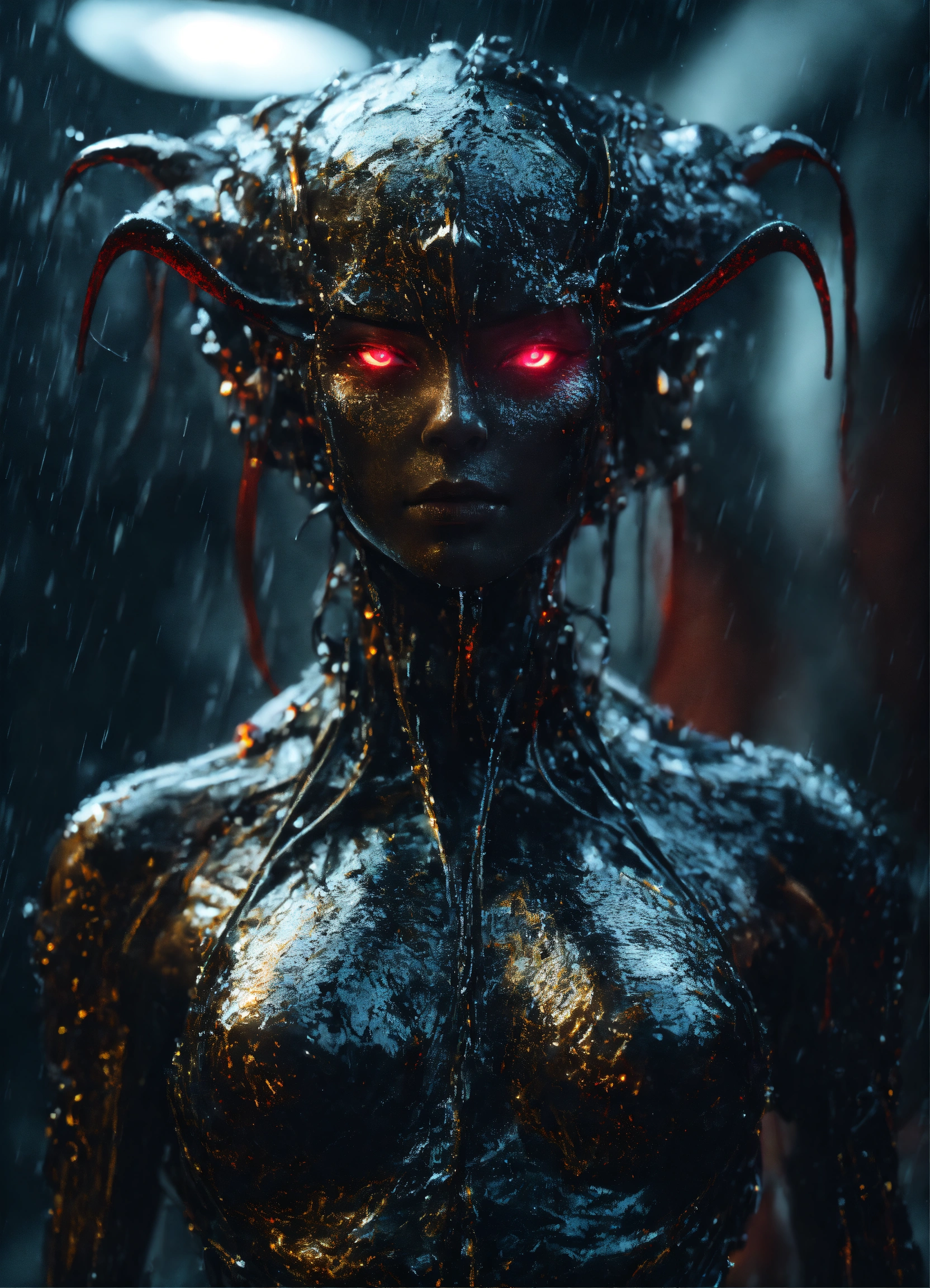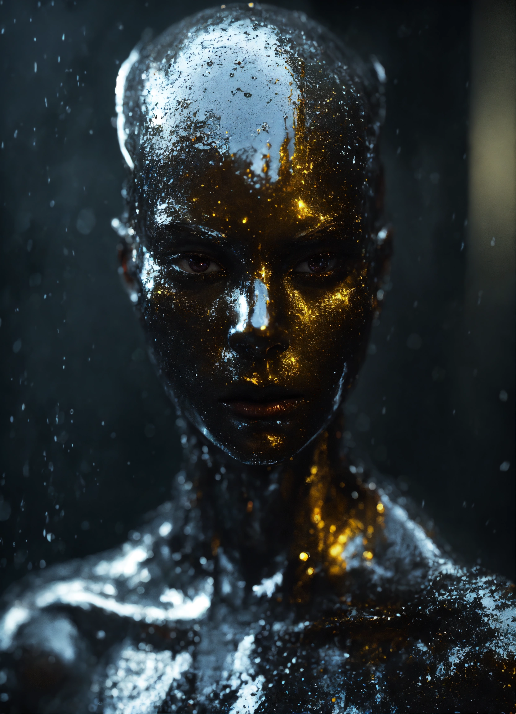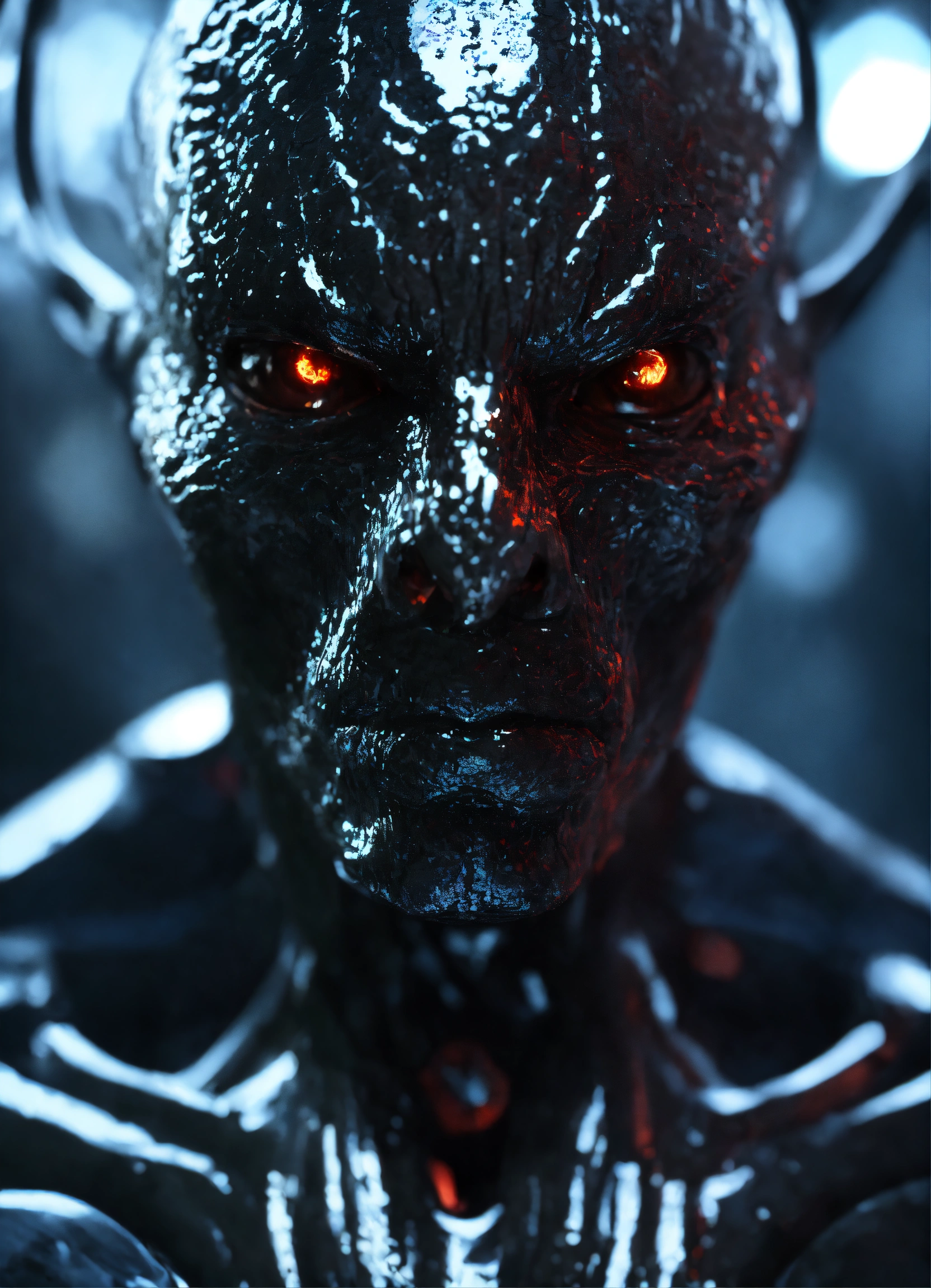The dark creature stares at the camera, in the style of liquid metal, vray tracing, raw character, 32k uhd, schlieren photography, conceptual portraiture, wet - on - wet blending