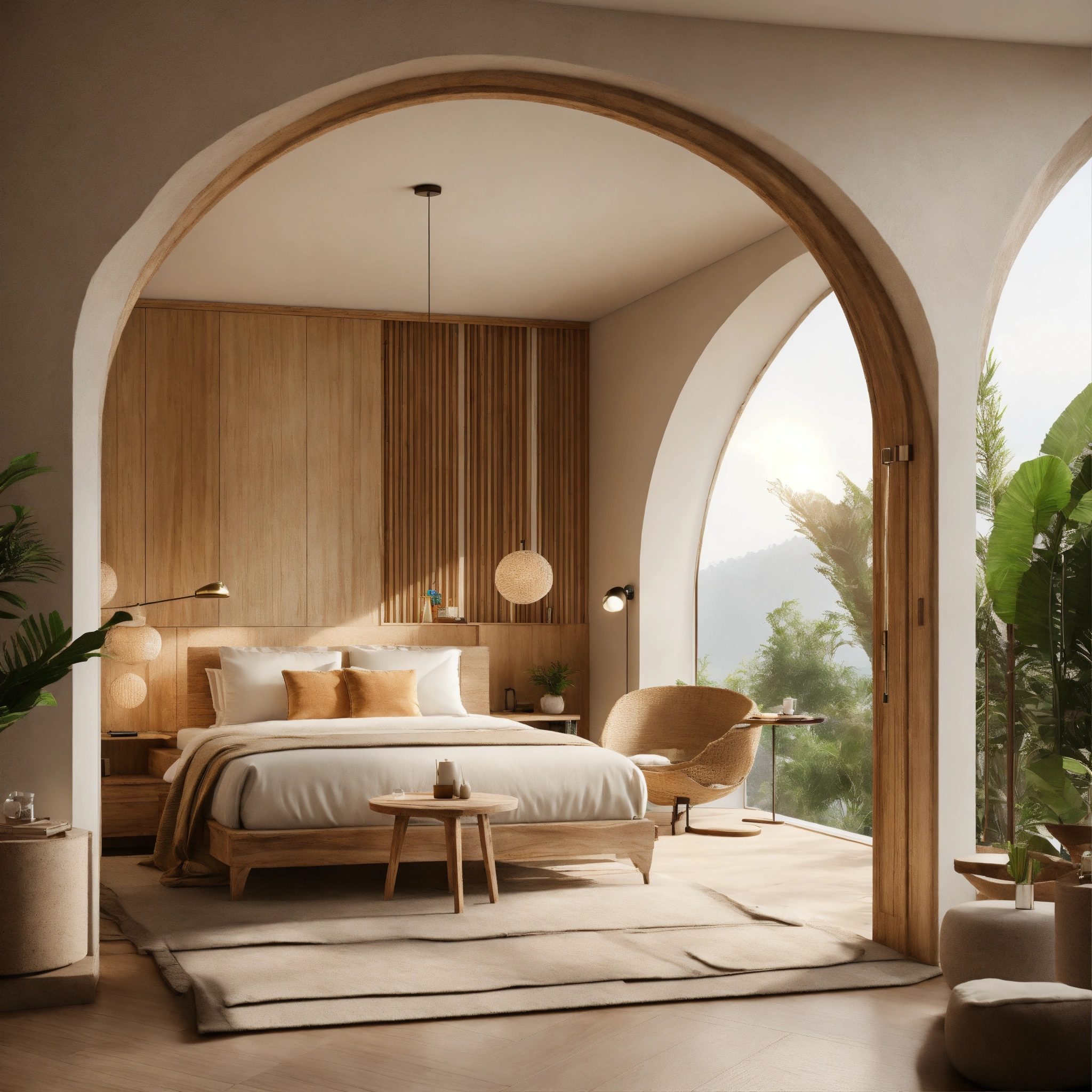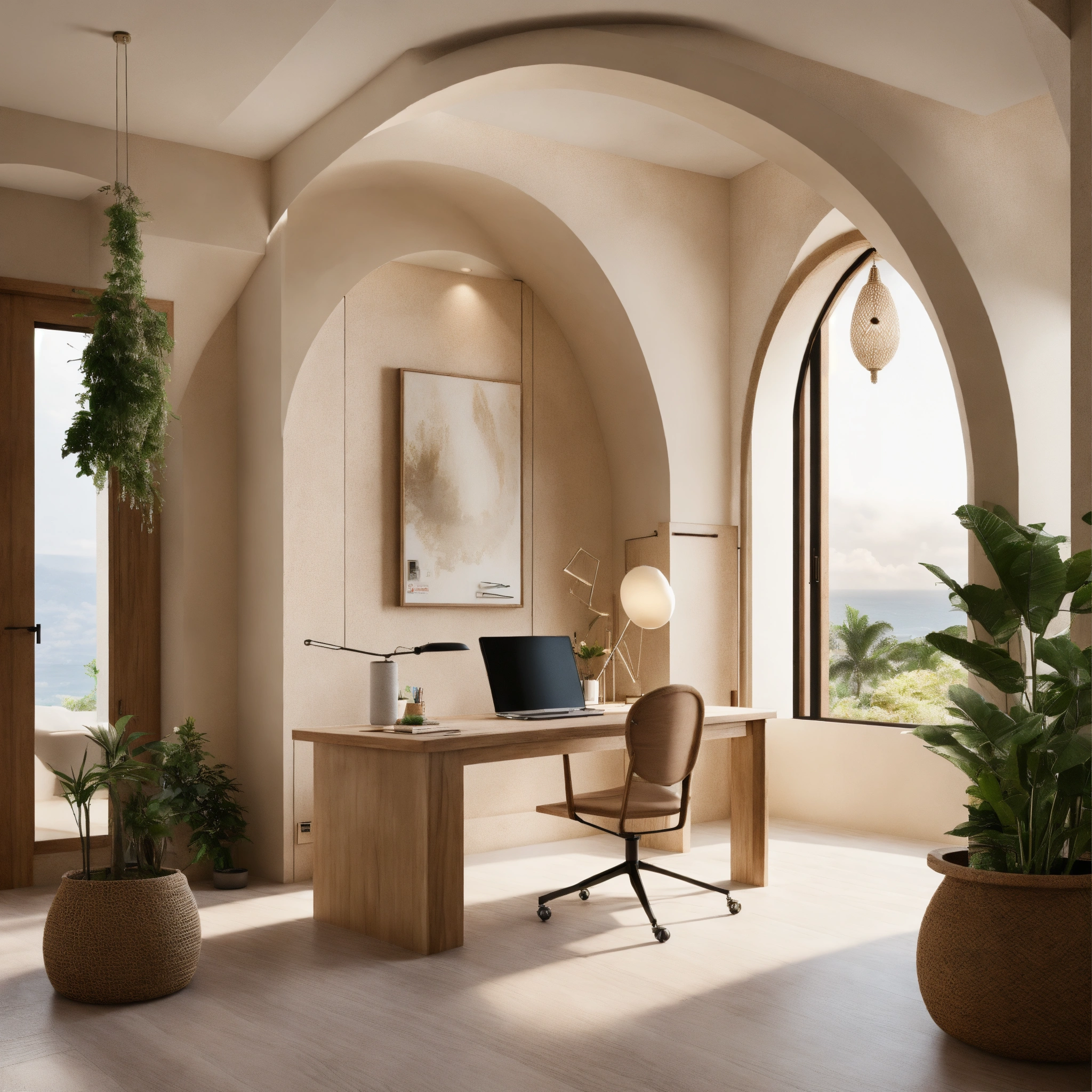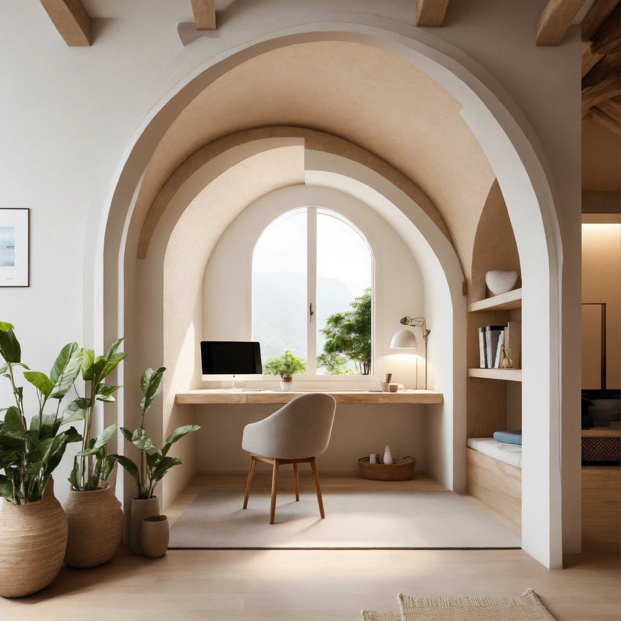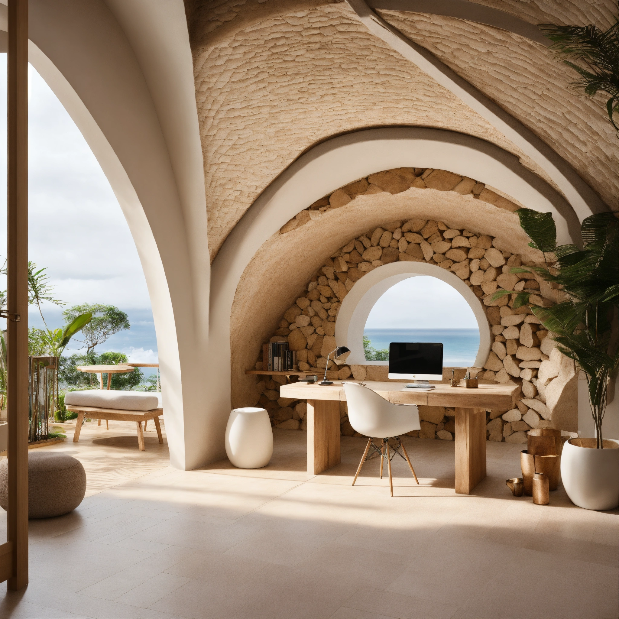Ultra realistic photo of modern take on bali inspired low ceiling small apartment white cream stone, light wood round arches interor view of office.