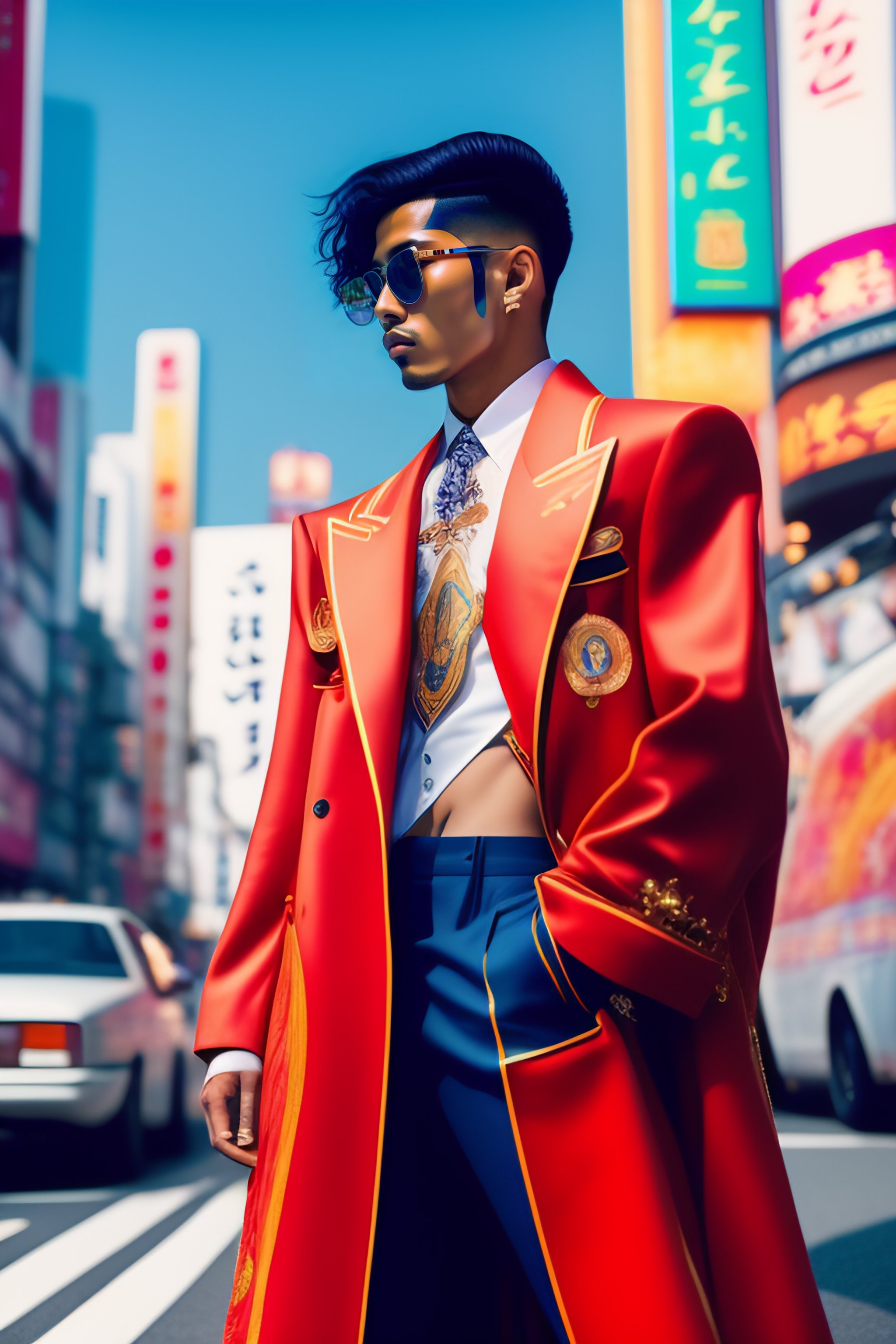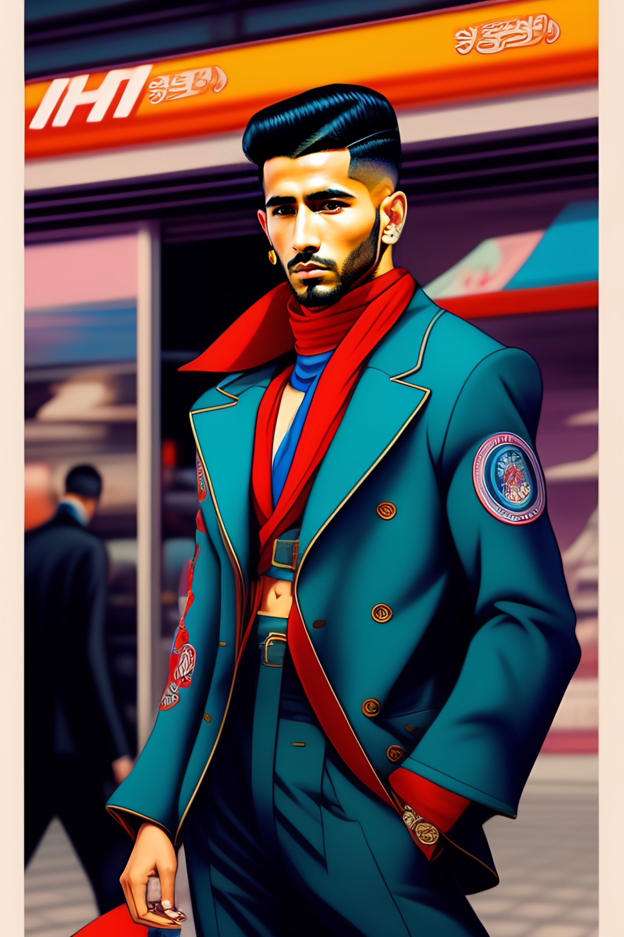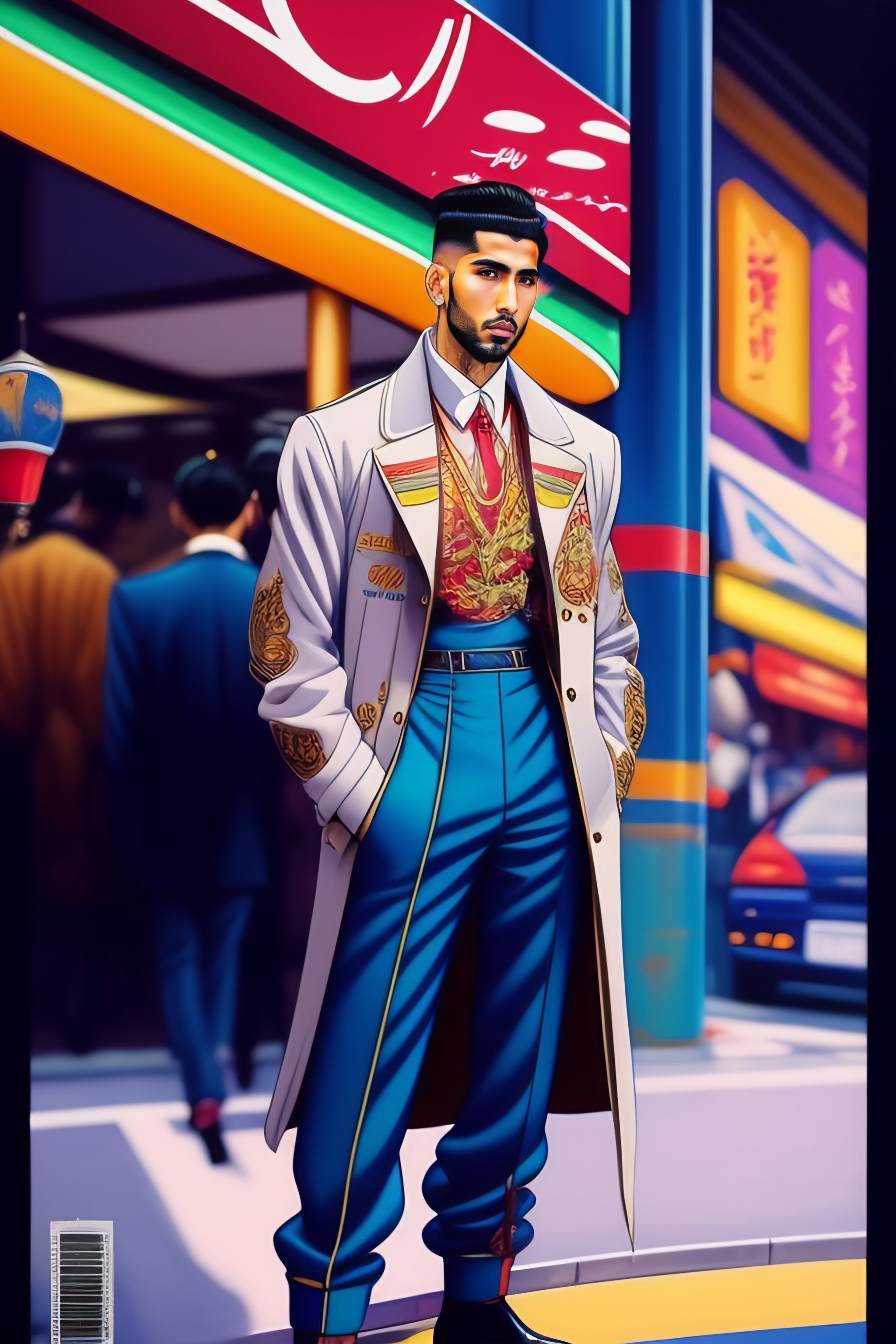 Riyad mahrez stylish haute couture outfit worn by model in the style of 90's vintage anime, surrealism, akira style. detailed line art. fine details. inside a 7/11 in tokyo