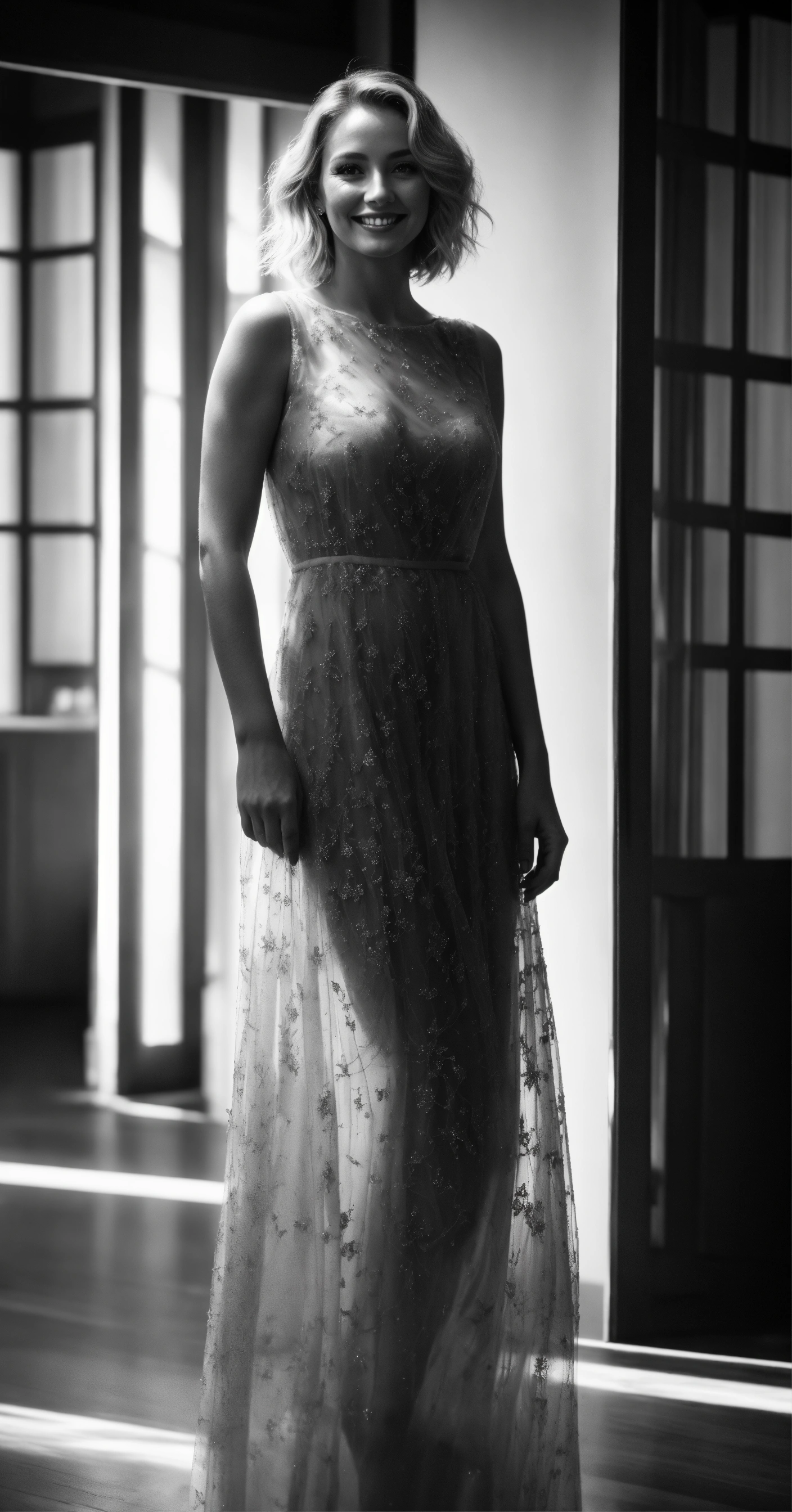 Photo with knowing smile of an actress standing full length in a transparent dress, 40 year old woman, blonde with natural skin detail and small discreet freckle, black and white studio photo, light eyes, cinema atmosphere, harcourt studio style lighting, ultra-detailed, 4k quality