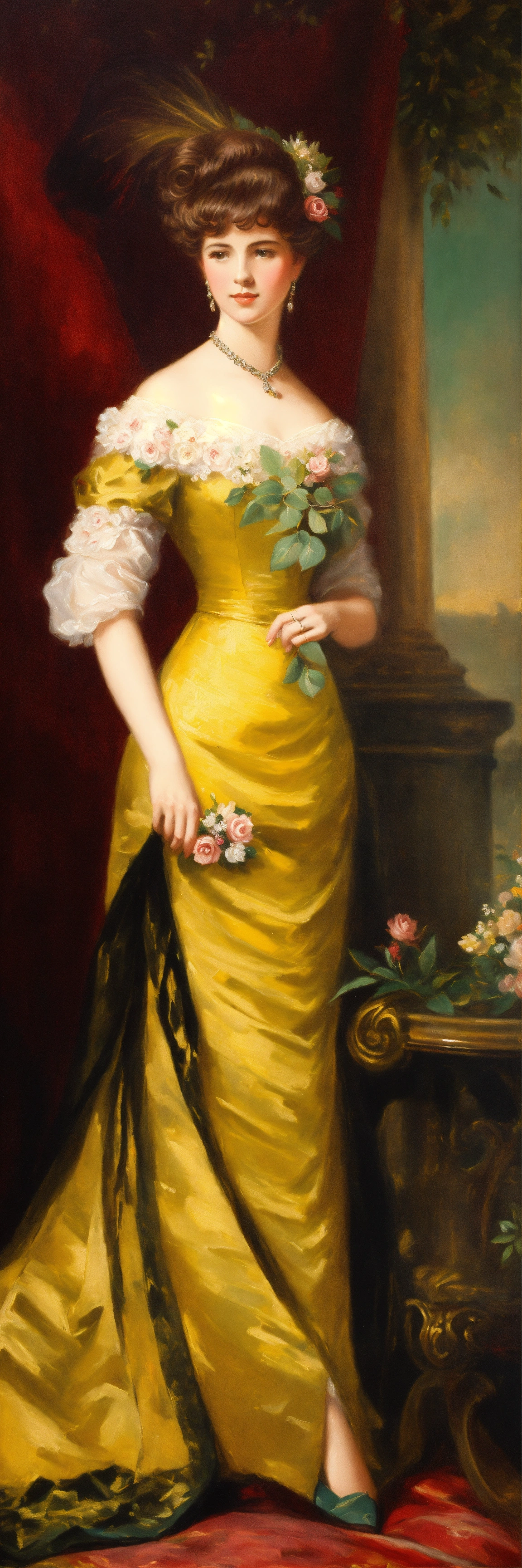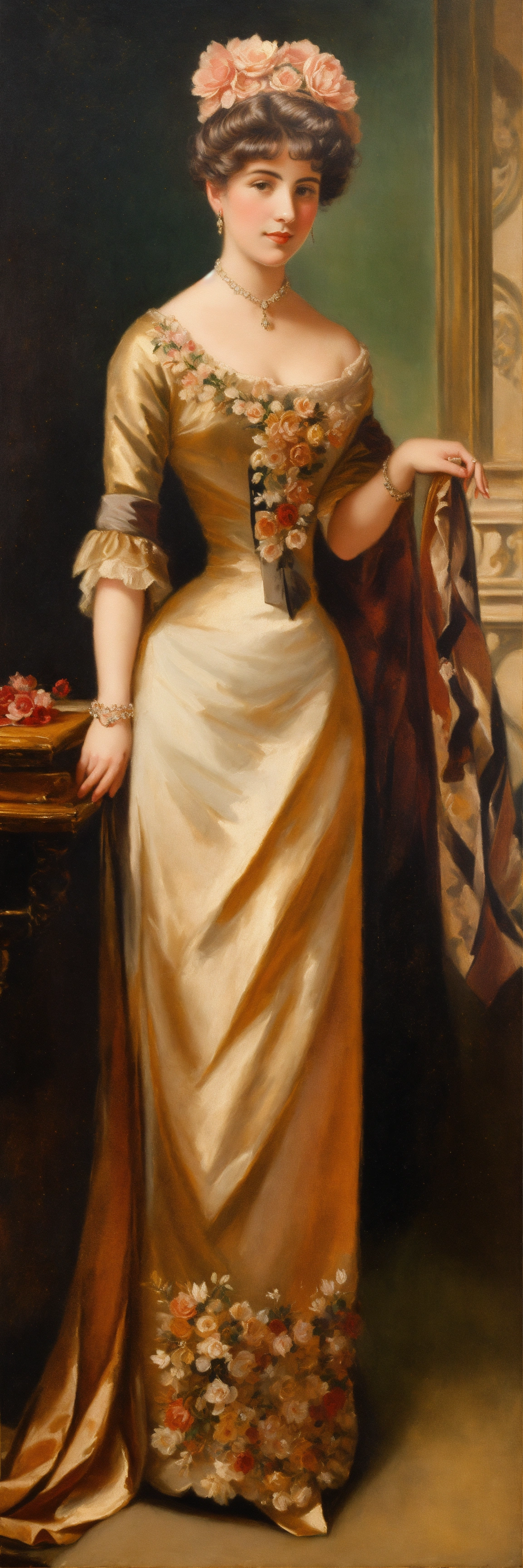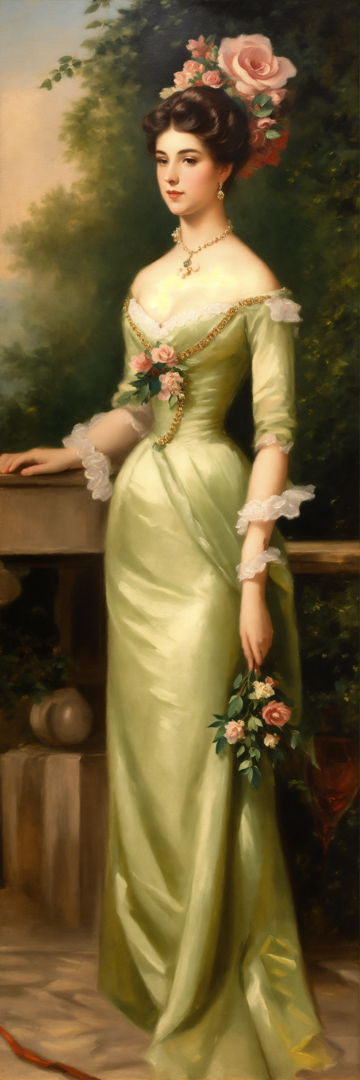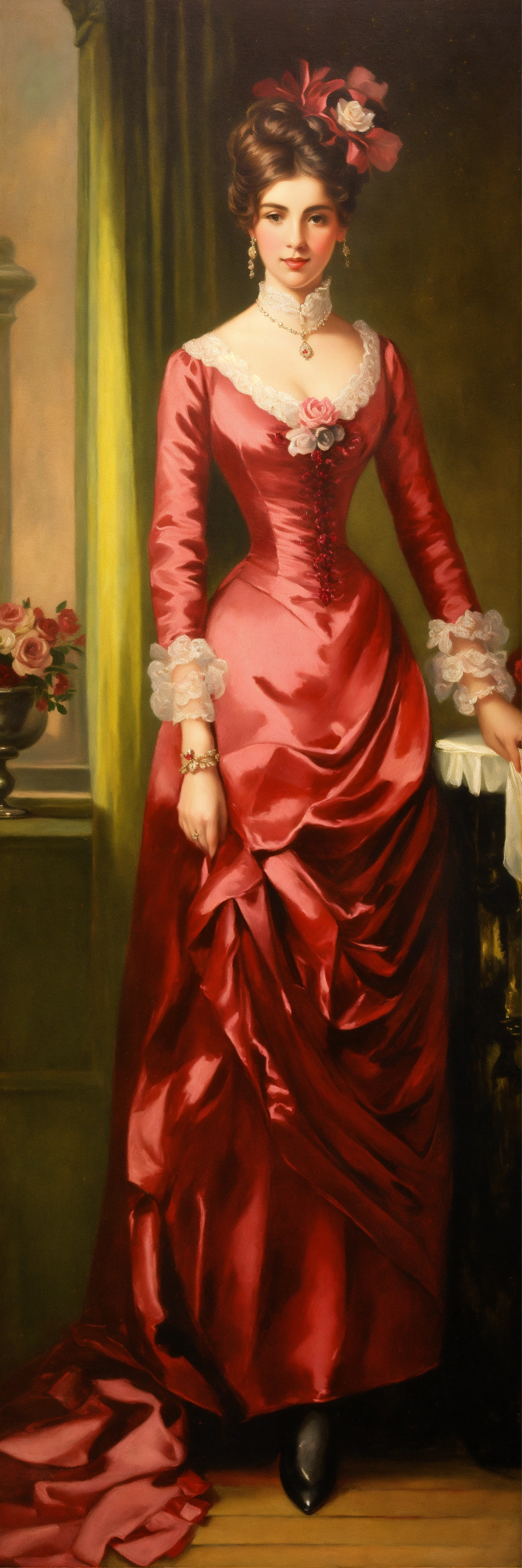 Oil painting of elegant ladies evening outfit 1800s