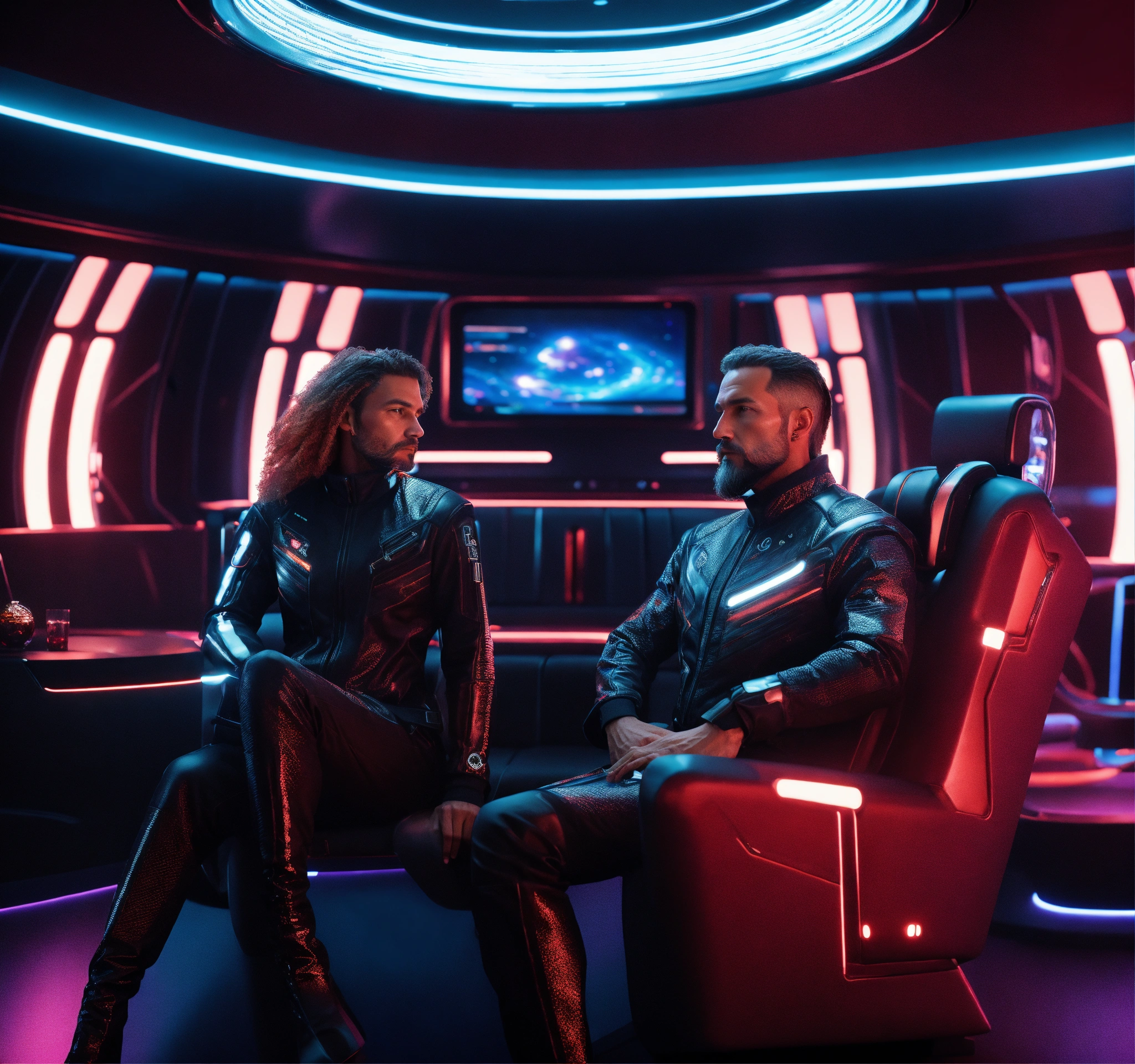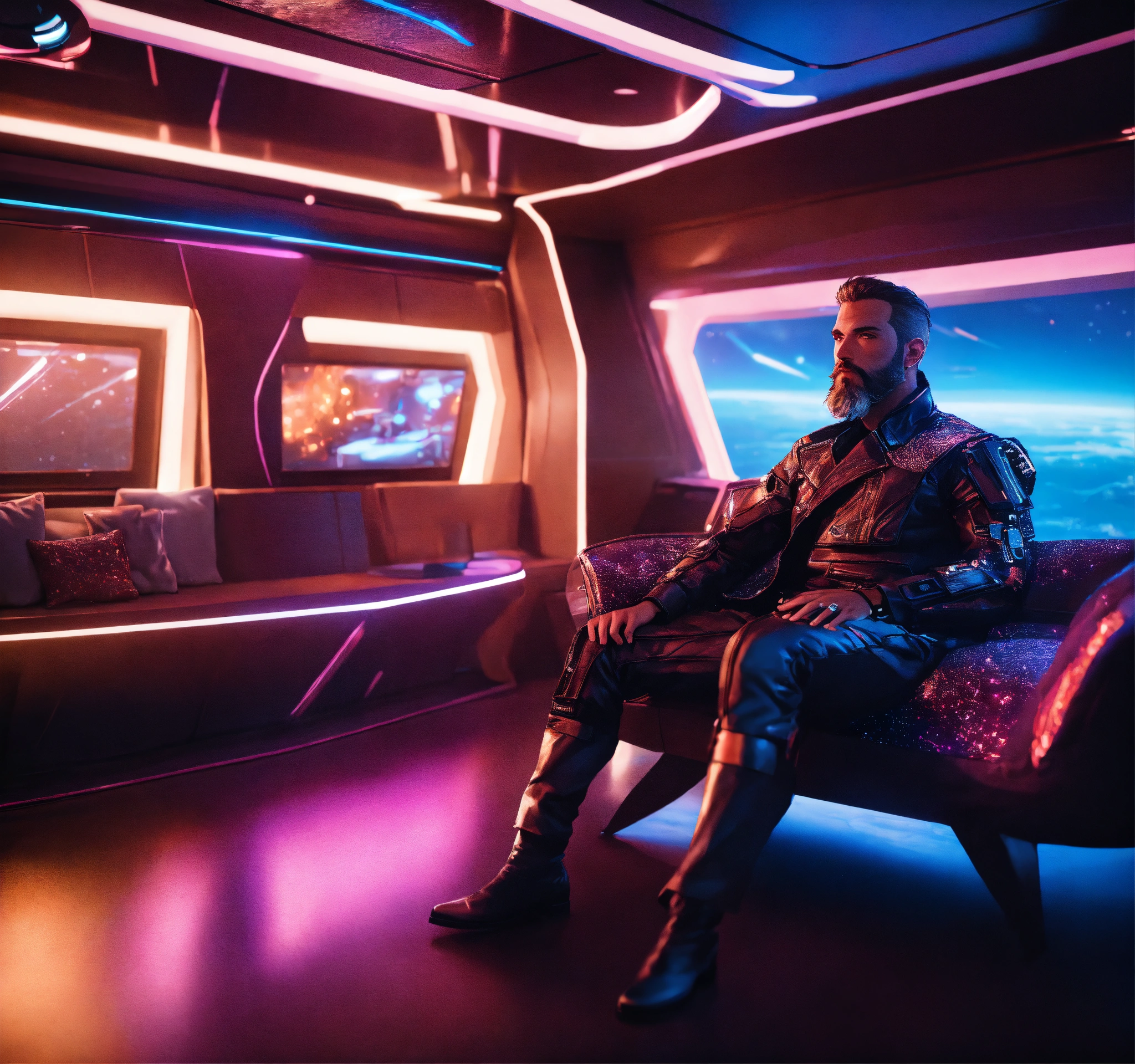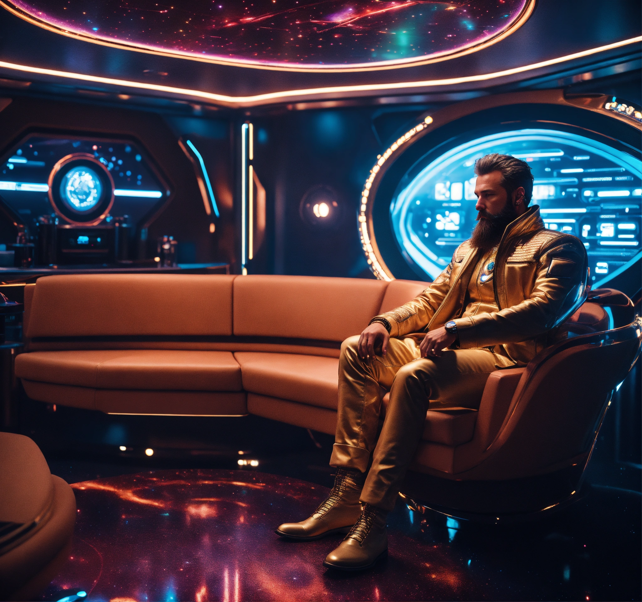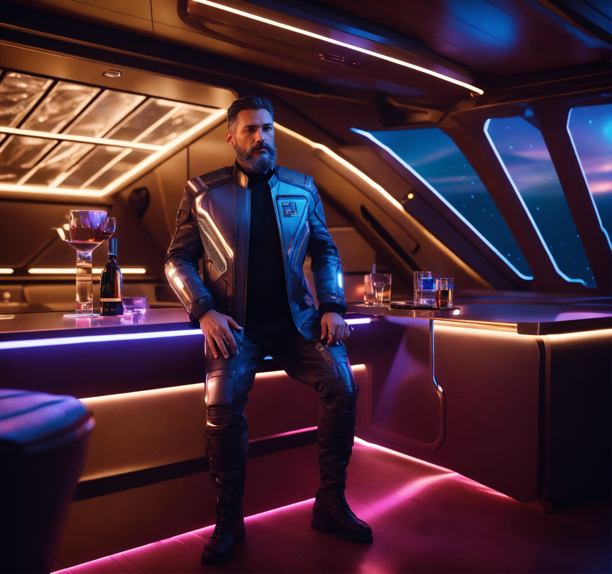 45 year old masculine man with trim beard in futuristic intergalactic federation clothing, relaxing with women in the dark lounge on a luxurious hi tech space space yacht, realistic, futuristic, sci-fi, 8k, unreal engine