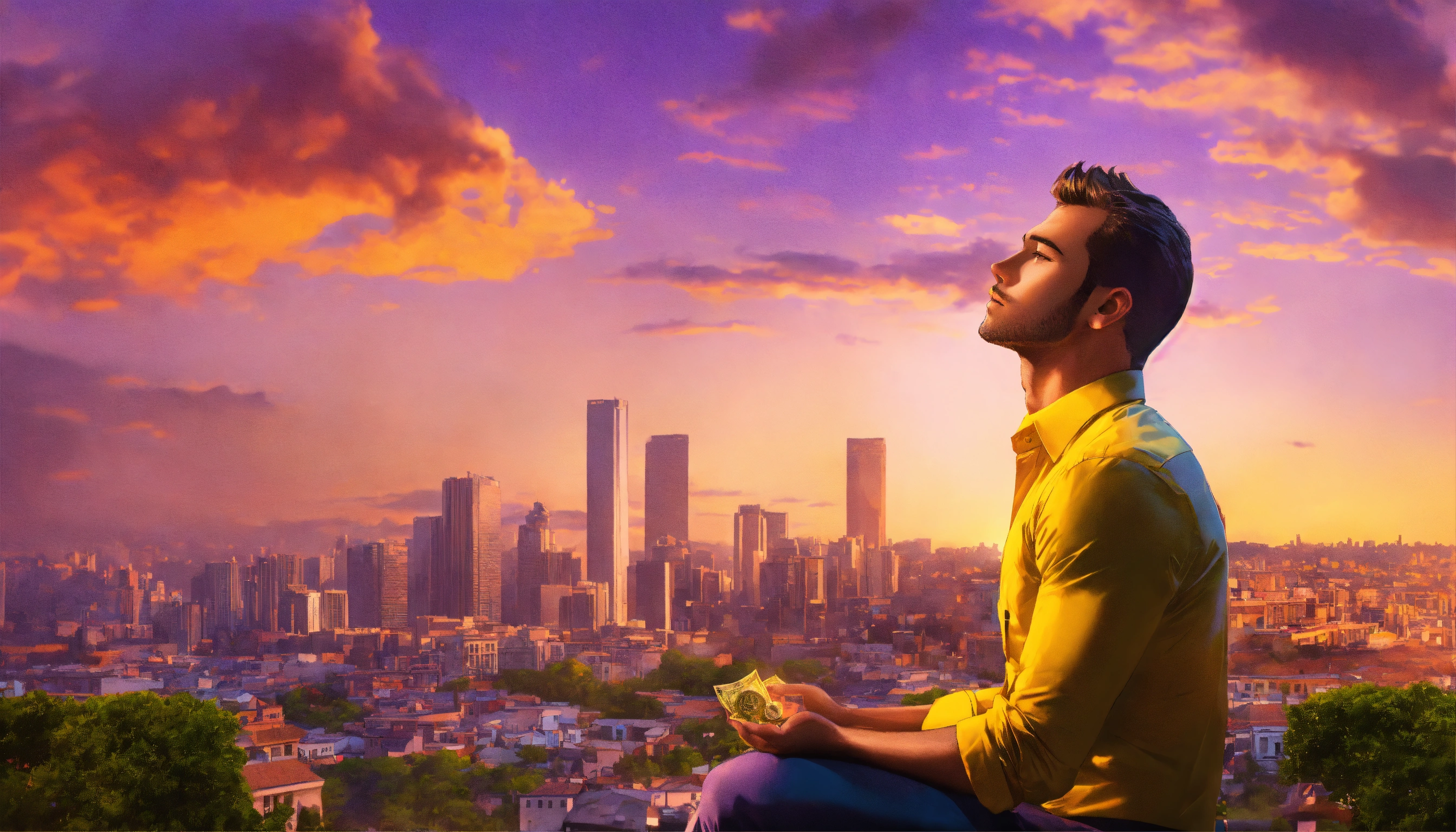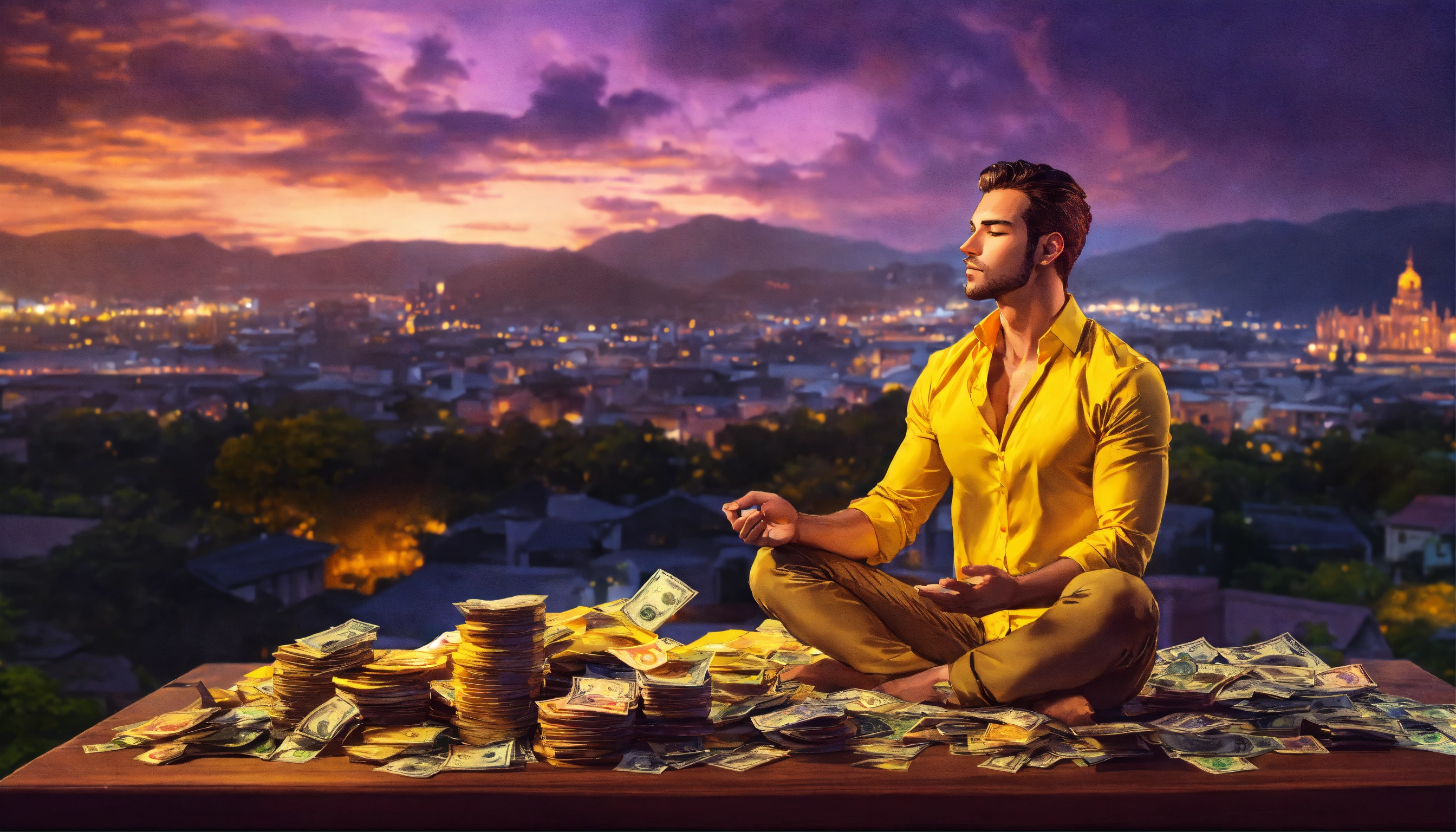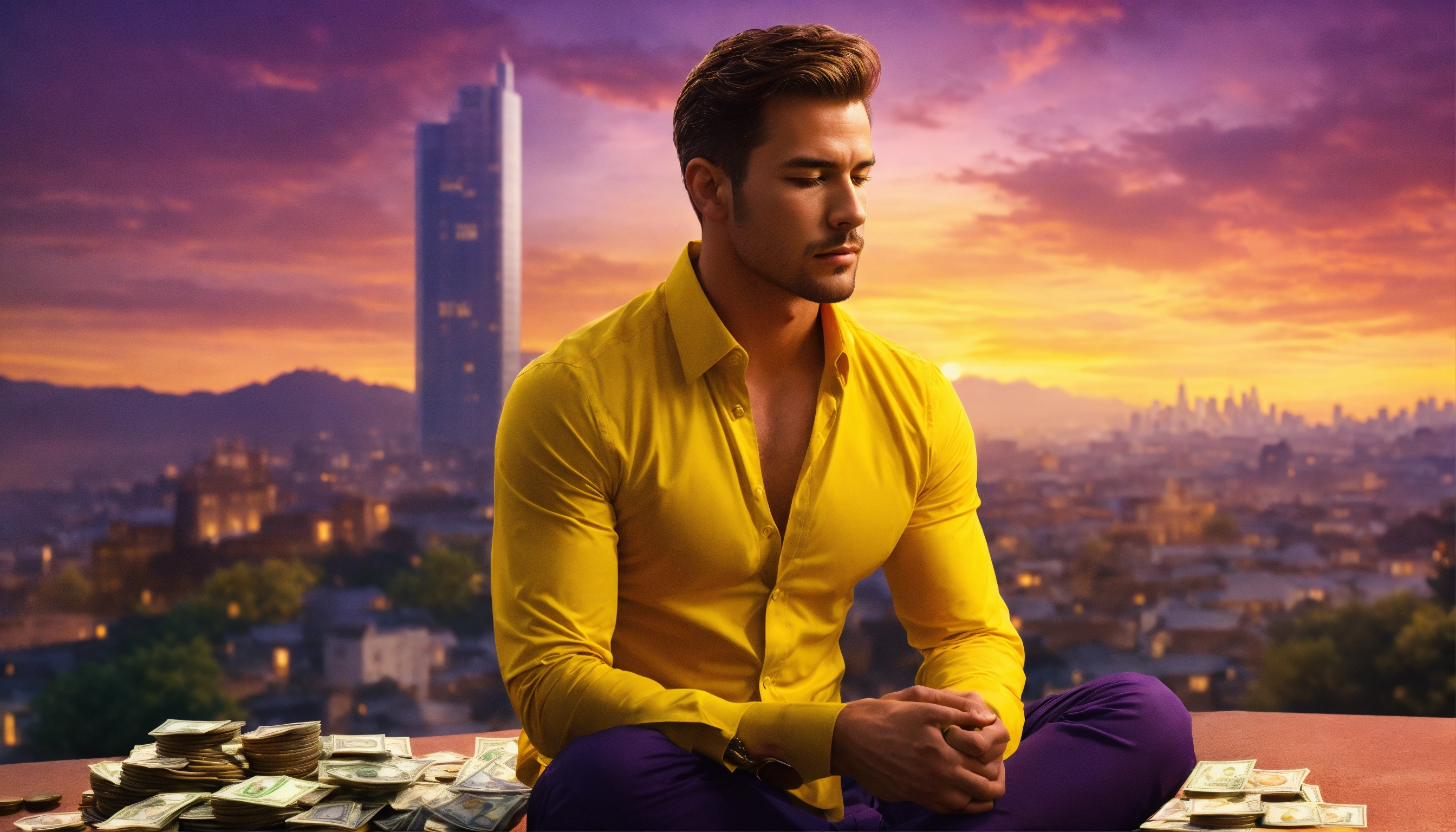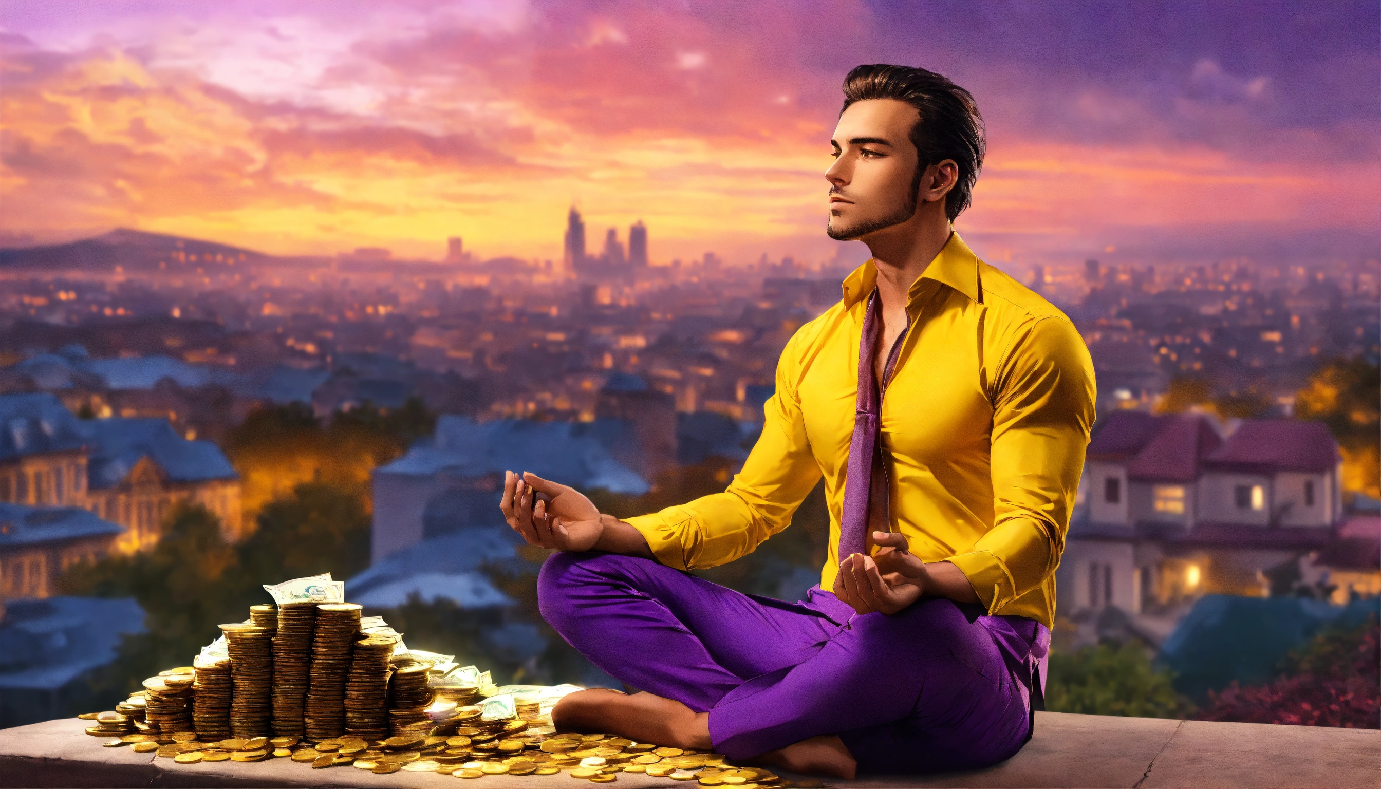 Handsome man, shirt unbuttoned, right yellow shirt, meditating, thinking about money, mansion in the background, cityscape, bright orange, purple and bright yellow sky, a pile of bank notes and coins next to him, 4k resolution, photo realistic