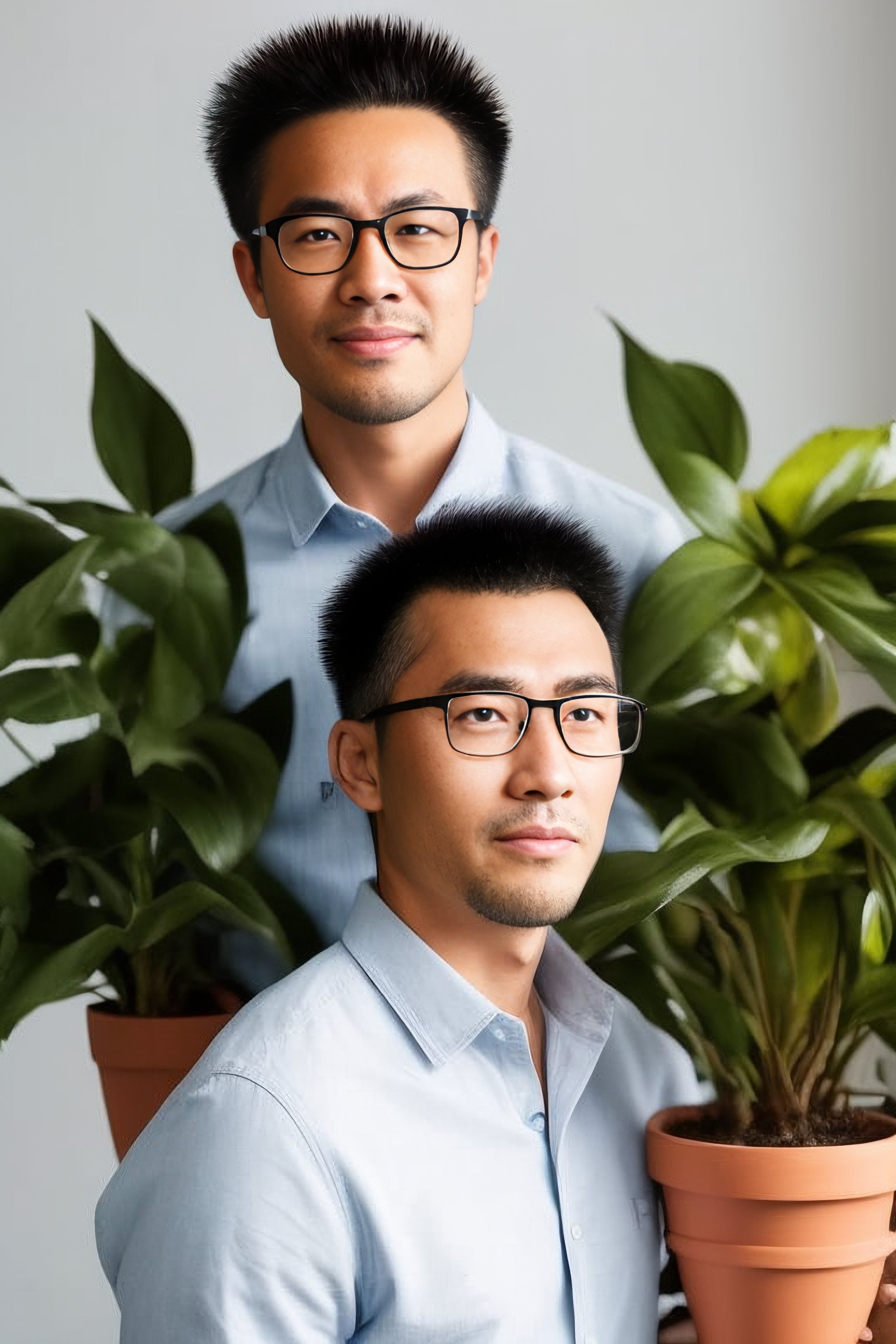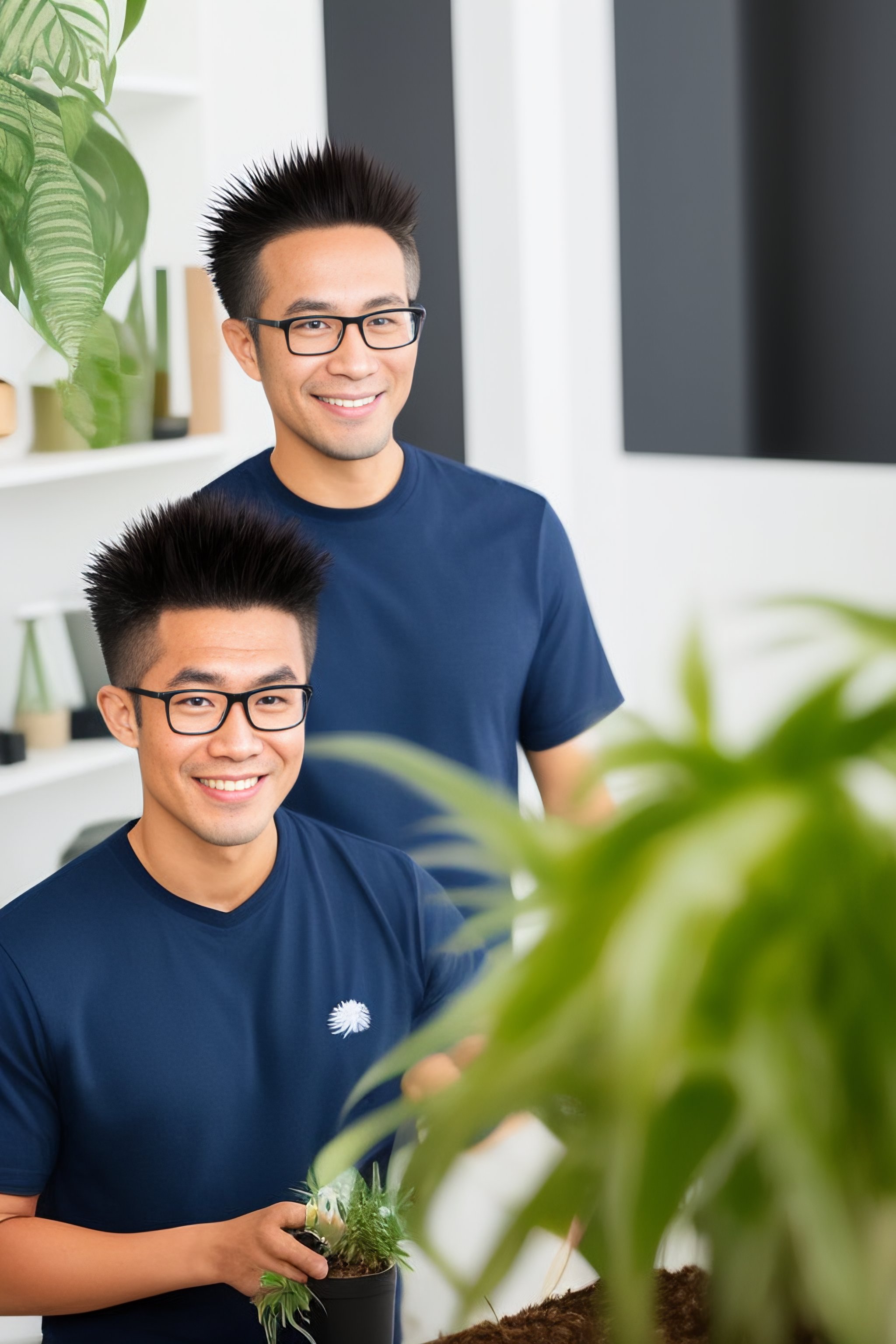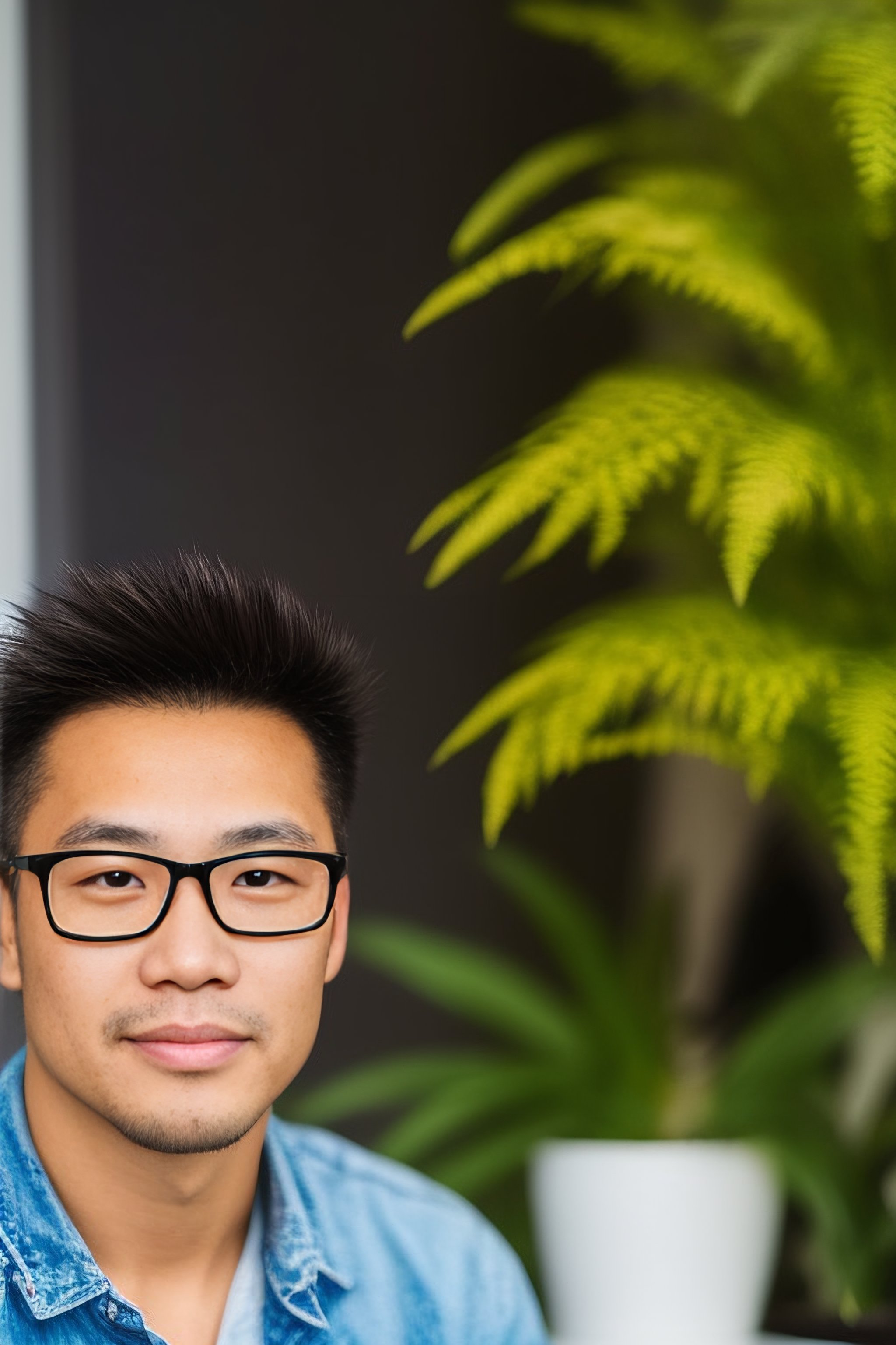 spiky hair with glasses with a houseplant