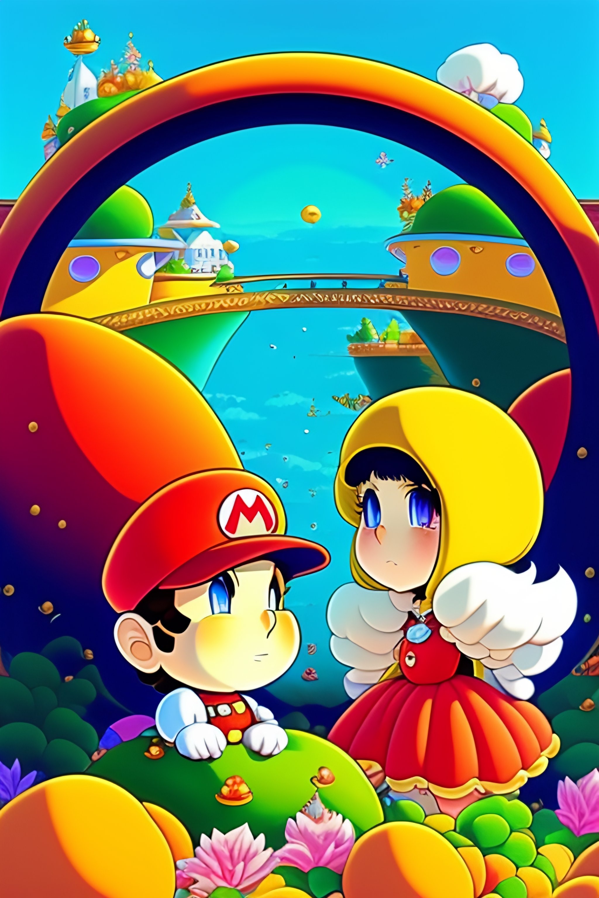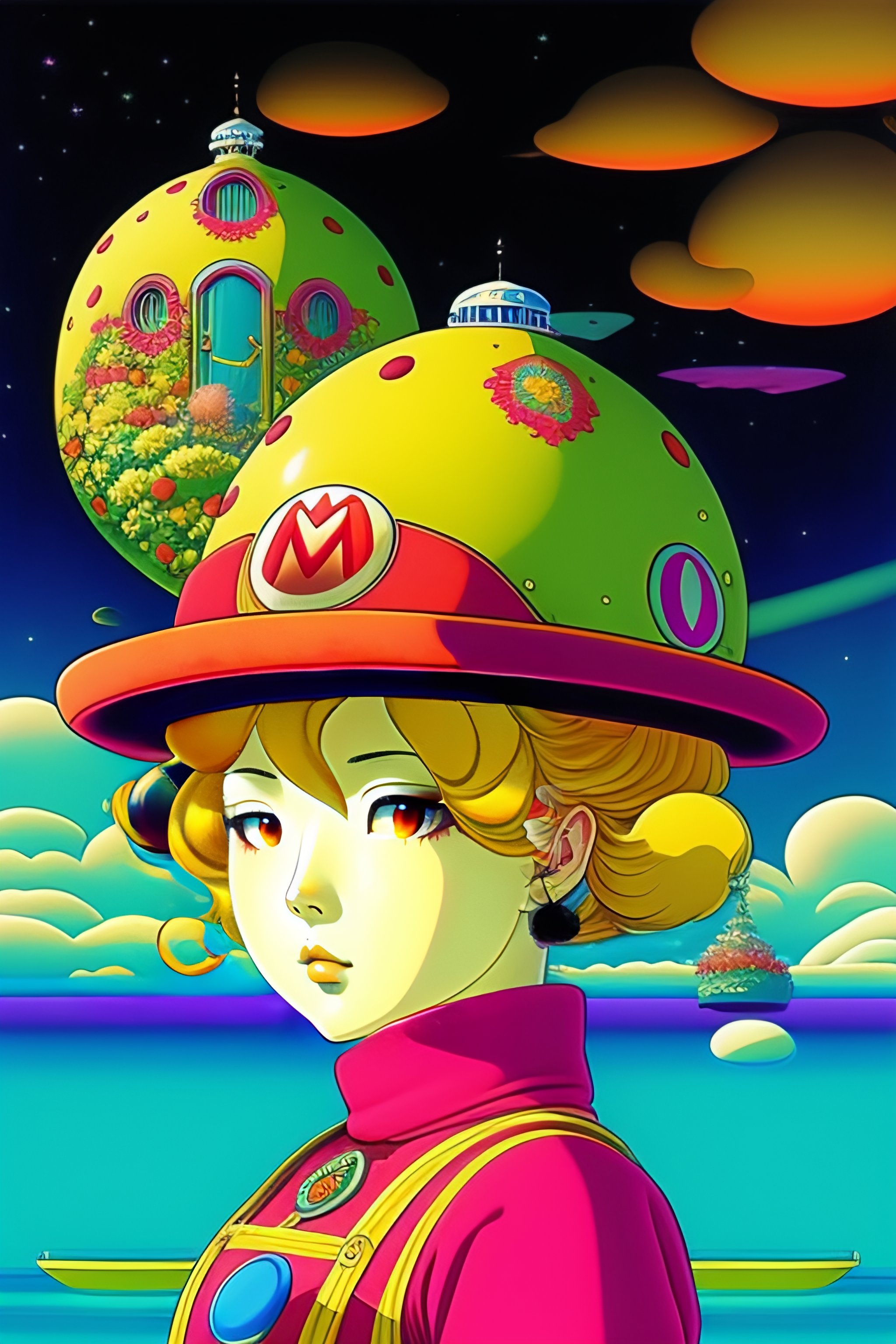 Mario bros chiho aoshima artwork, style of 90's vintage anime, surrealism, akira style. detailed line art, fine details