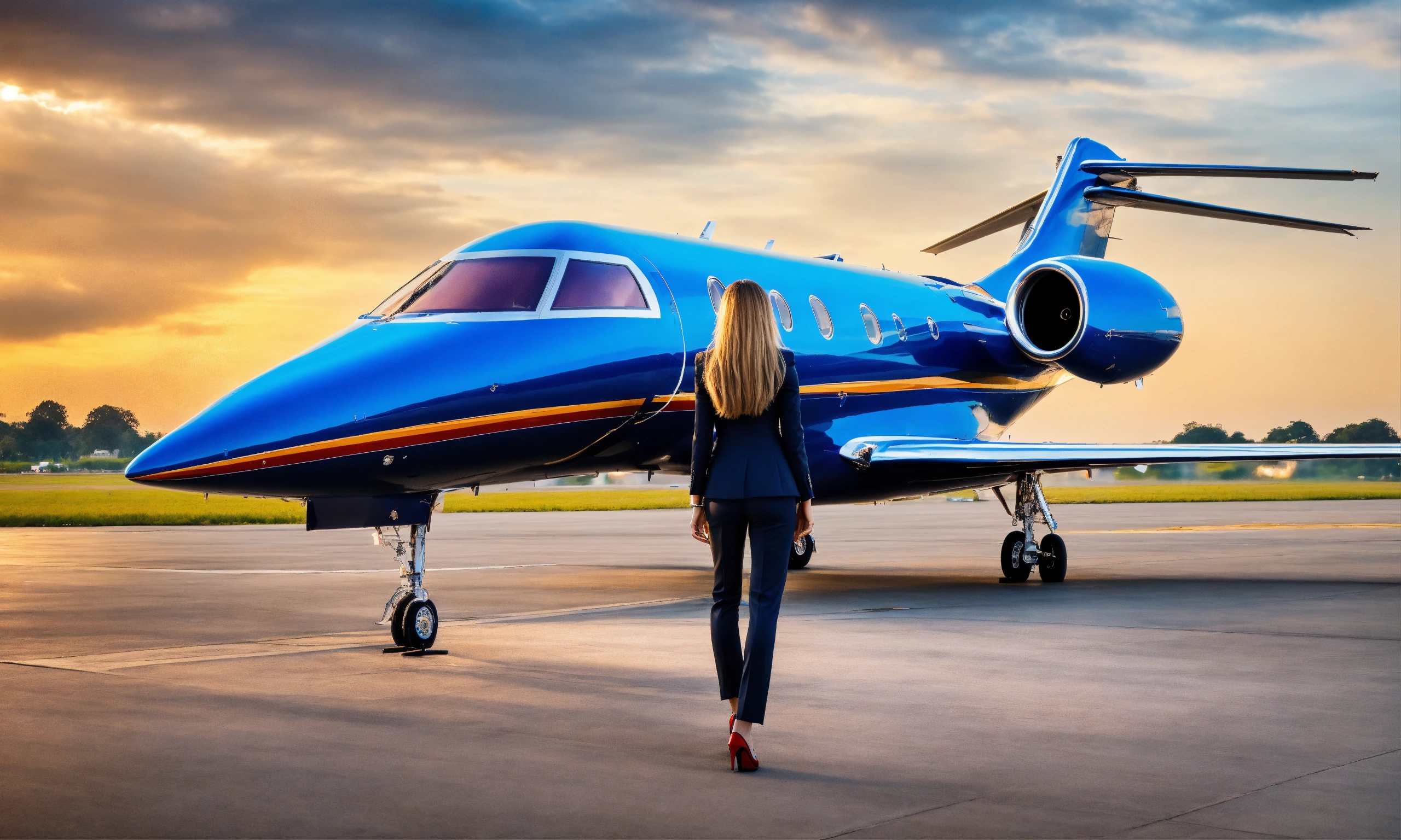 Cool businesswomen standing in the front of a modern private jet with the perfect modern stylish view, hands in the pants, colorful image, view a little be from the down to the up