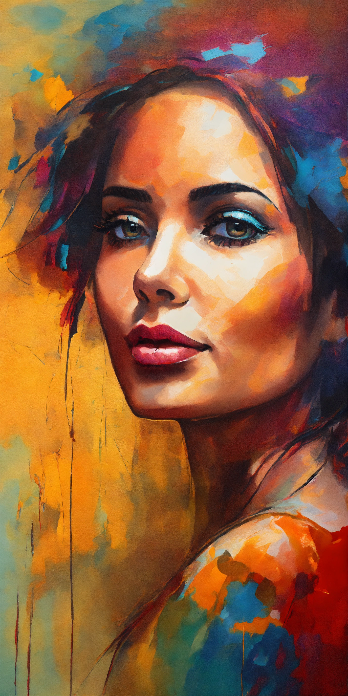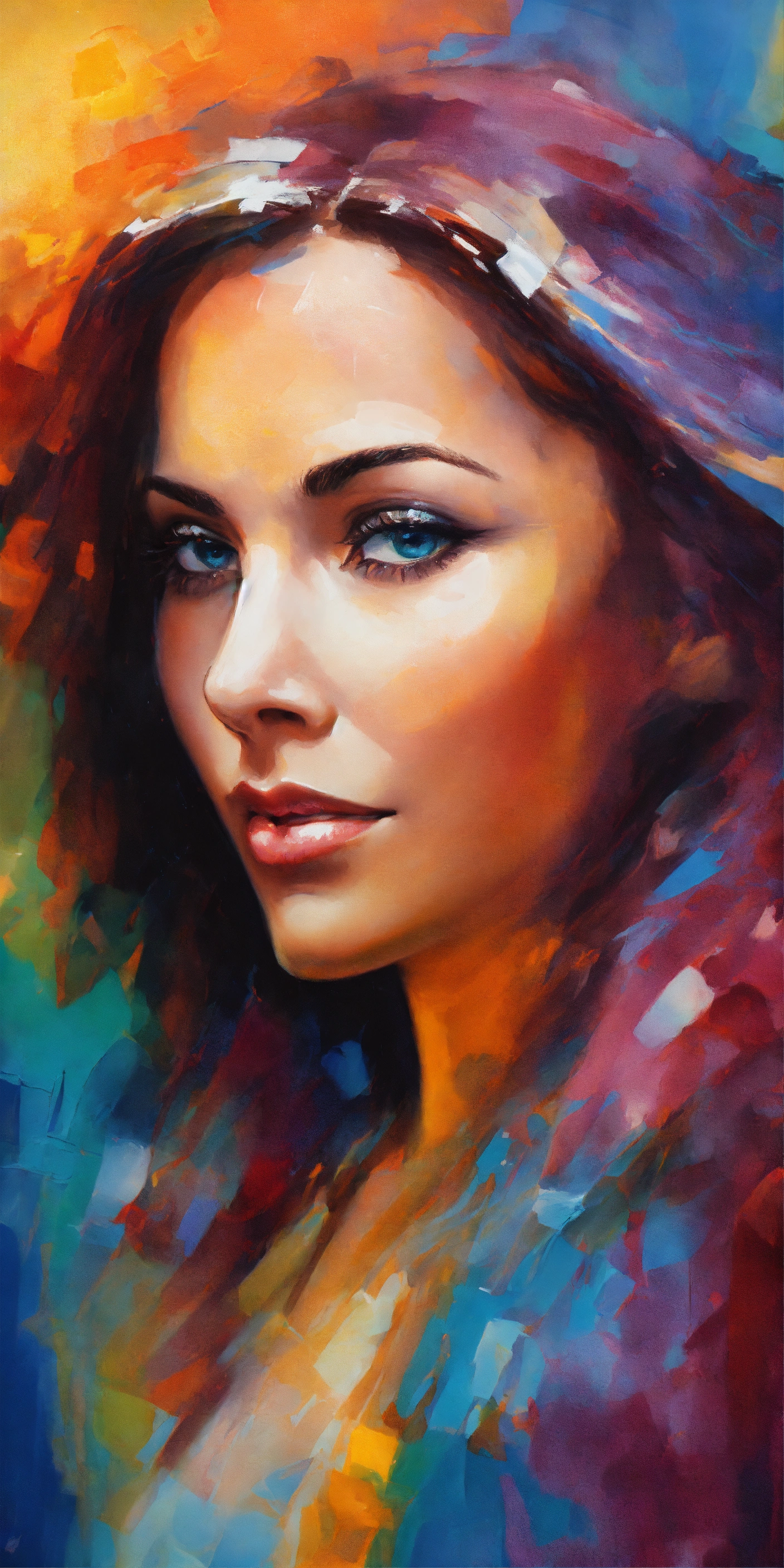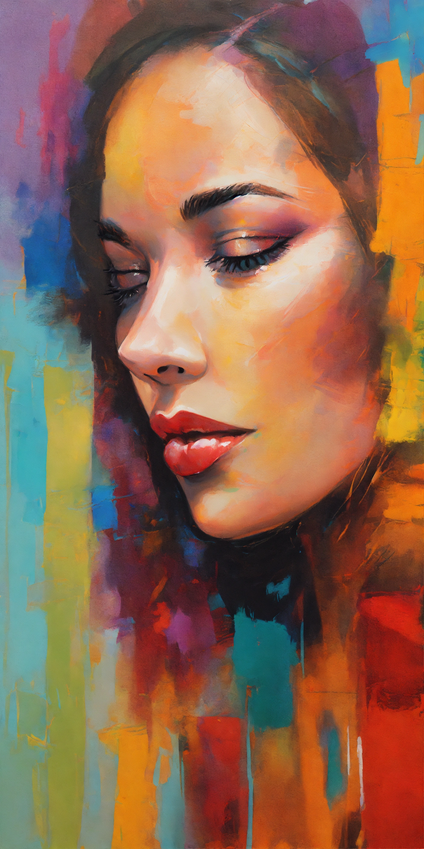Create a smooth colored background with a vibrant background style, "soulful pensive expressions" illustrate a spectrum of emotions through vibrant colors and expressive brushstrokes, woman 40s