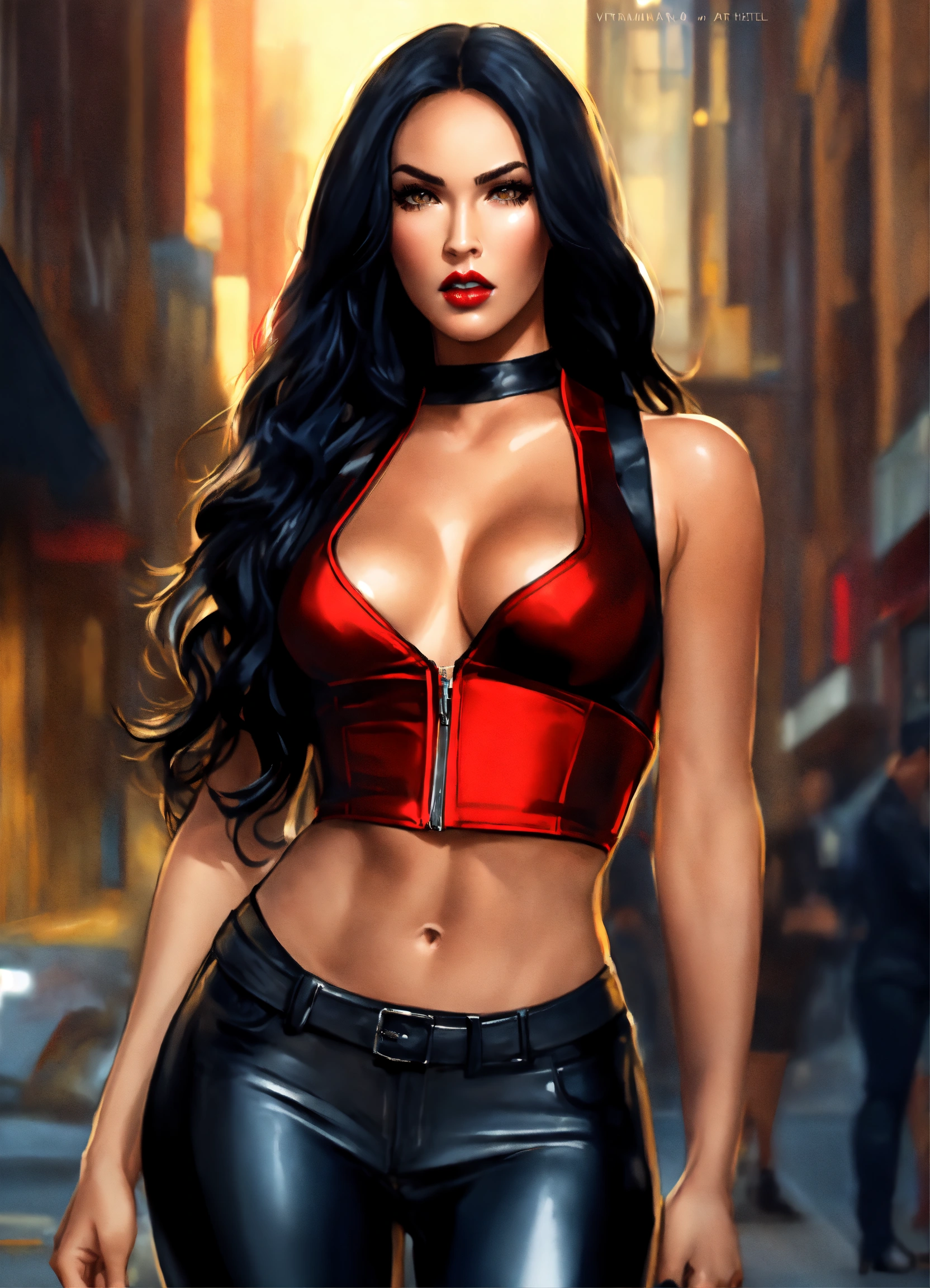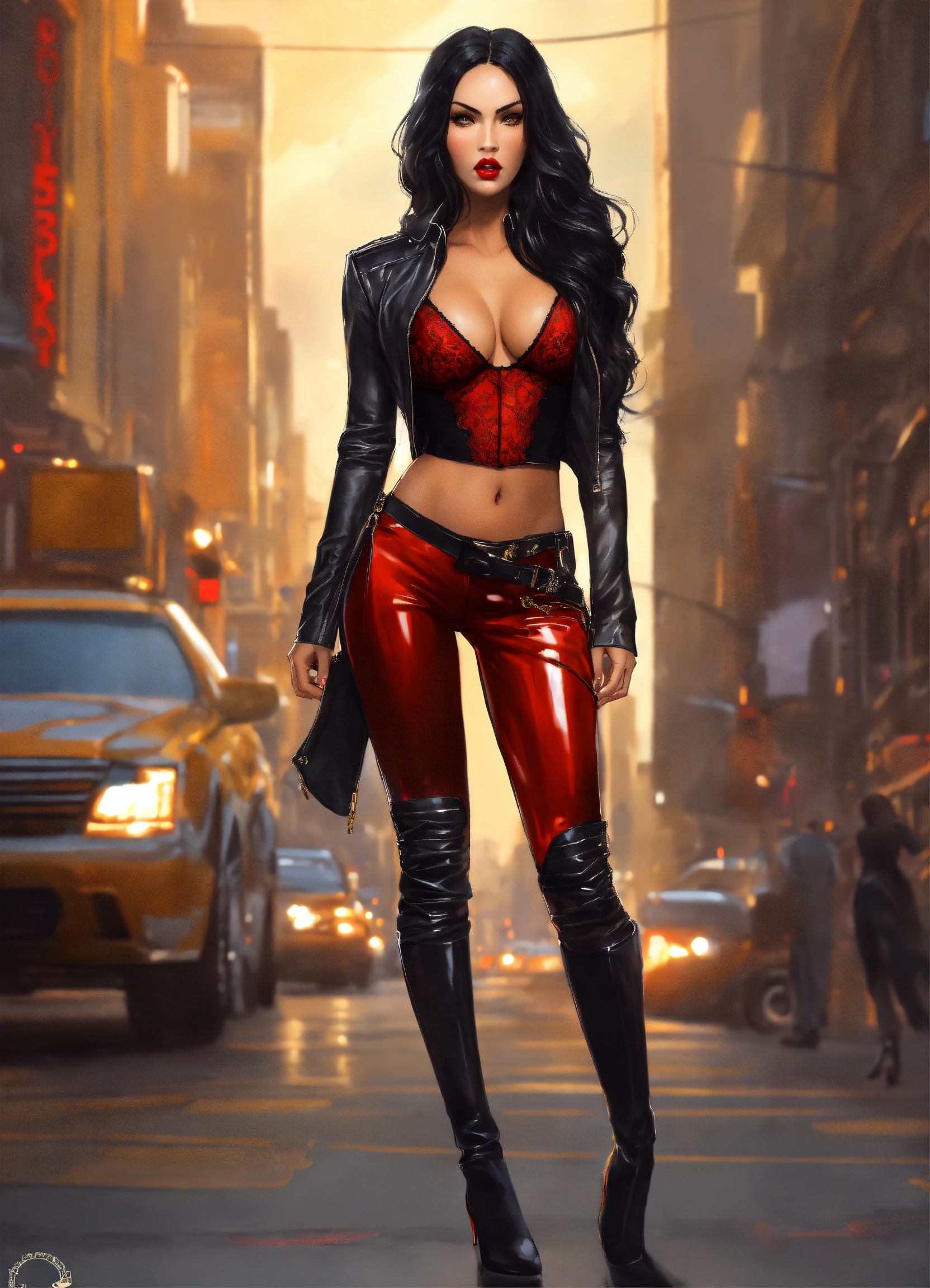 Concept art of beautiful woman, megan fox, tan skin, realistic, gold eyes, very long waist length long curled black hair, sabine rich, artgerm, j scott campbell, artgerm, full body, perfect body, black tight fitted leather jacket, detailed, intricate, beautiful, very low cut neckline, fitted, tight black pants, knee high black tight fitted stiletto high heel boots, round face, slim nose, long black eyelashes, red lips, perfect detailed face, realistic, cinematic, full body, low cut black lace crop top, very long loose curled hair, honey birdette, black lacy crop top, victoria secret top, attractive, lace, nightwear, yandy, black lace, honey birdette outfit, tight fitted, voluminous long flowing dark black hair, red honey birdette crop top, bustier, tight black pants, knee high boots, city background, fitted, shimmer lace, baddie, selina kyle, honey birdette top, leather heel boots, mazikeen smith outfit, standing, lace bodysuit, walking down street