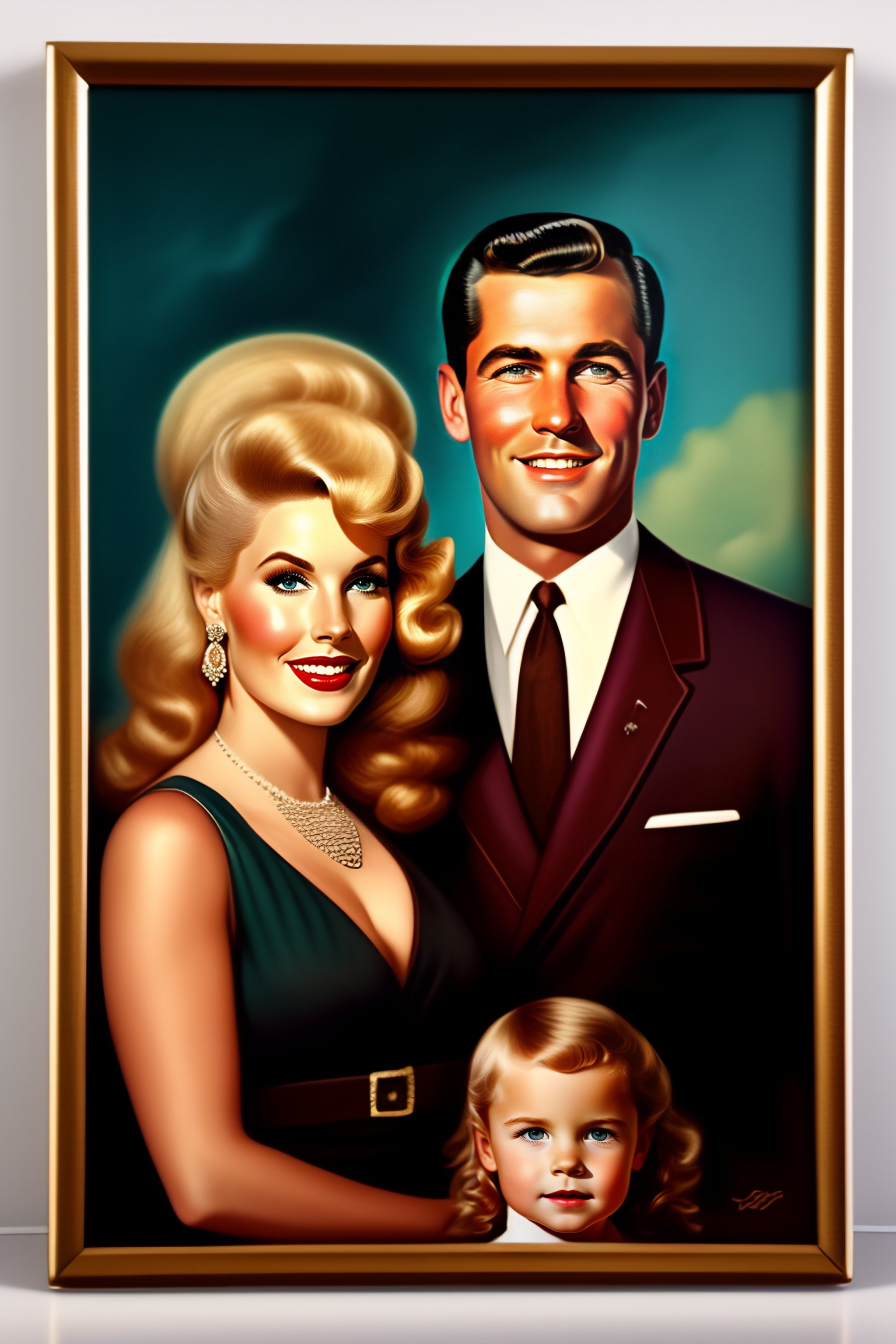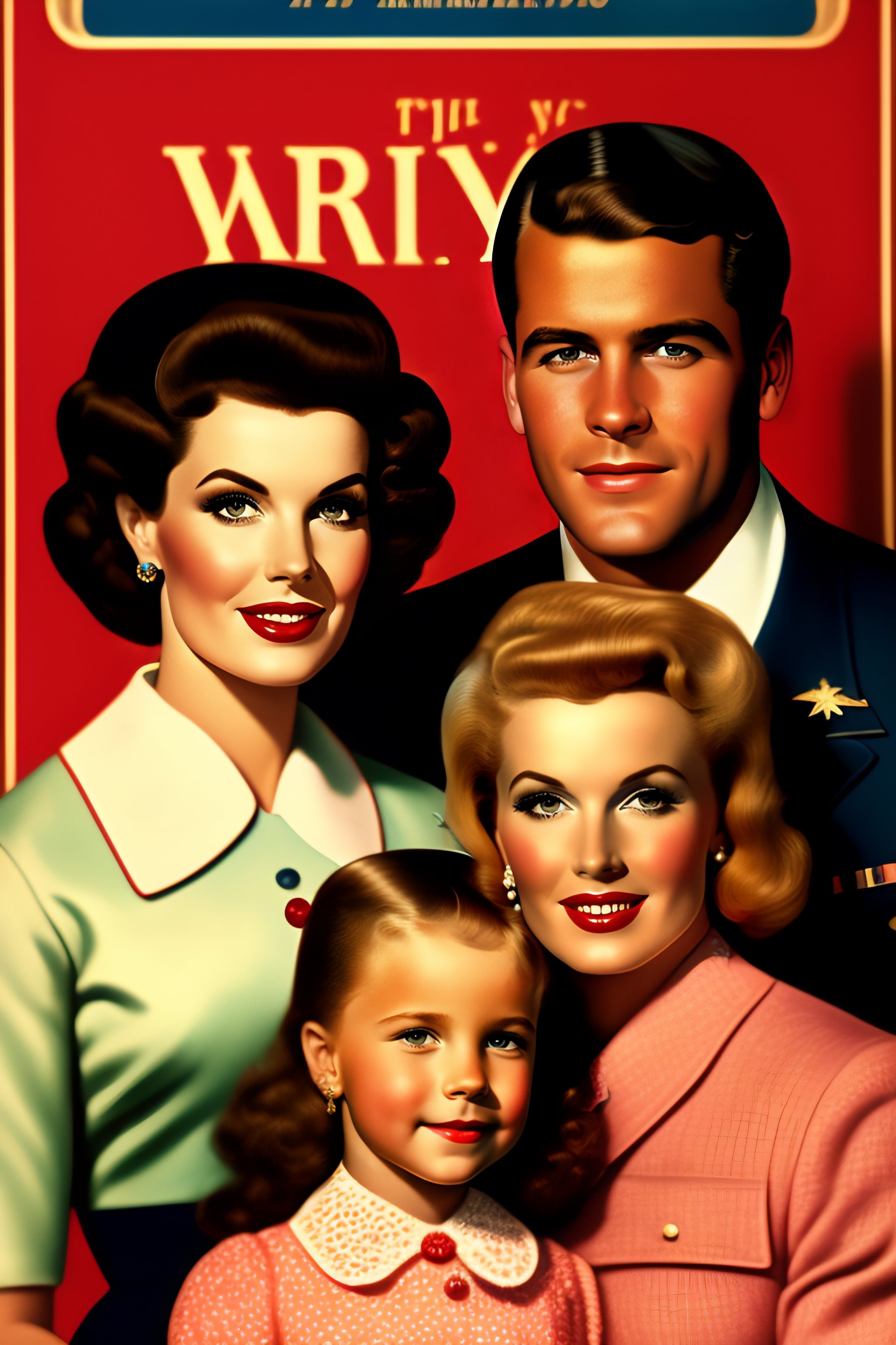 Portrait pin up advertisement of a traditional american family from the 60s