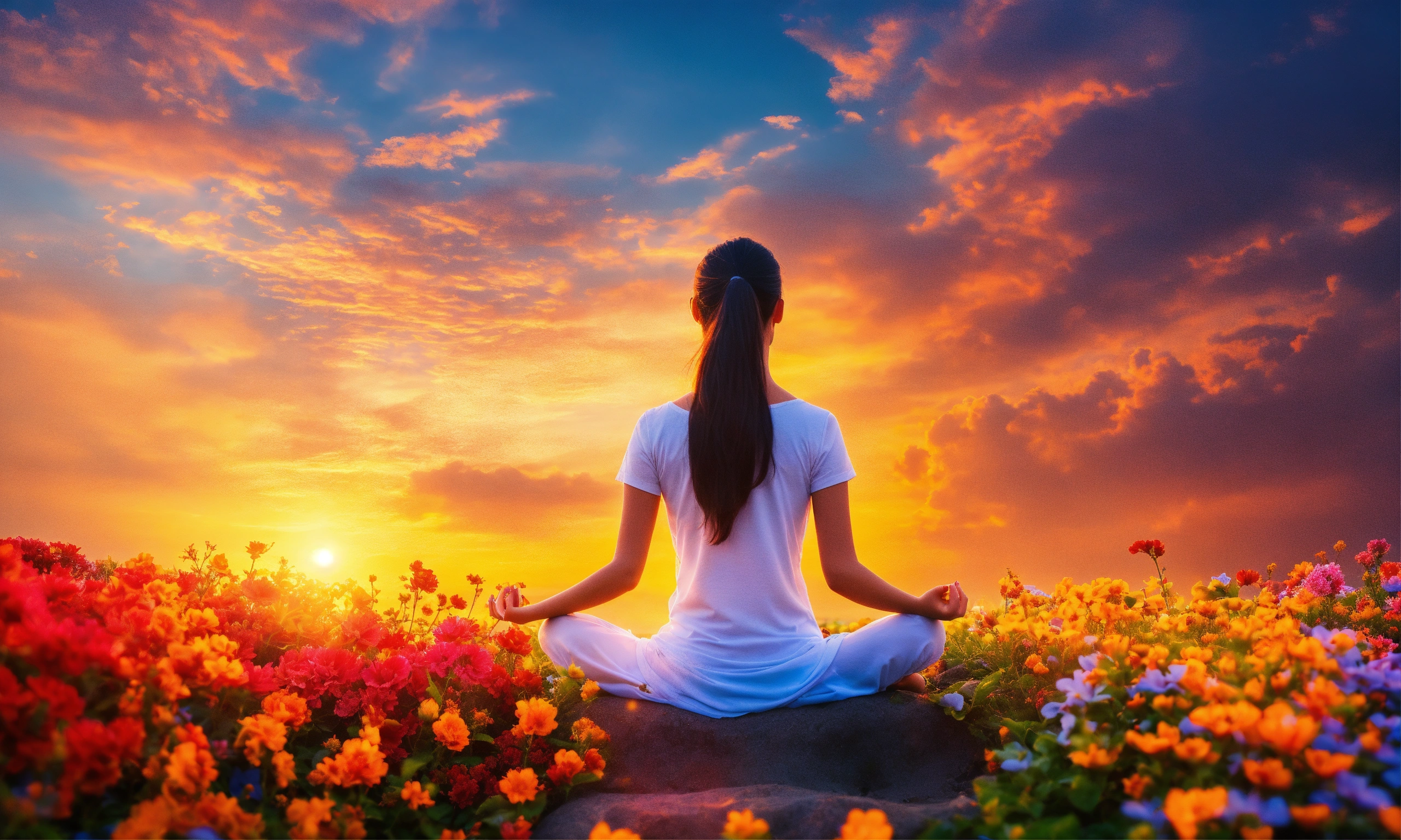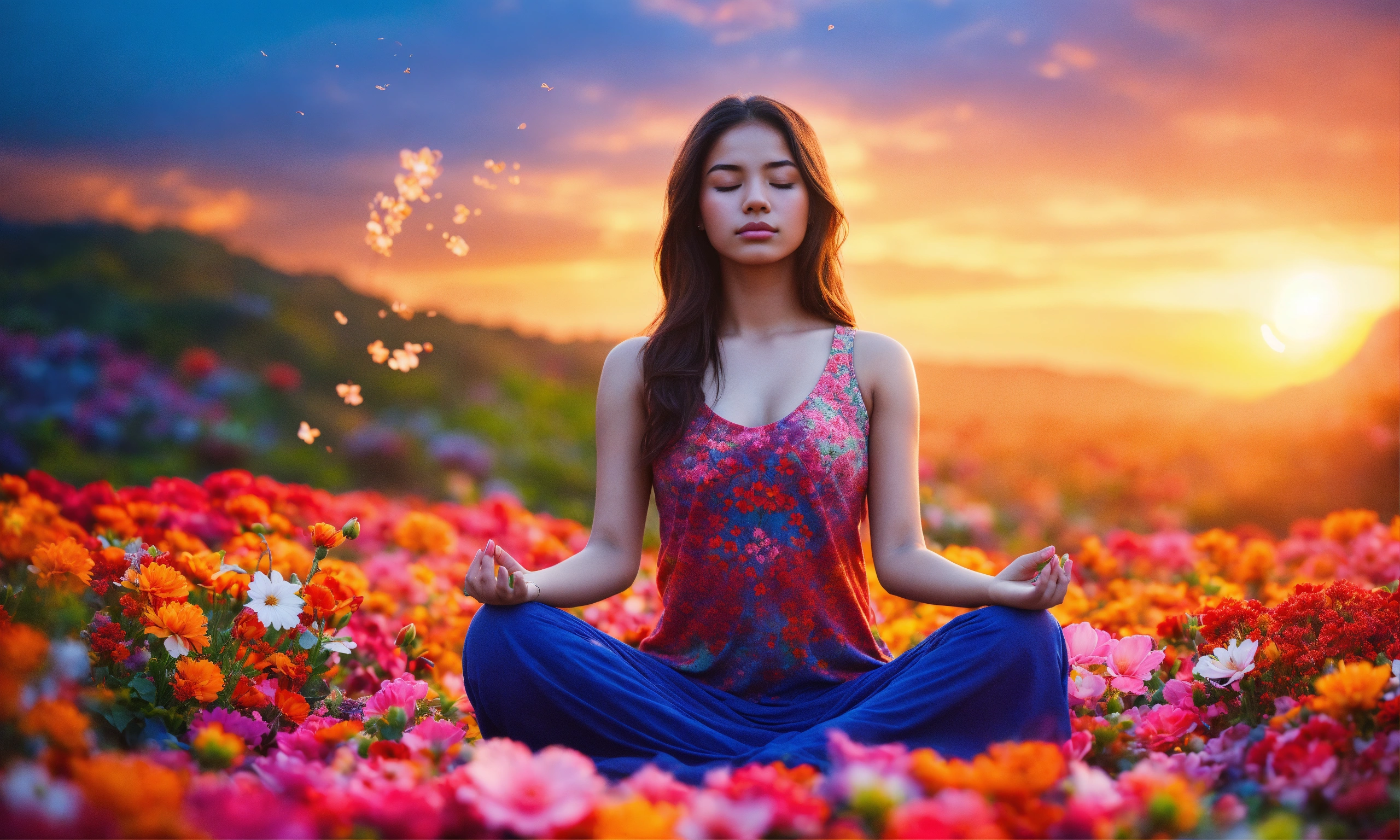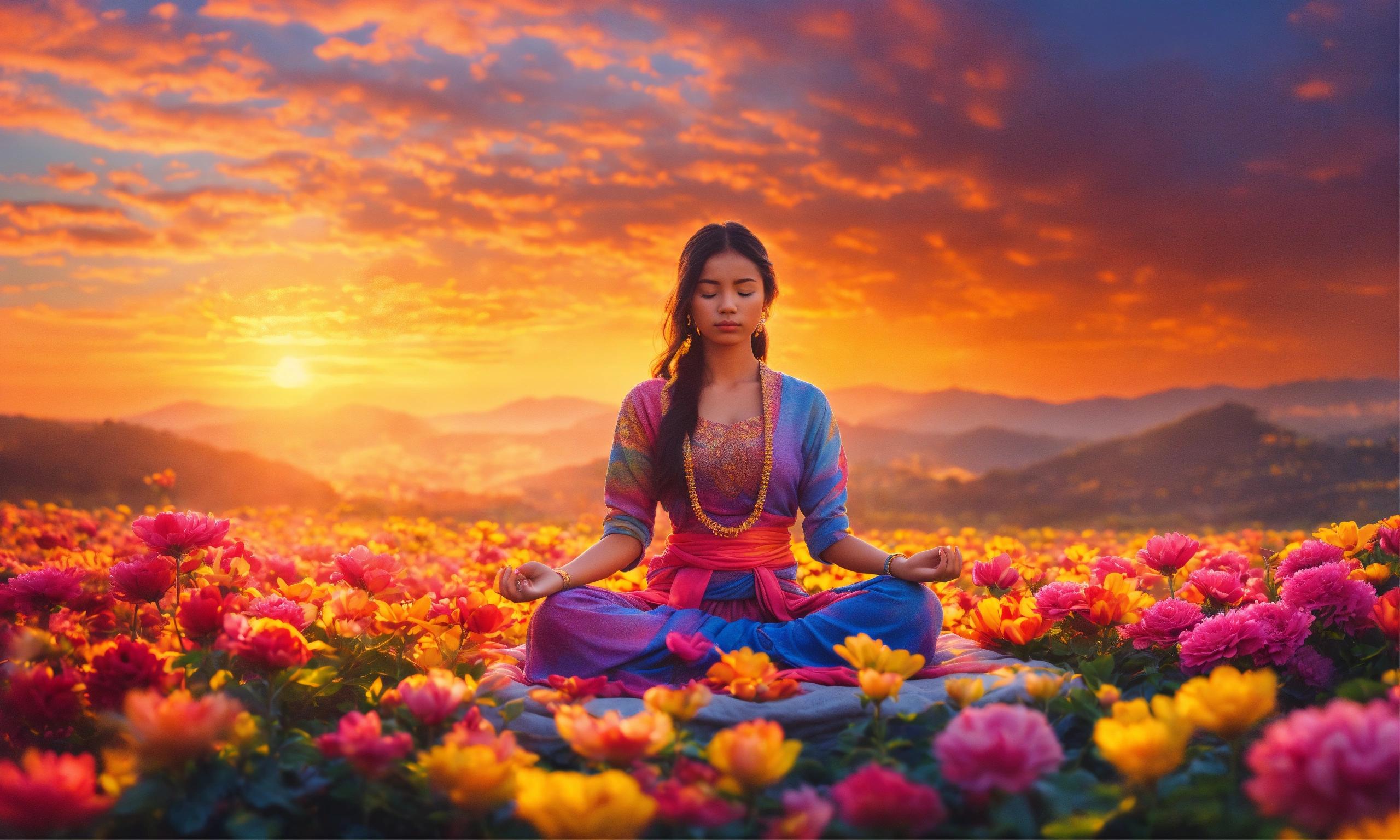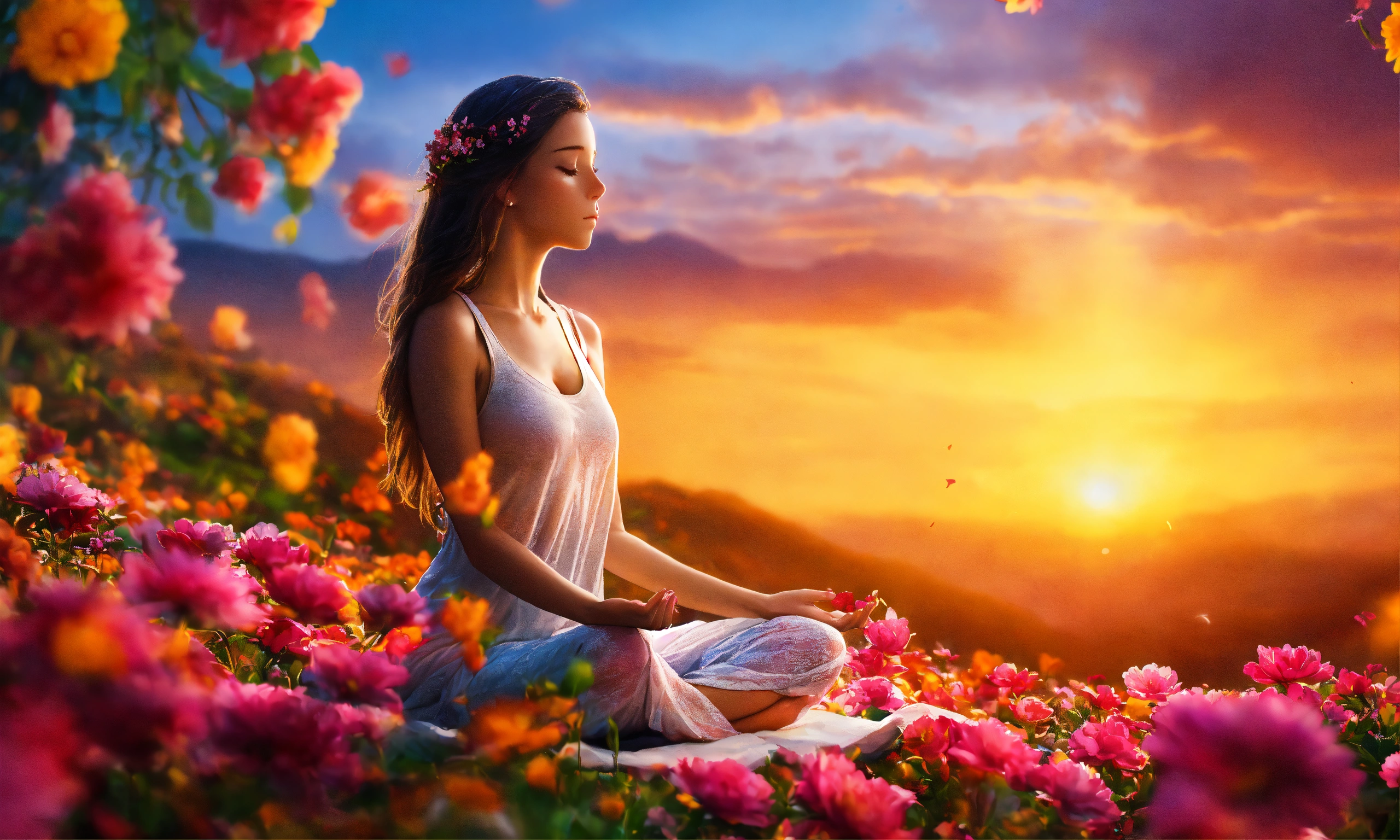 A beautiful girl in meditation (a vibrant light covering this girl's body) surrounded by vibrant flowers and mesmerizing sunrise