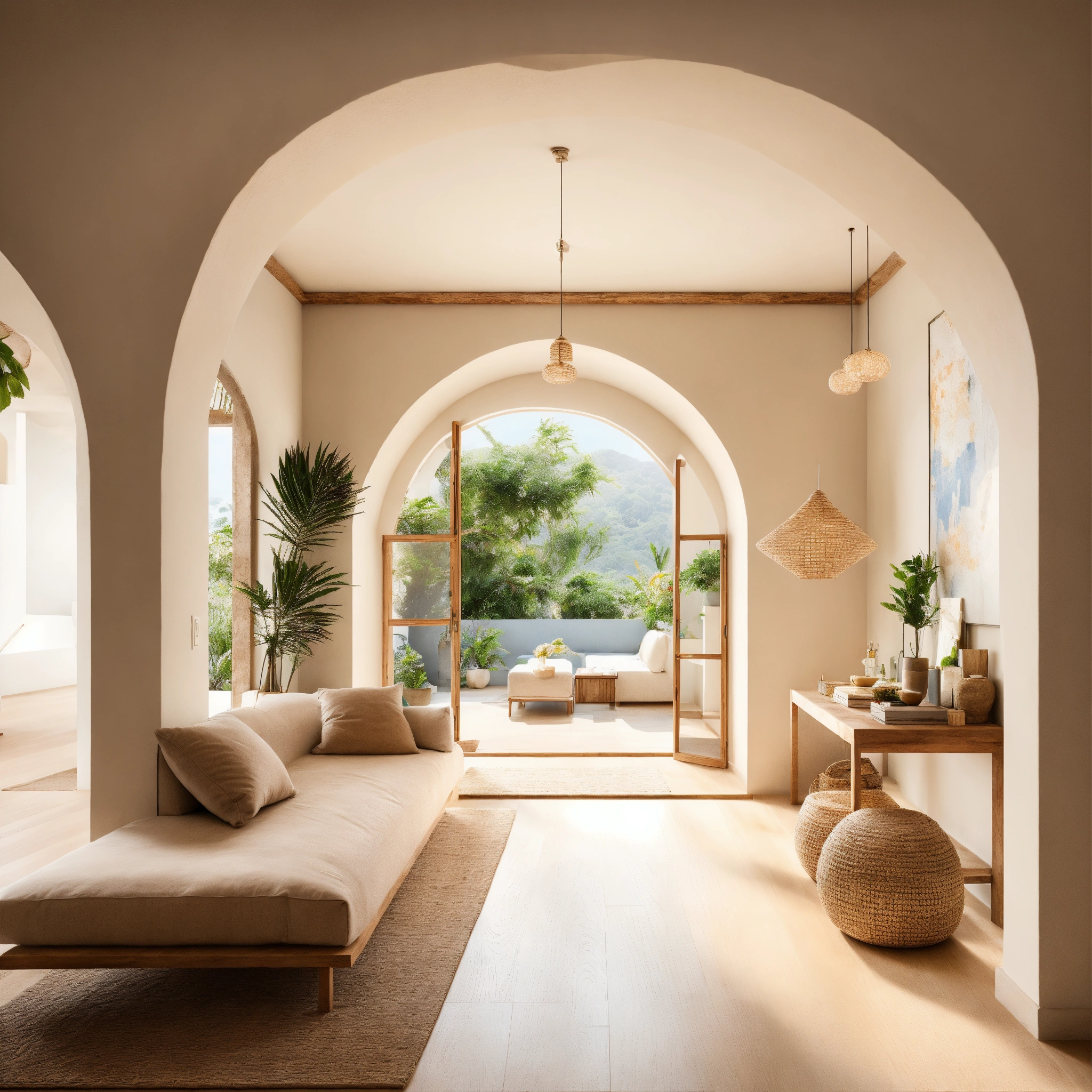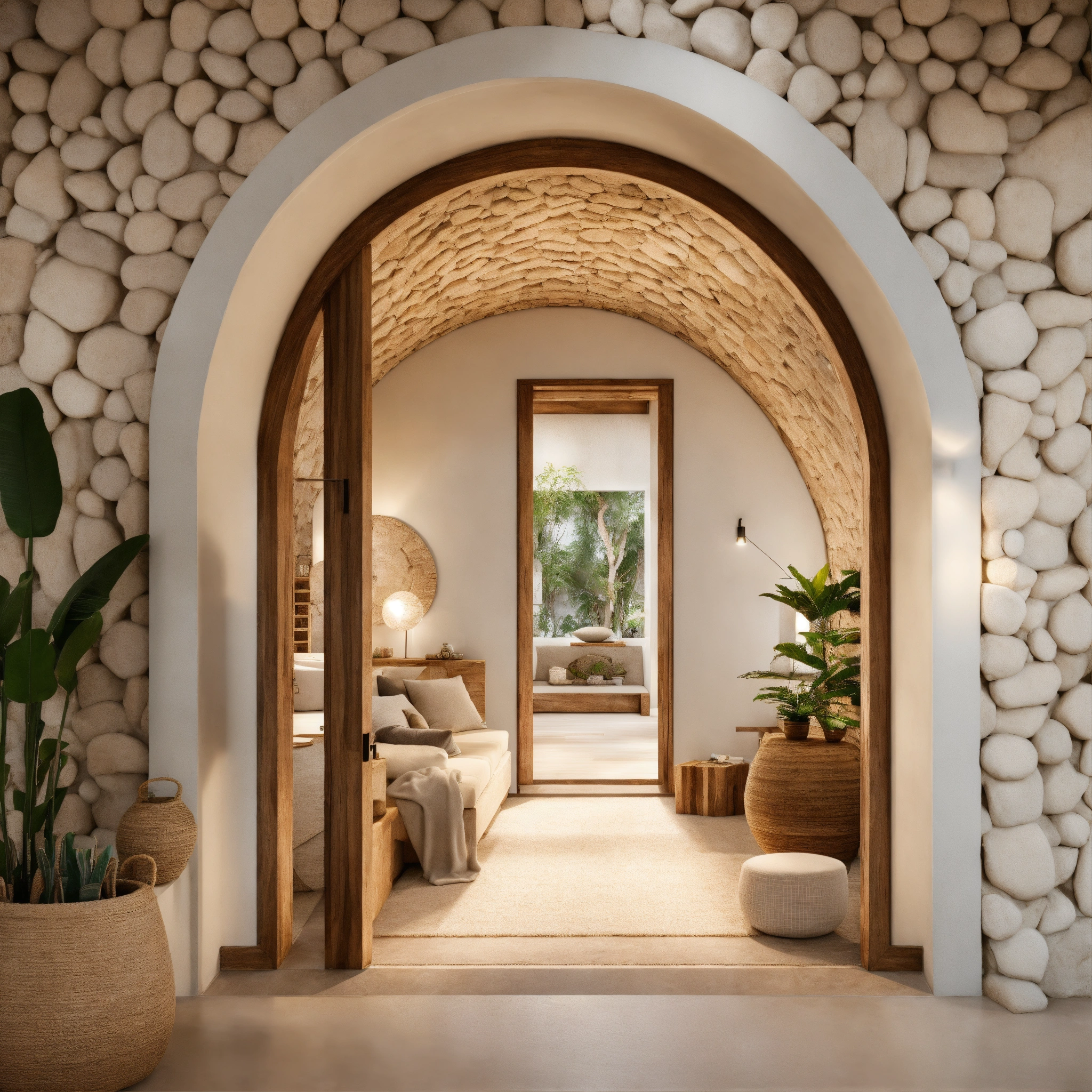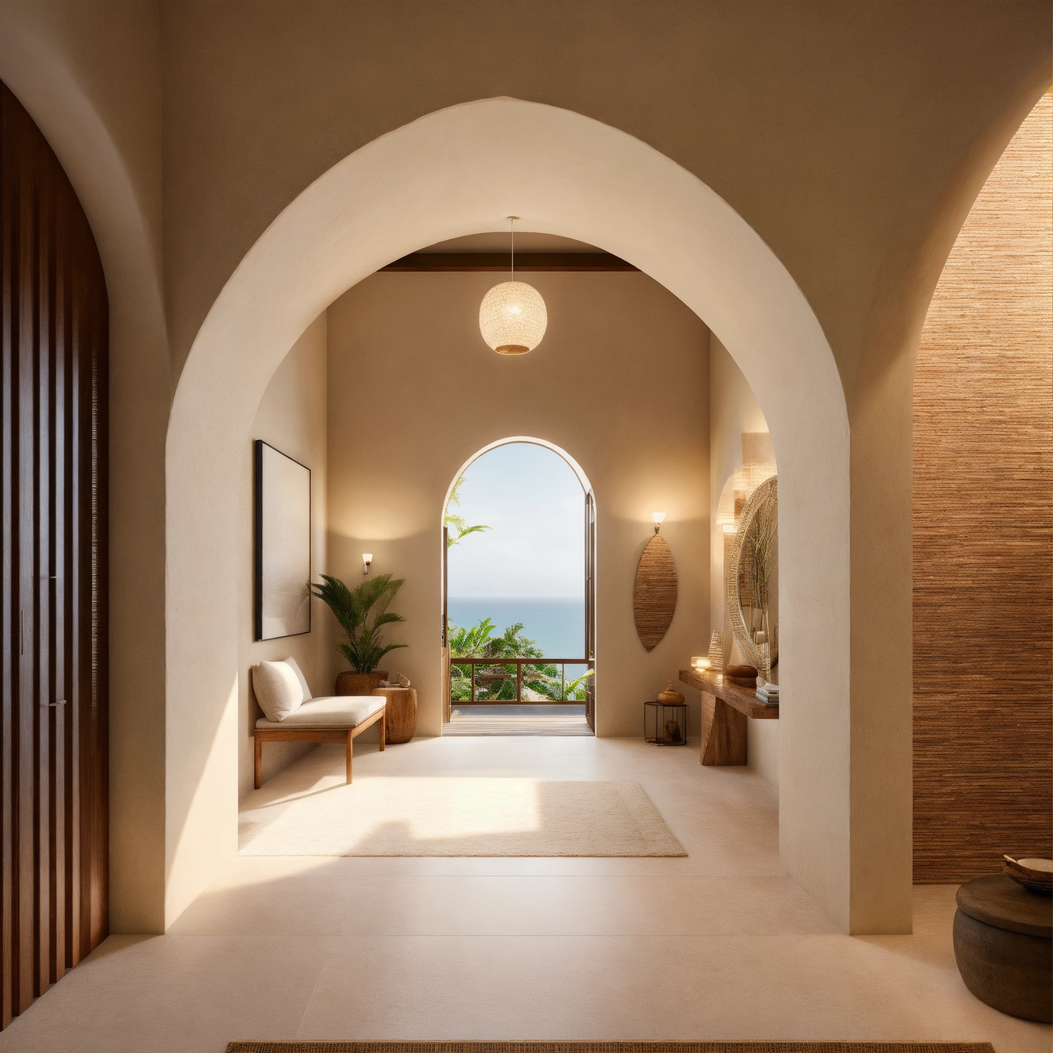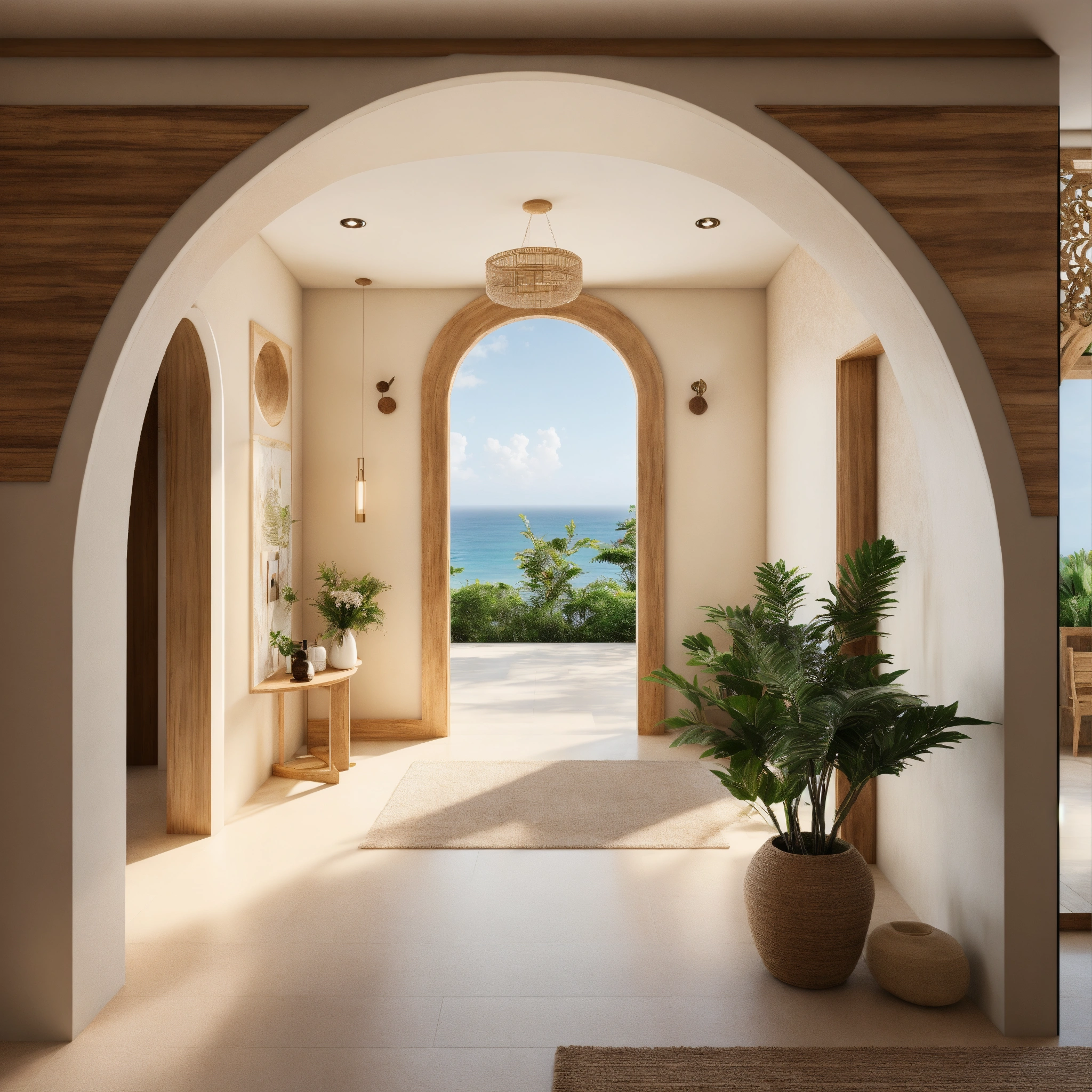 Ultra realistic photo of modern take on bali inspired low ceiling small apartment white cream stone, light wood round arches interor view of entry way