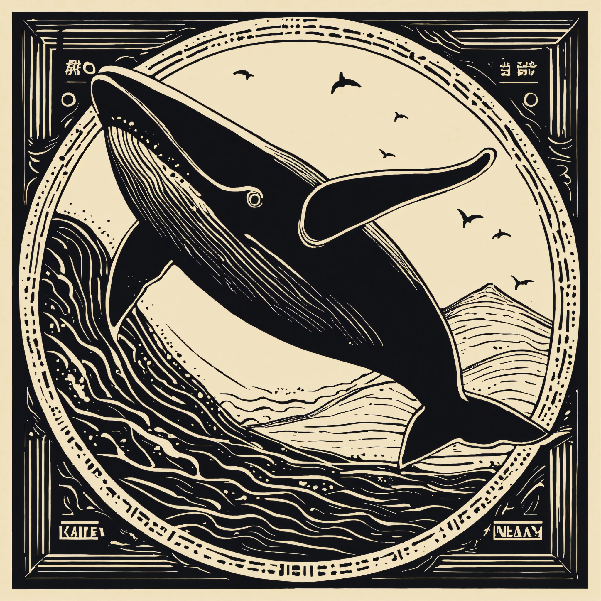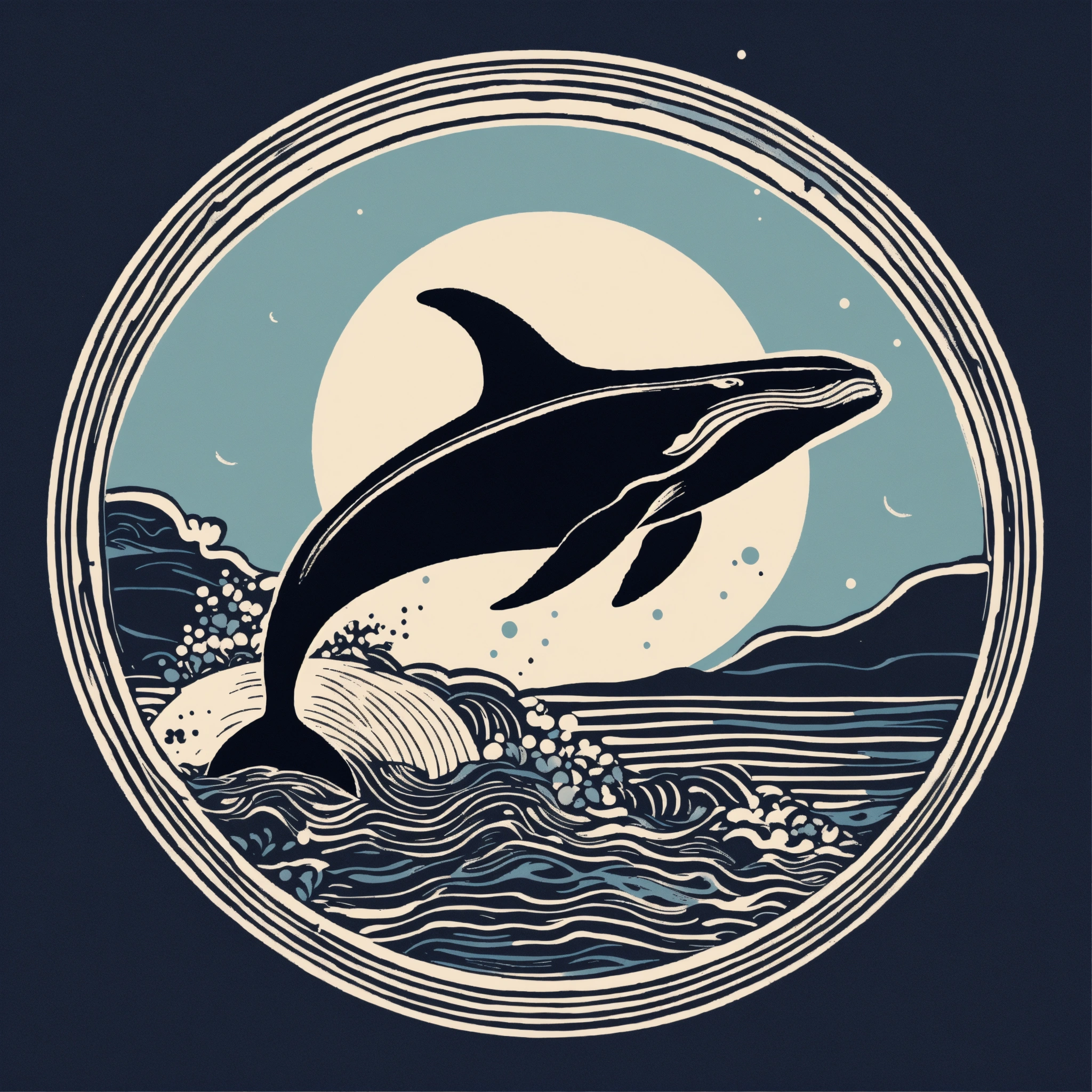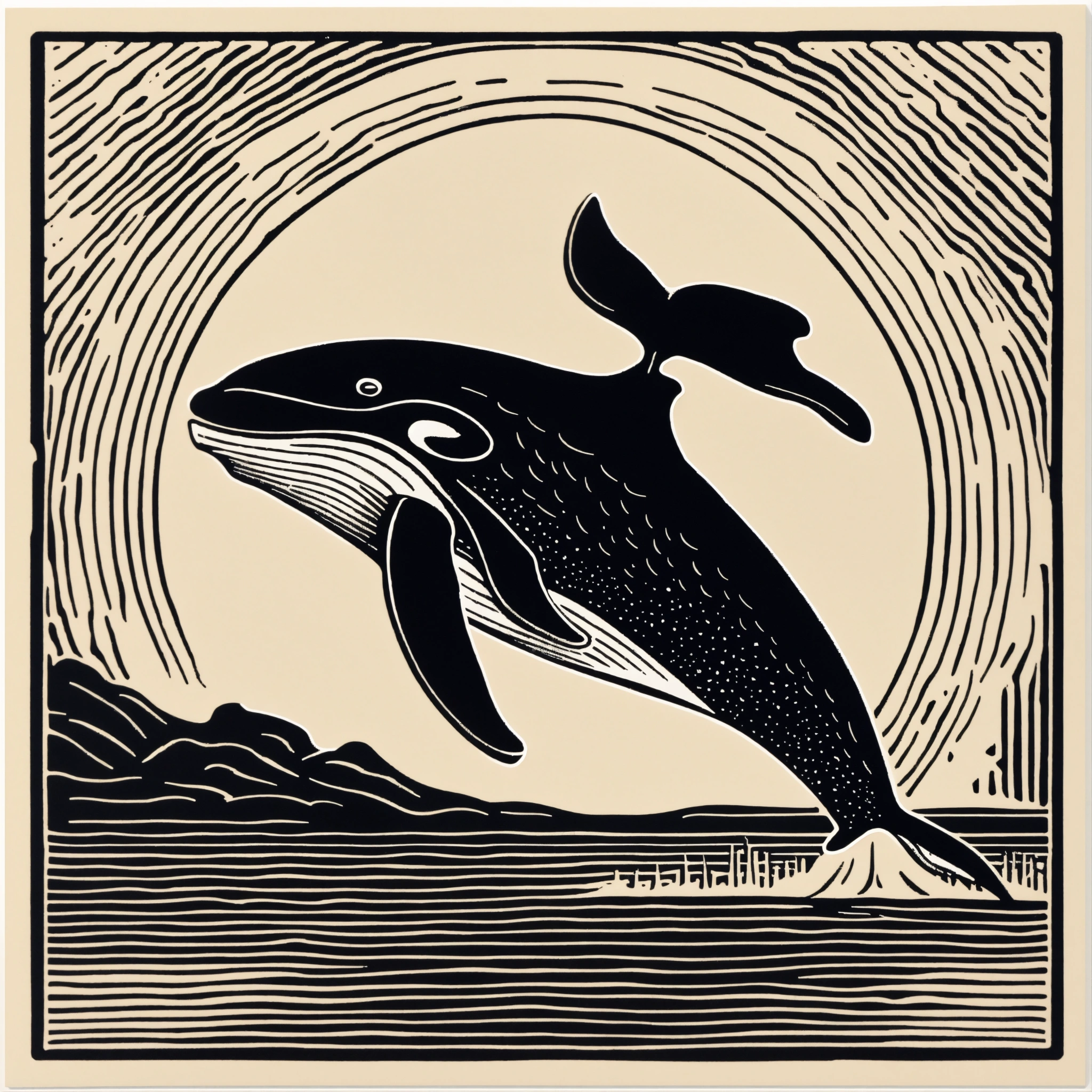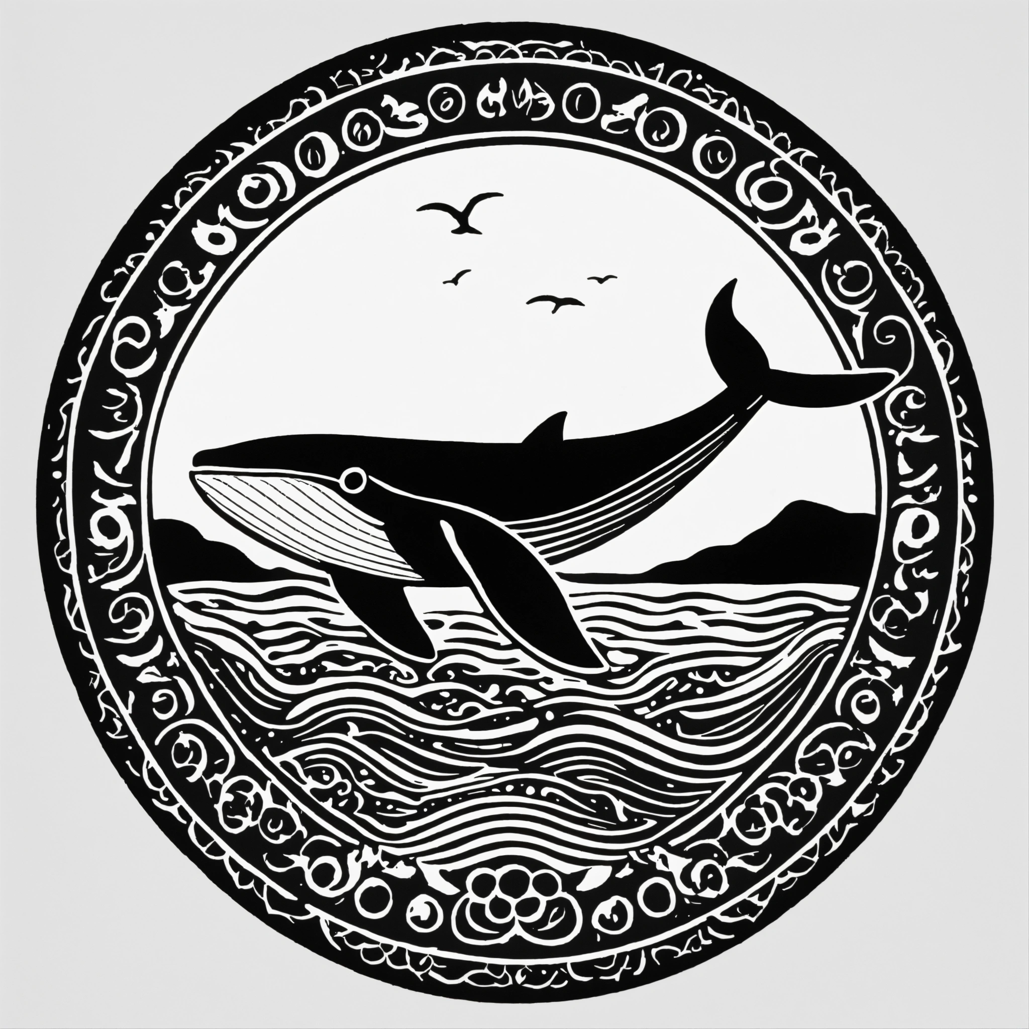 Minimal small linocut of a whale, stylized, black and white, stamp, vector, white background, circle frame, style of kathleen neeley, extending outside frame, clean background, simple, clean lines, cutting style, blank ink, vector, blank background, unique, creative, white background, woodblock, sticker