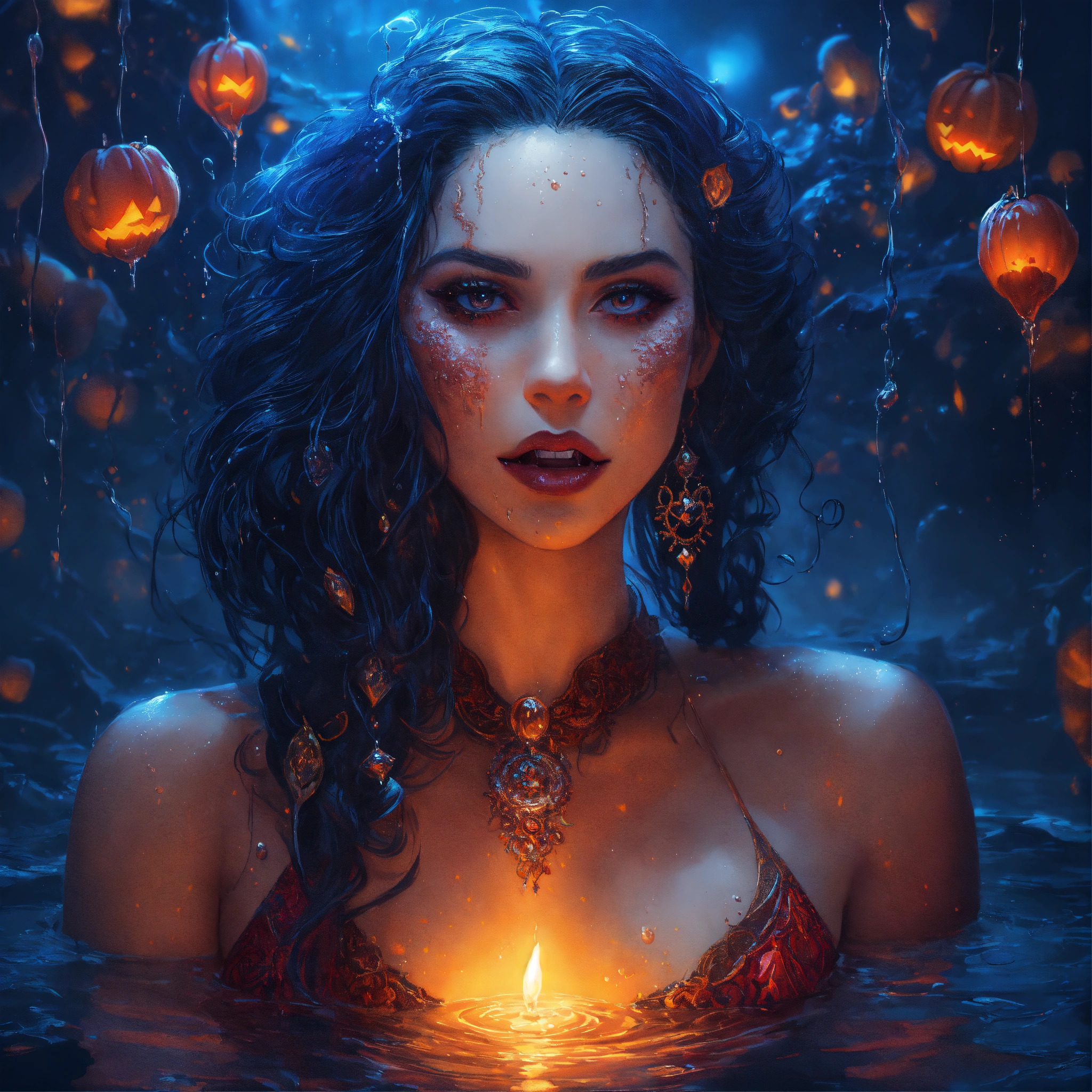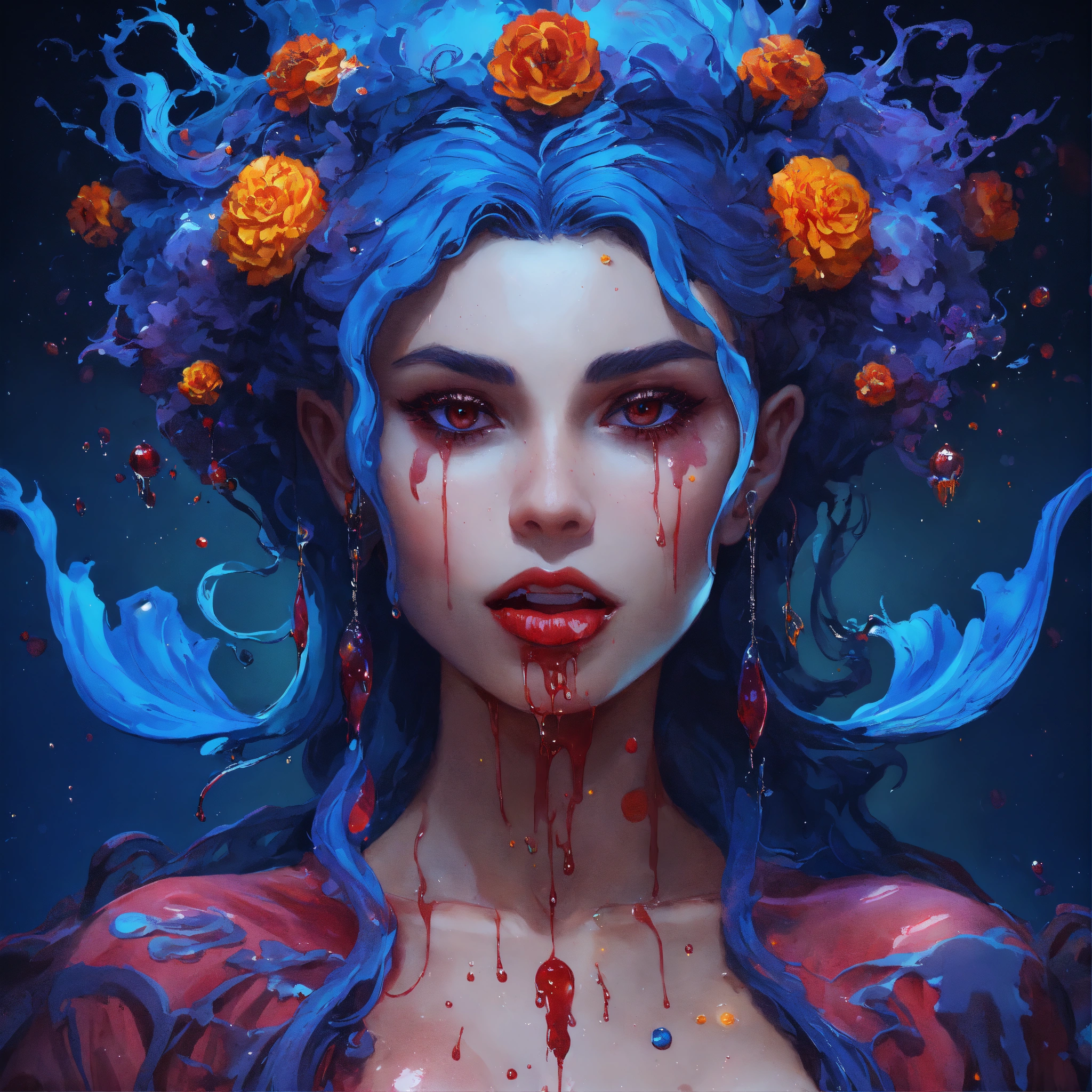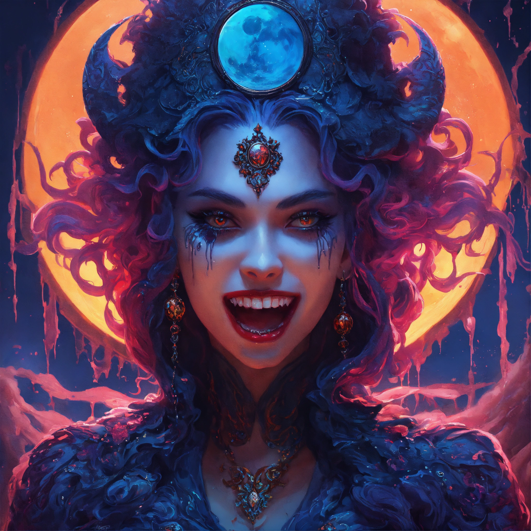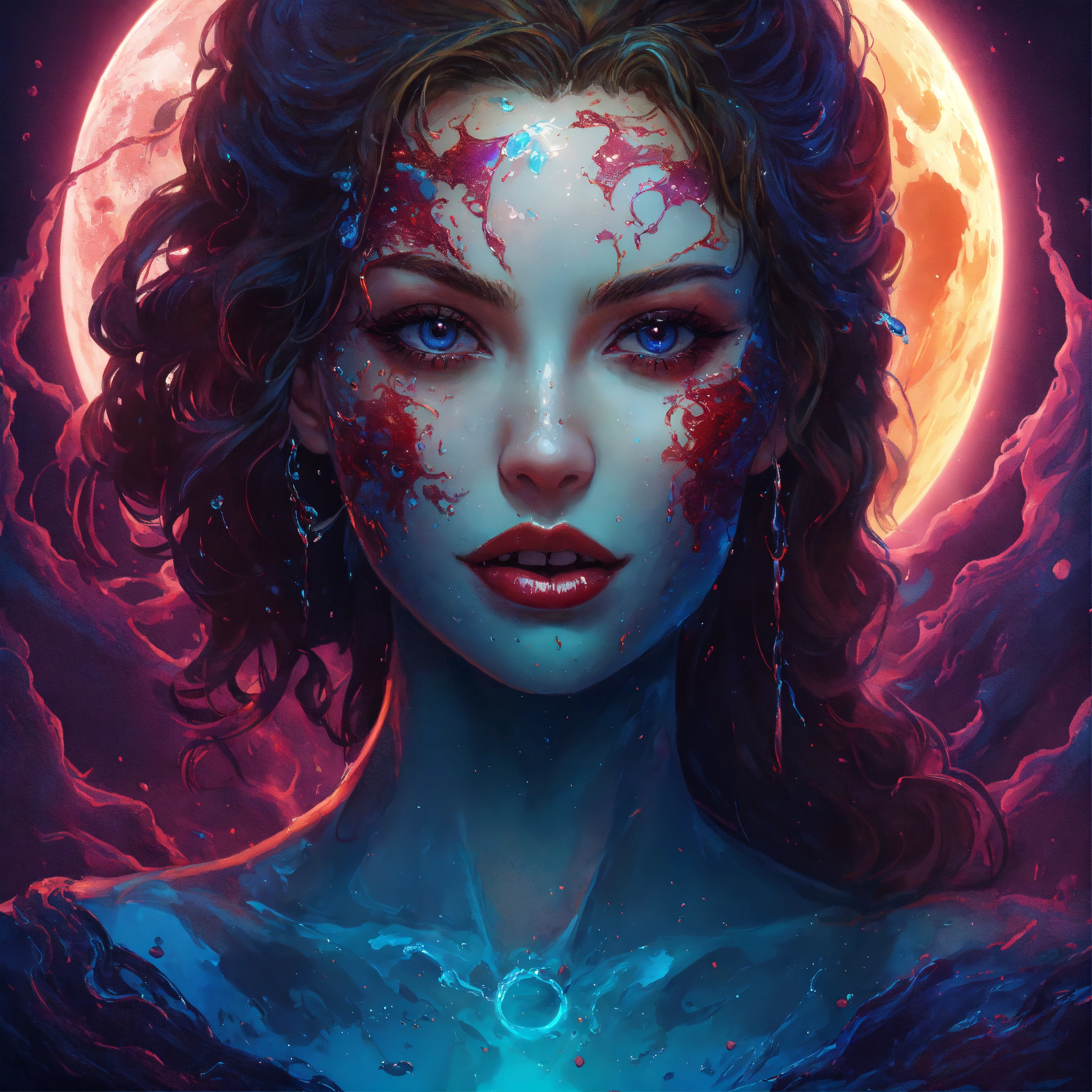 Splash art, a quirky liquid portrait of a hauntingly beautiful vampire woman with fangs, splash style of paint, pixar style, halloween colors, hyper detailed intricately detailed, fantastical, intricate detail, splash screen, liquid, gooey, slime, splashy, fantasy, concept art, 8k resolution, masterpiece, melting, complex background, intricate detailed, dark colors, fantasy, concept art, digital art, intricate, oil on canvas, masterpiece, expert, insanely detailed, 8k resolution. full blue moon background at night