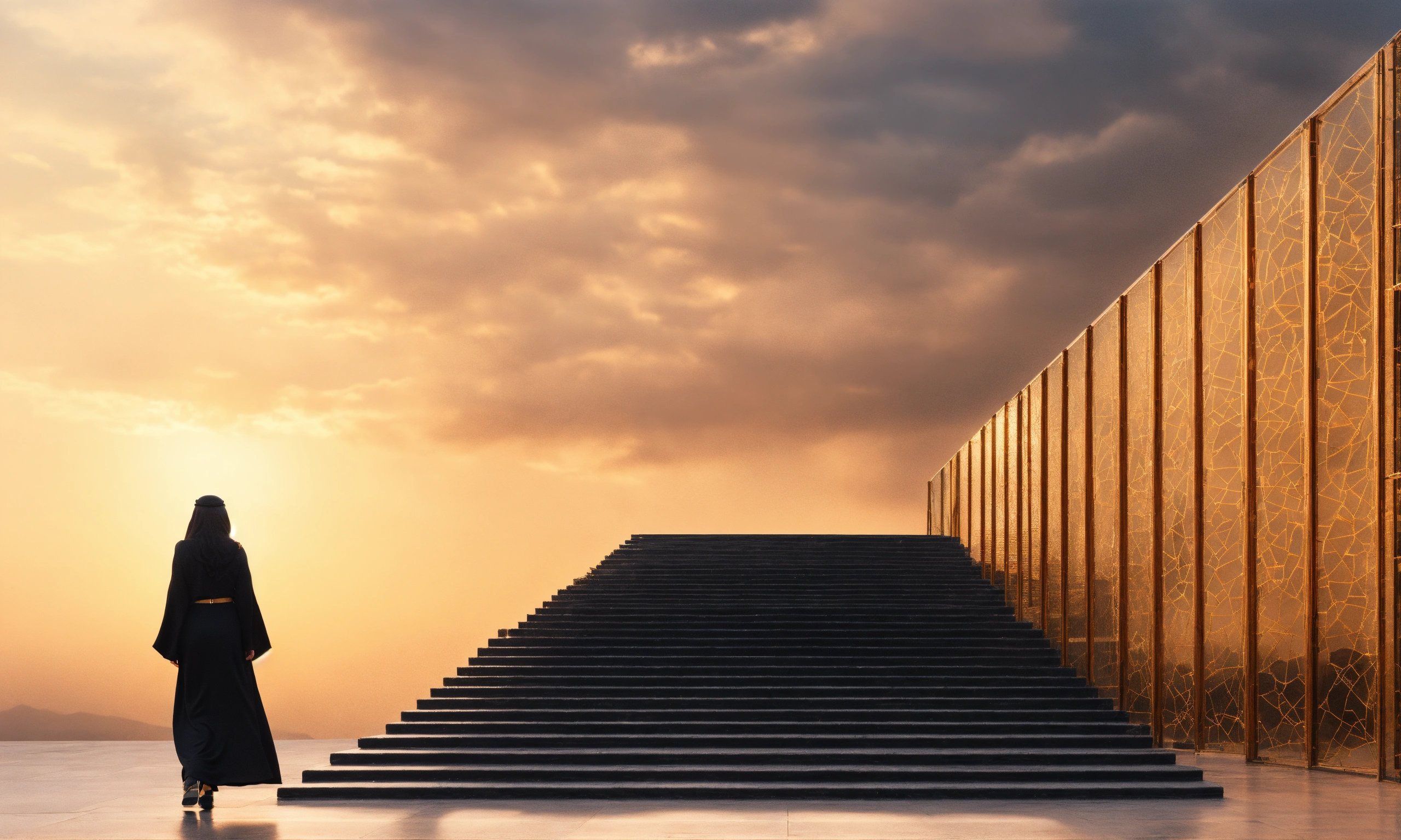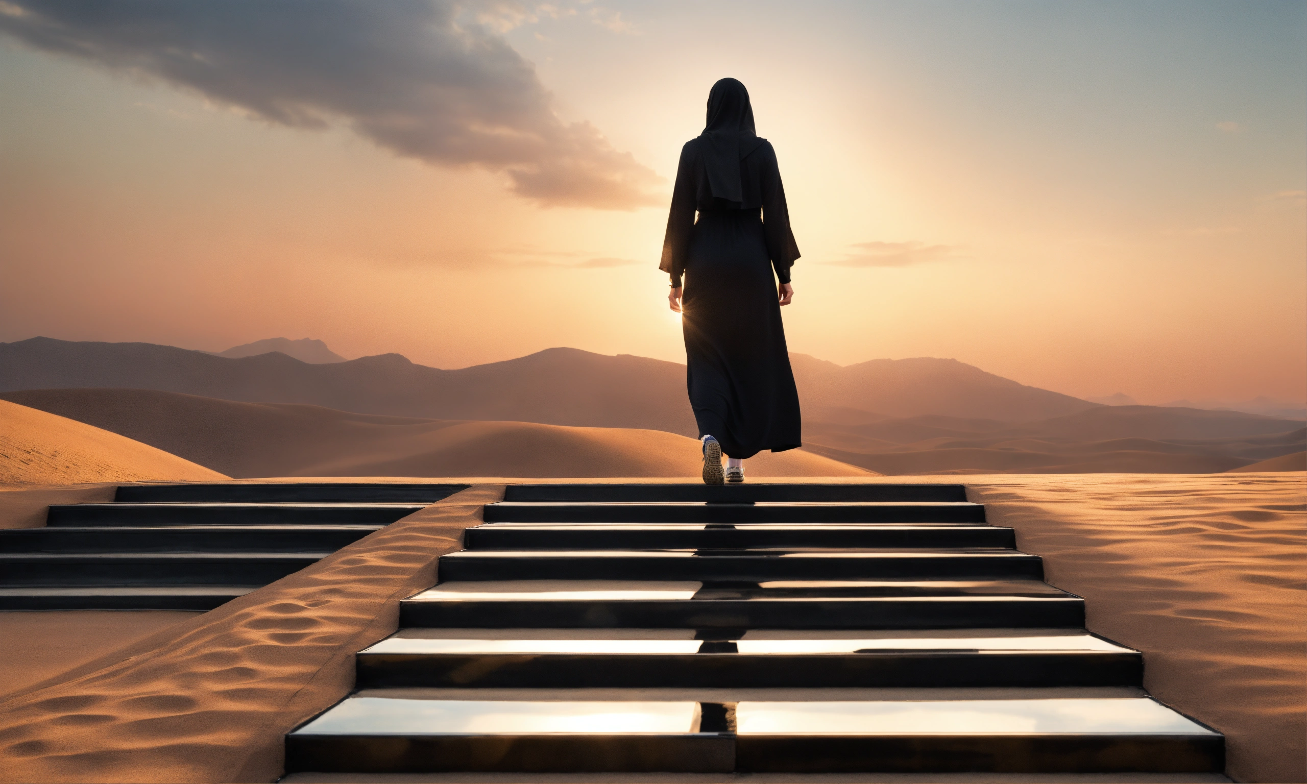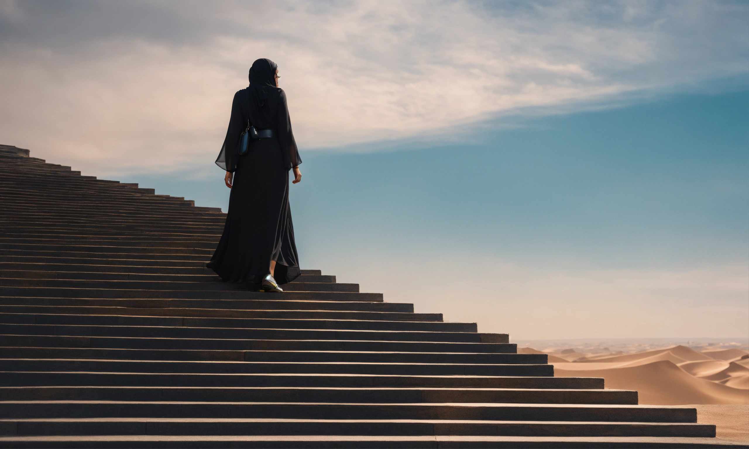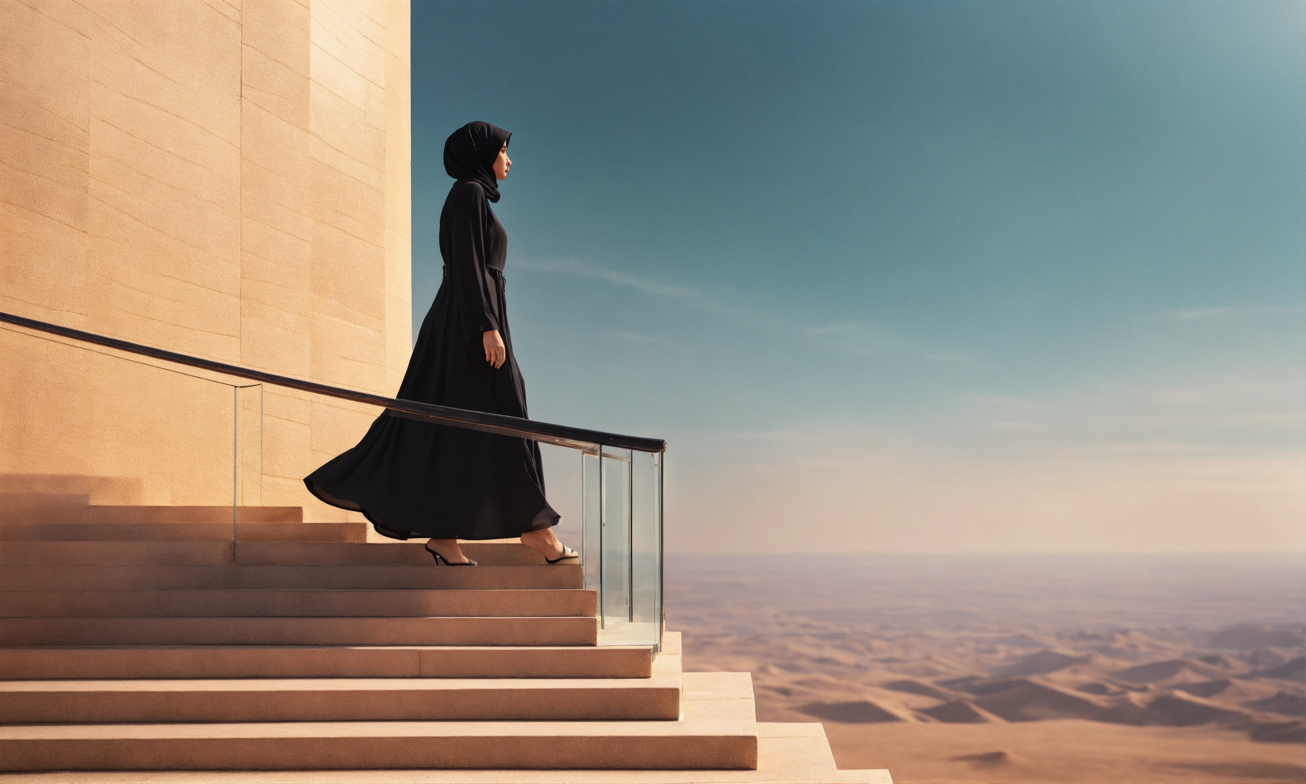 Saudi woman climbing up six steps only, walking upward, right side, side-way, close up, glass, abstract, black dress, modern, sky, horizon, natural light, warm, photo-realistic, 8k, high definition