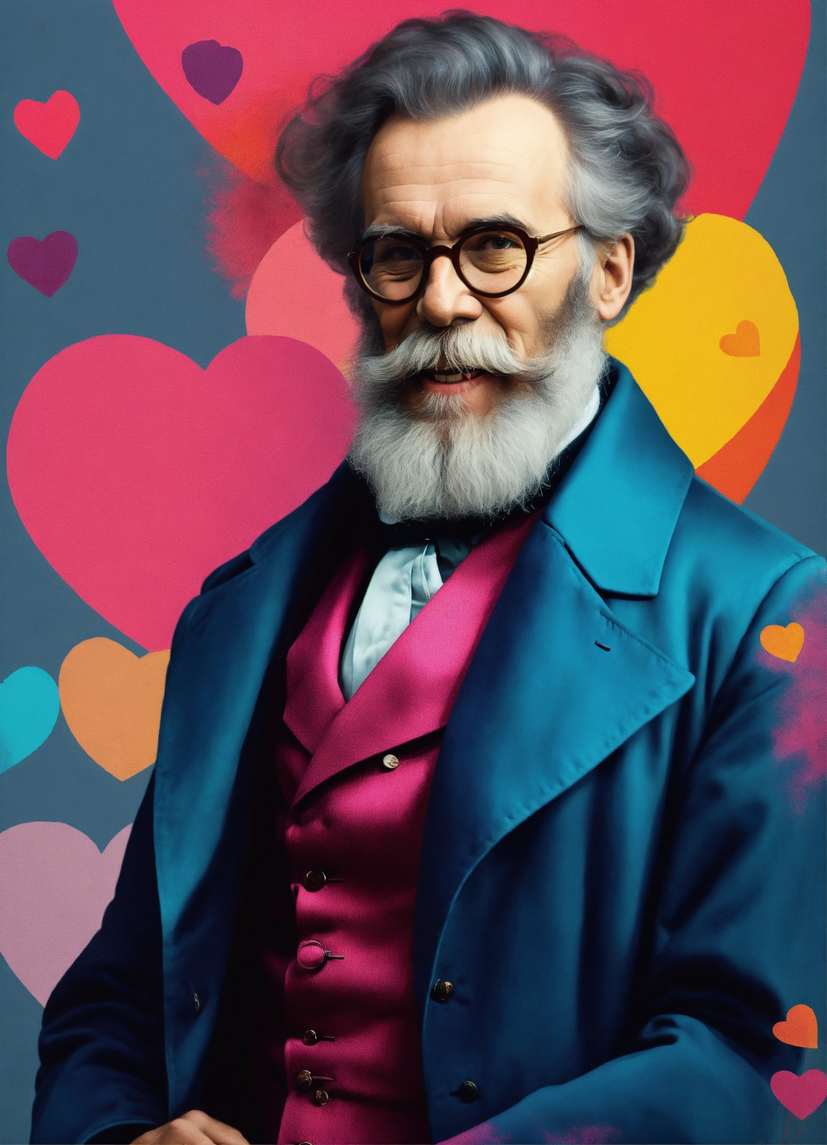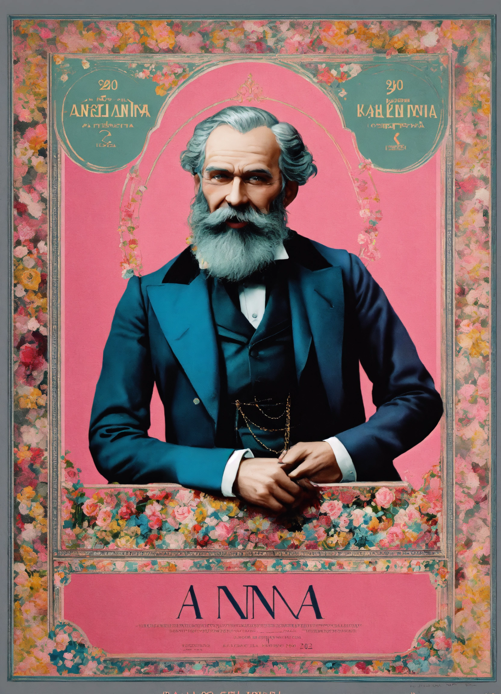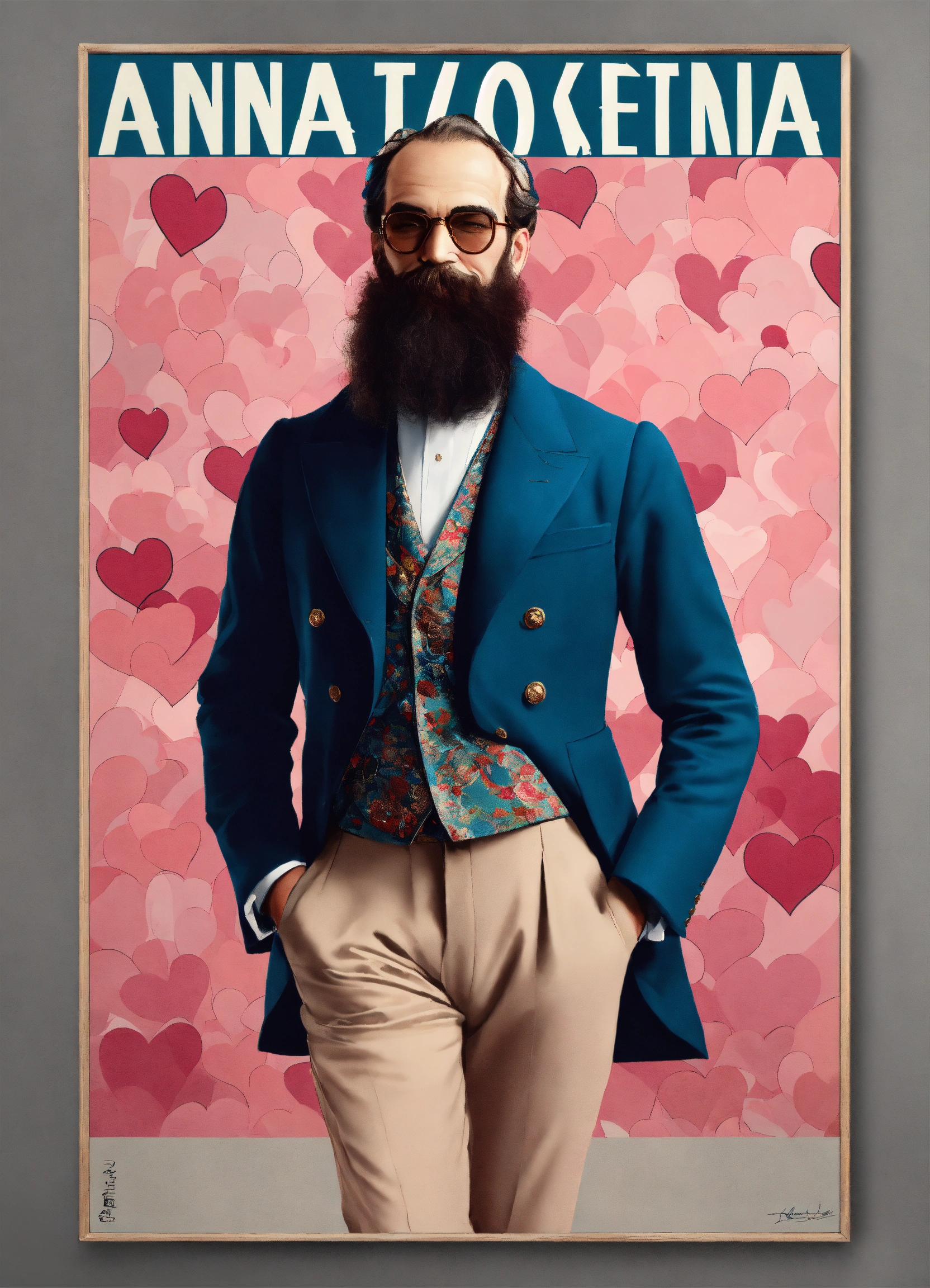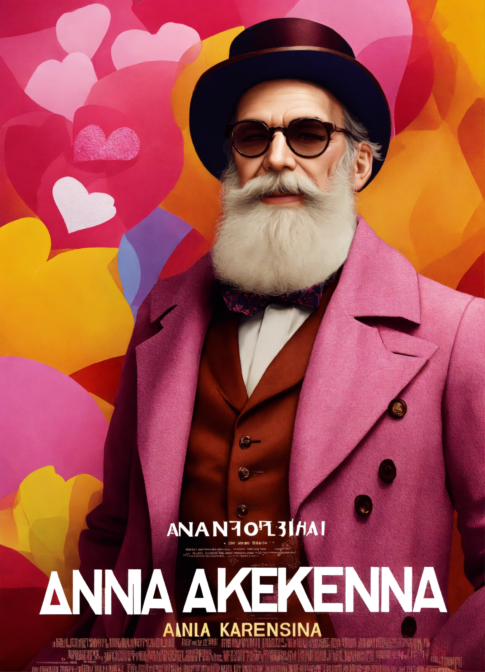 Advertising a very beautiful poster of the film "anna karenina". a very beautiful bright and colorful advertising photo of the old great russian writer leo tolstoy smiling and laughing with his mouth wide open, with a gray beard and glasses with pink glasses in the form of hearts. he looks at us and rejoices. tolstoy in a fashionable expensive modern colored suit in the youth fashion of the sample of 2023. at the bottom is the signature in large letters "anna karenina" the background is gray. style - pop art.